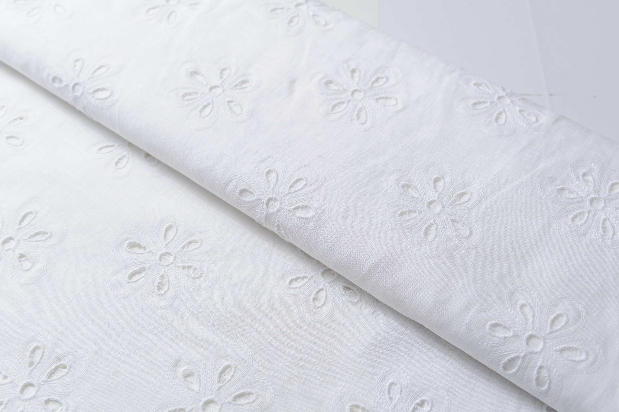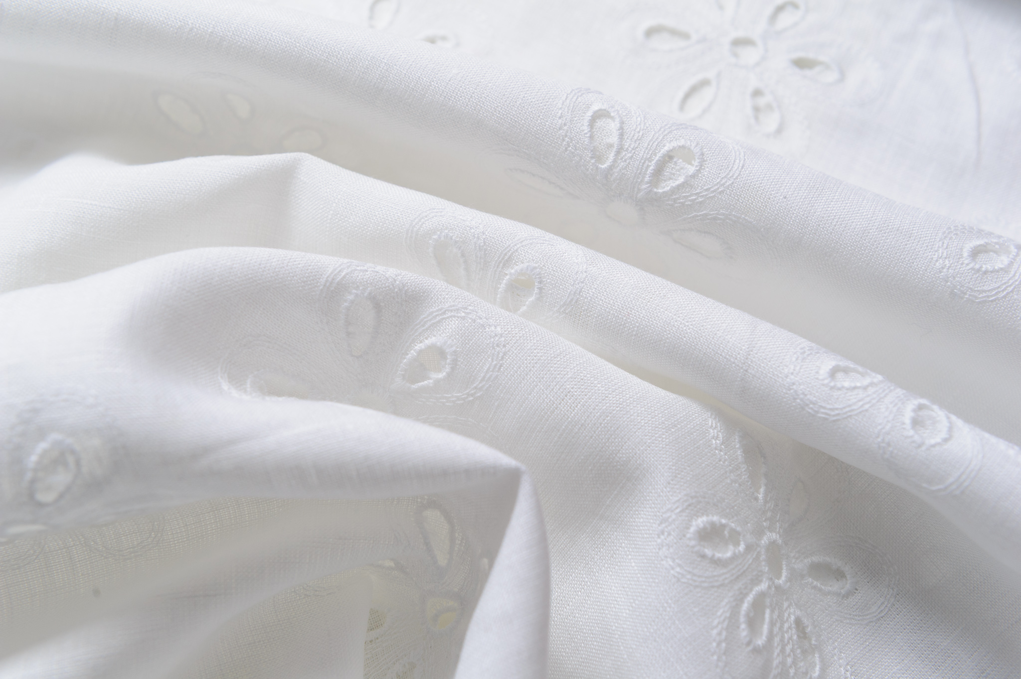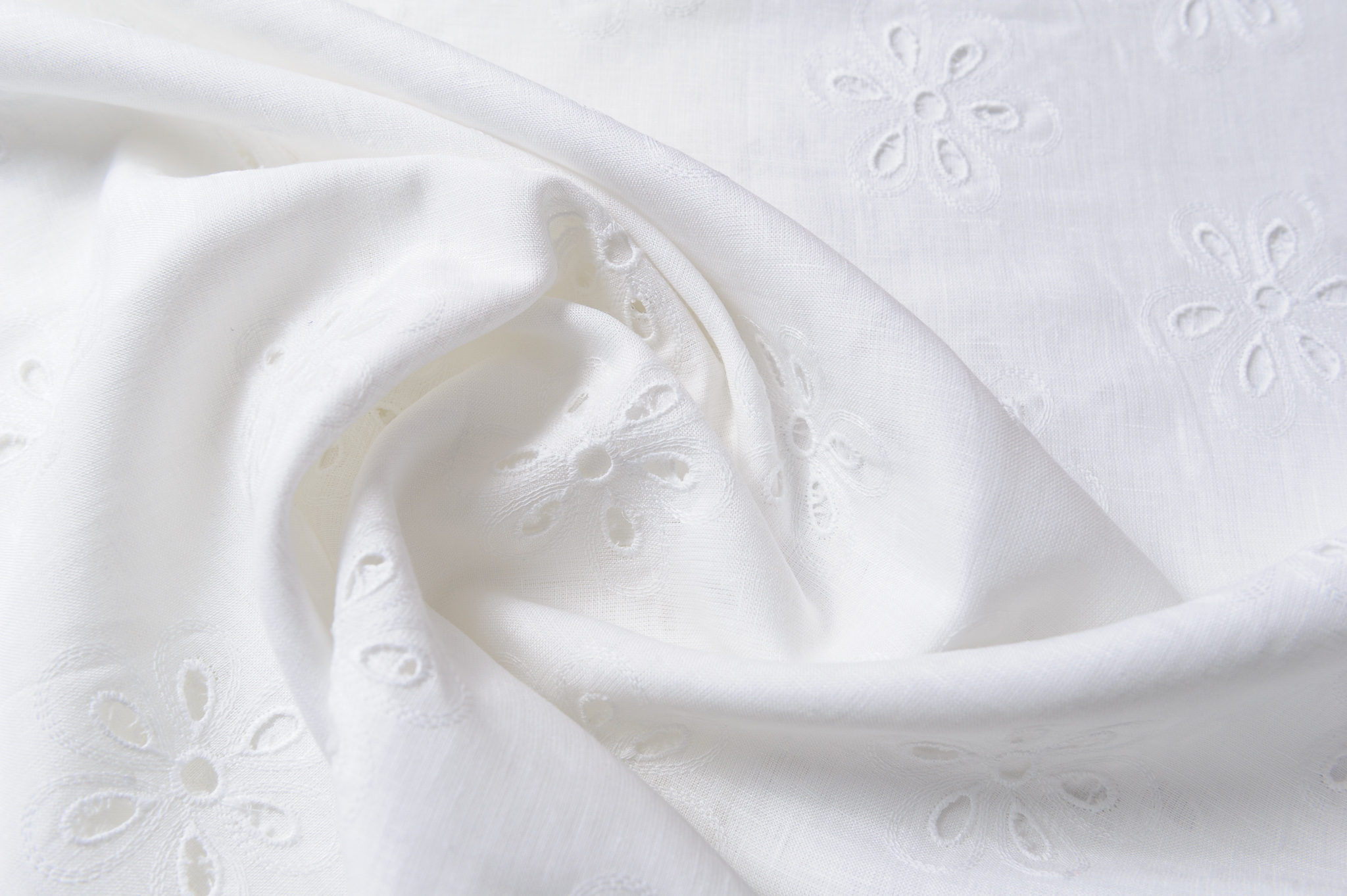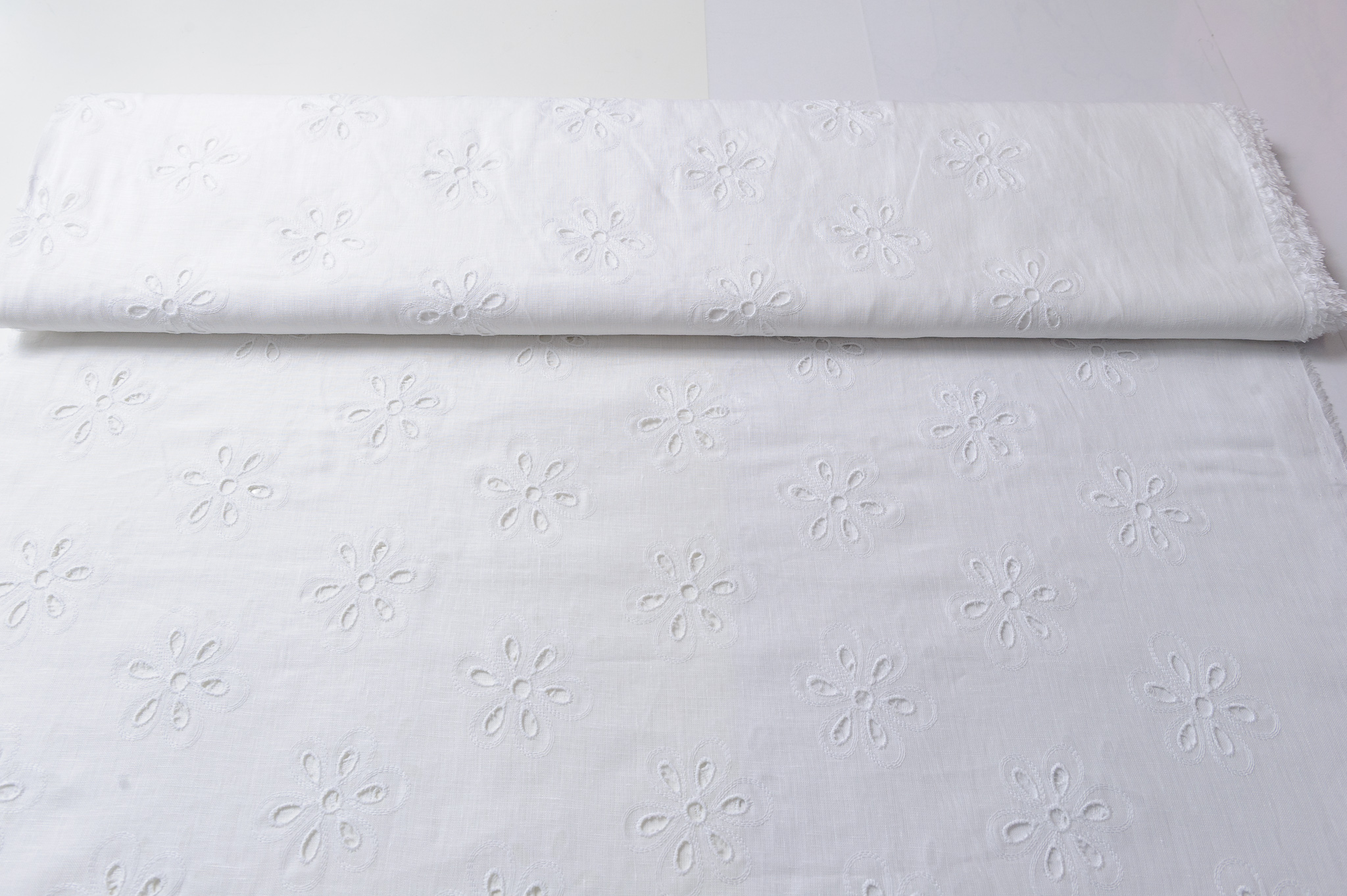Materiał ażurowy biały. Odpowiedni na sukienki, koszule, bluzki, spodnie, spódnice.