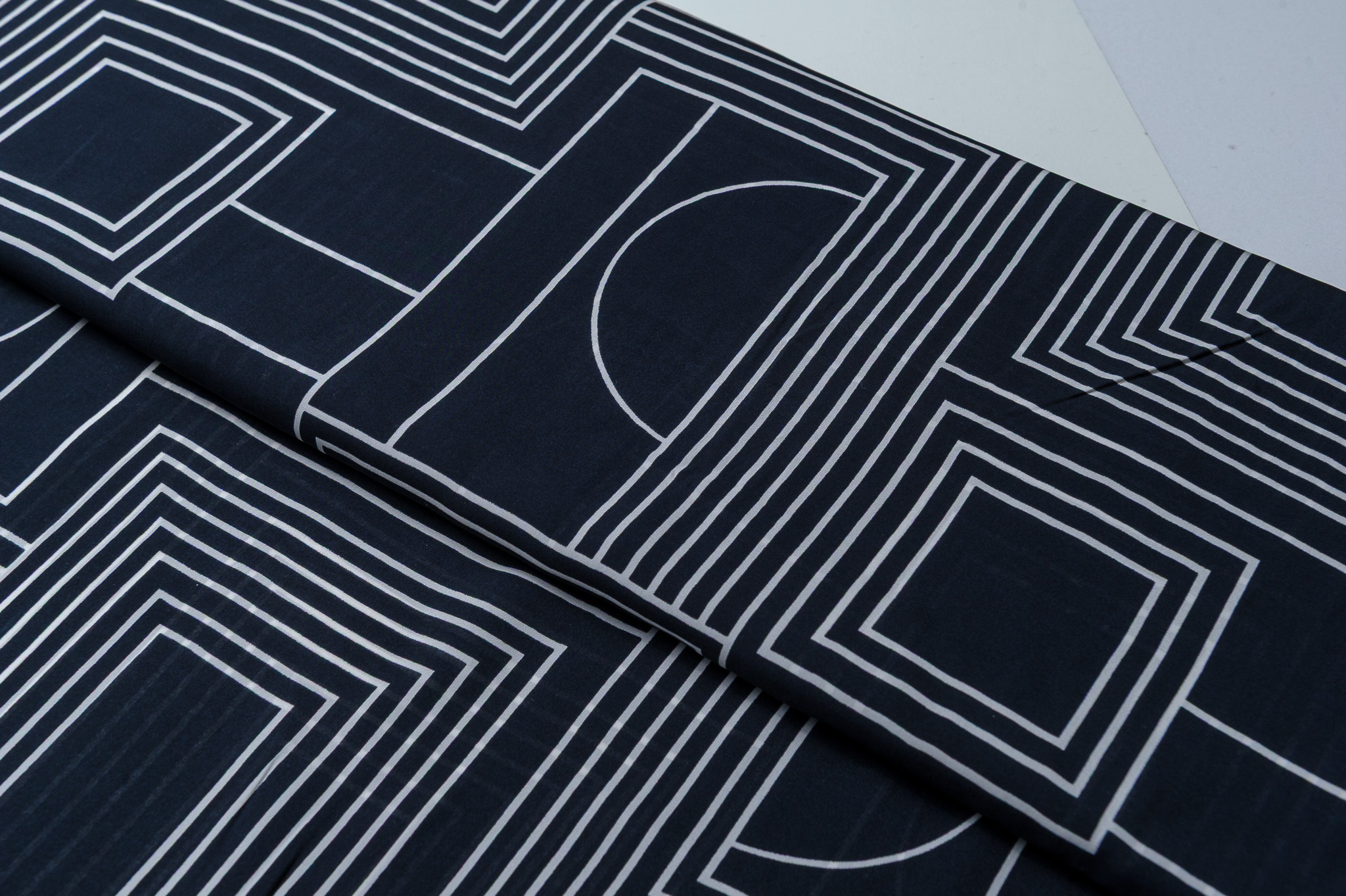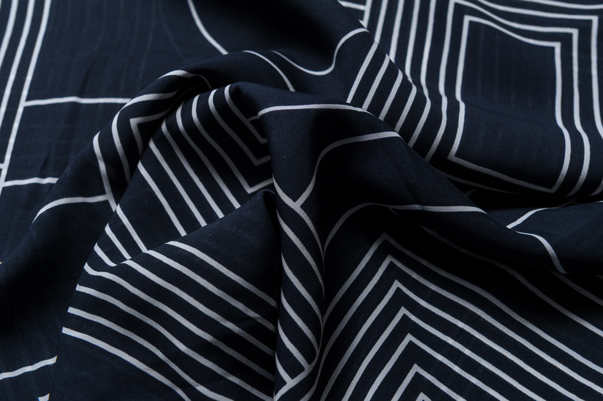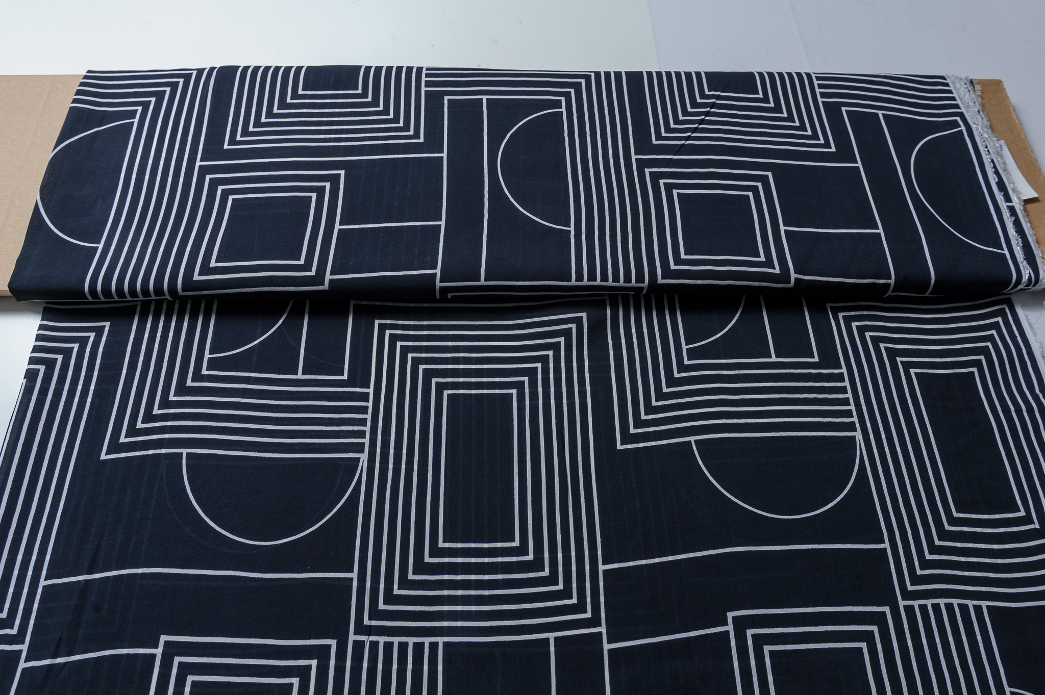 Materiał cienki, ale nie prześwituje. Wzory geometryczne czarno-białe. Odpowiedni na sukienki, spódnice, koszule, bluzki.