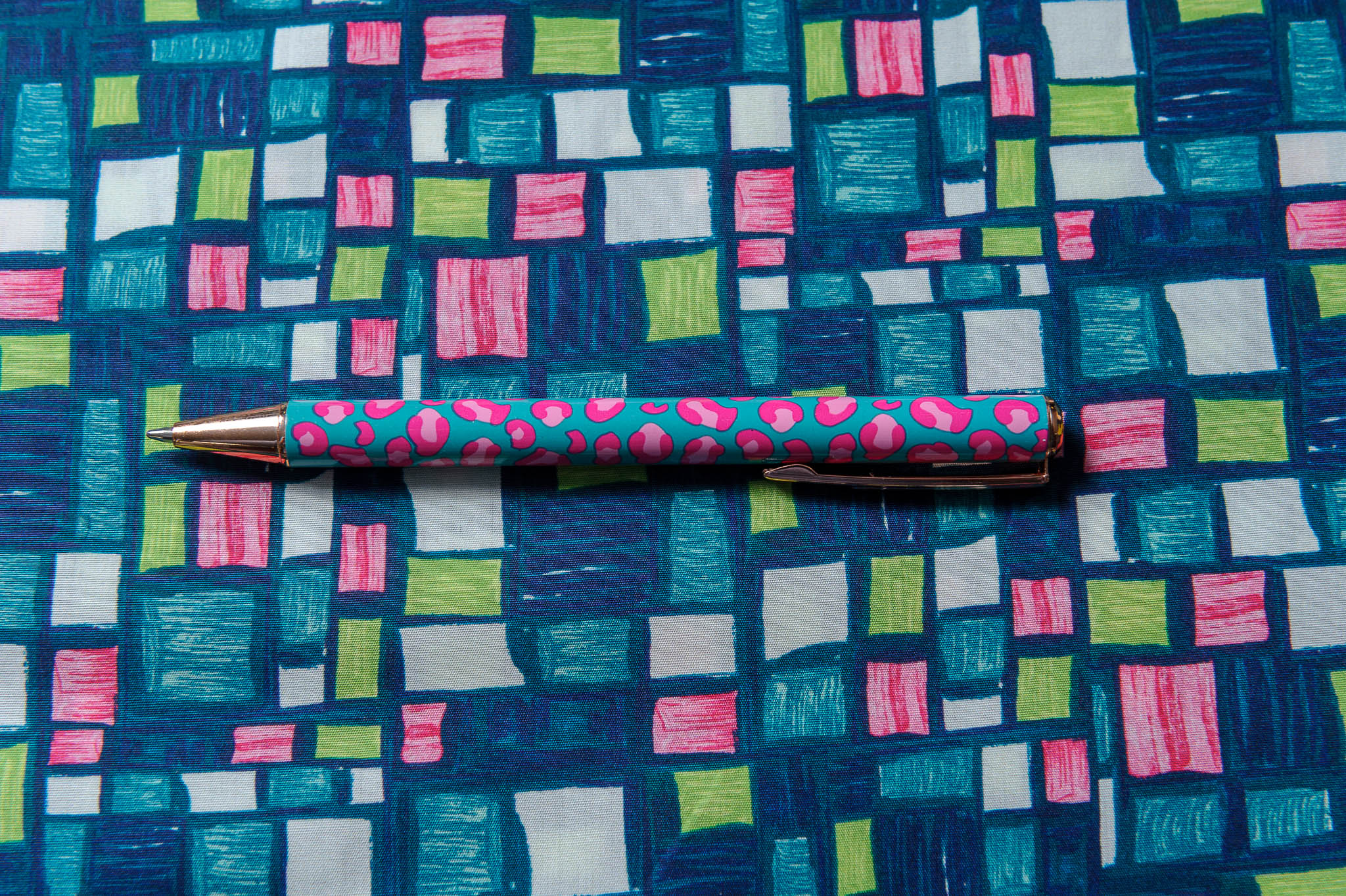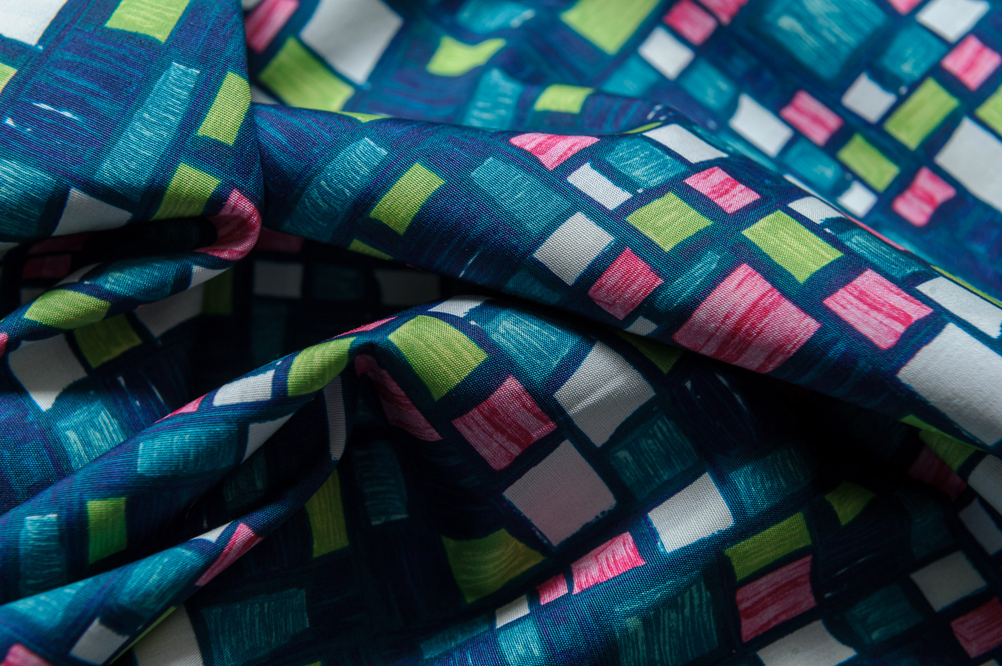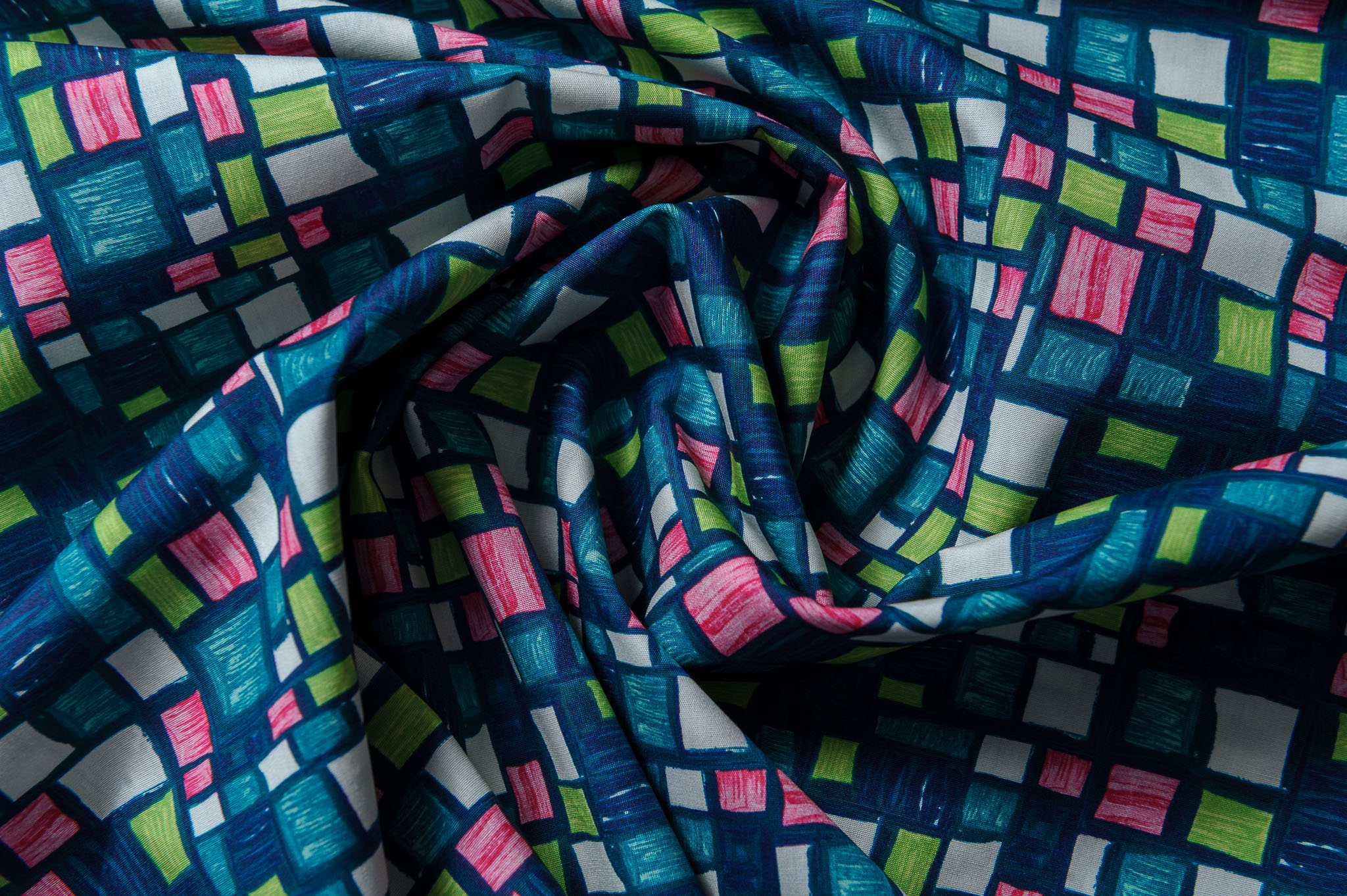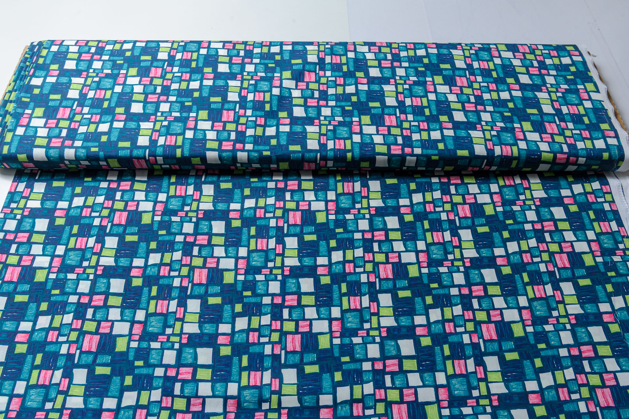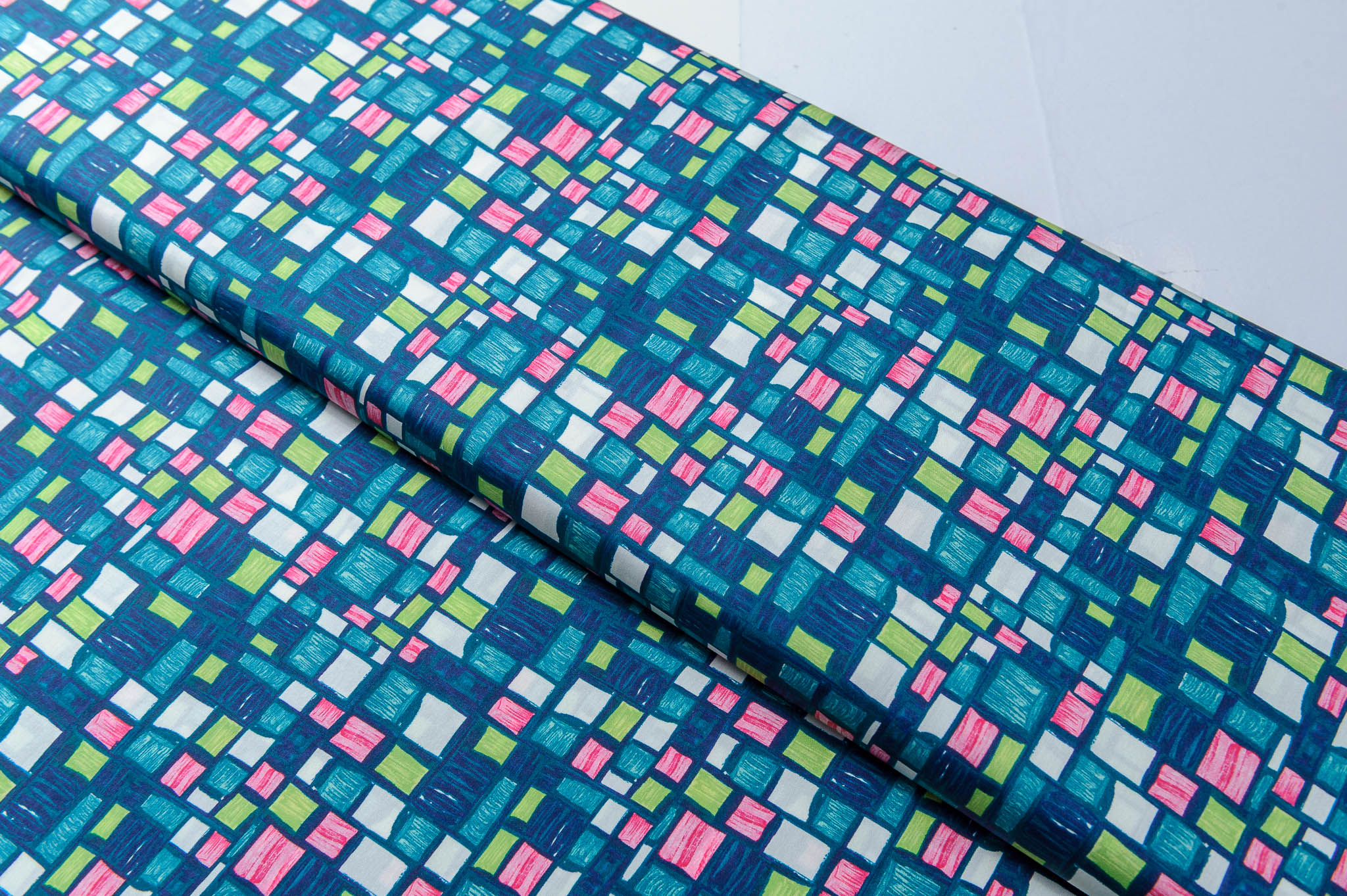 Materiał nieprzeźroczysty, sztywniejszy, w drobne kafelki w odcieniach turkusu,różu,seledynu. Odpowiedni na spódniczki, koszule, sukienki.