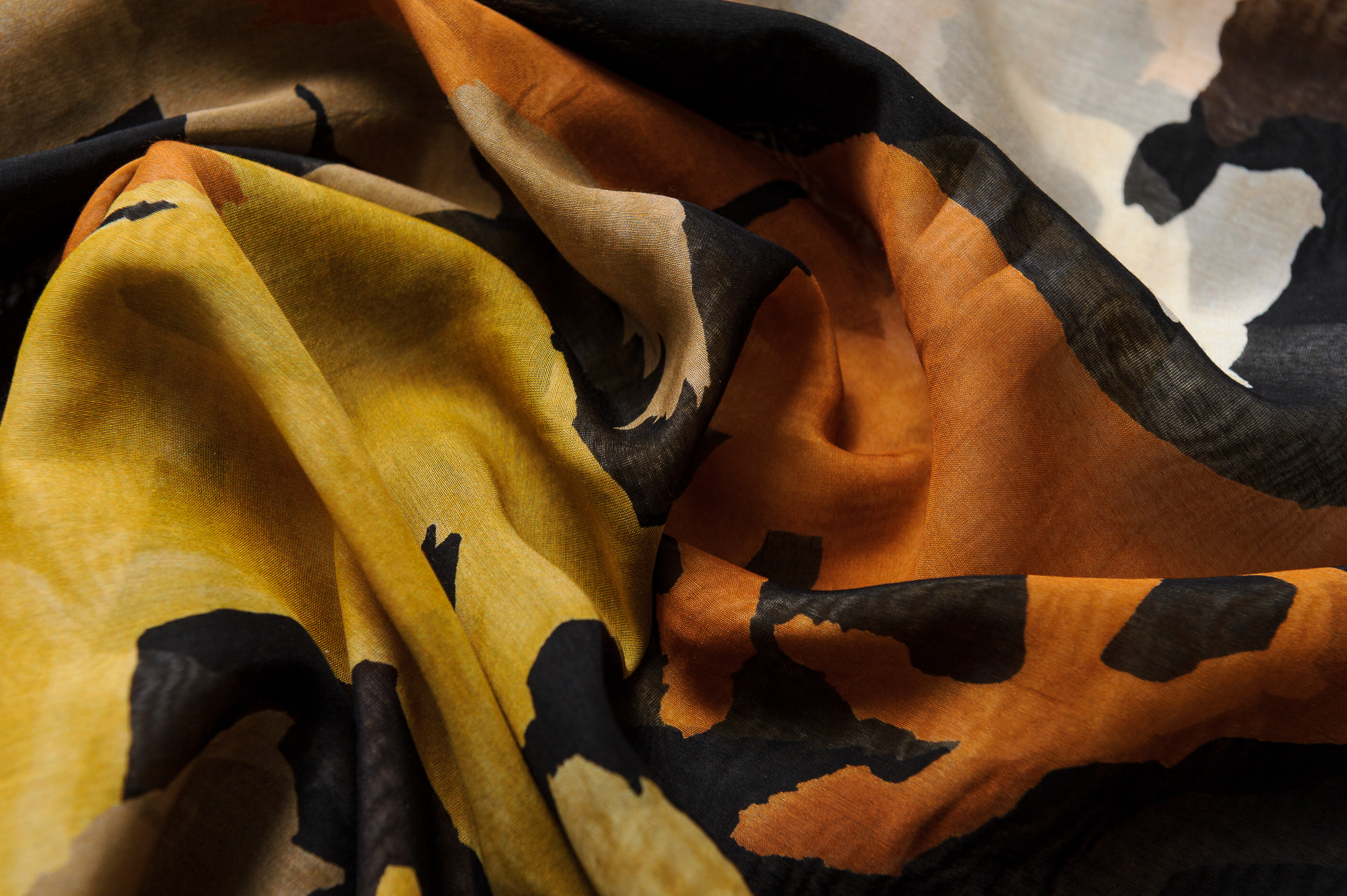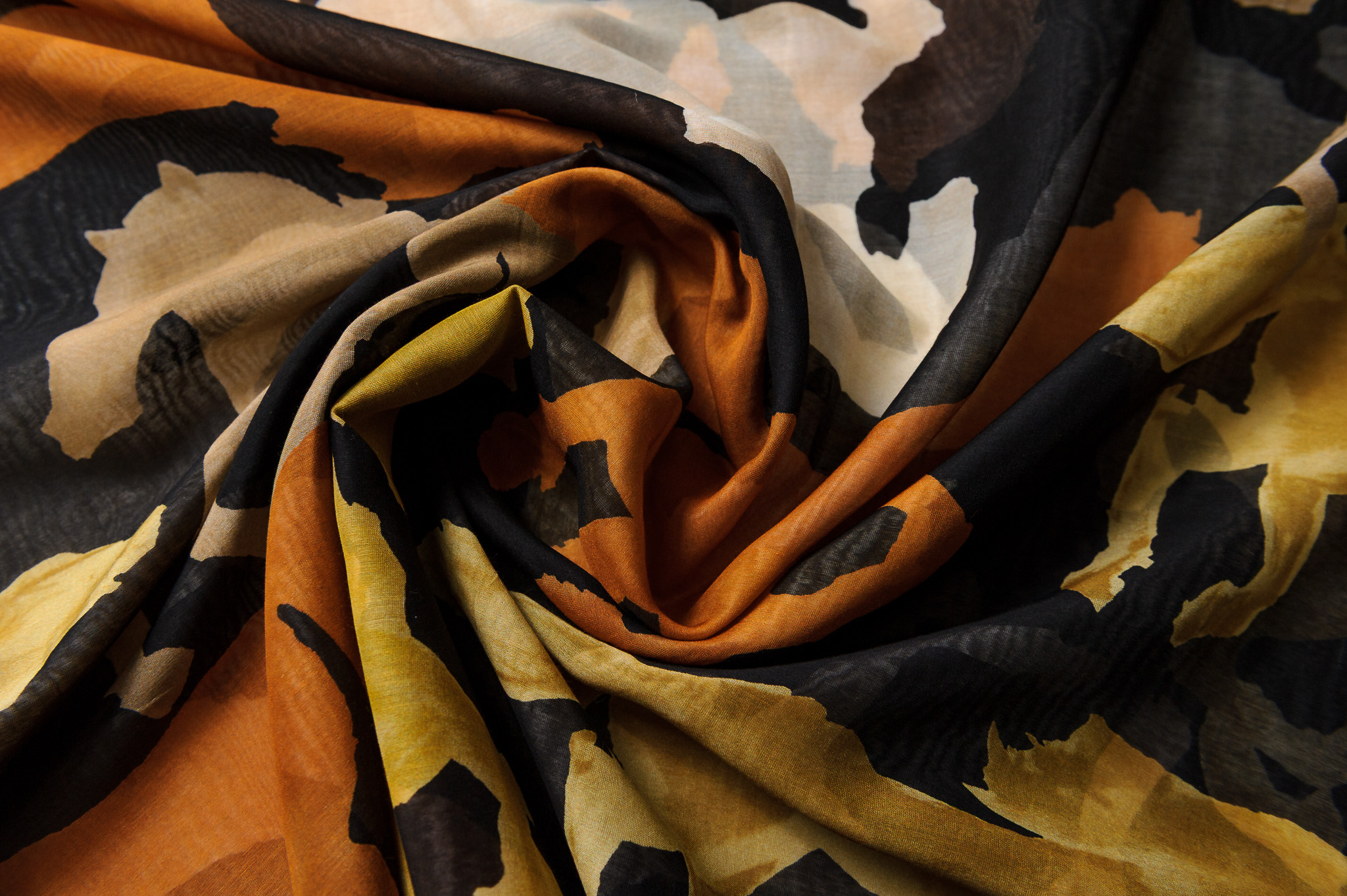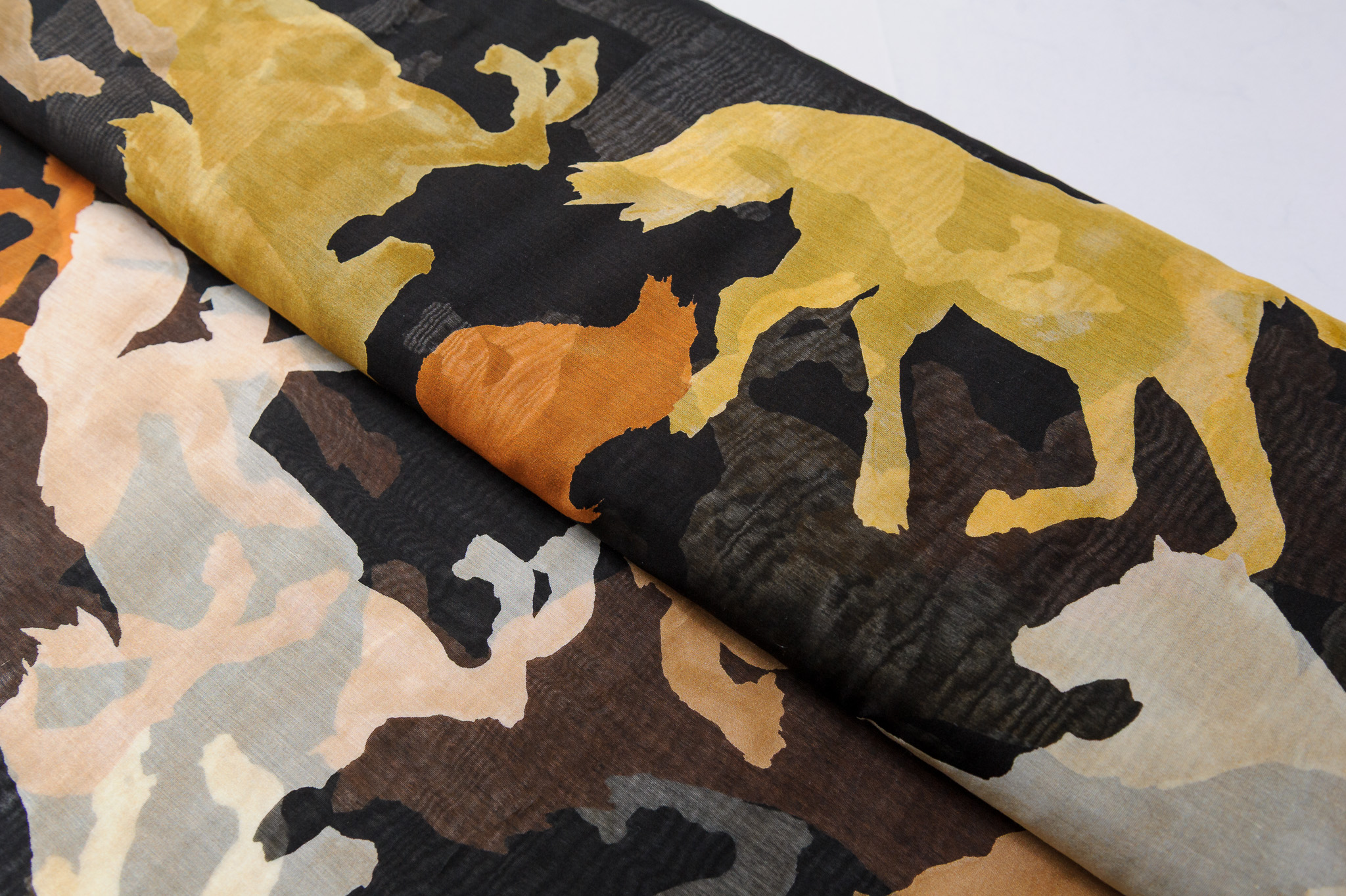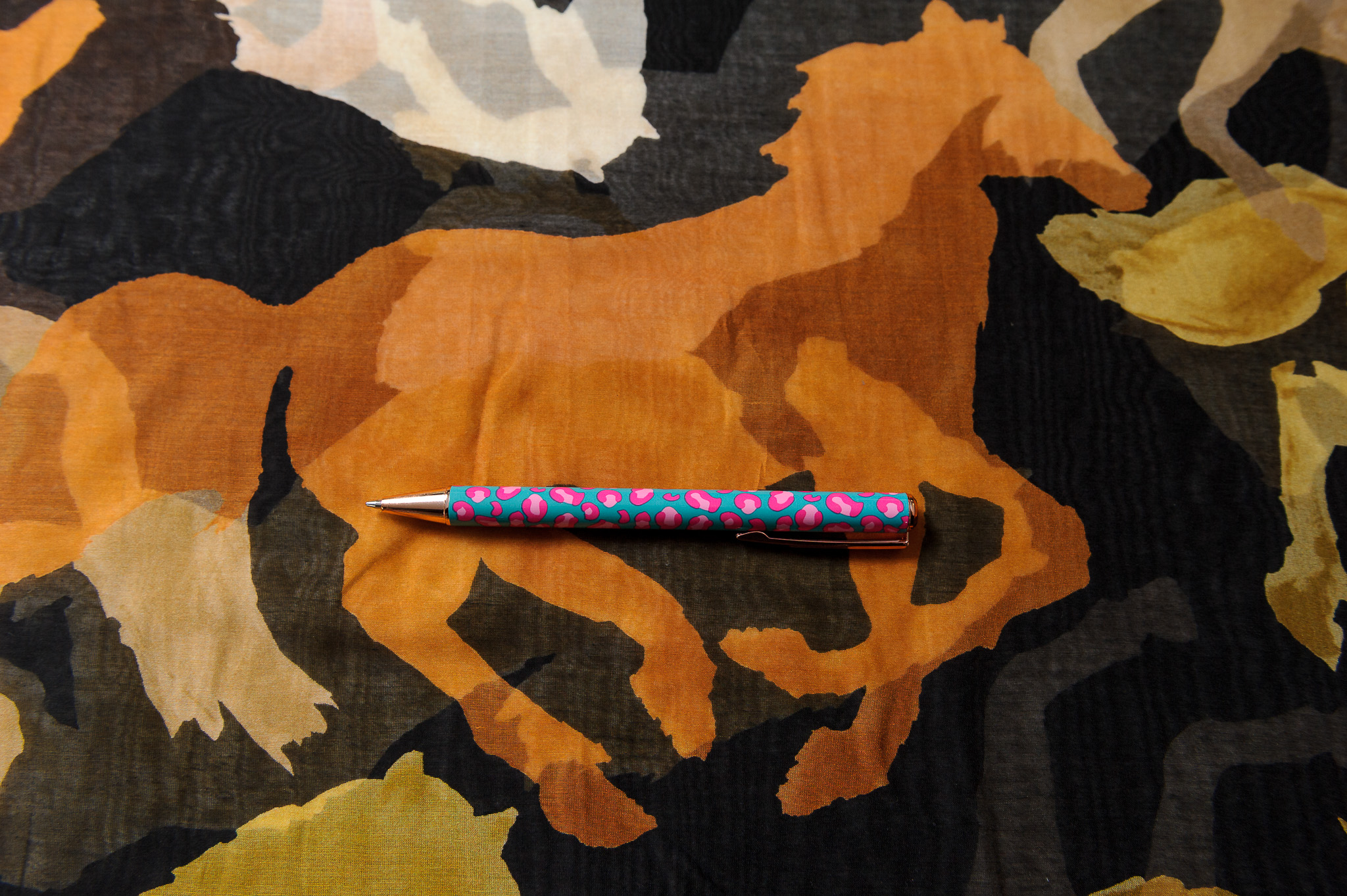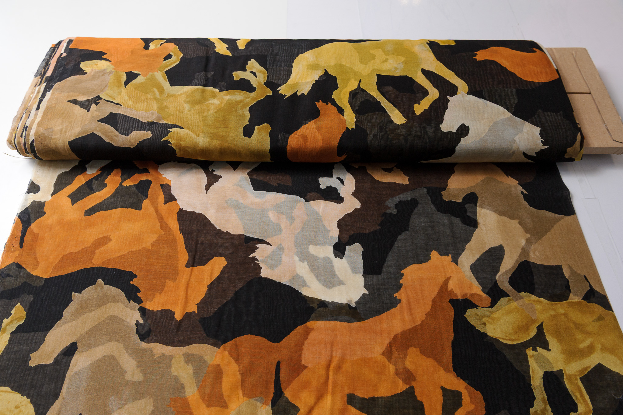 Materiał cienki, prześwitujący. Wzór w konie brązowe, beżowe, rude na czarnym tle. Odpowiedni na sukienki, spódnice, koszule, bluzki.