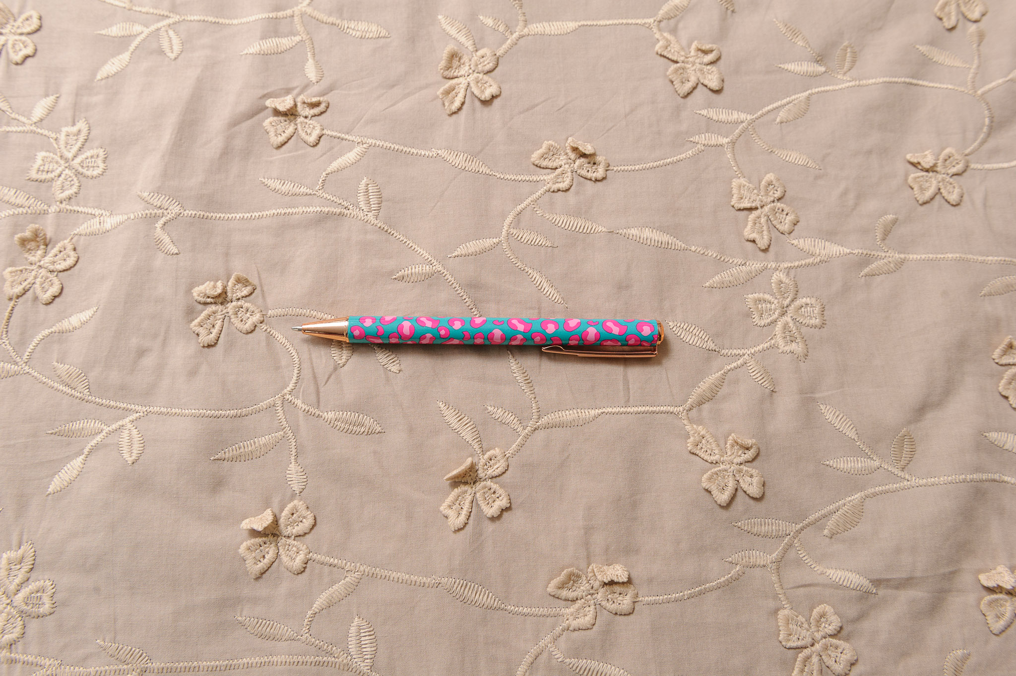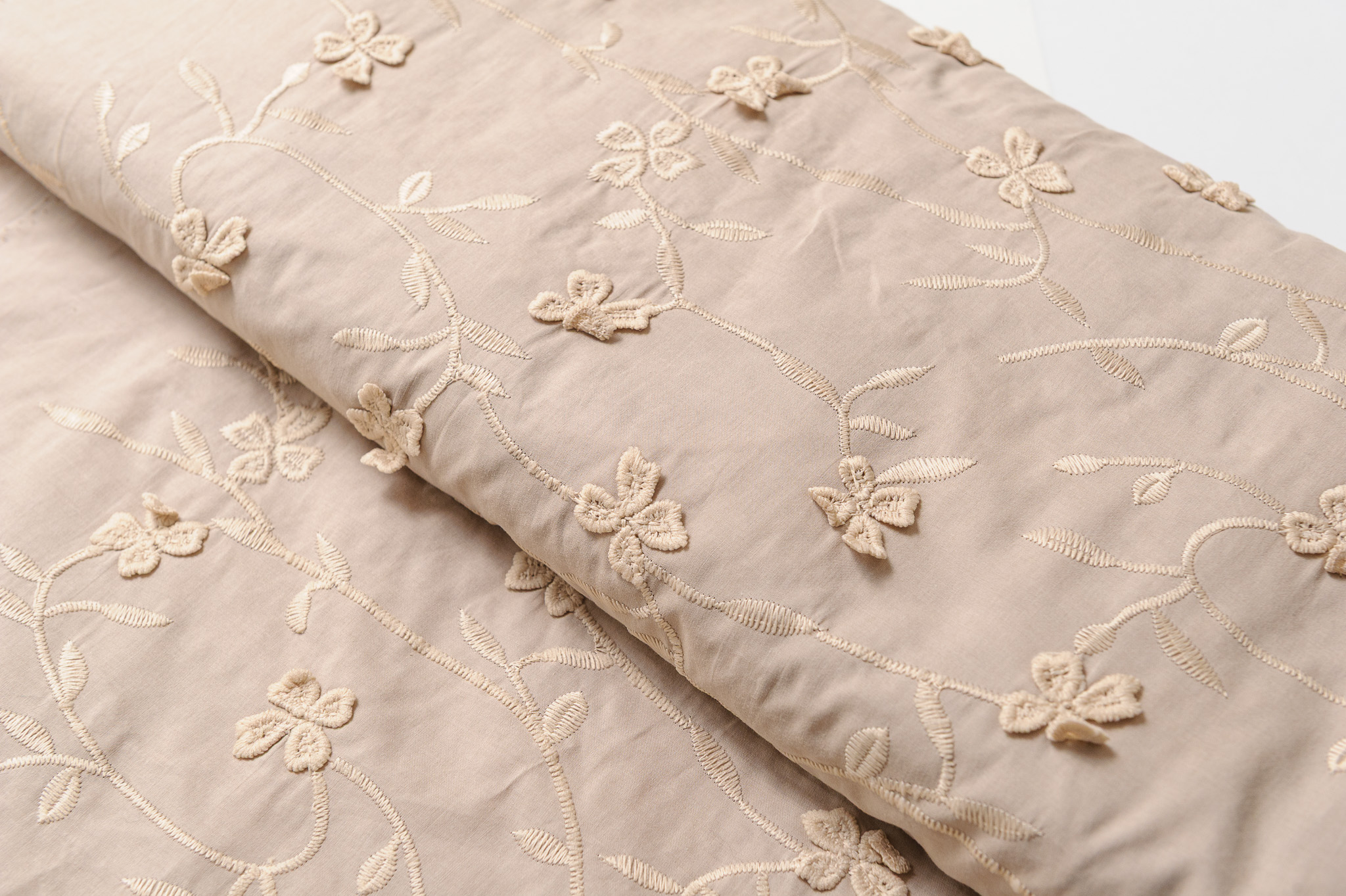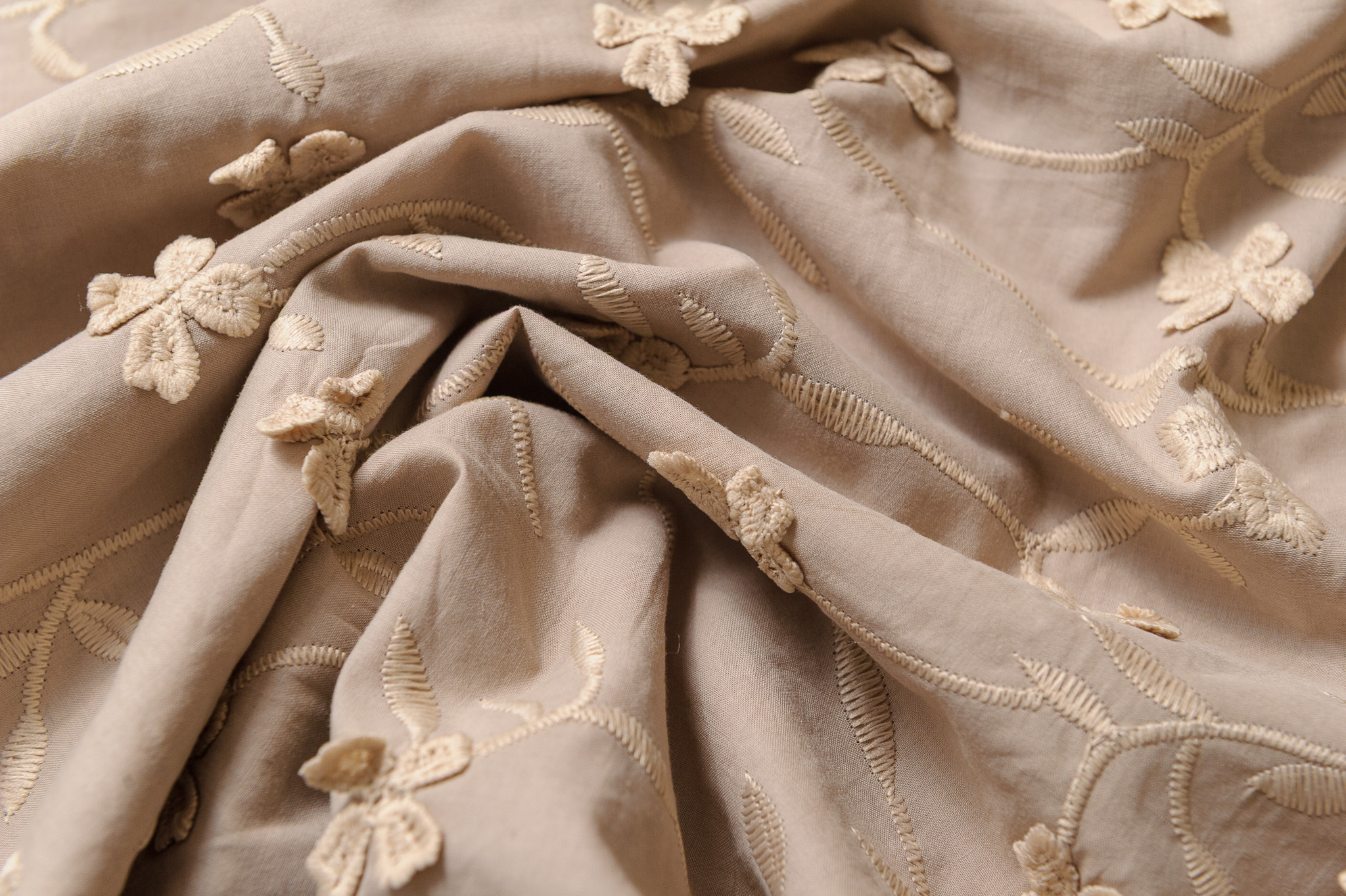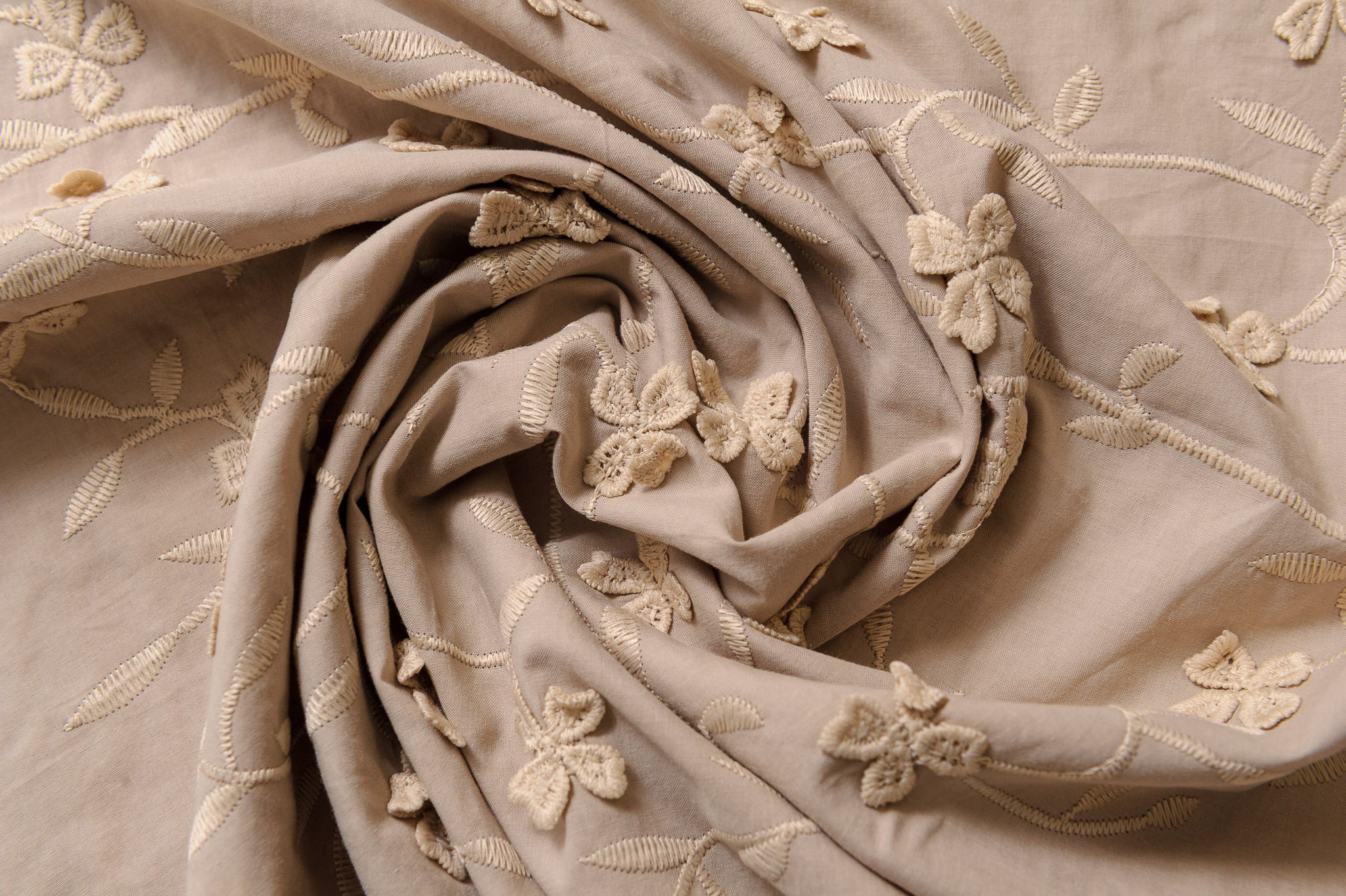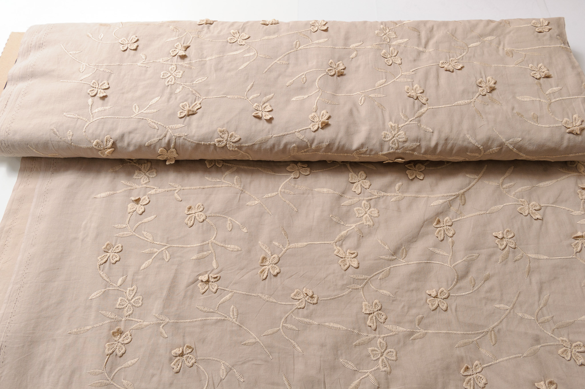 Materiał cienki, delikatnie prześwituje. Wzór w drobne kwiatuszki 3d w kolorze beżowym . Odpowiedni na sukienki, spódnice, koszule, bluzki.