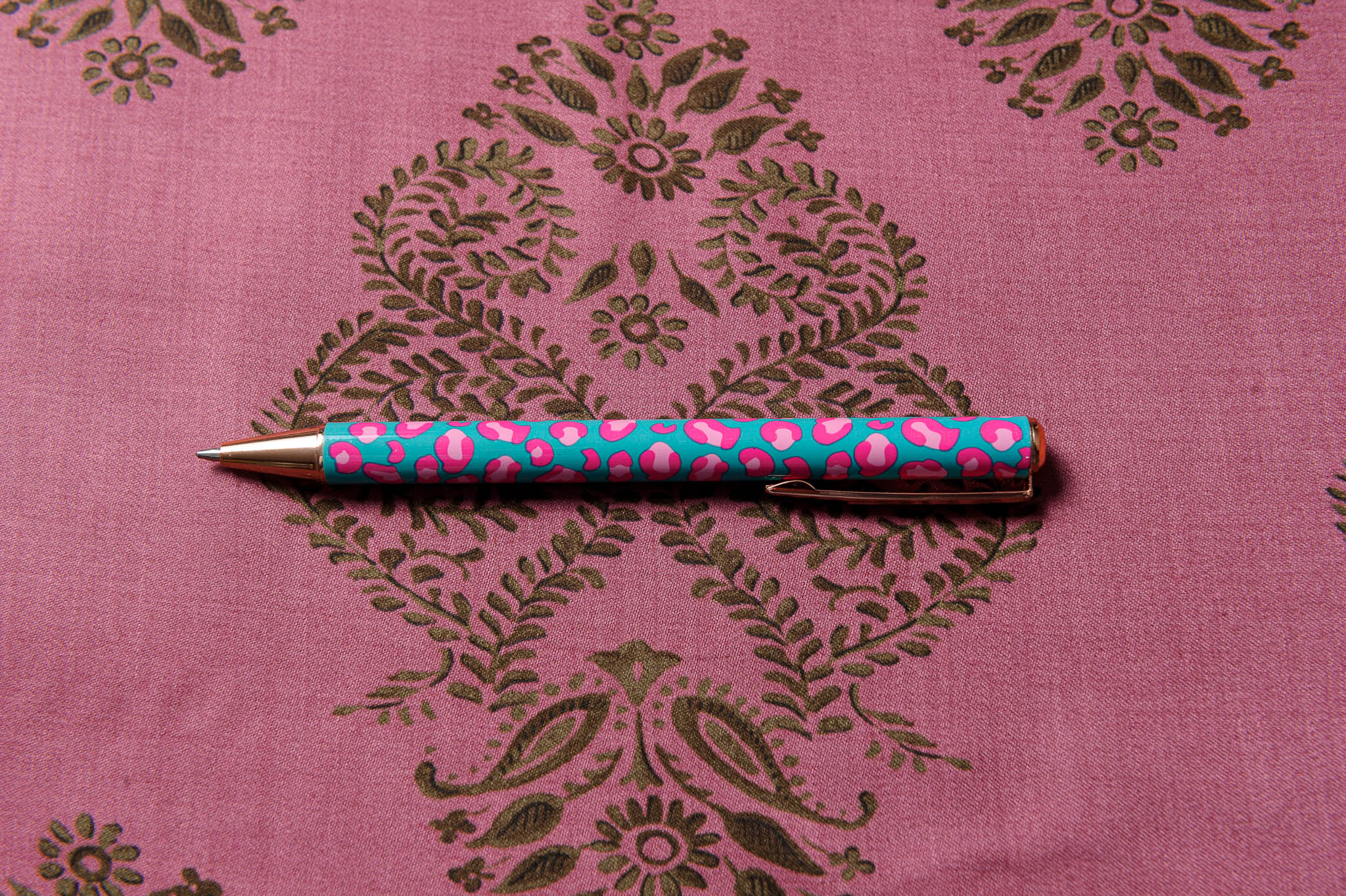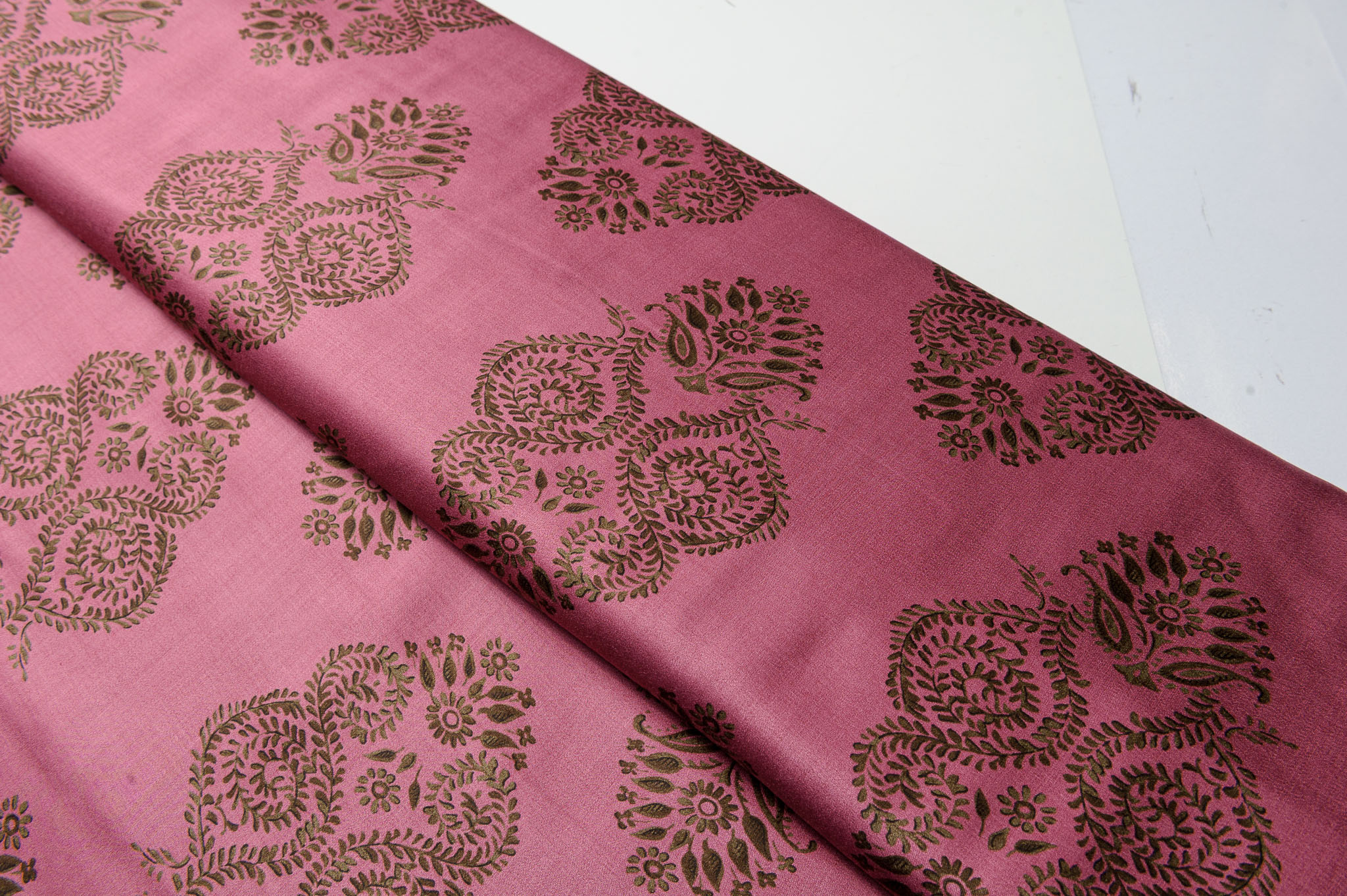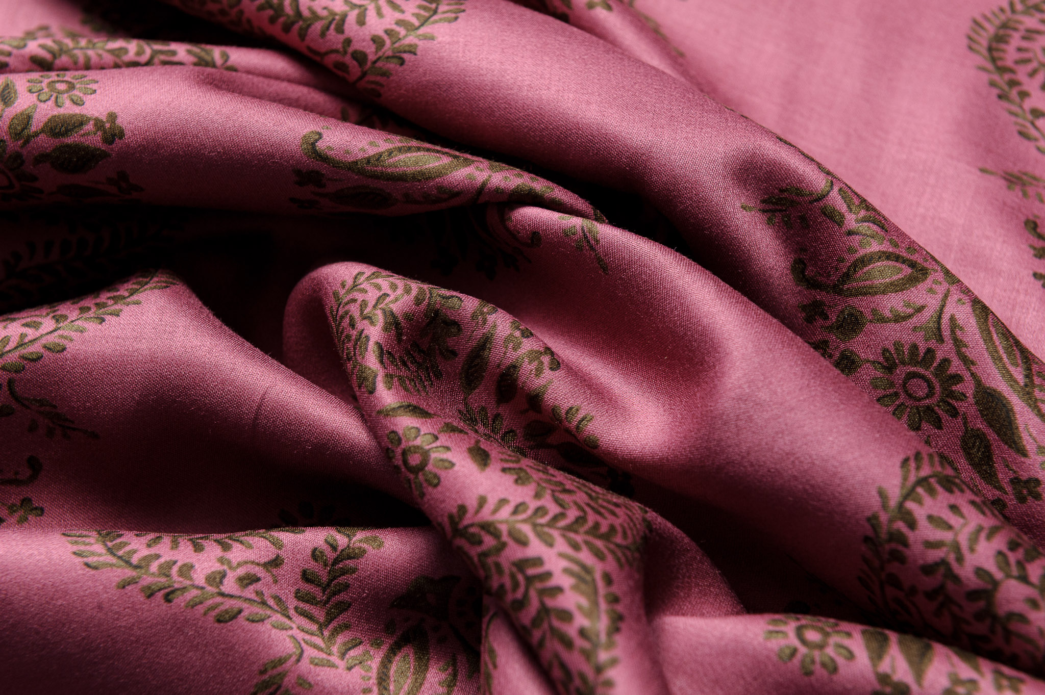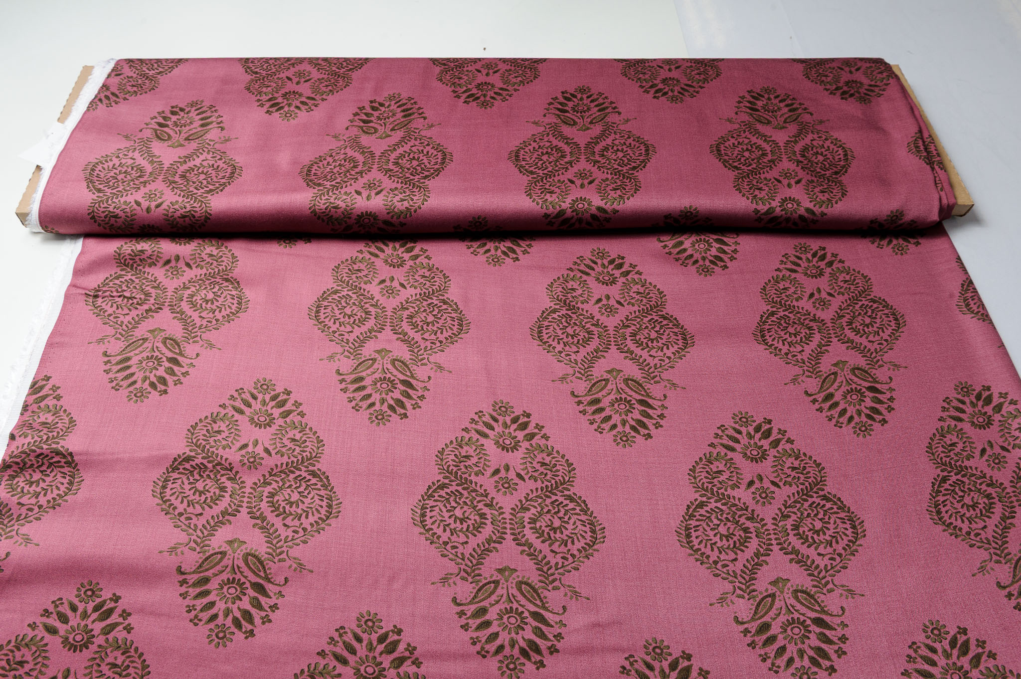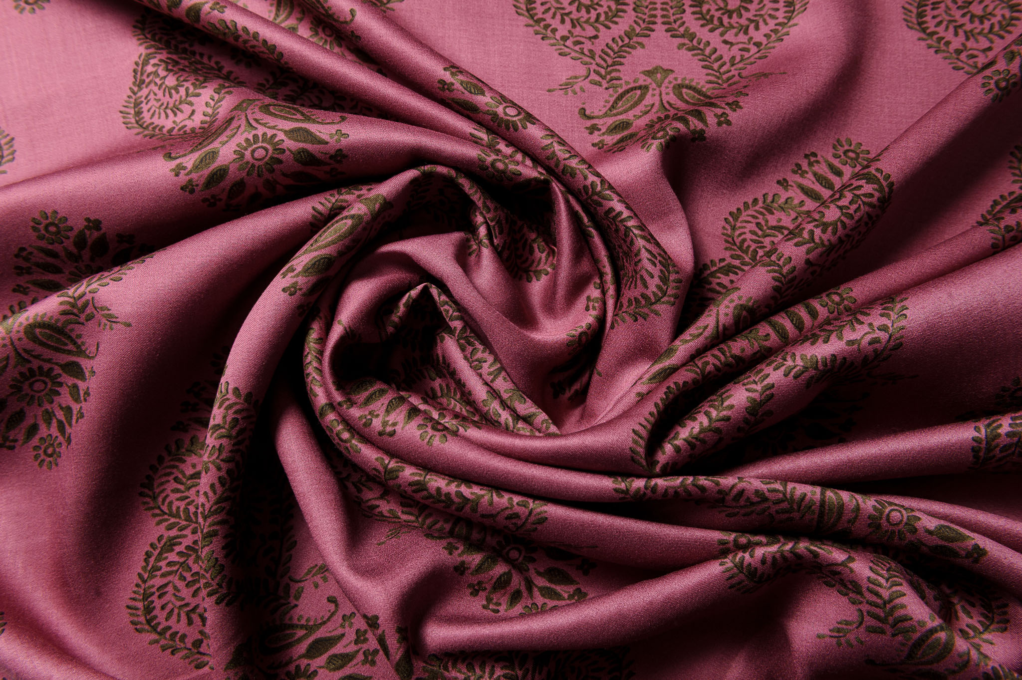 Materiał cienki, delikatnie prześwitujący. Wzór w zielone, symetryczne listki na bakłażanowym tle. Odpowiedni na sukienki, koszule, spódnice.