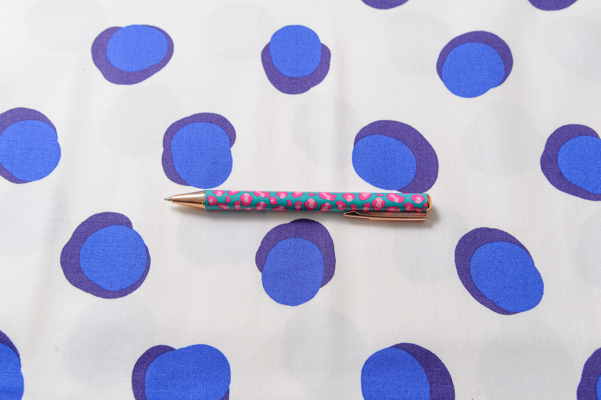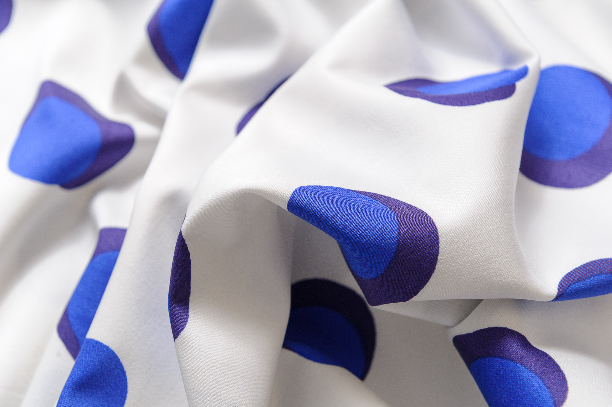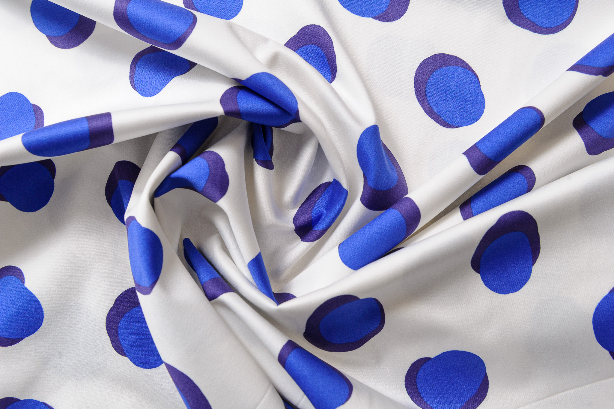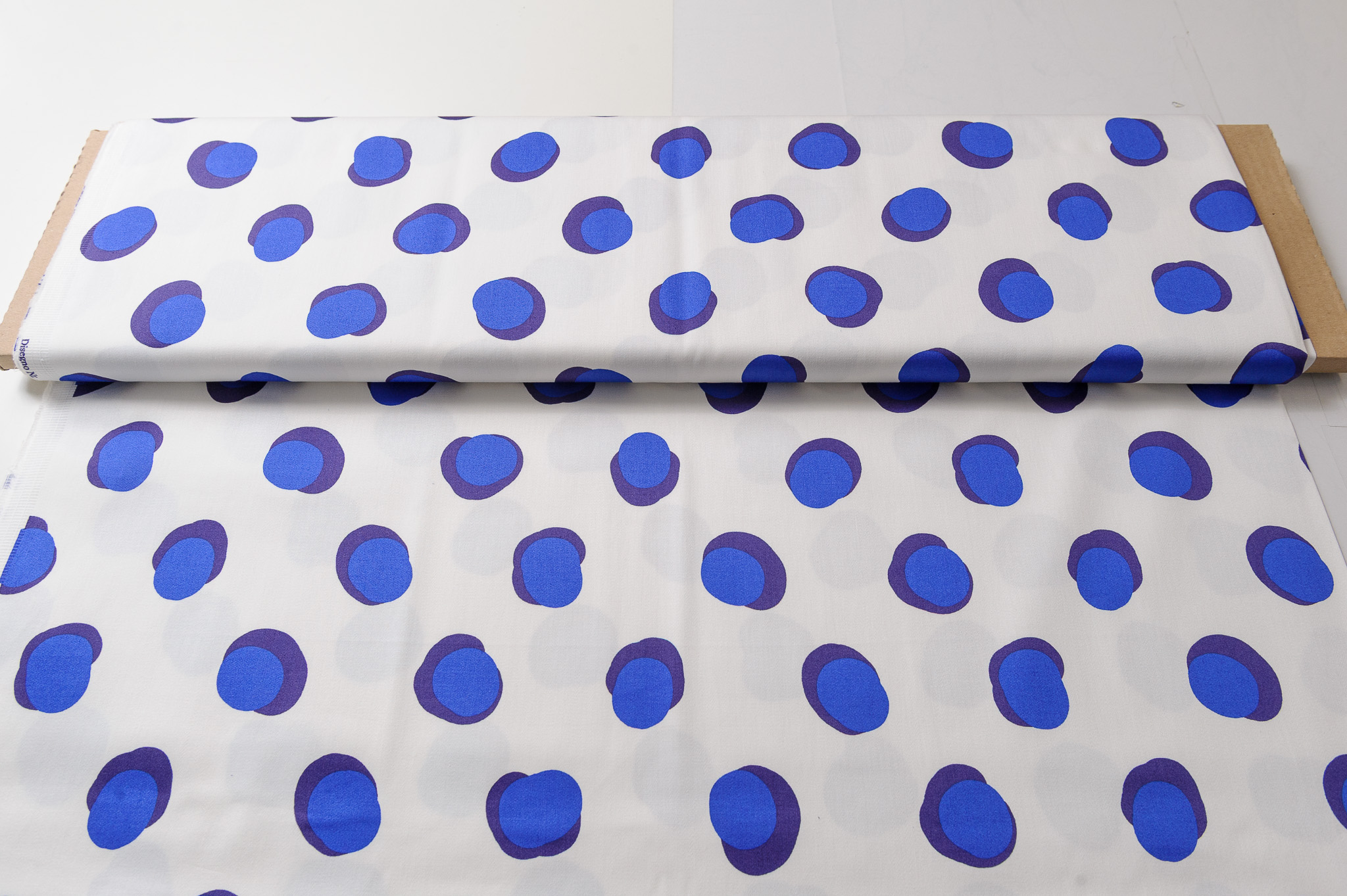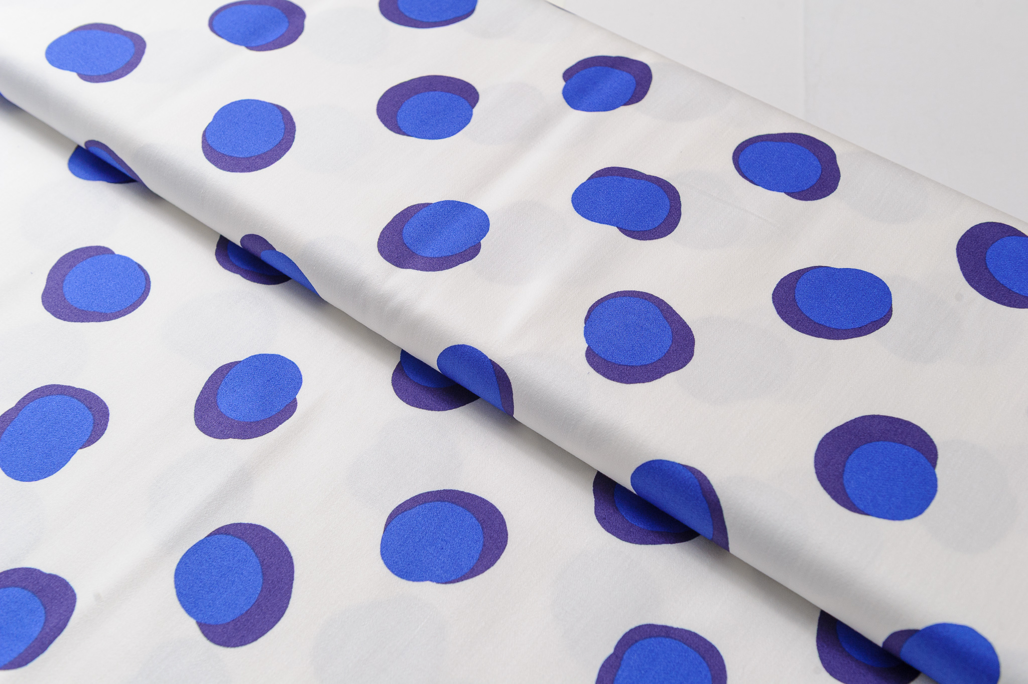 Materiał cienki, delikatnie prześwituje. Wzór w kropy niebieskie na śmietanowym tle. Odpowiedni na sukienki, spodnie, spódnice, koszule, bluzki.