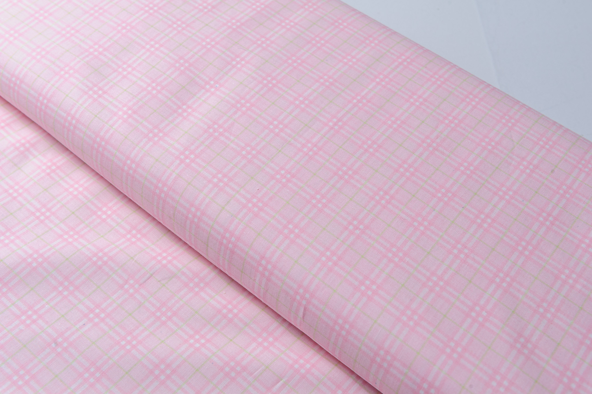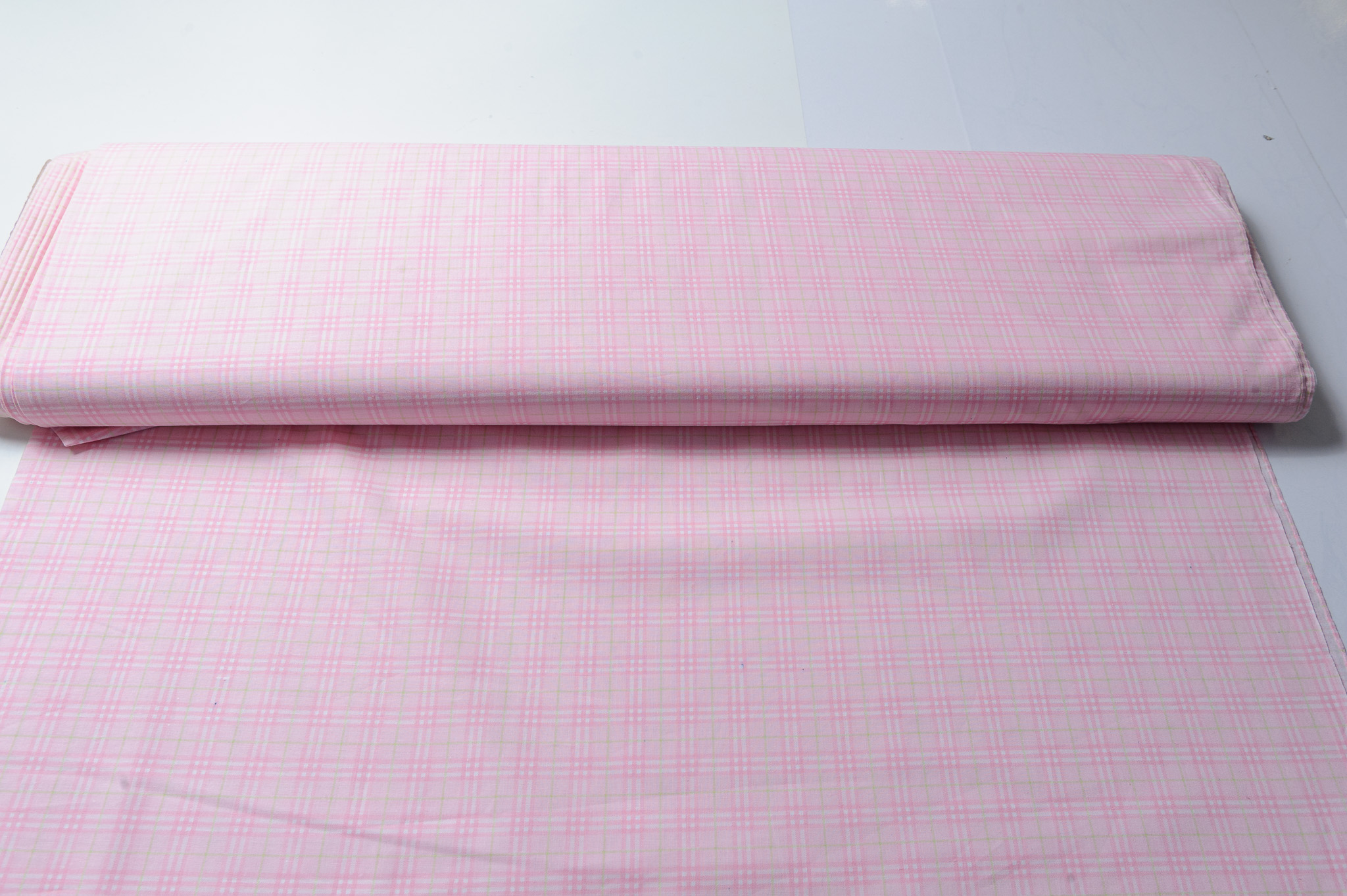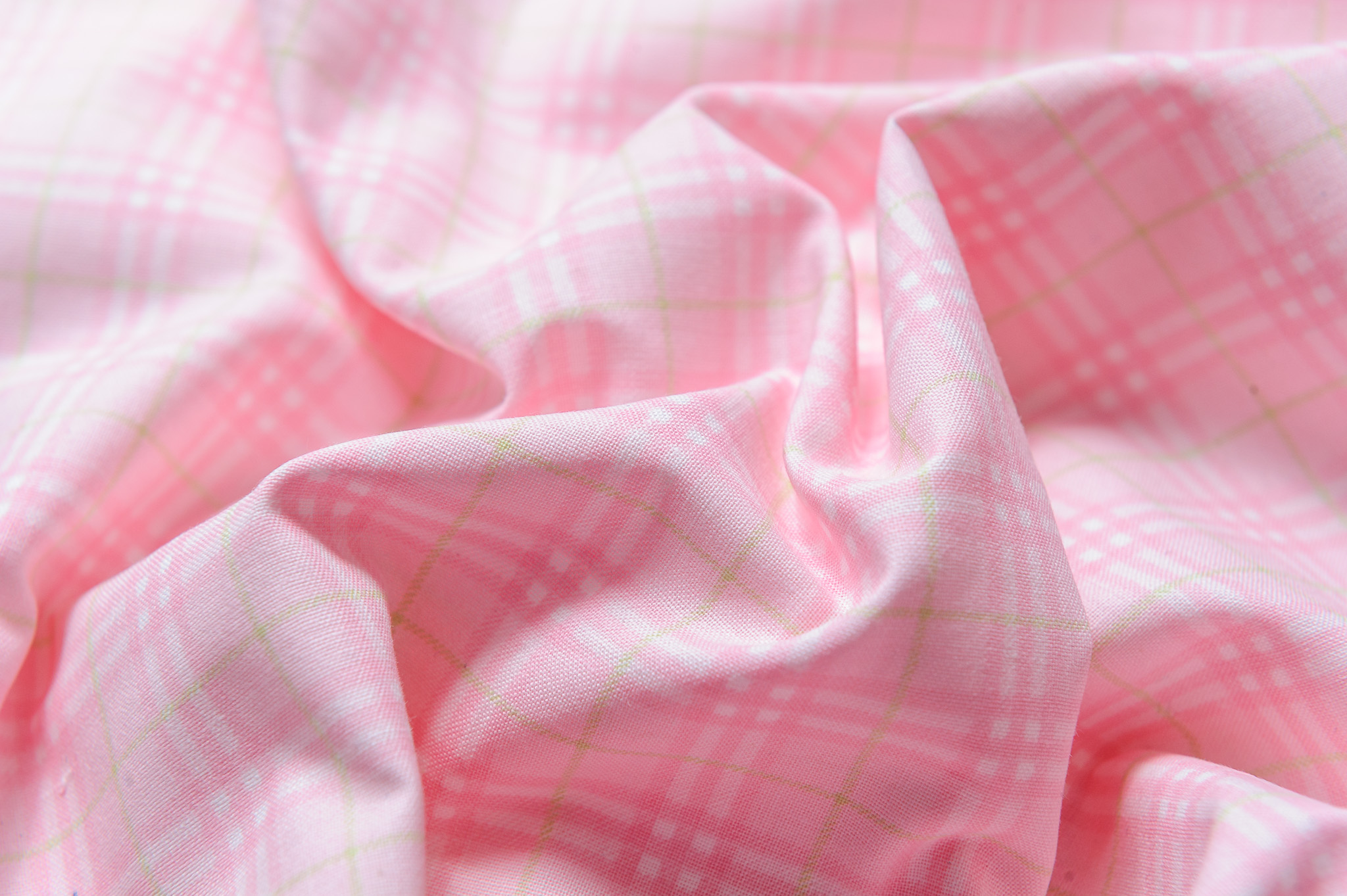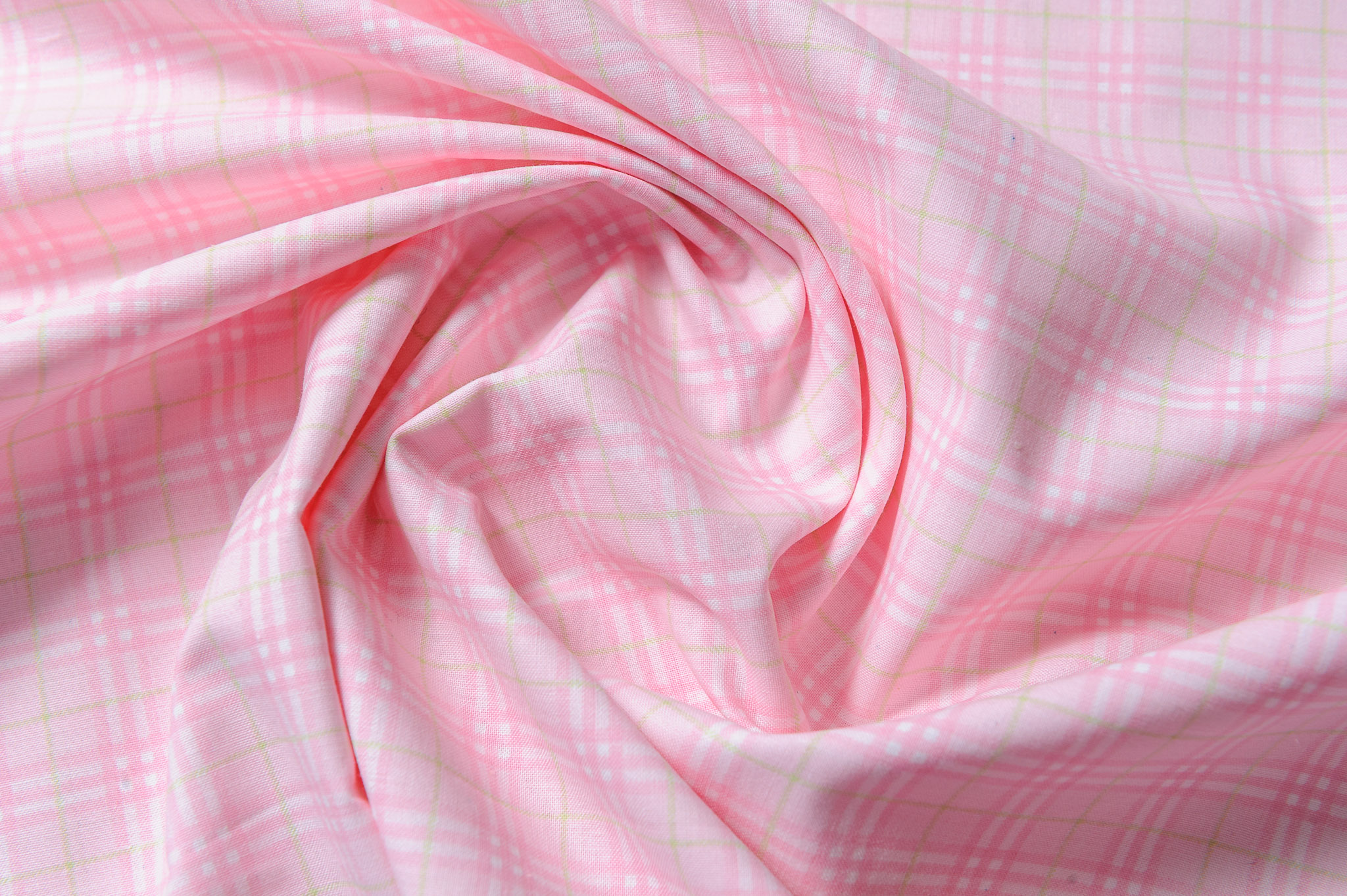 Materiał cienki, prześwitujący. Kratka różowo-biało-żółta. Odpowiedni na koszule, sukienki, spódnice.
