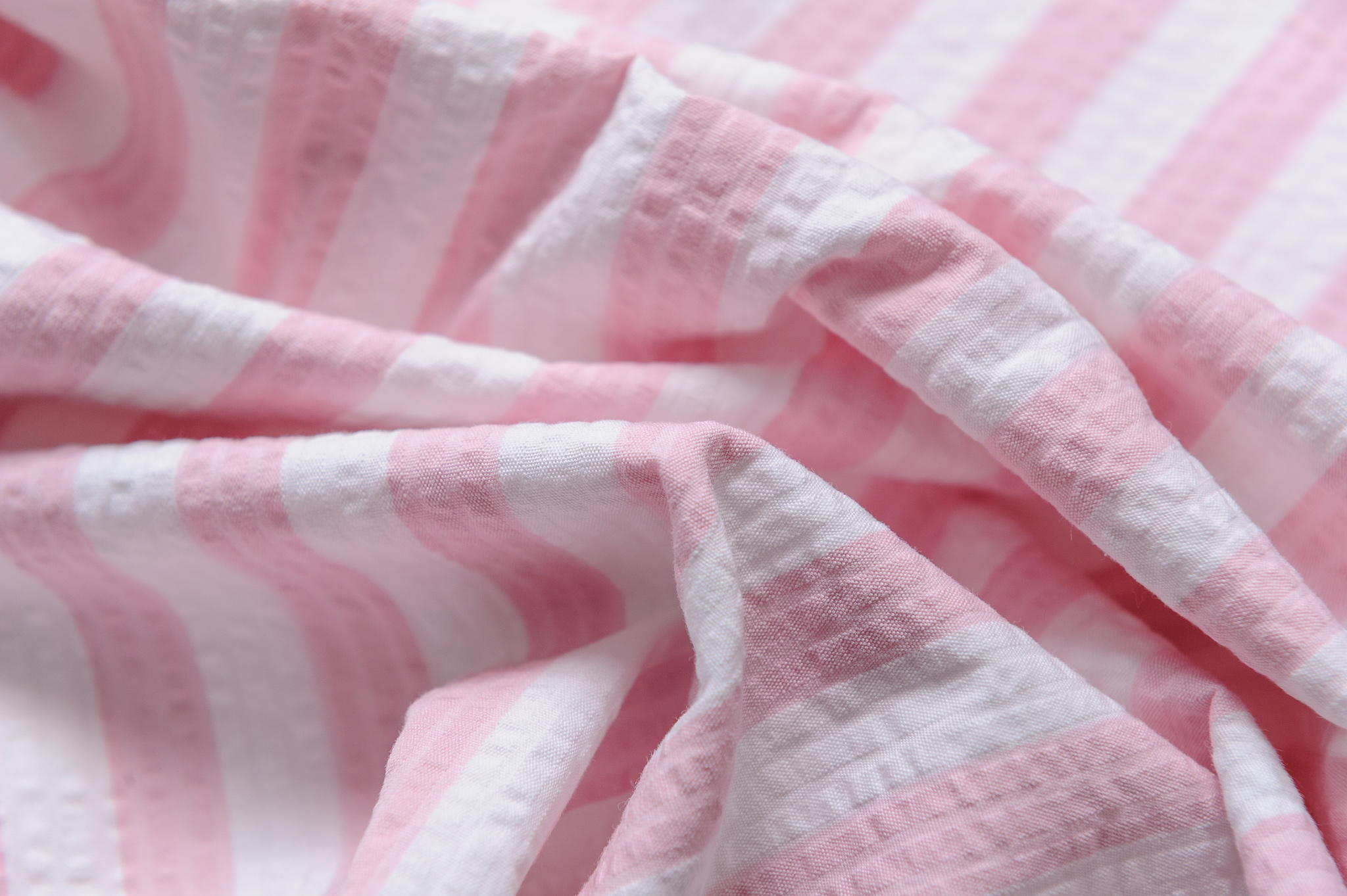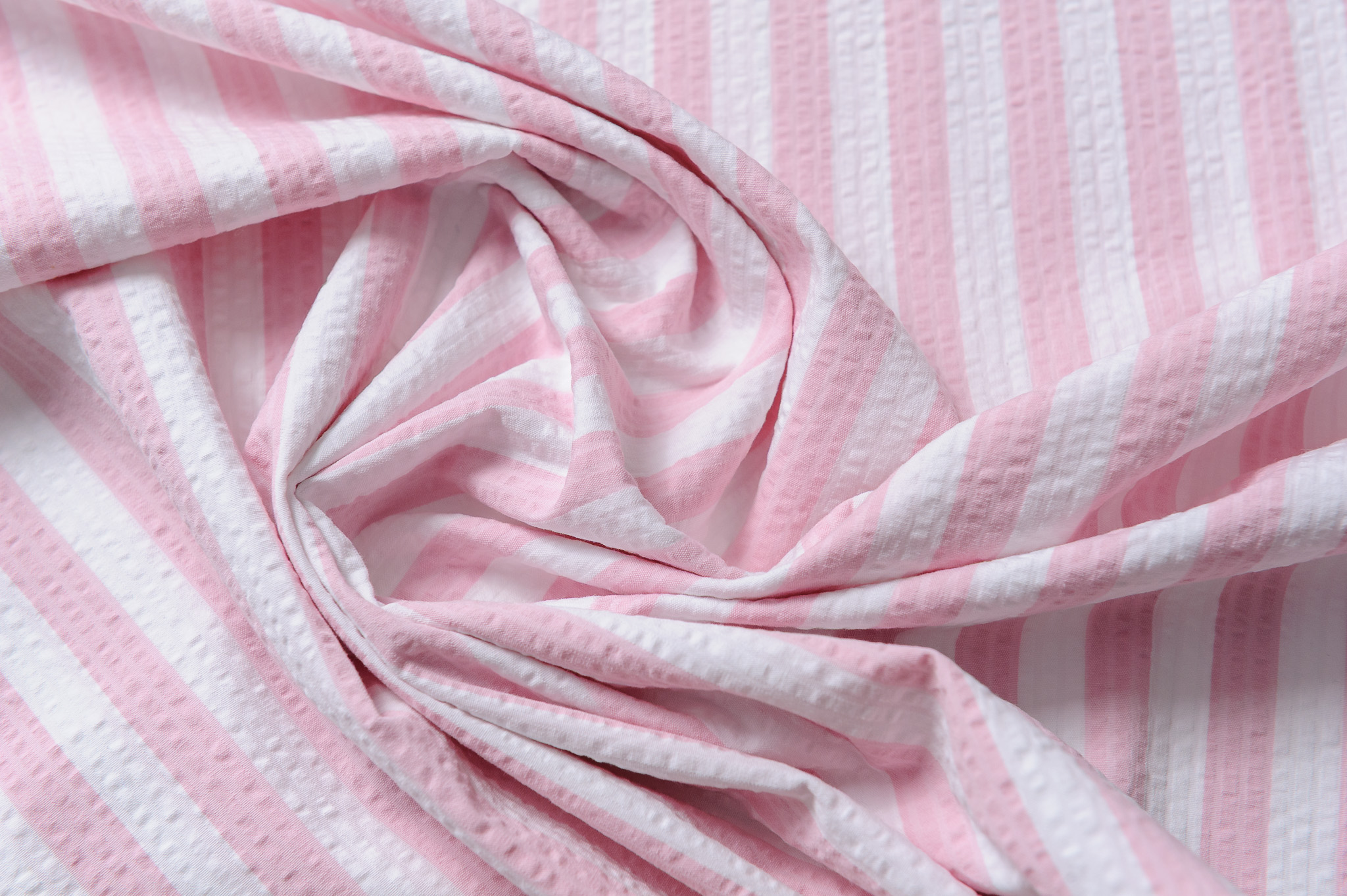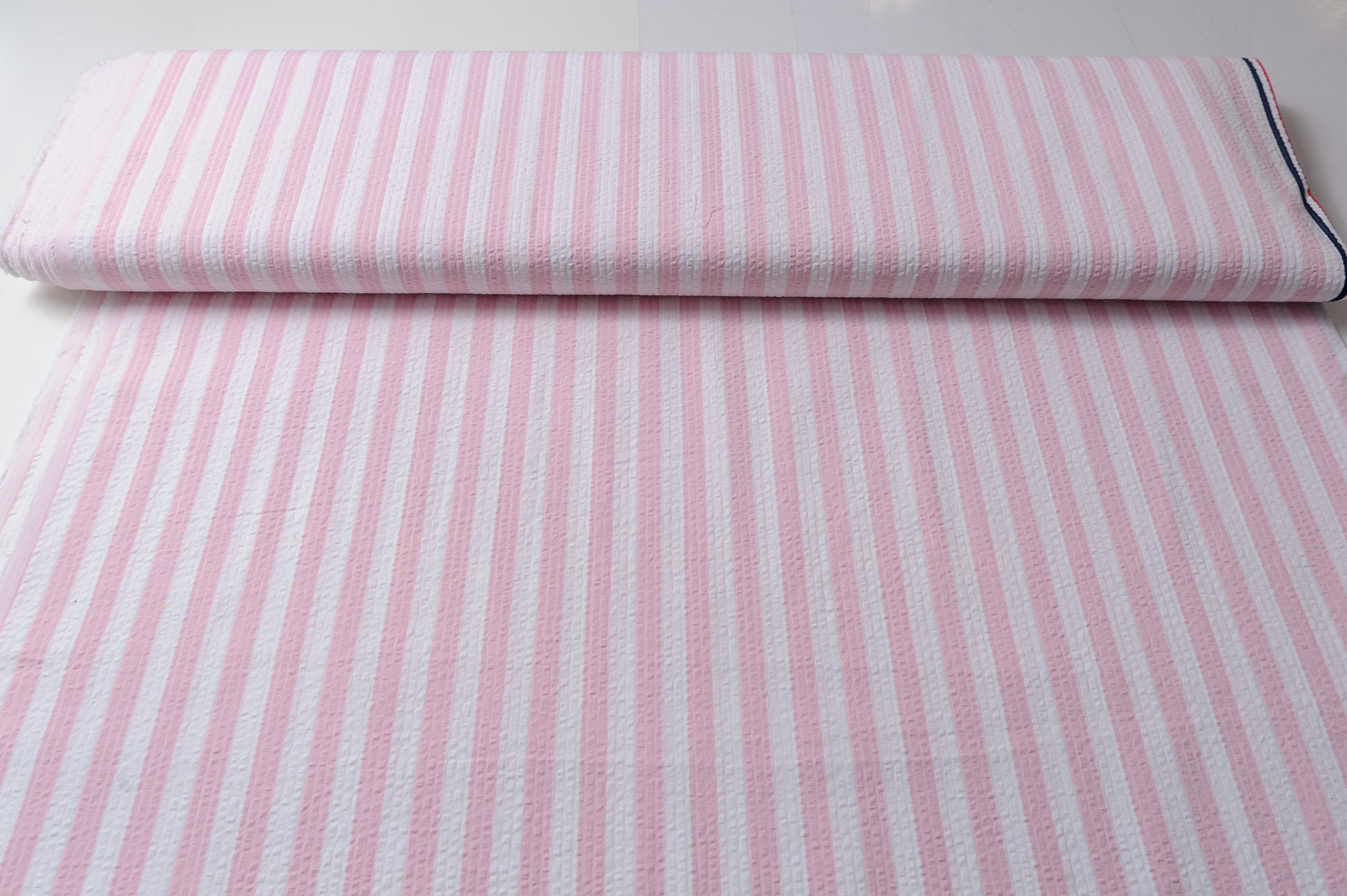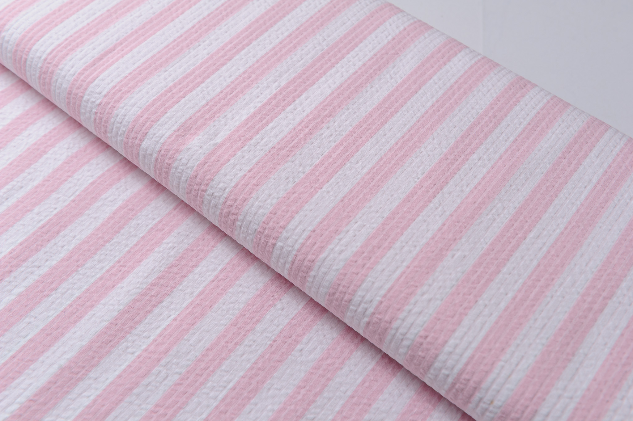 Materiał dość gruby i sztywny, nie prześwitujący. Wzór w paski w kolorze pudrowego różu i bieli. Odpowiedni na sukienki, spódnice, koszule, bluzki, spodnie