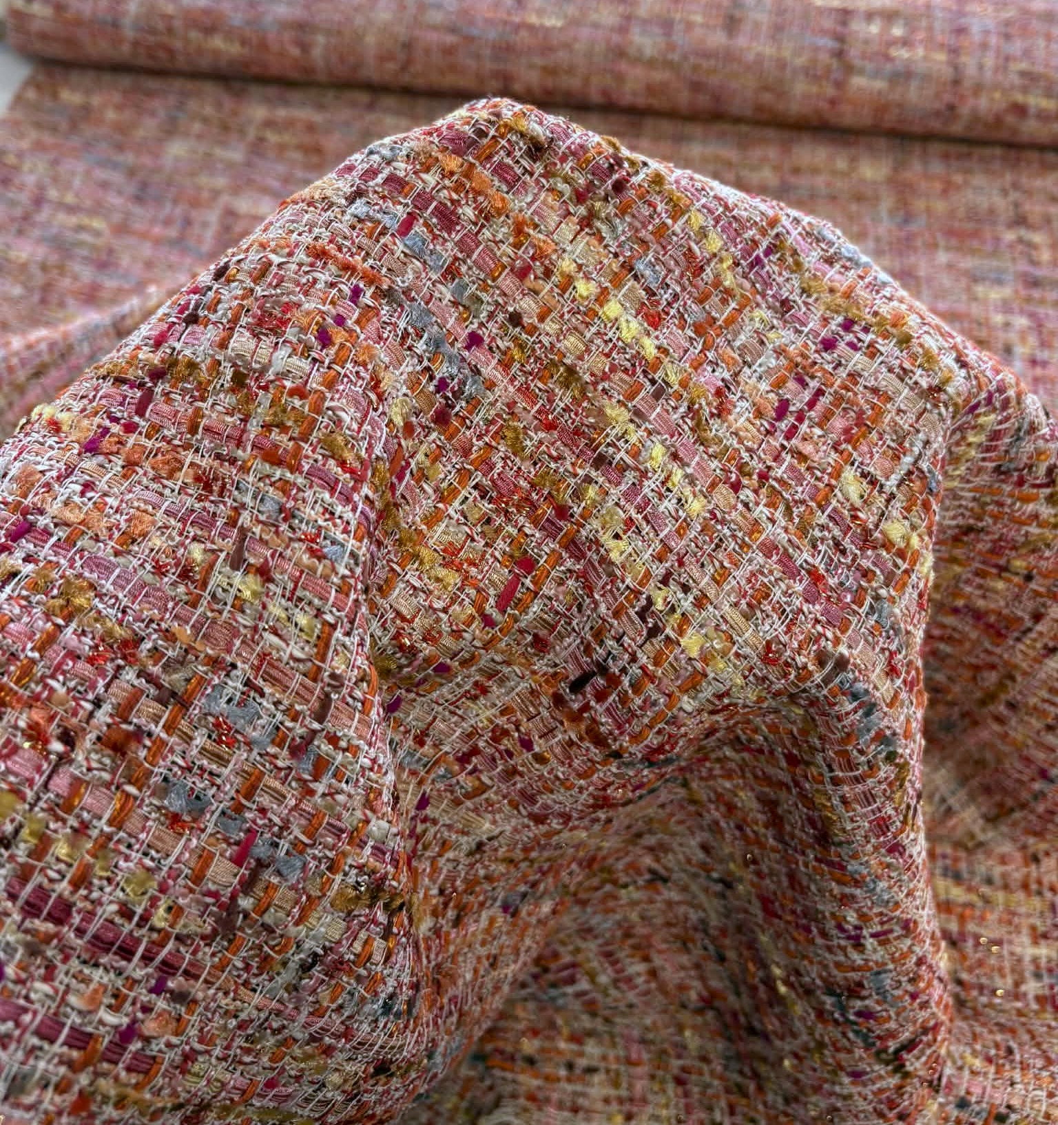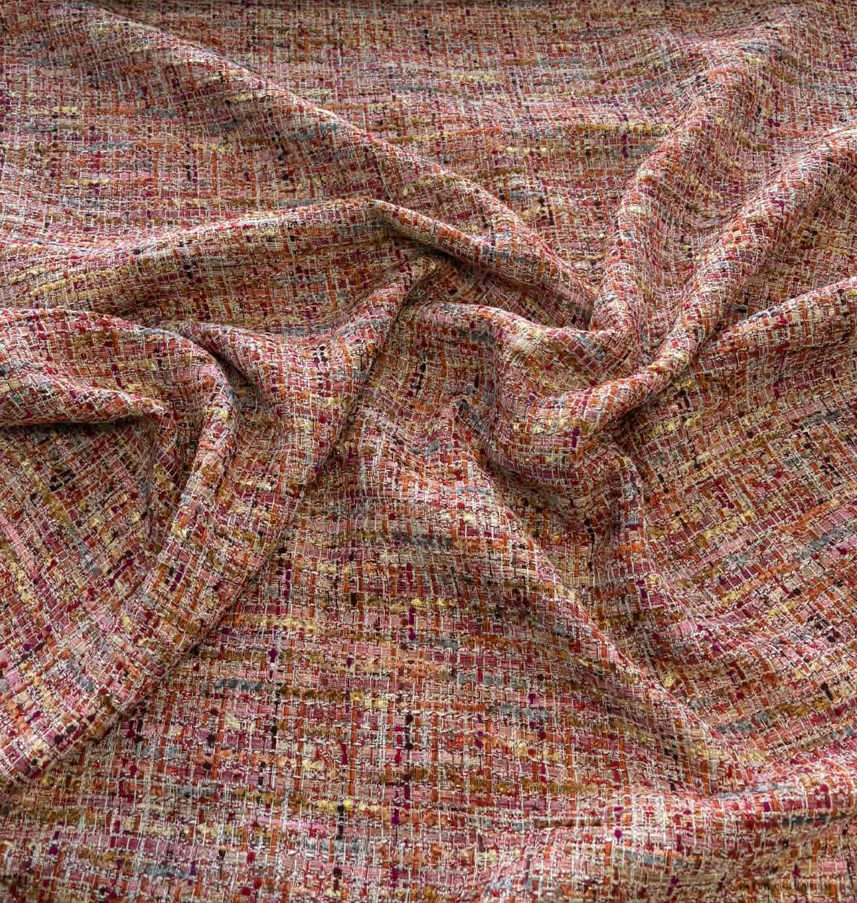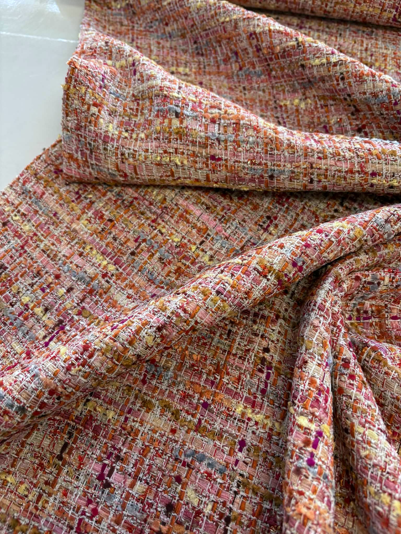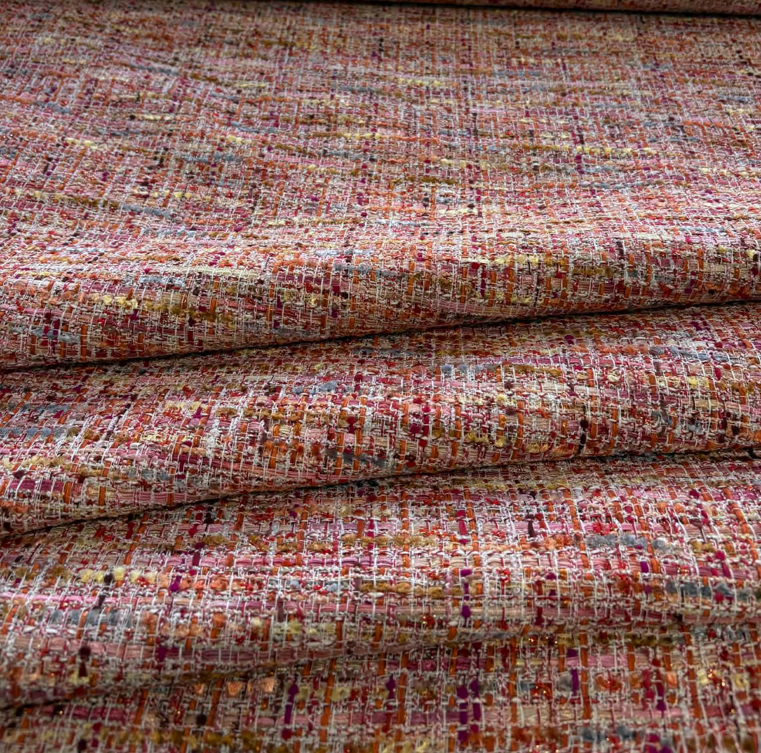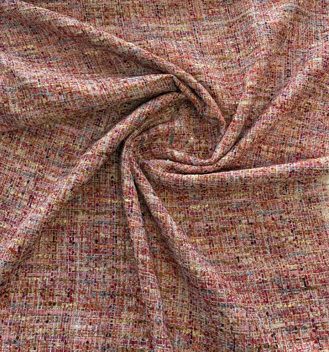 Materiał grubszy, nie prześwituje. Kolory pomarańczowe, różowe, żółte oraz splot charakterystyczny dla chanelek.