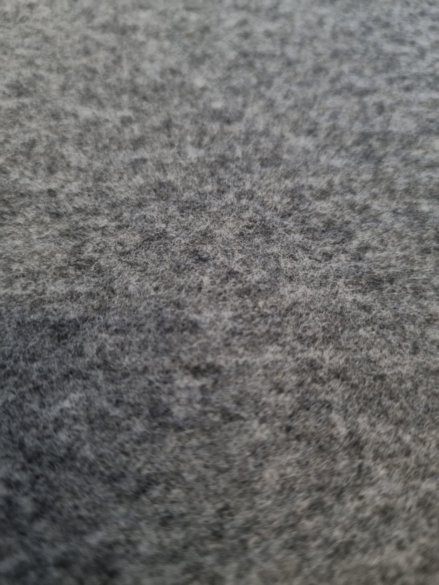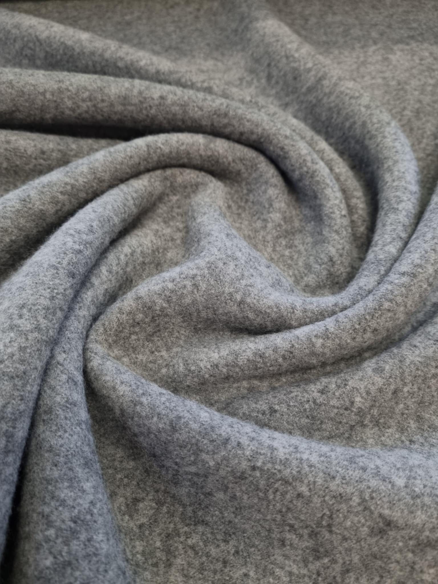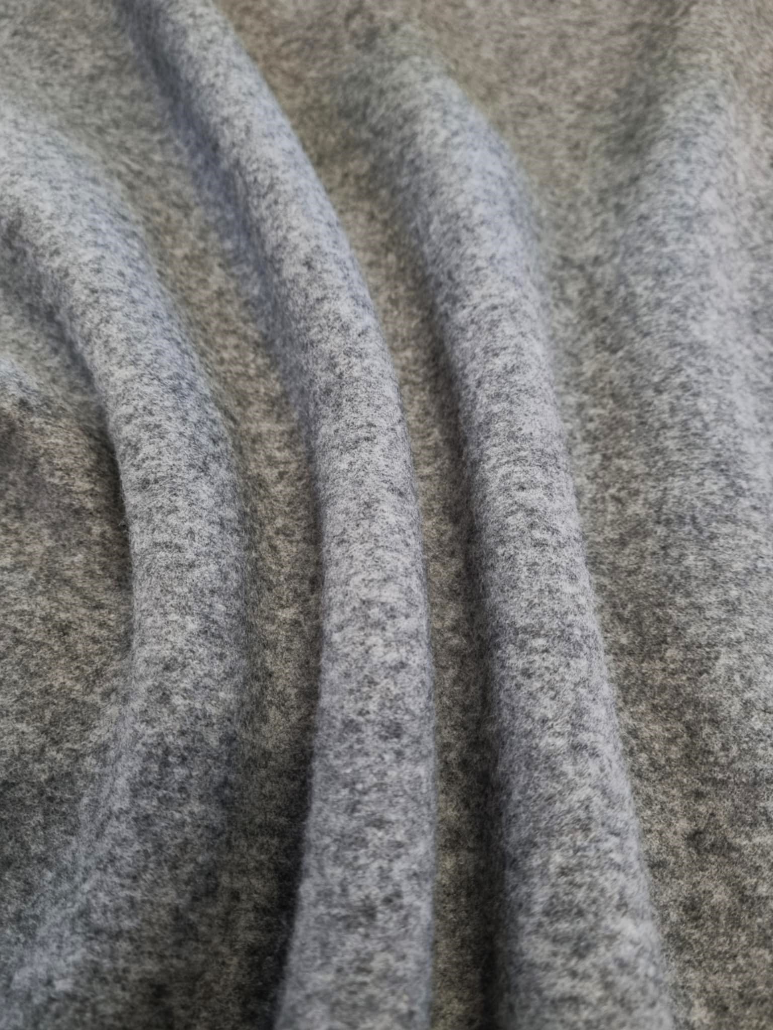 Materiał gruby, miły w dotyku. Kolor szary melanż. Odpowiedni na swetry, kardigany.