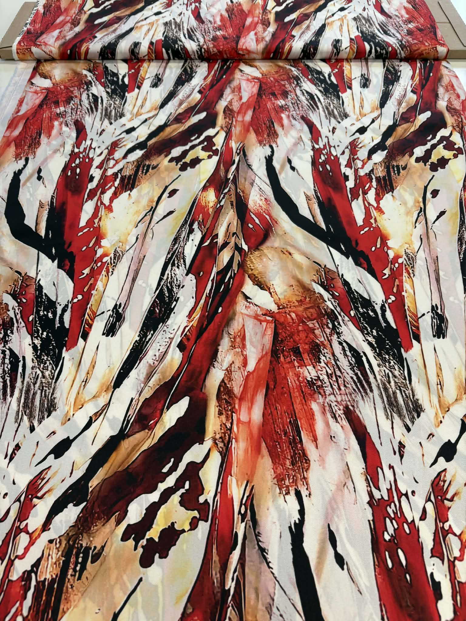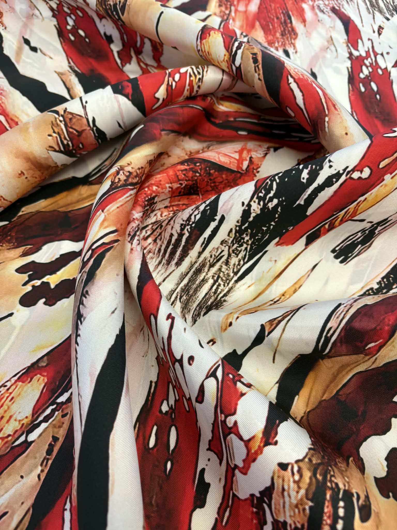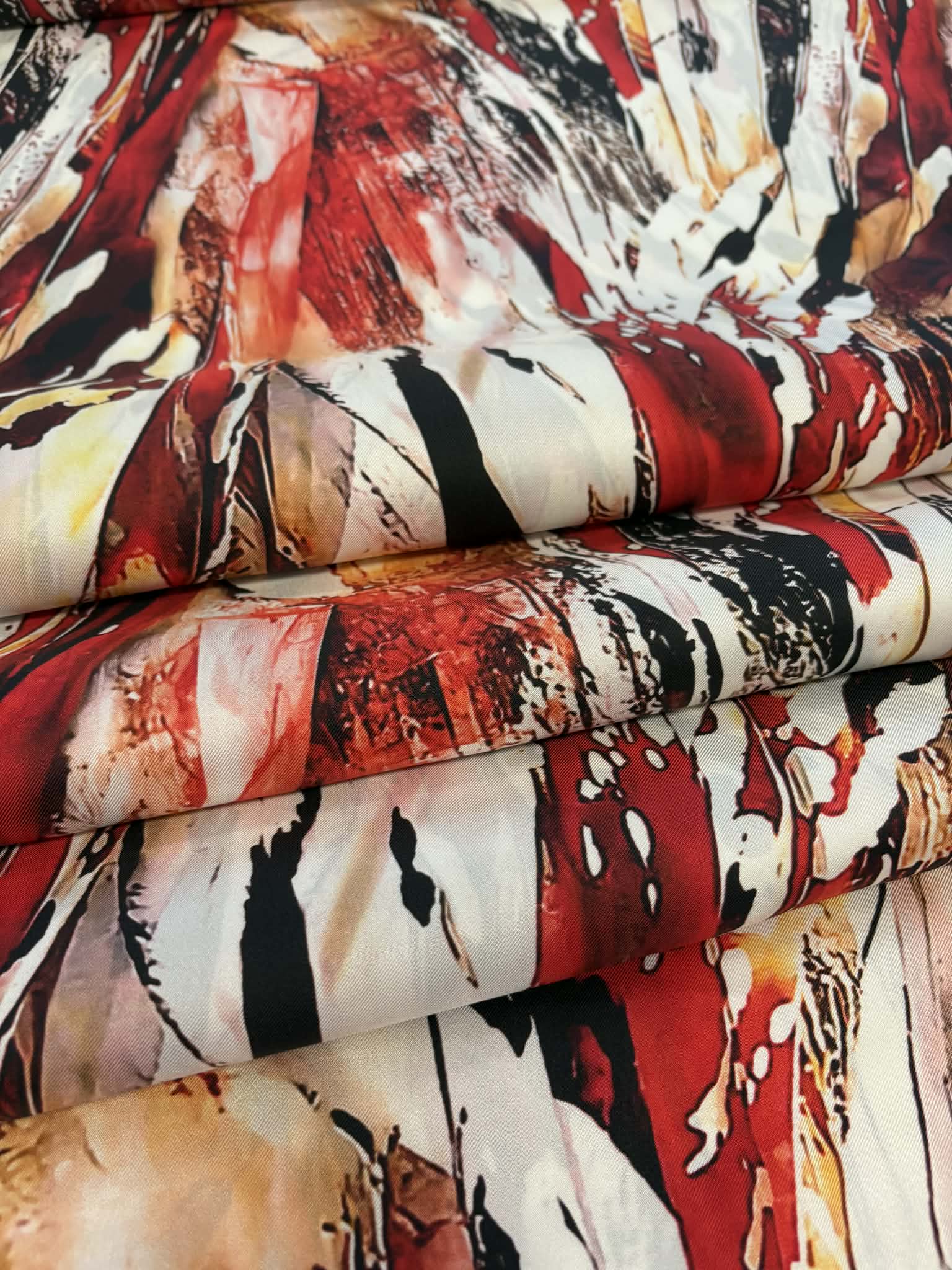 Materiał delikatnie sztywniejszy, nieprześwitujący. Wzór abstrakcyjny czerwono-czarno-śmietanowy. Odpowiedni na sukienki, koszule, spódnice, spodnie, bluzki.