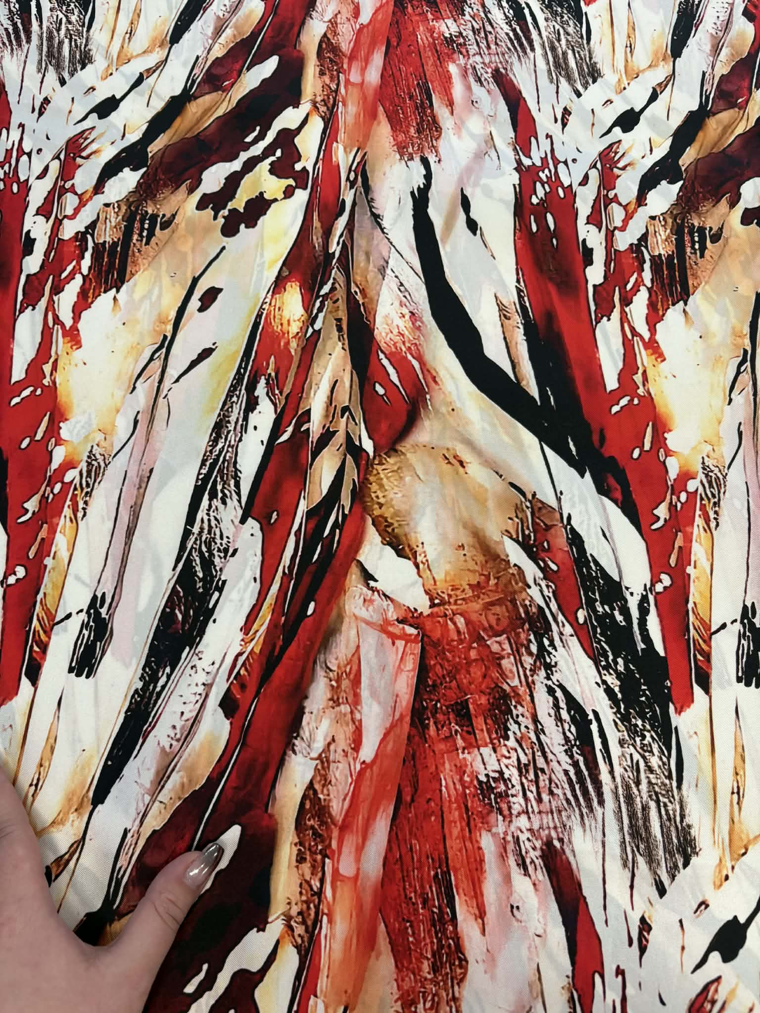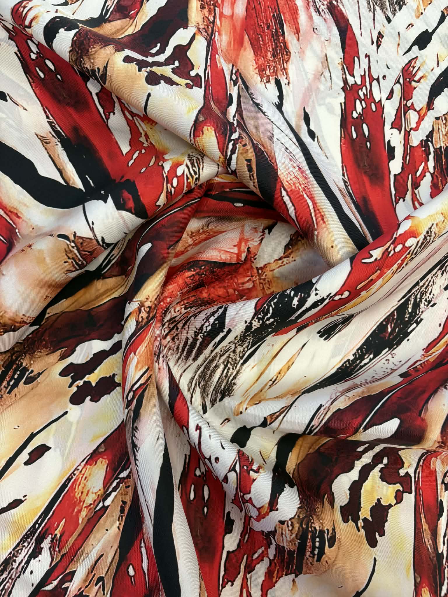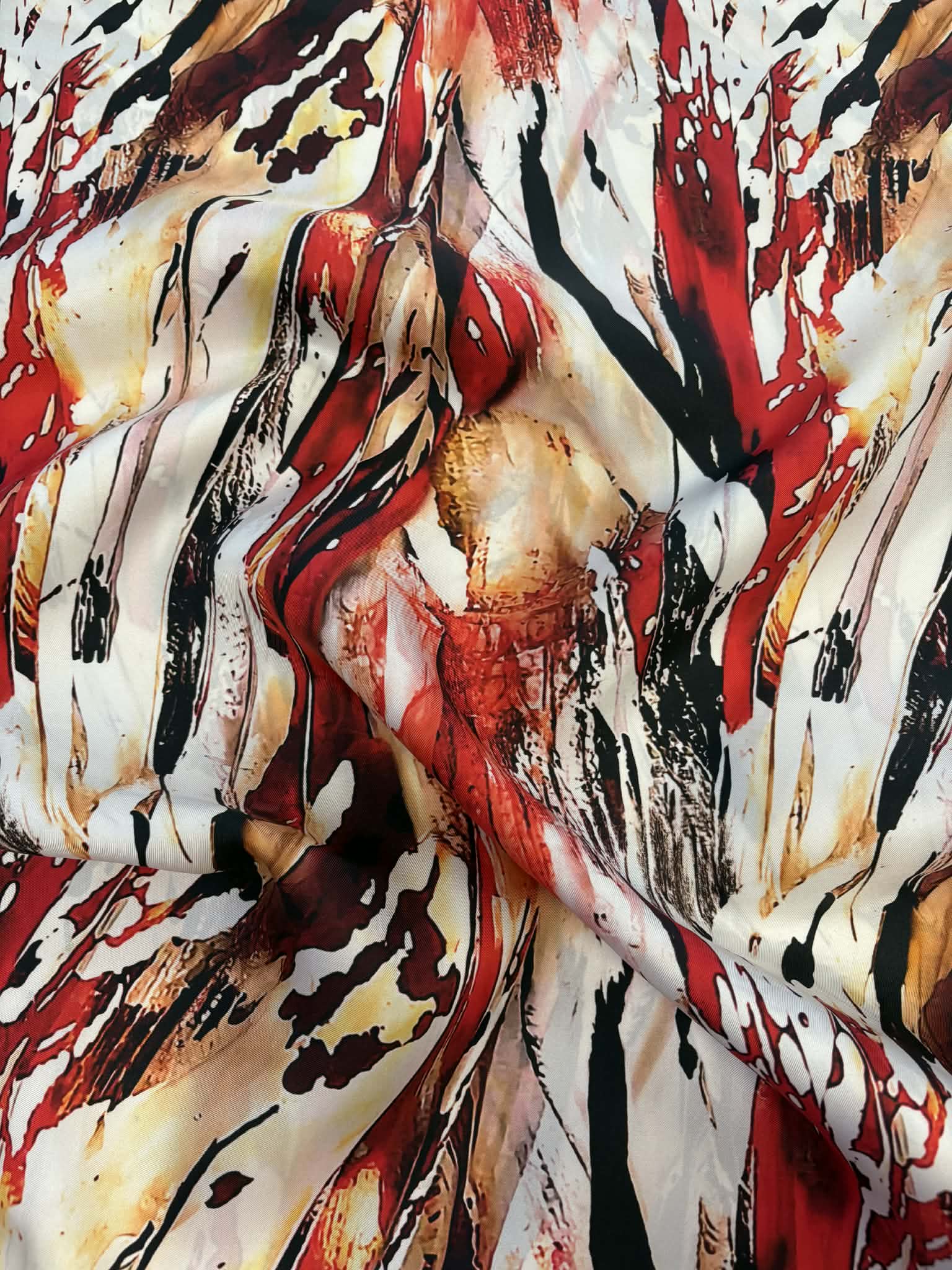 Materiał delikatnie sztywniejszy, nieprześwitujący. Wzór abstrakcyjny czerwono-czarno-śmietanowy. Odpowiedni na sukienki, koszule, spódnice, spodnie, bluzki.
