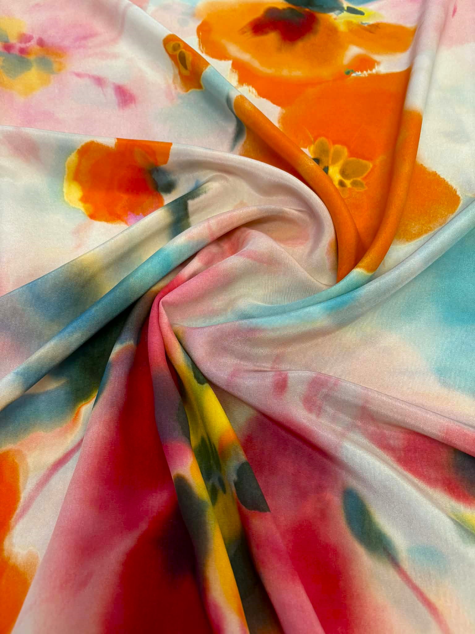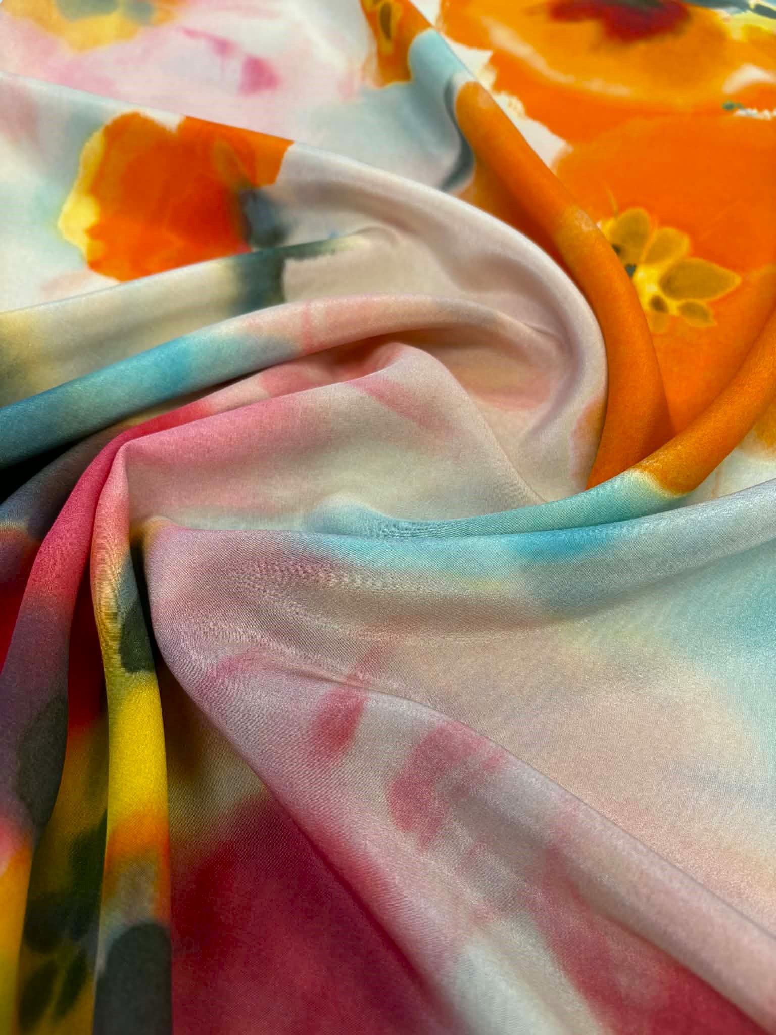 Materiał cienki, delikatnie prześwitujący. Wzór abstrakcyjny w pastelowych kolorach. Odpowiedni na koszule, sukienki, spódnice.