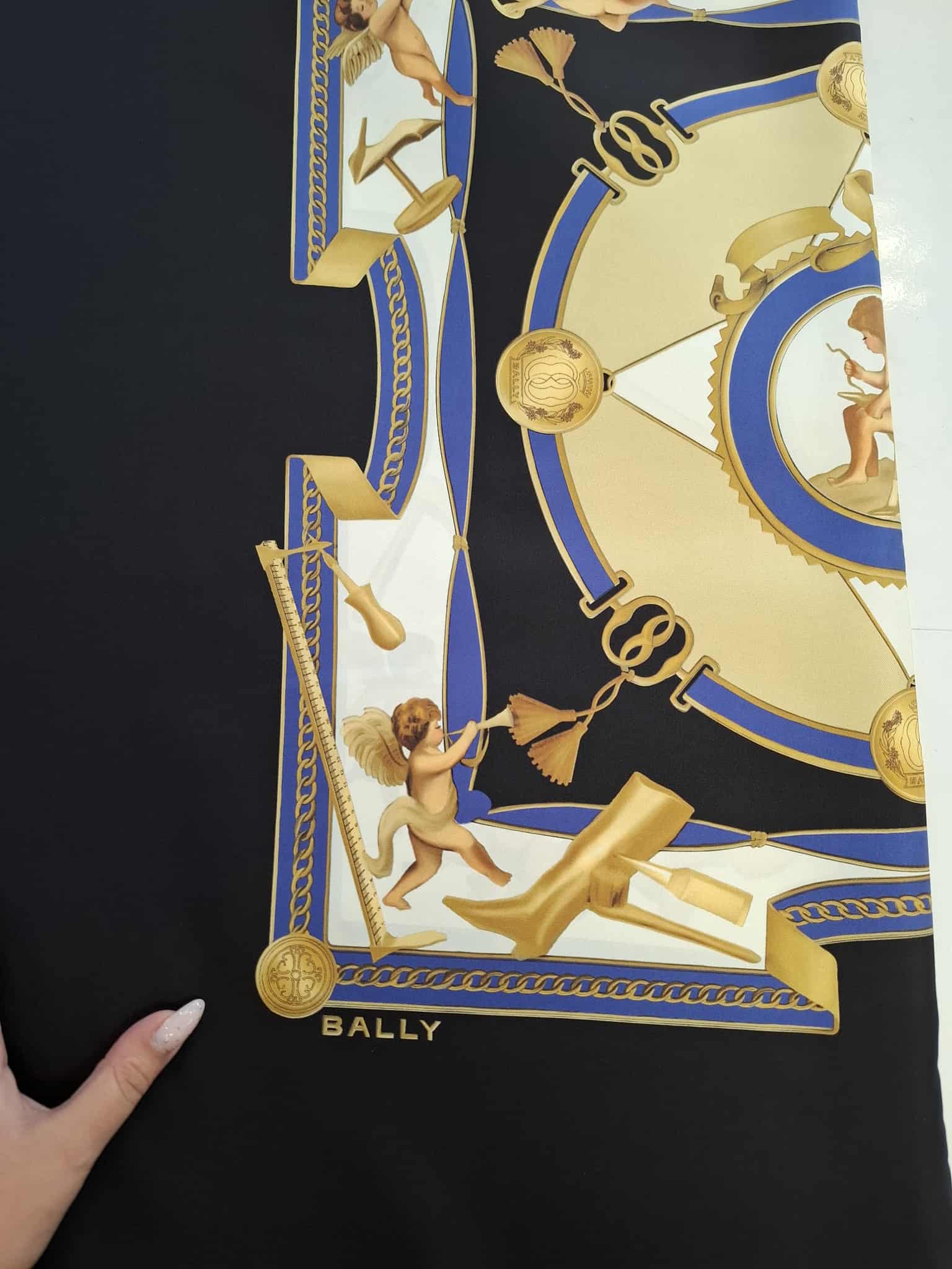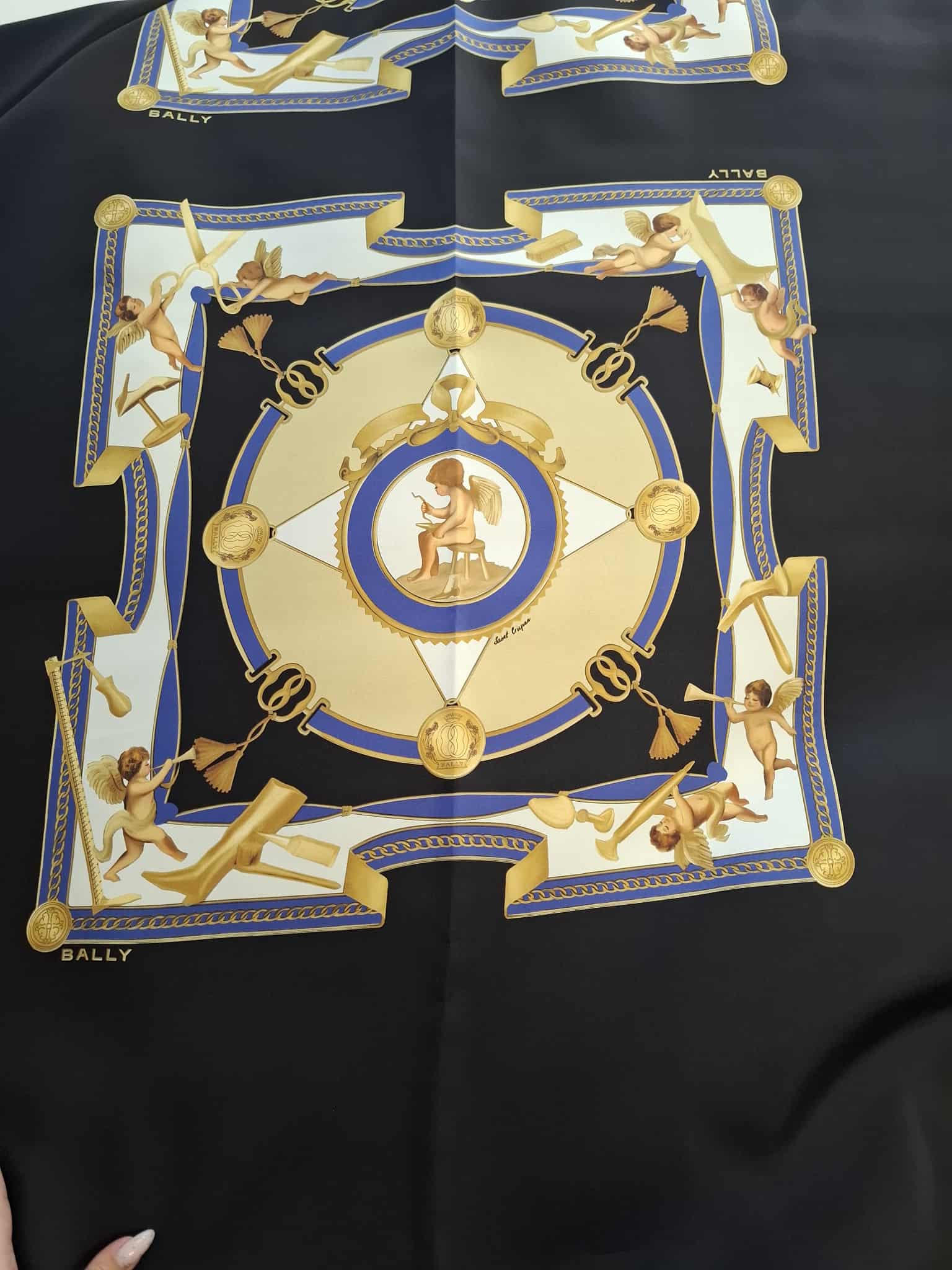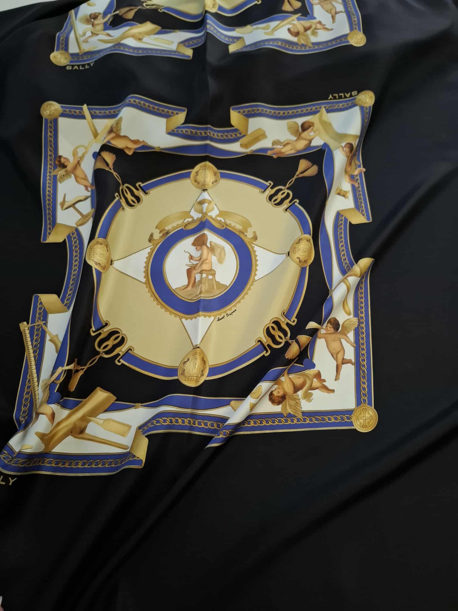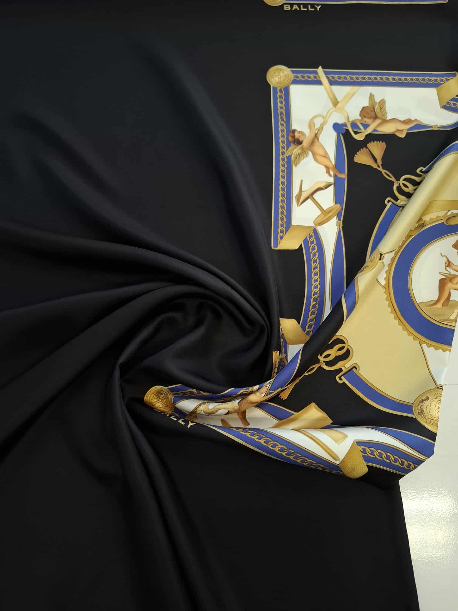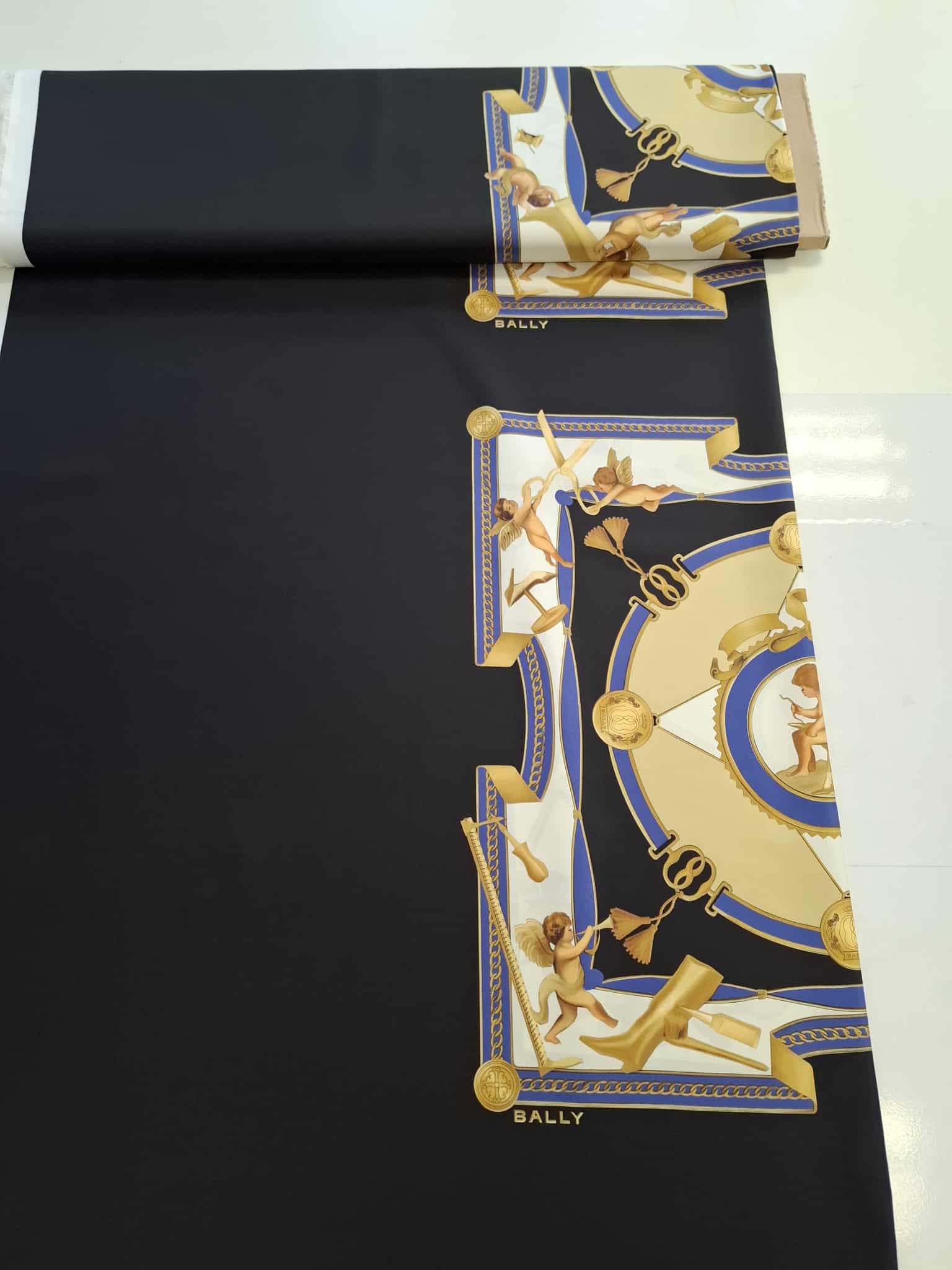 Materiał nie prześwituje. Na środku znajdują się małe aniołki oraz elementy dekoracyjne w złotym kolorze na czarnym tle.Odpowiedni na sukienki, koszule, spódnice.