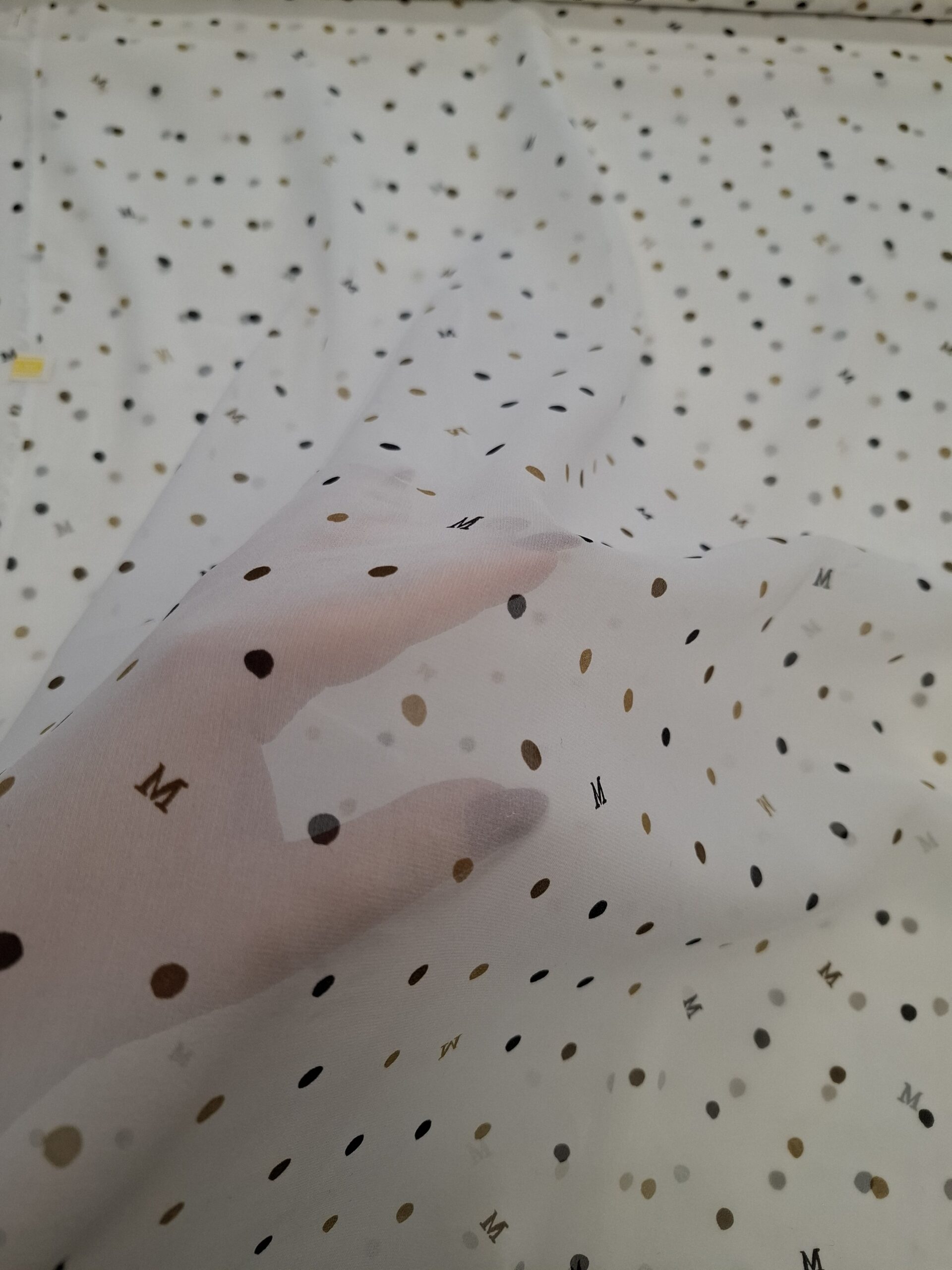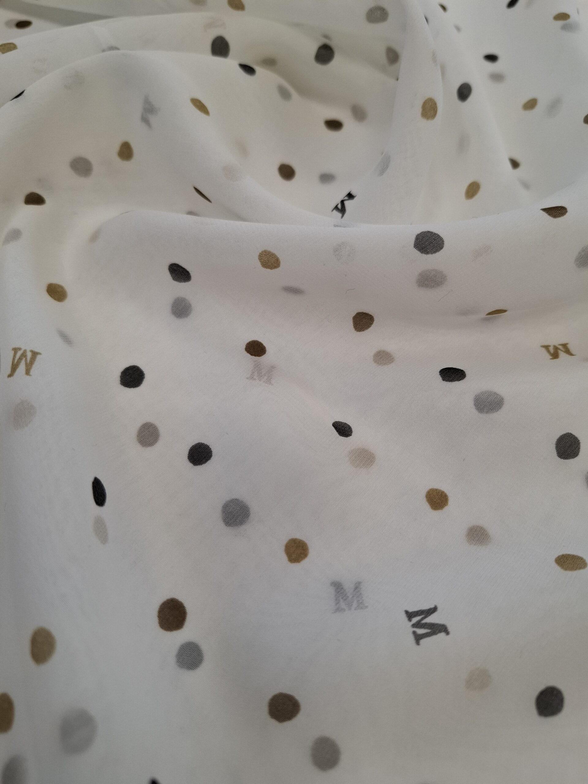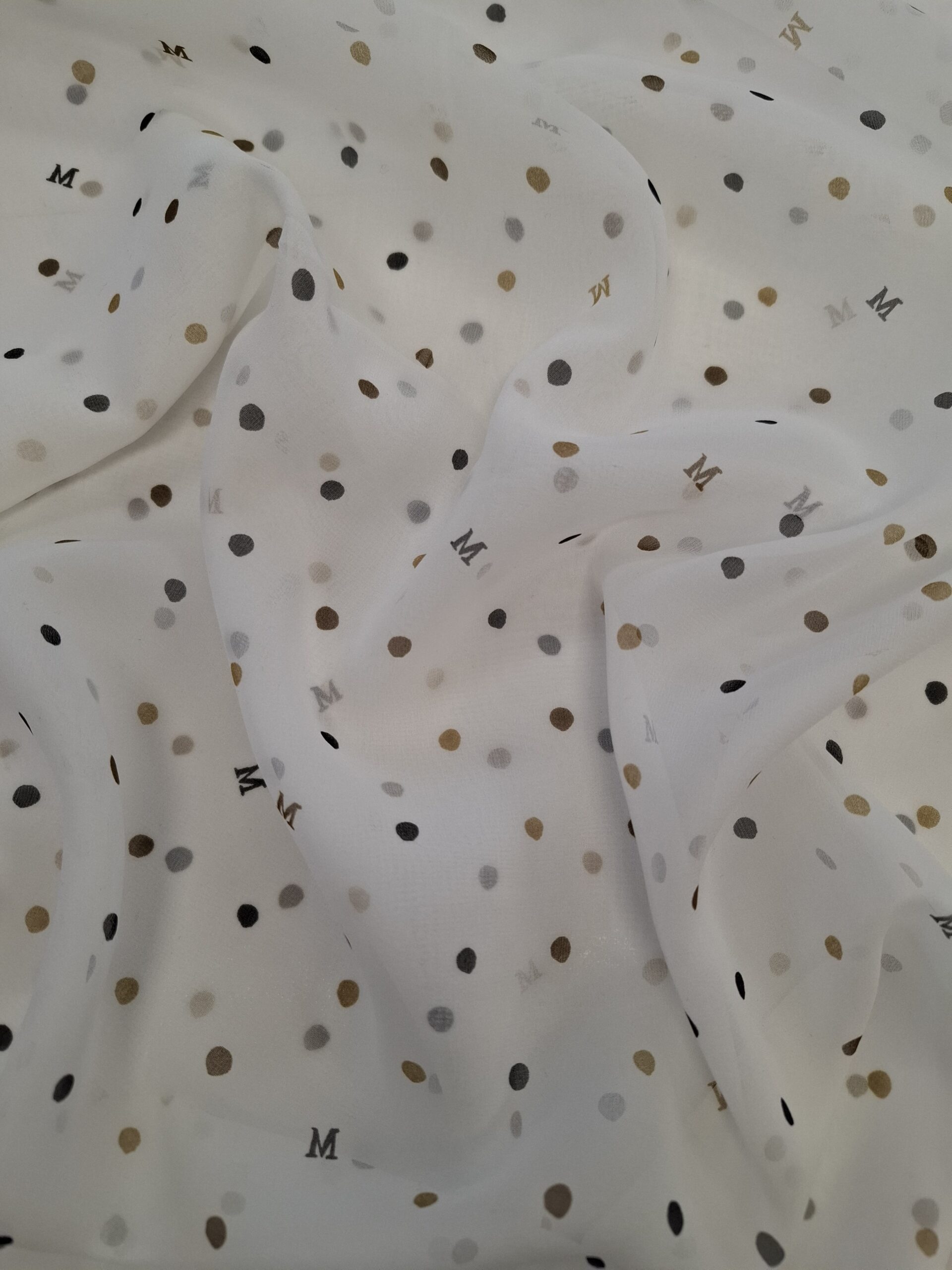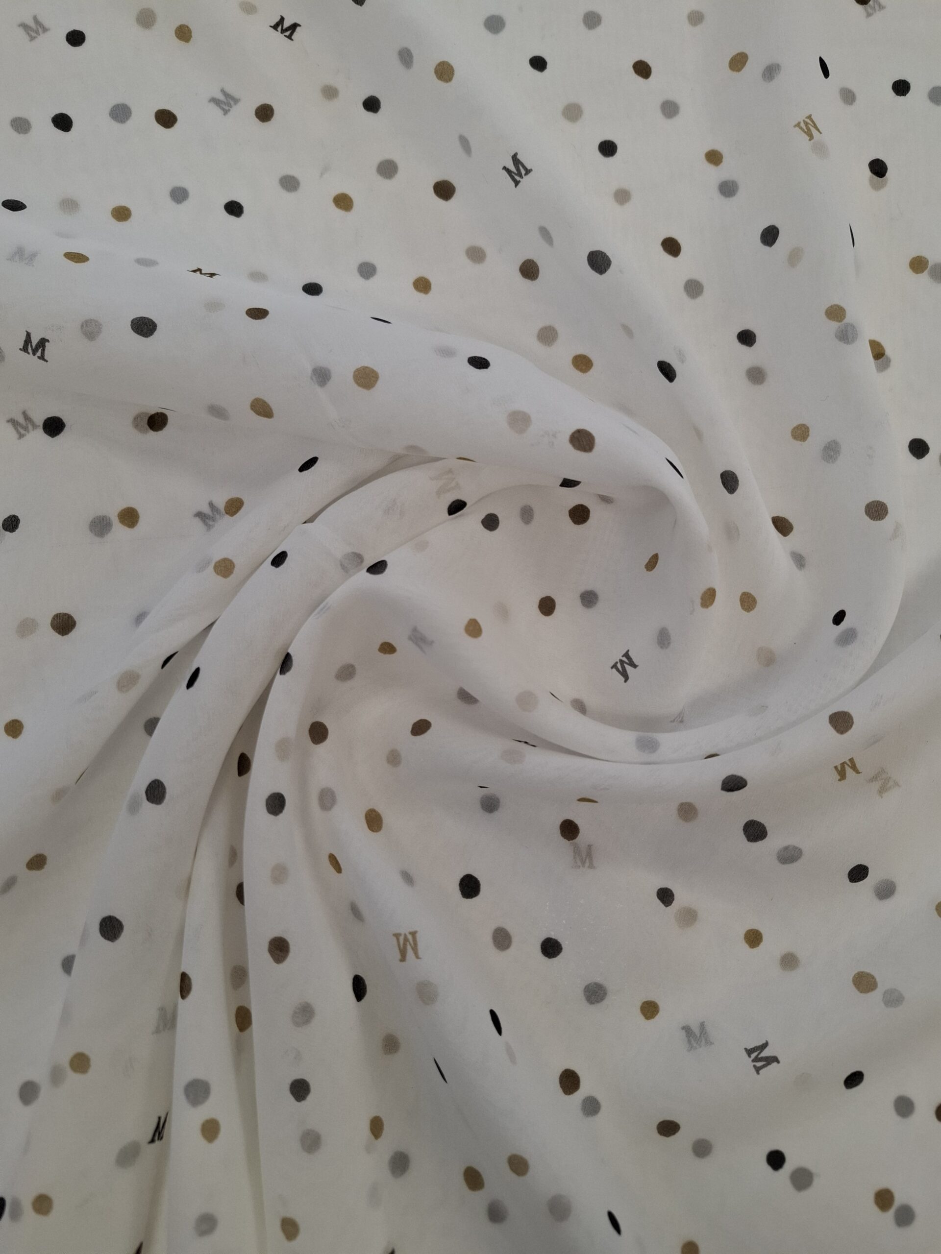 Materiał cienki i prześwitujący. Wzór w kropeczki beżowe i czarne , literki M na śmietanowym tle. Odpowiedni na sukienki, spódnice, koszule.