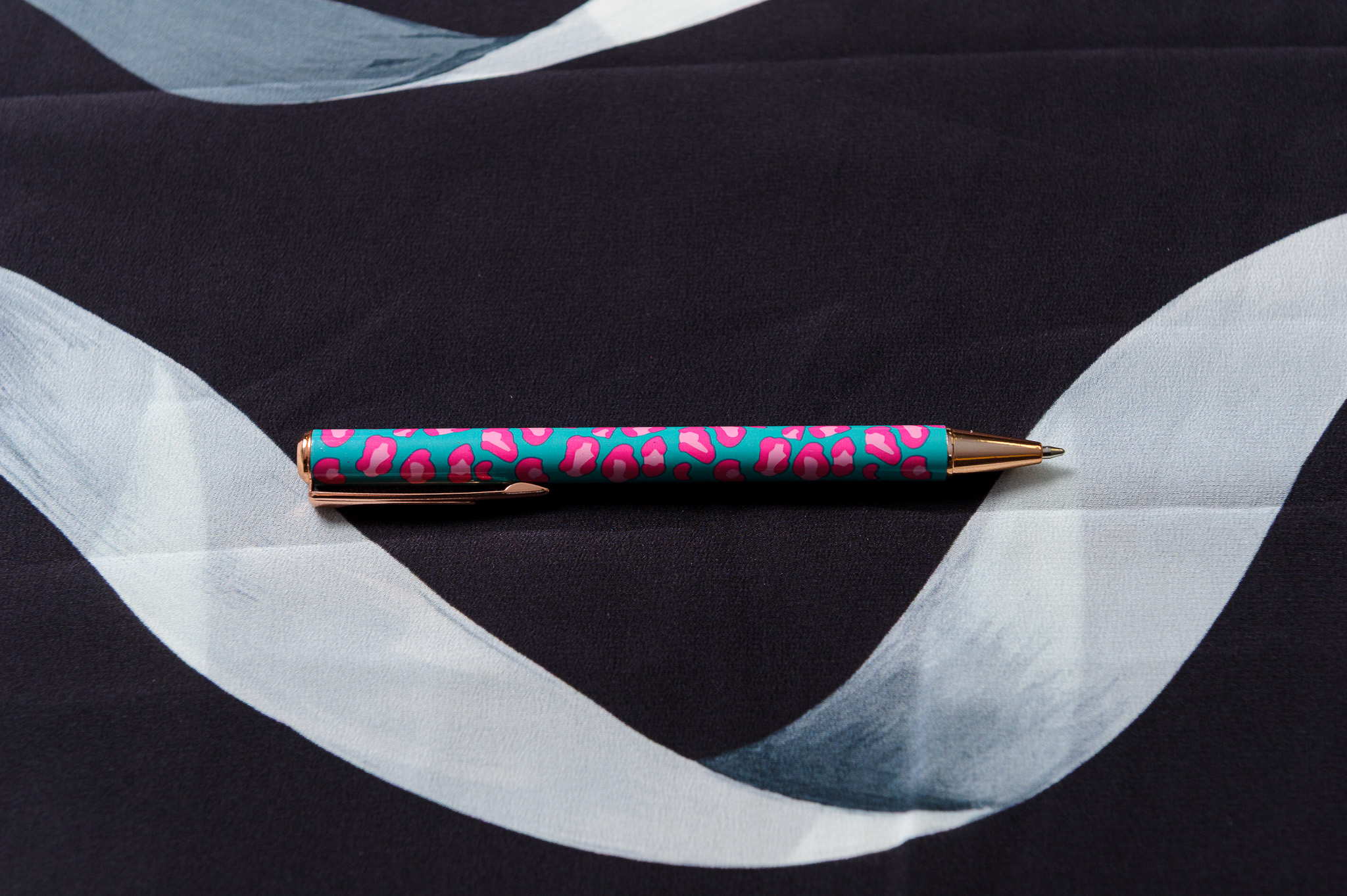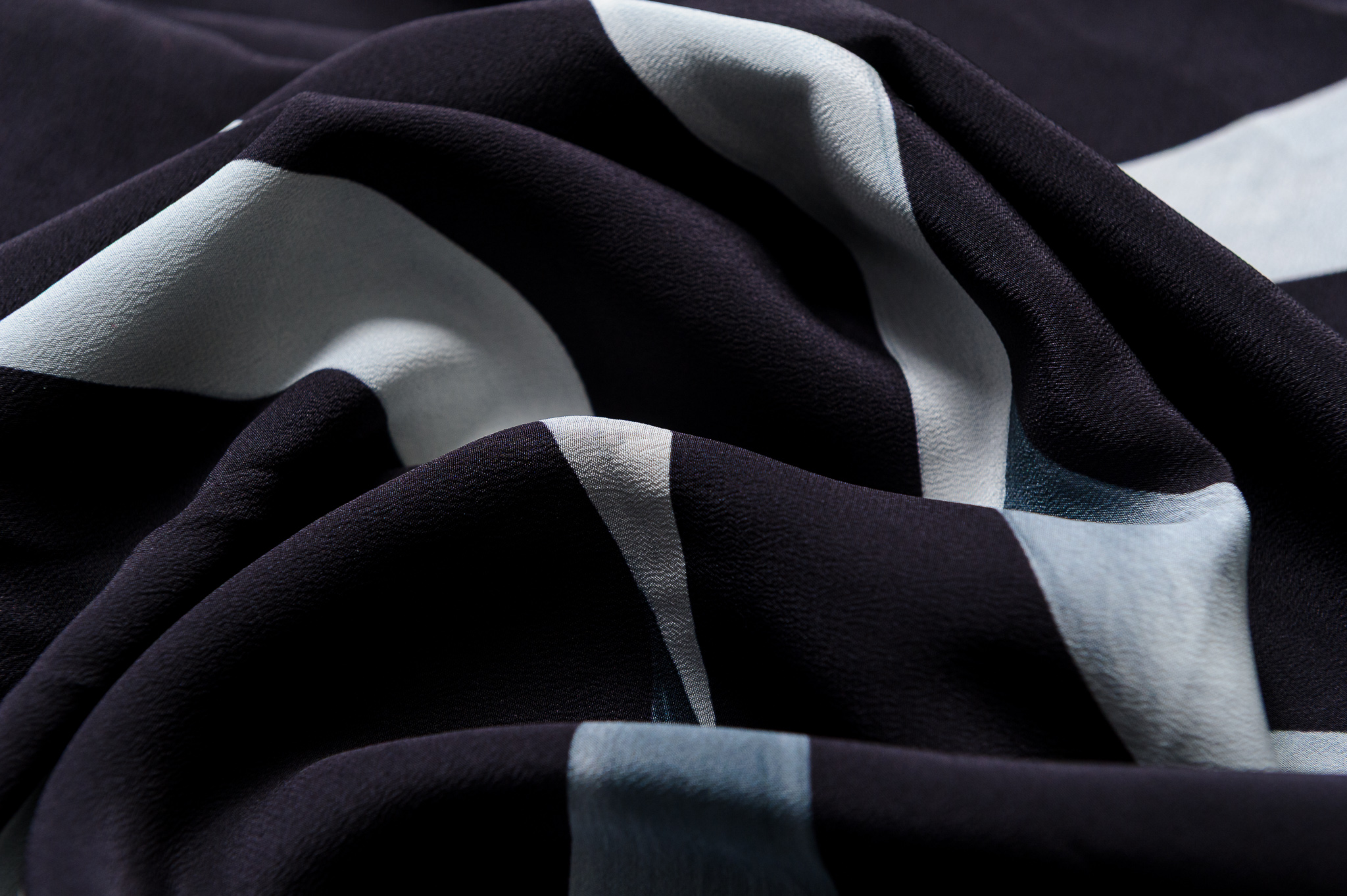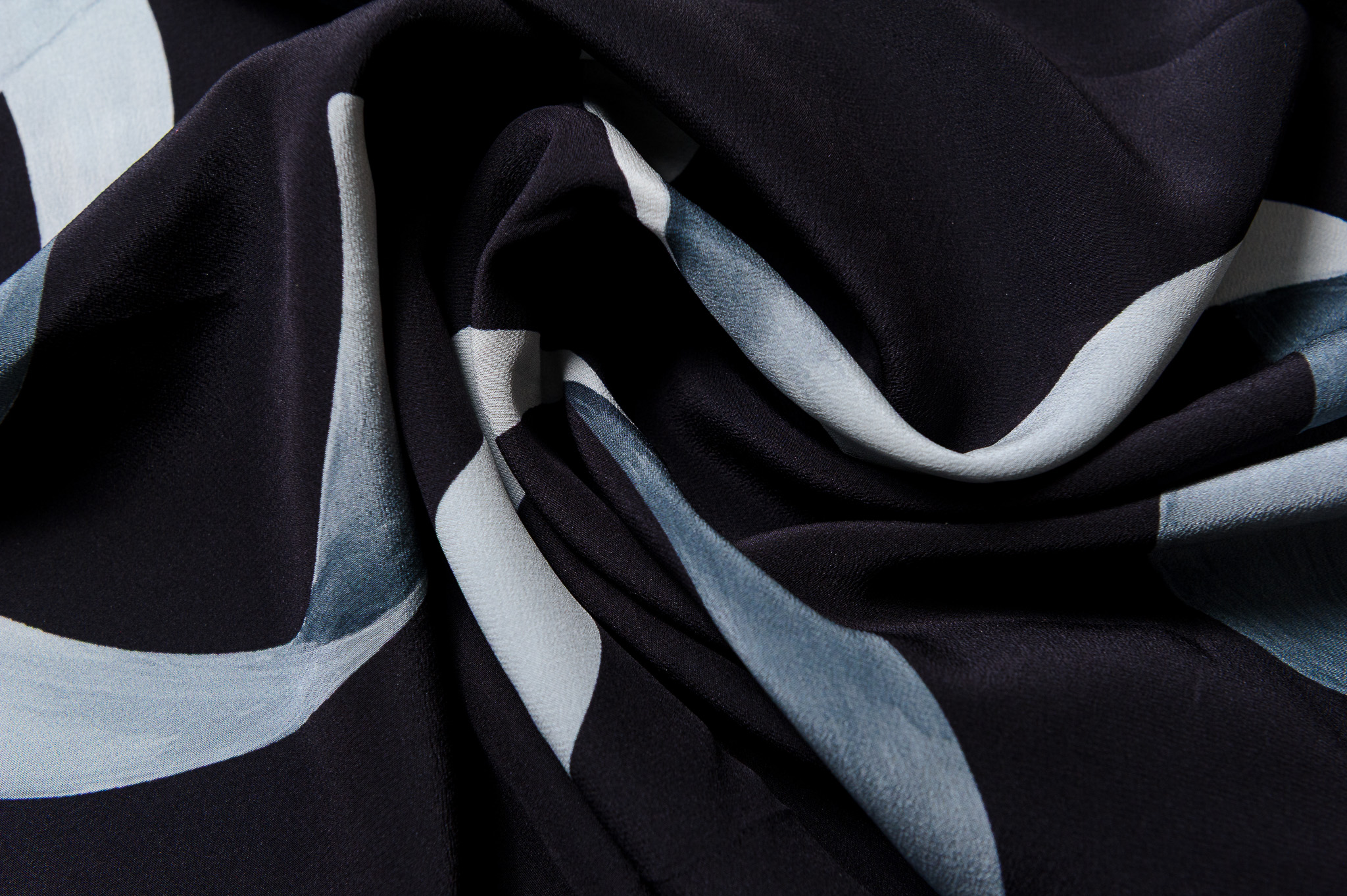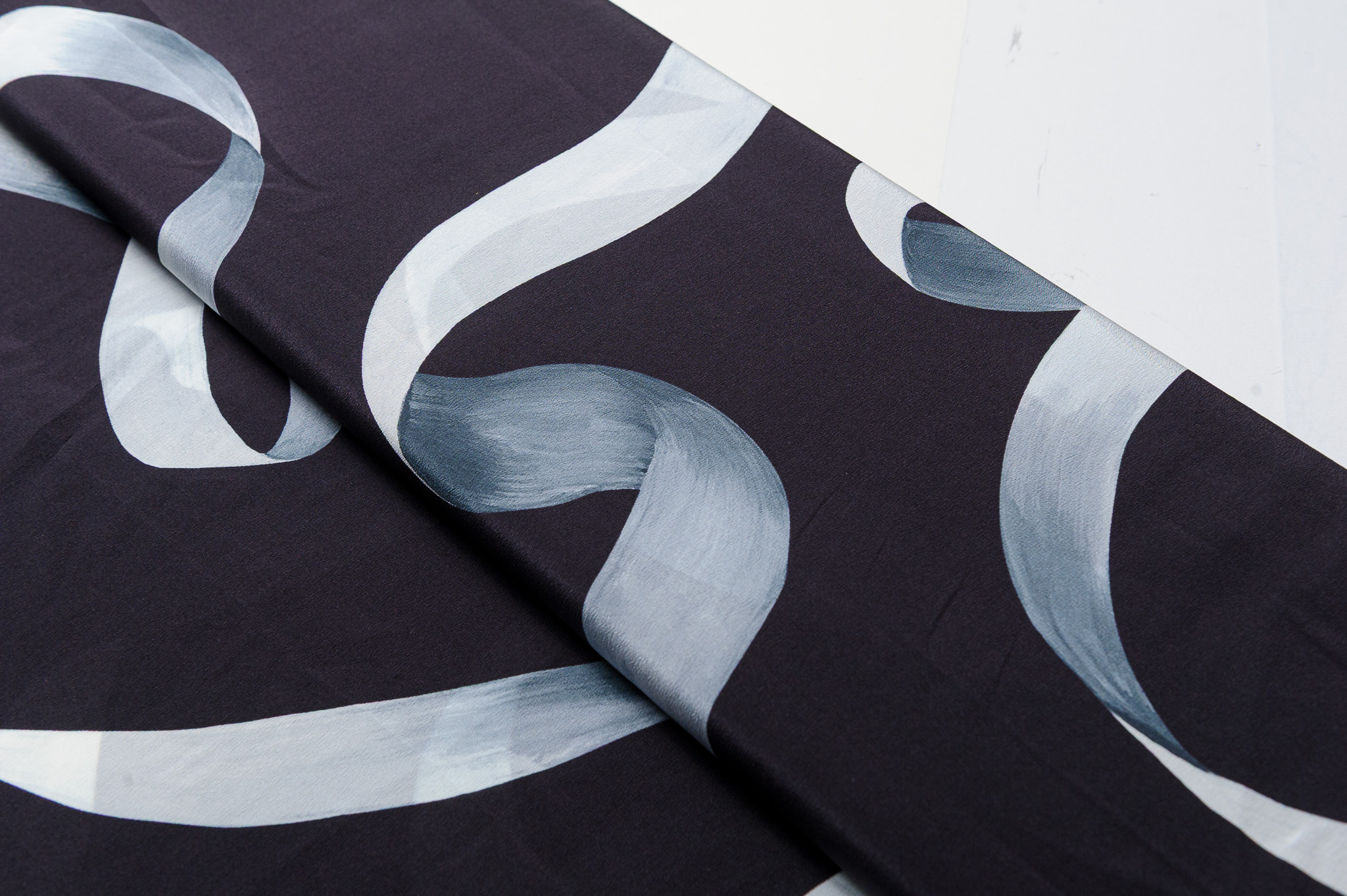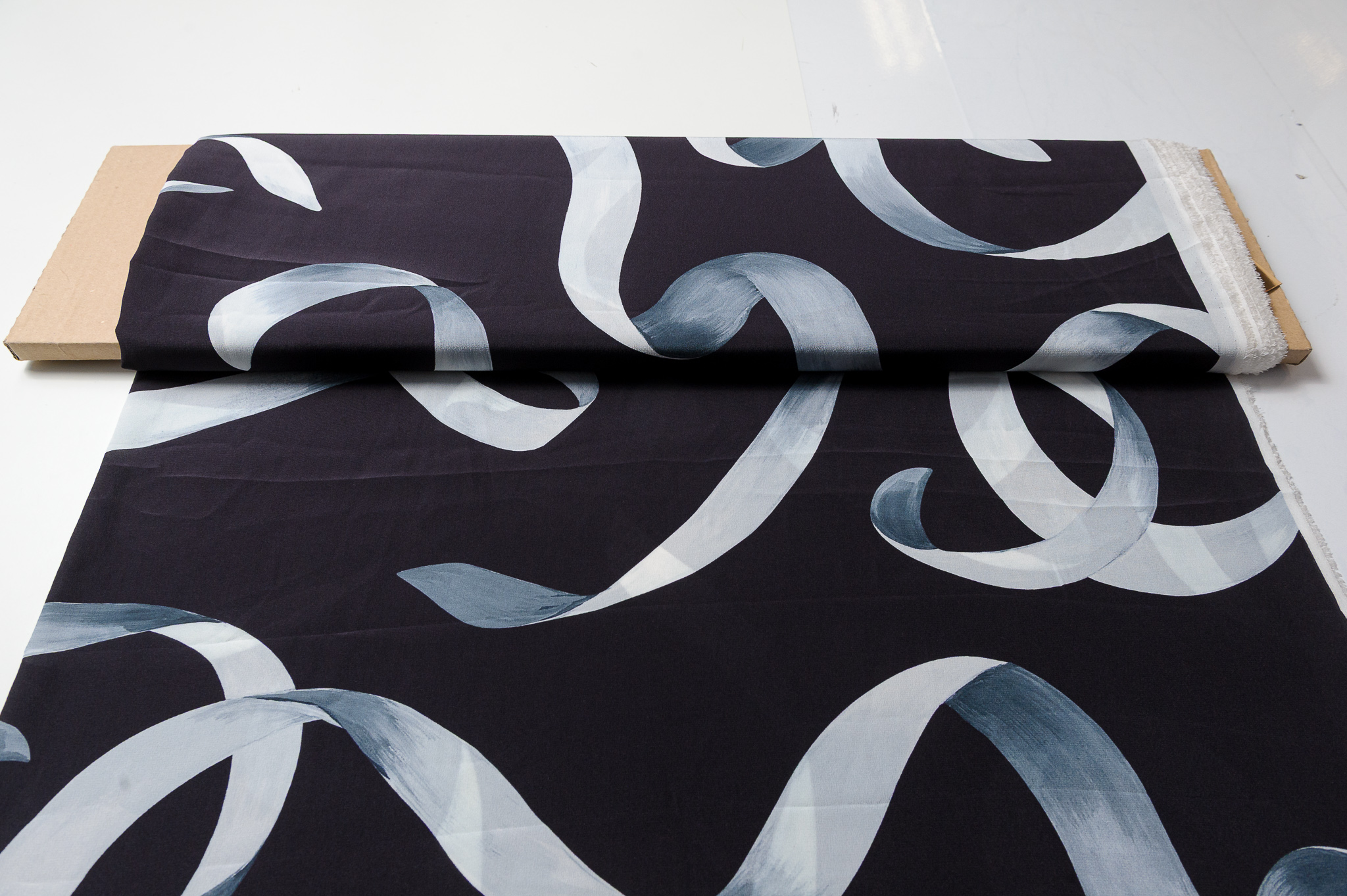 Materiał cienki, prześwitujący. Duże, białe wzory na czarnym tle. Odpowiedni na sukienki, koszule, spódnice, chusty. Wymaga podszycia.