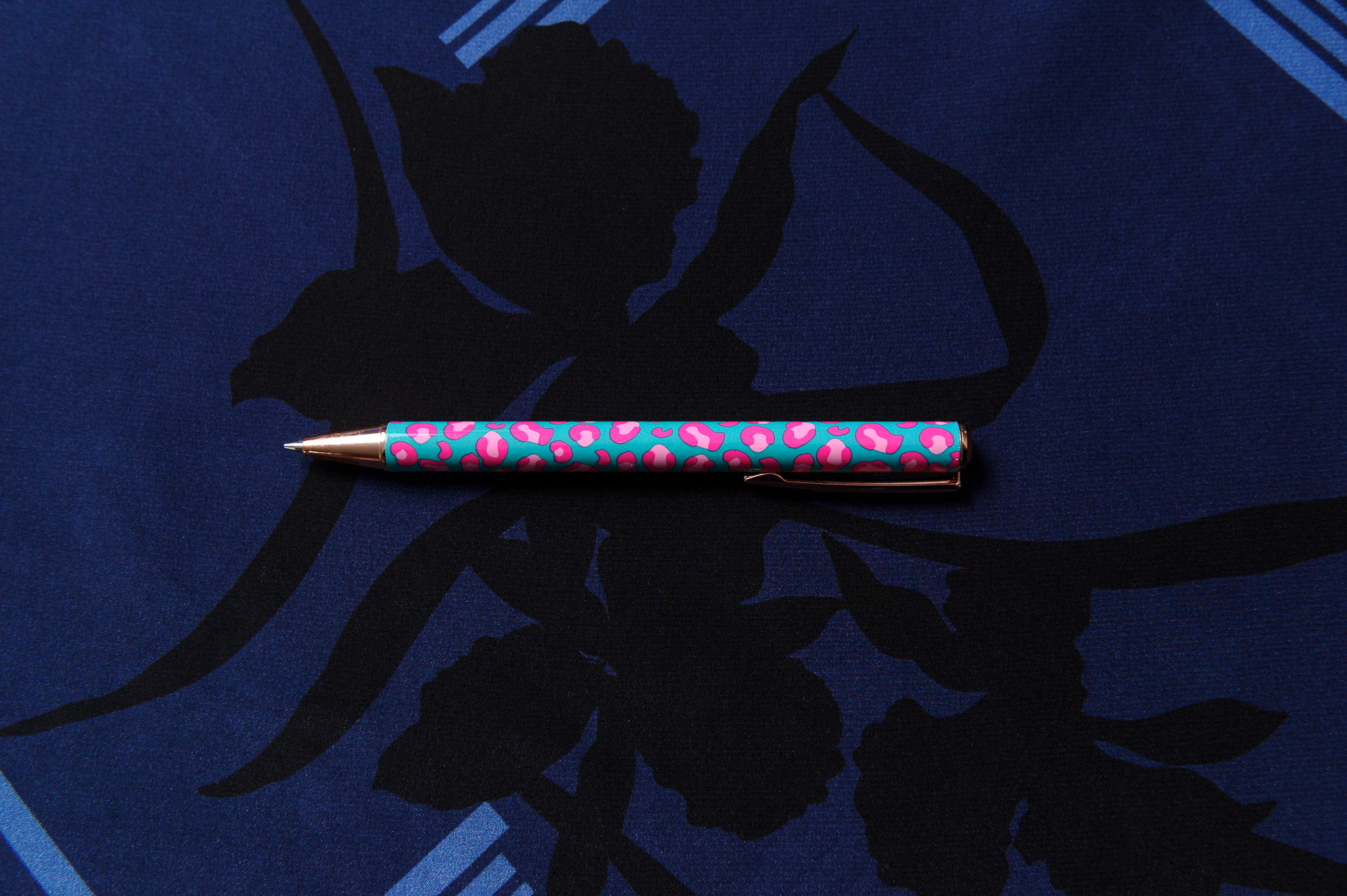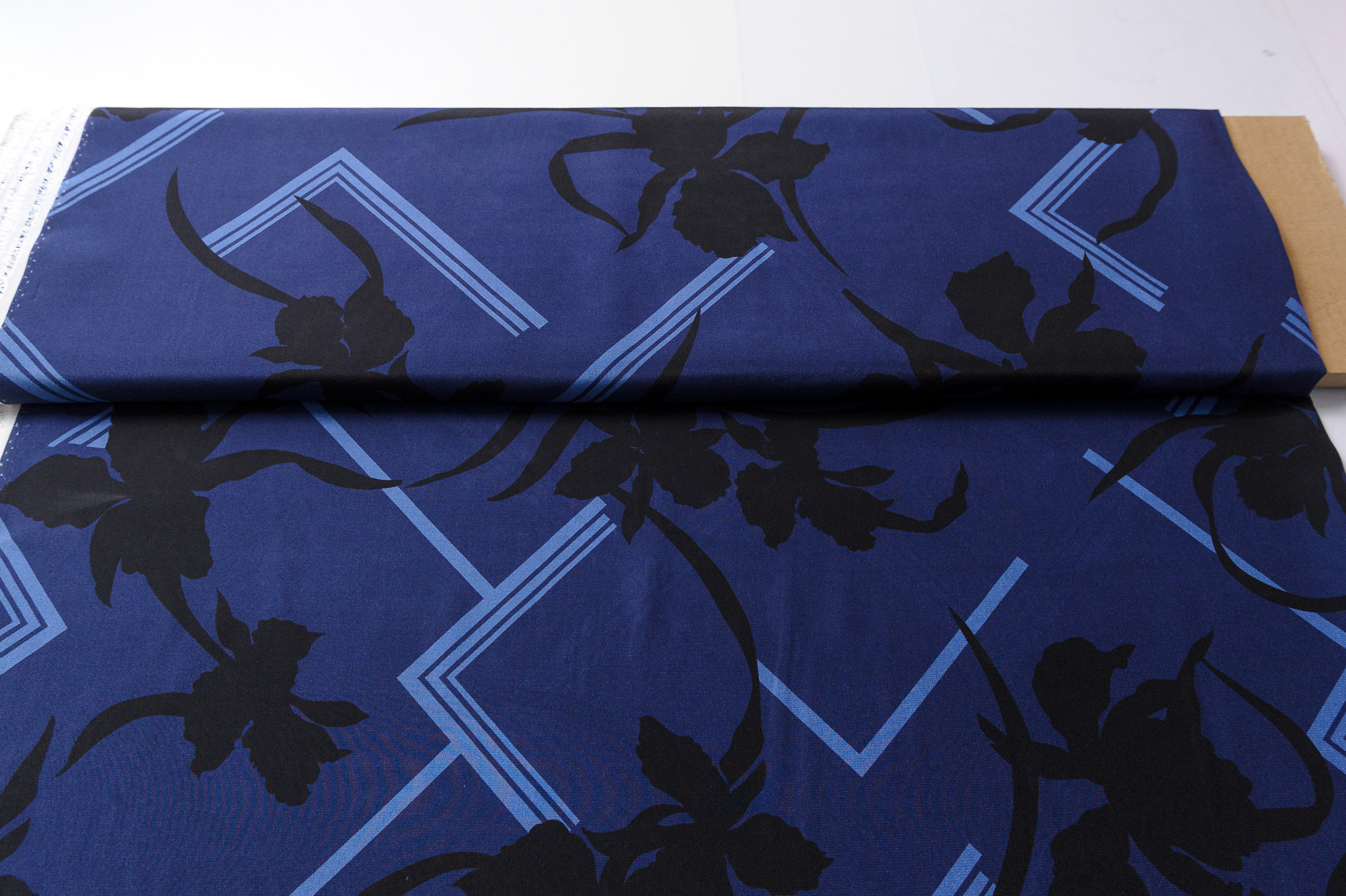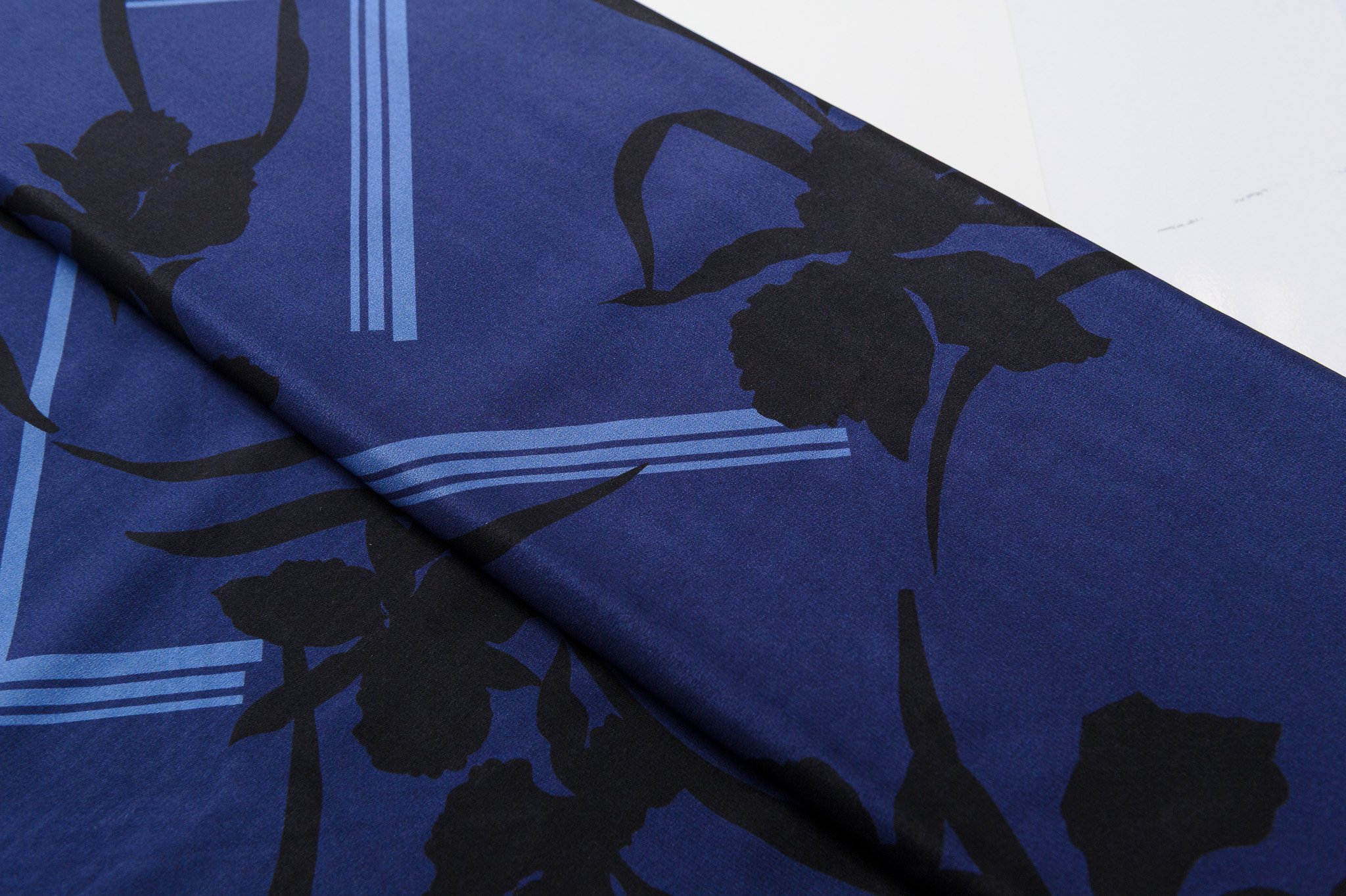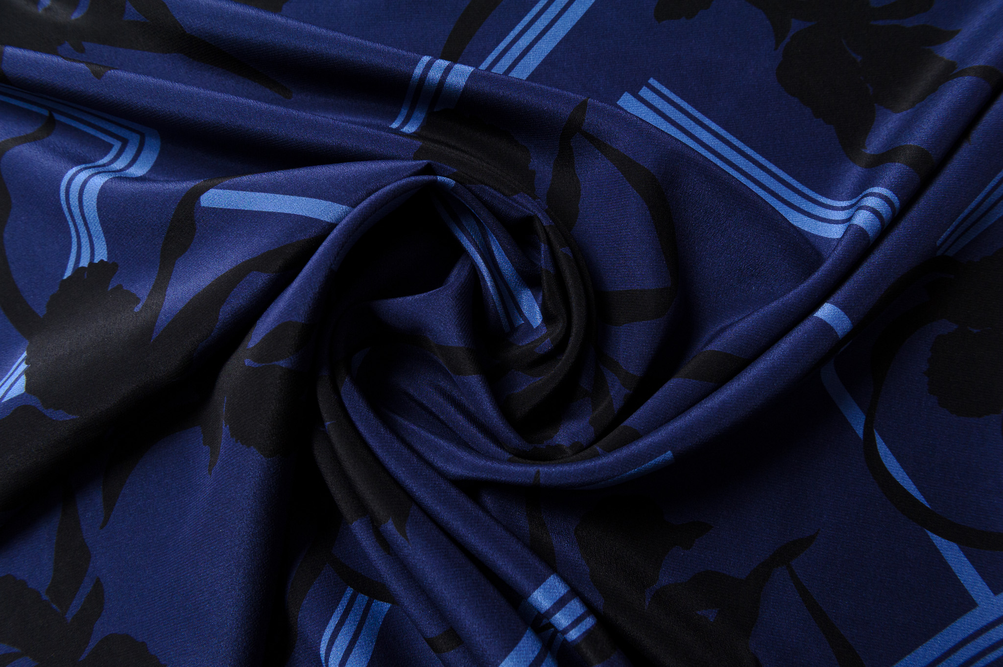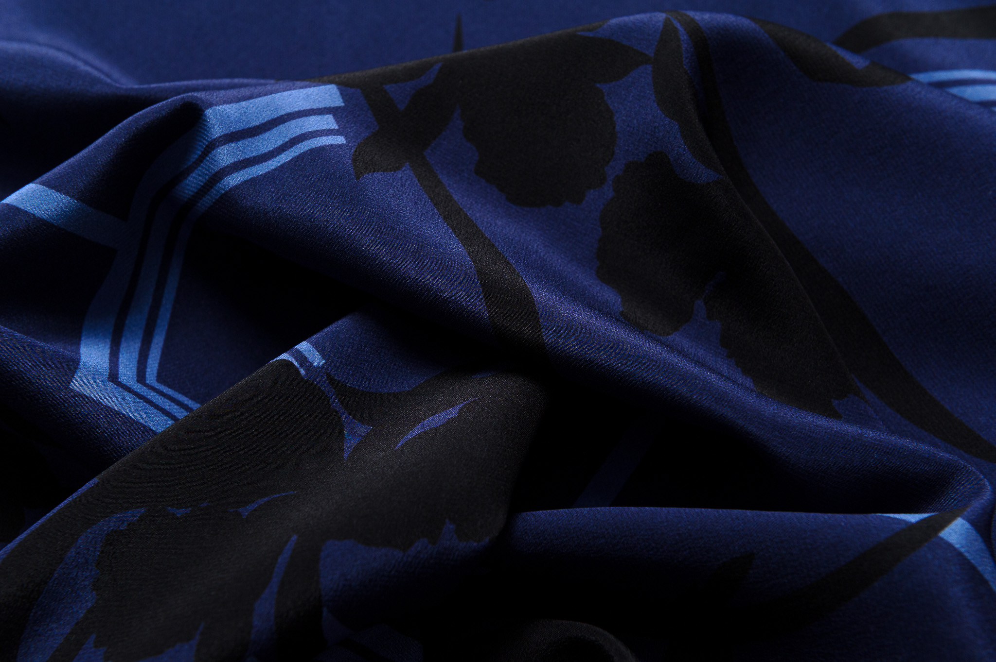Materiał cienki, delikatnie prześwitujący. Czarne i niebieskie wzory na granatowym tle. Odpowiedni na sukienki, koszule, bluzki, spodnie, spódnice.