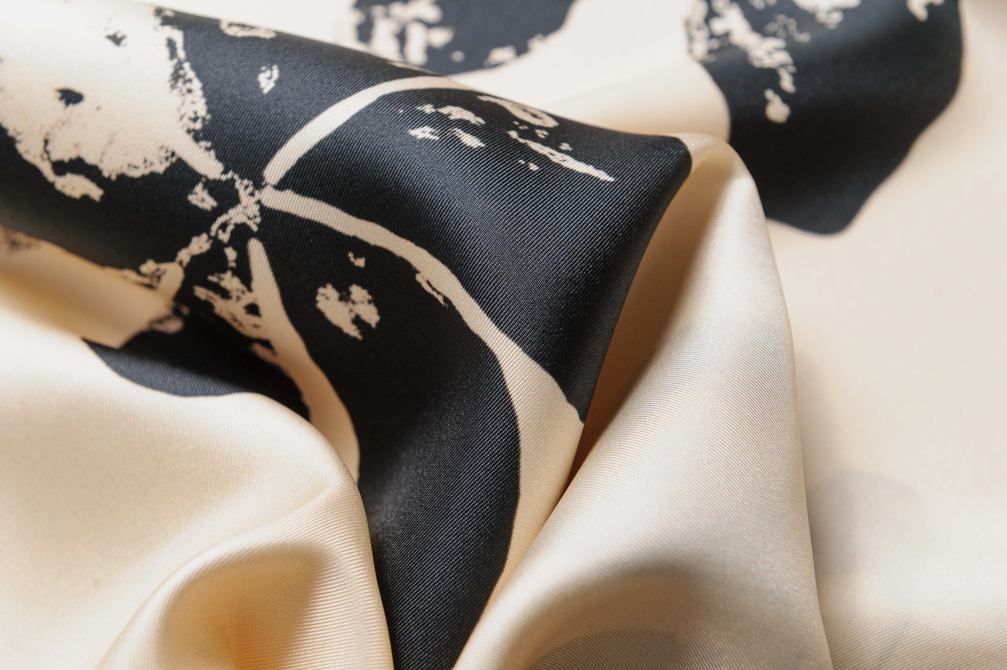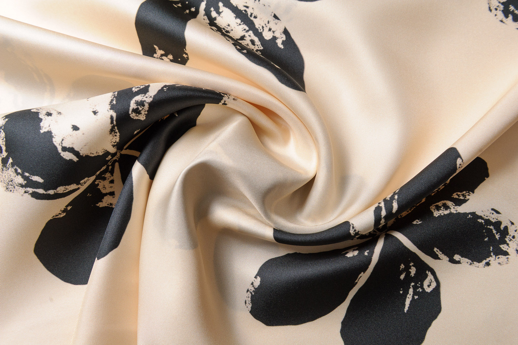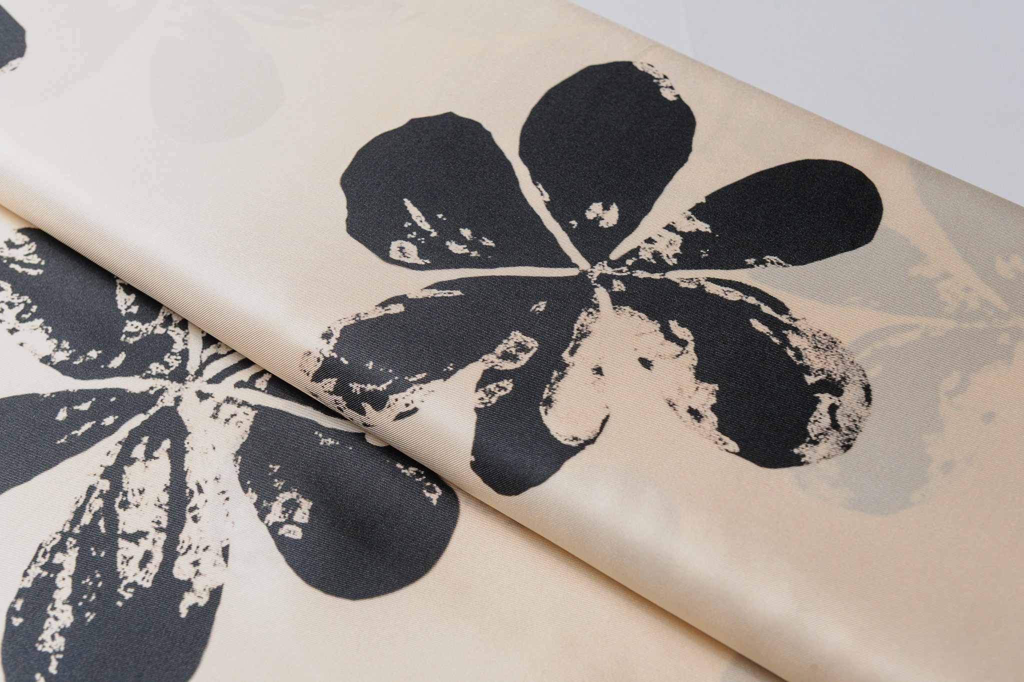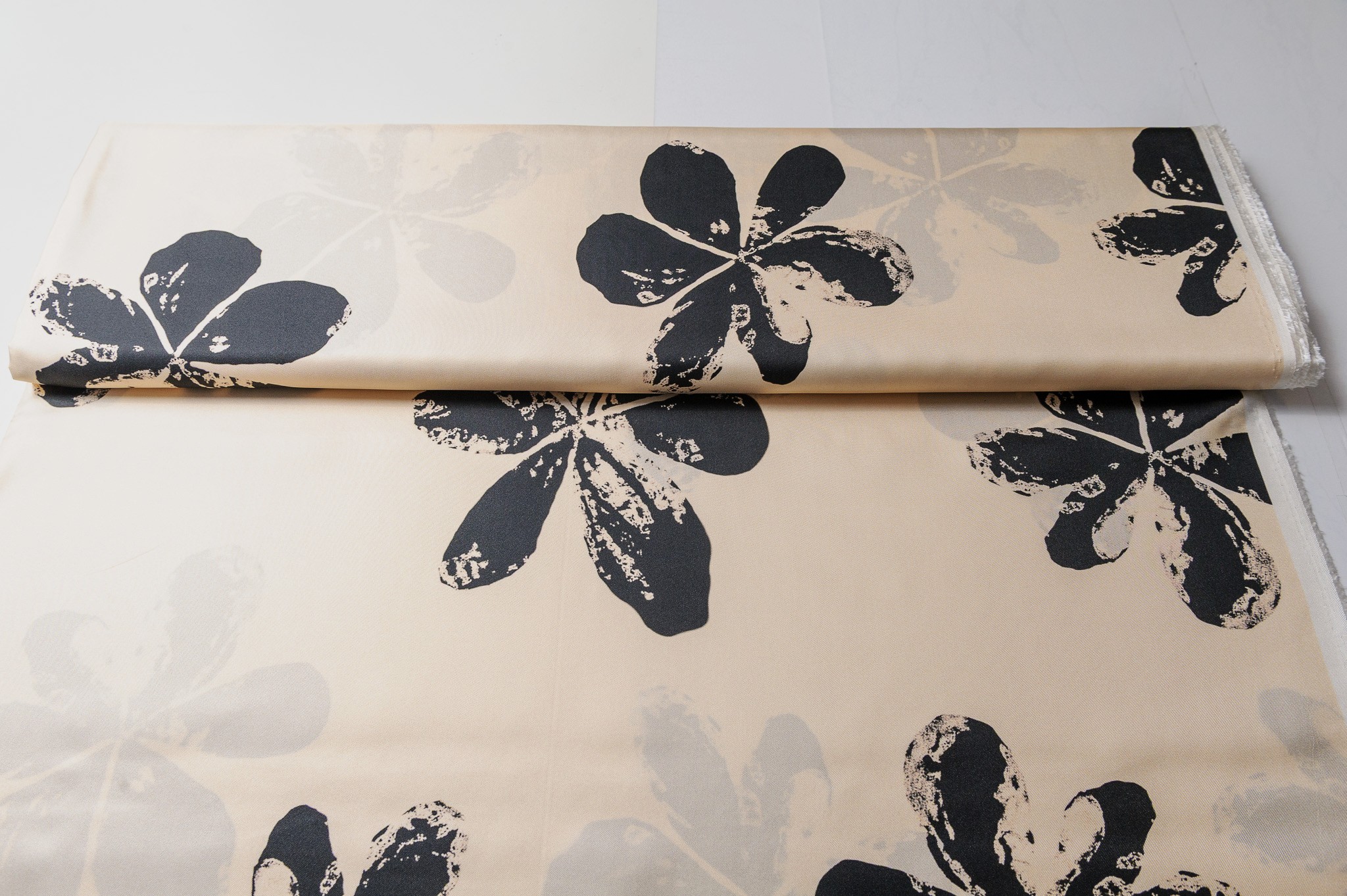 Materiał sztywniejszy, delikatnie prześwitujący. Wzór w czarne kwiaty na kremowym tle. Odpowiedni na sukienki, koszule, bluzki, spodnie, spódnice.