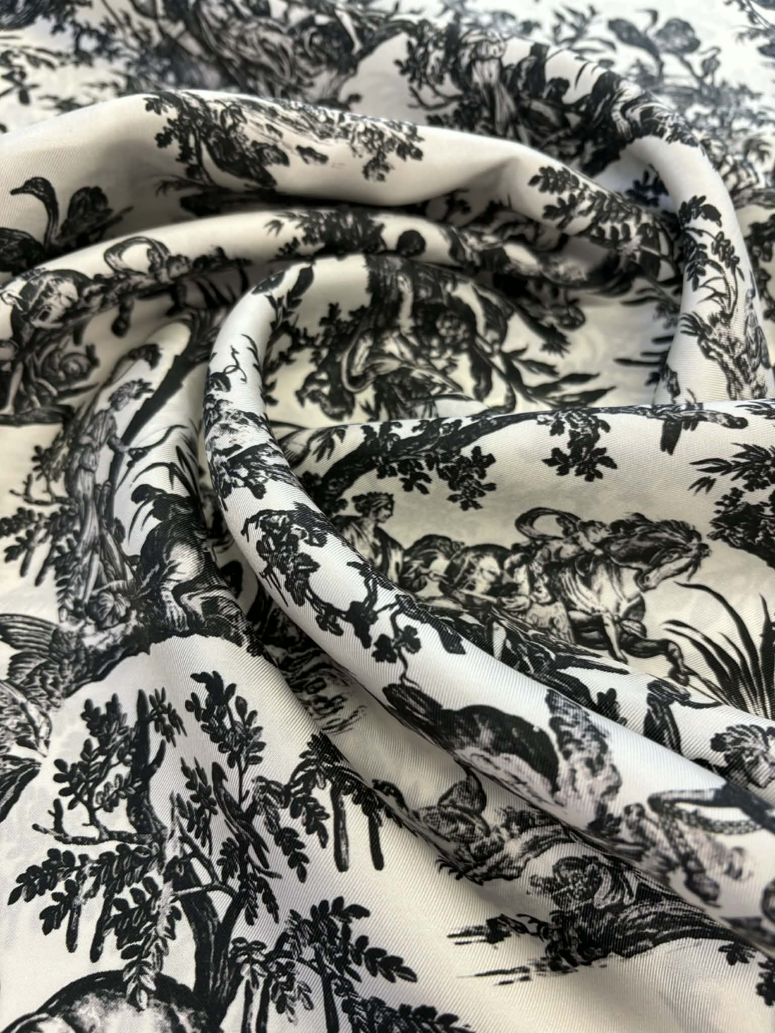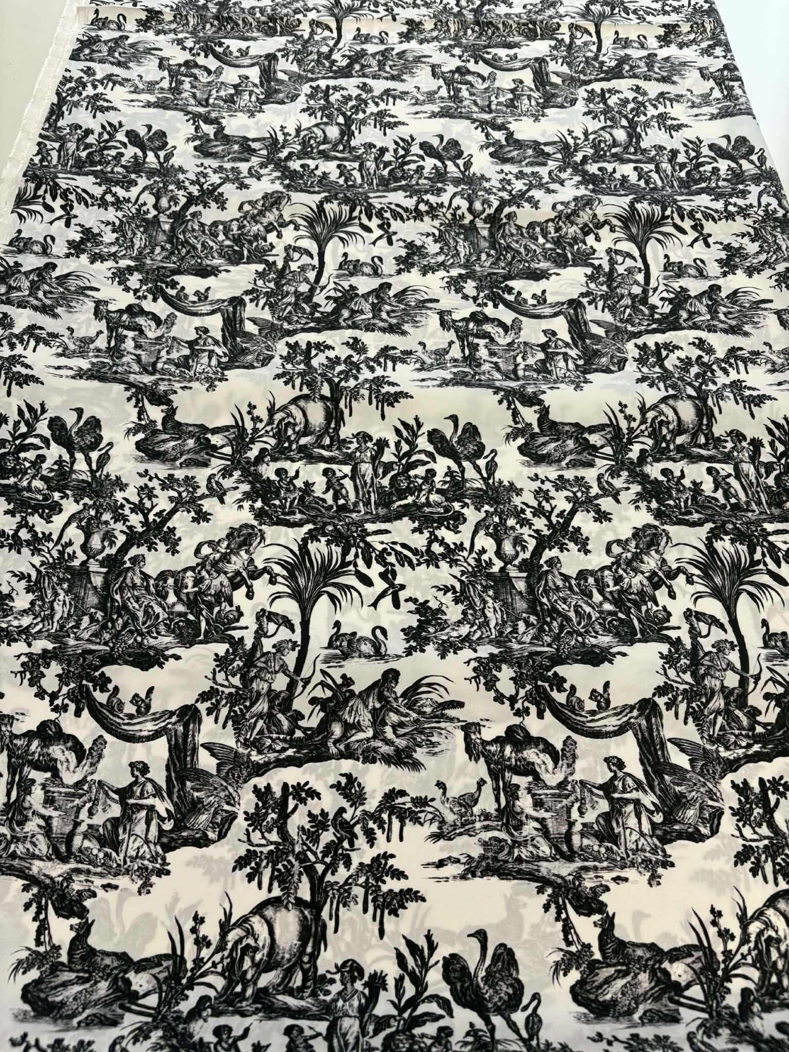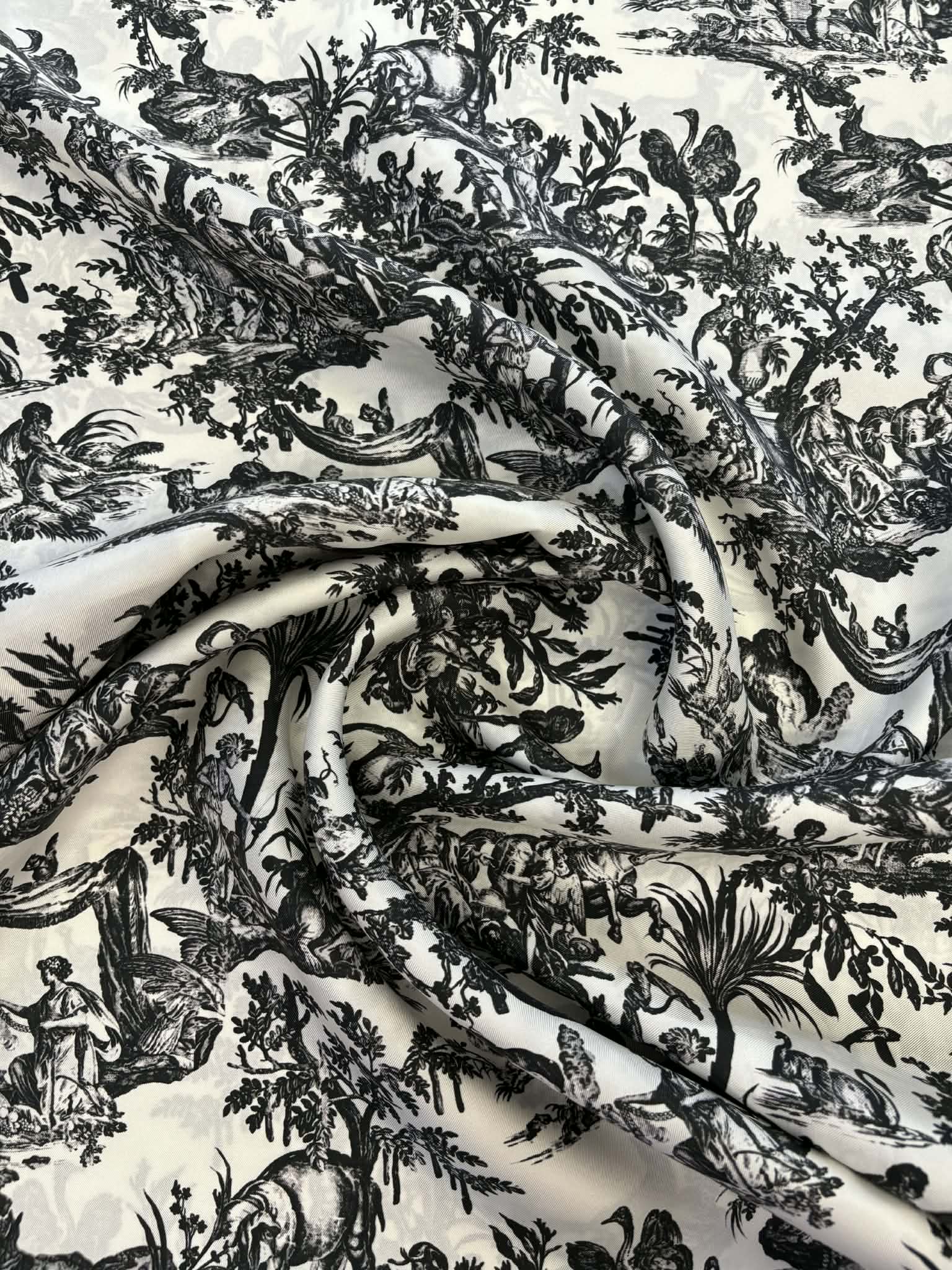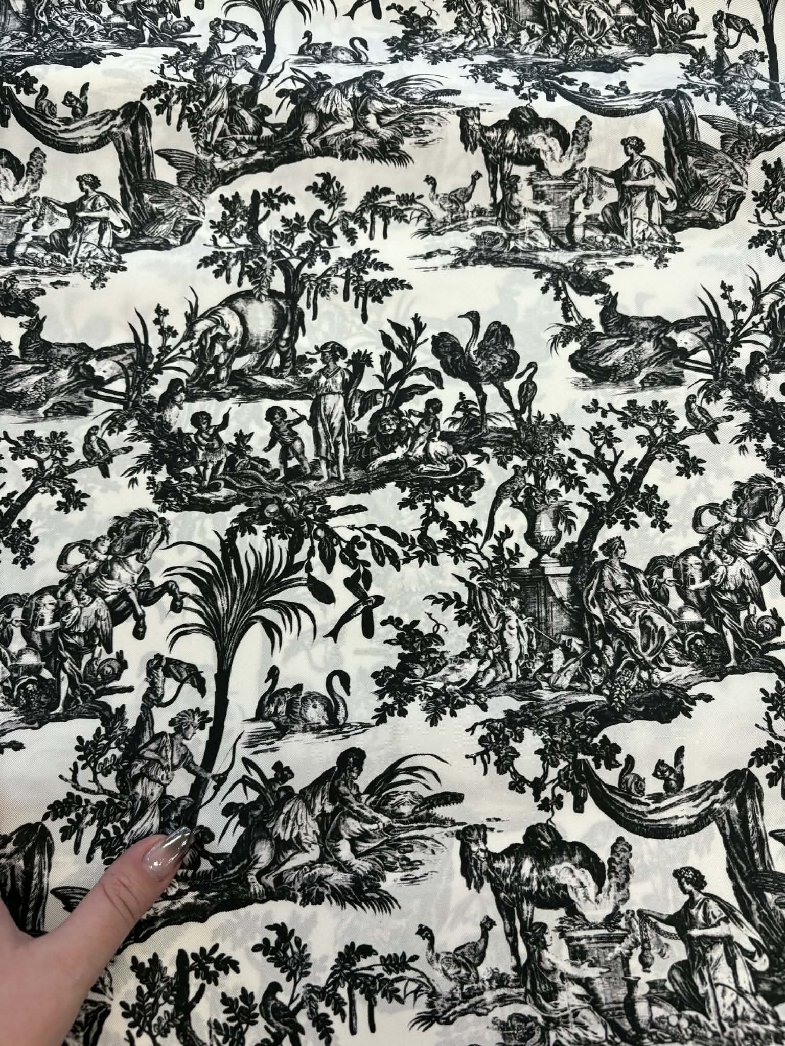 Materiał sztywniejszy, nieprześwitujący. Wzór przedstawiający sceny pastoralne w czarnym kolorze na śmietanowym tle. Odpowiedni na koszule, sukienki, spódnice, spodnie, bluzki.
