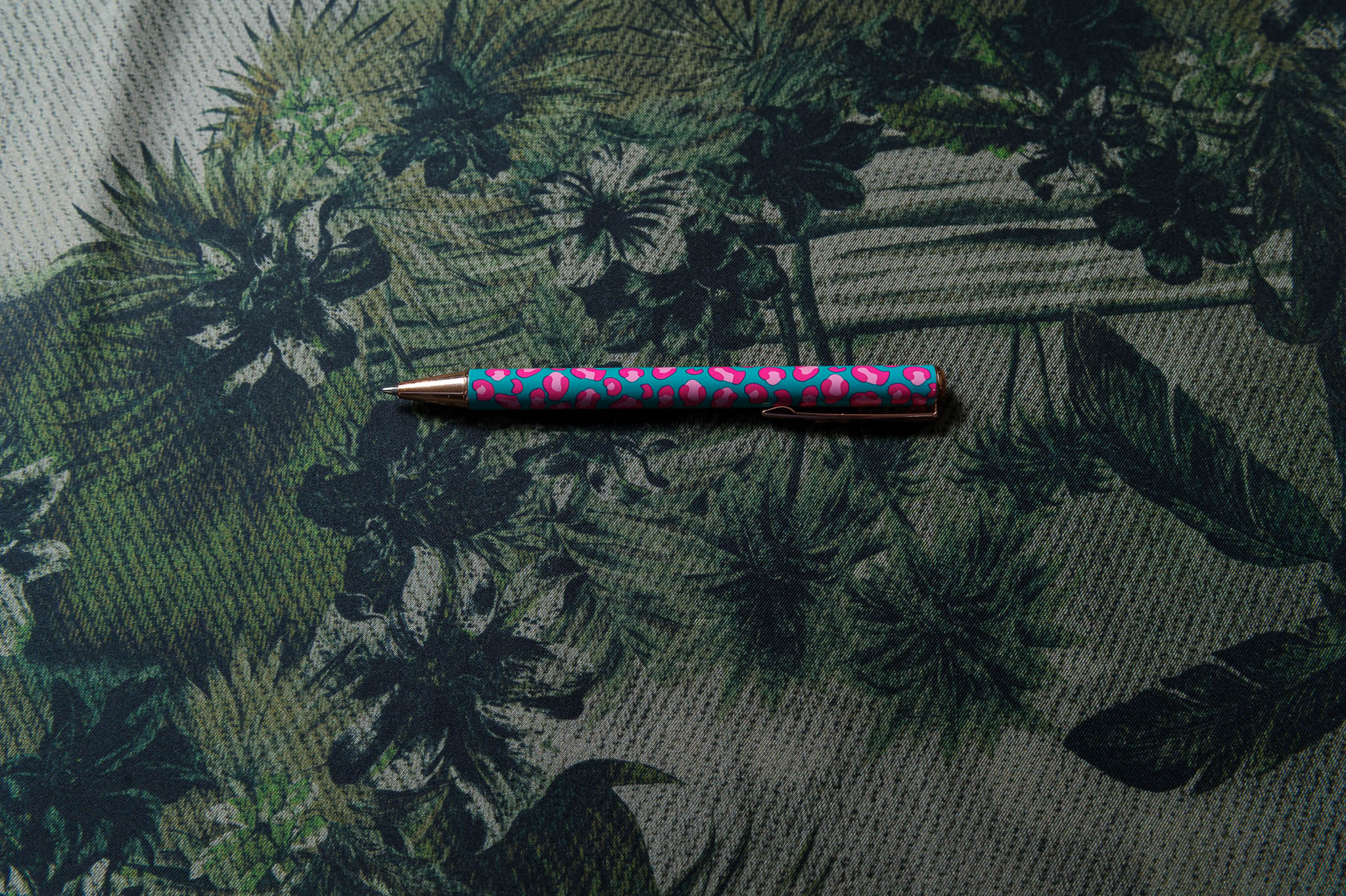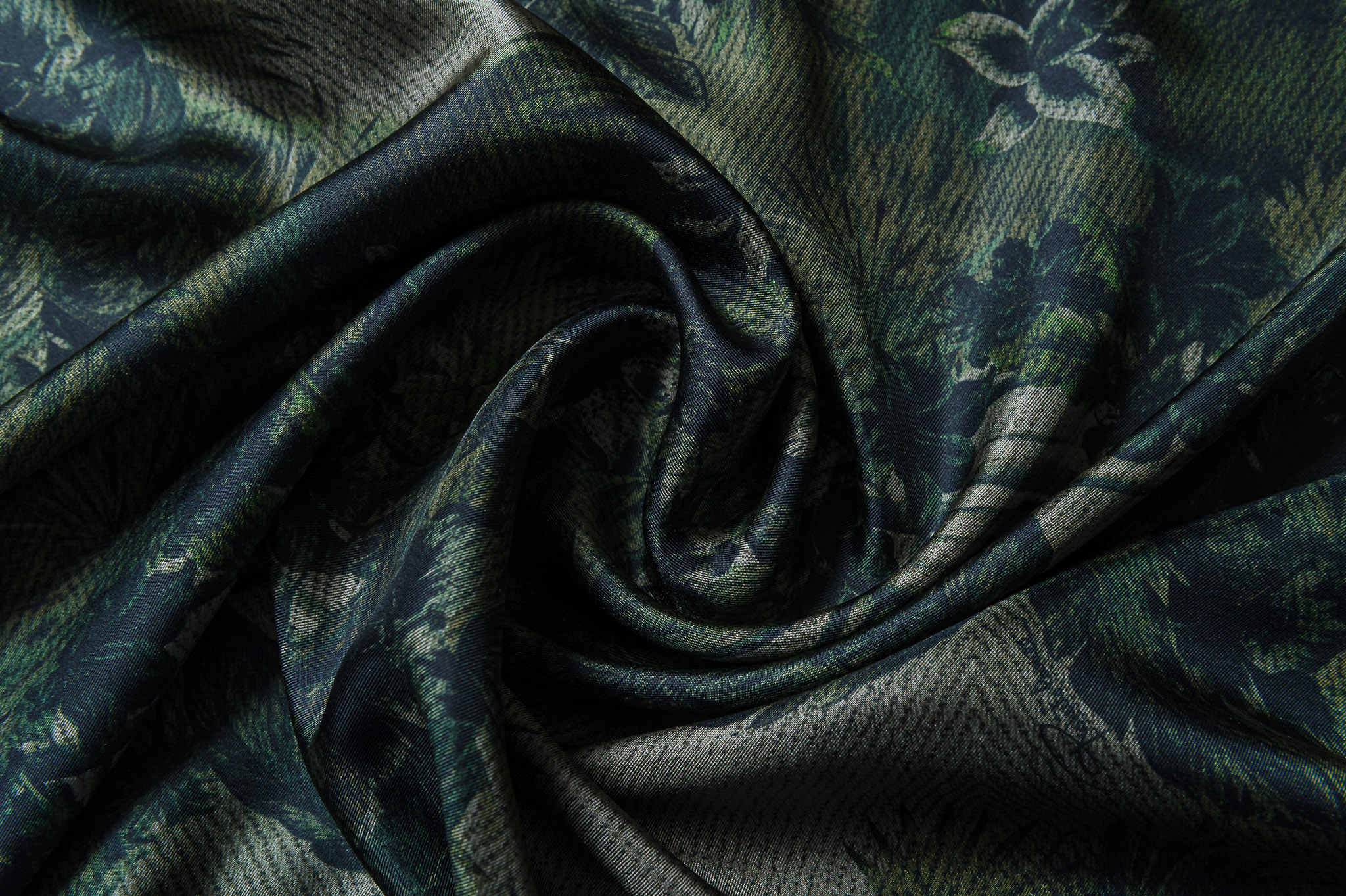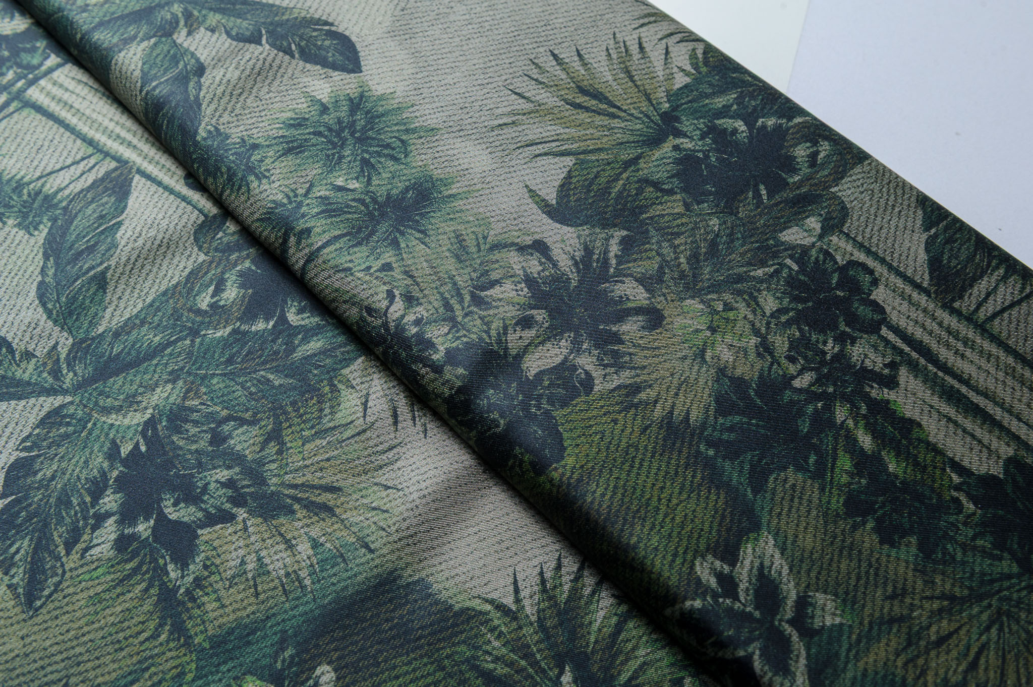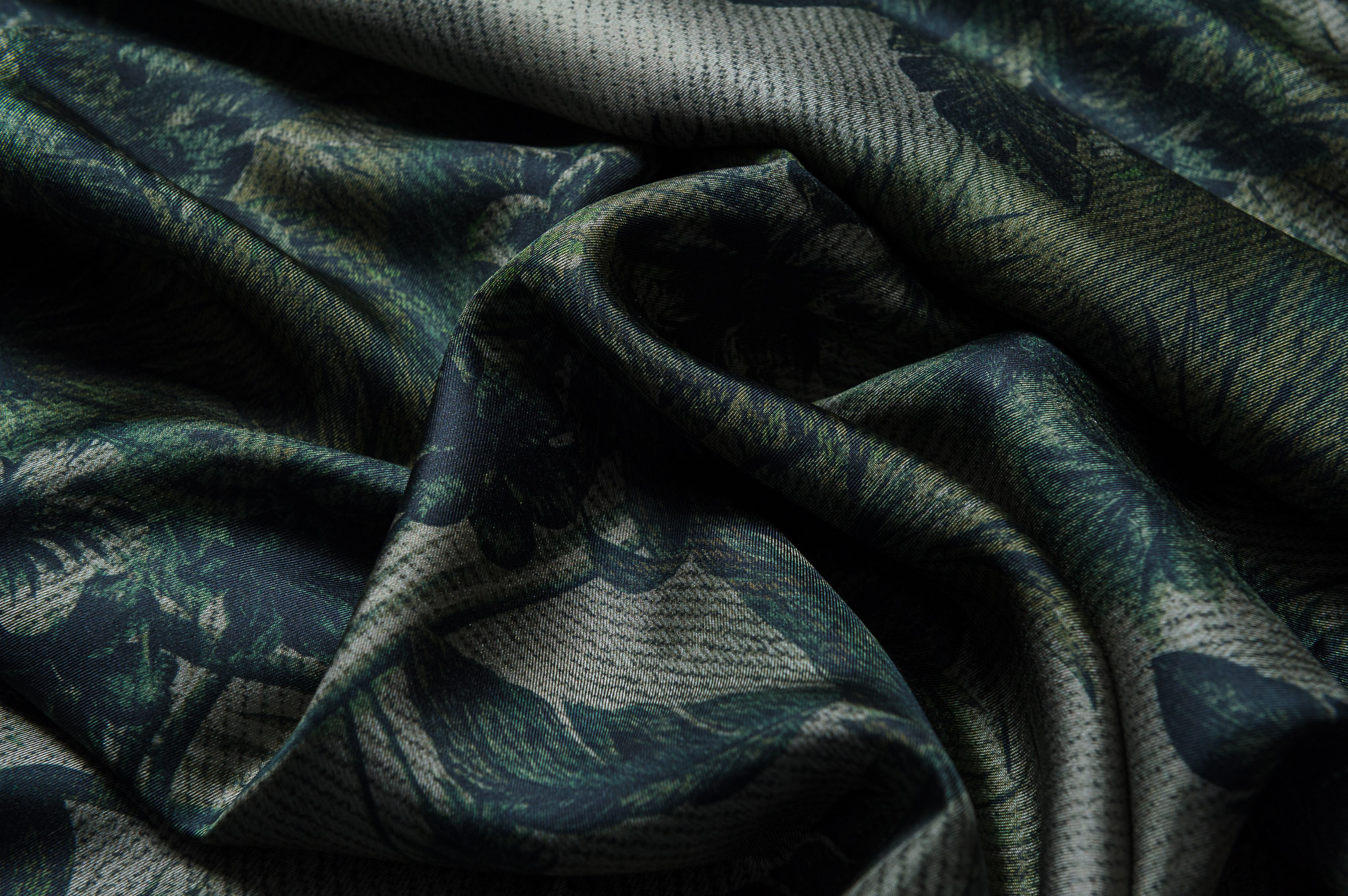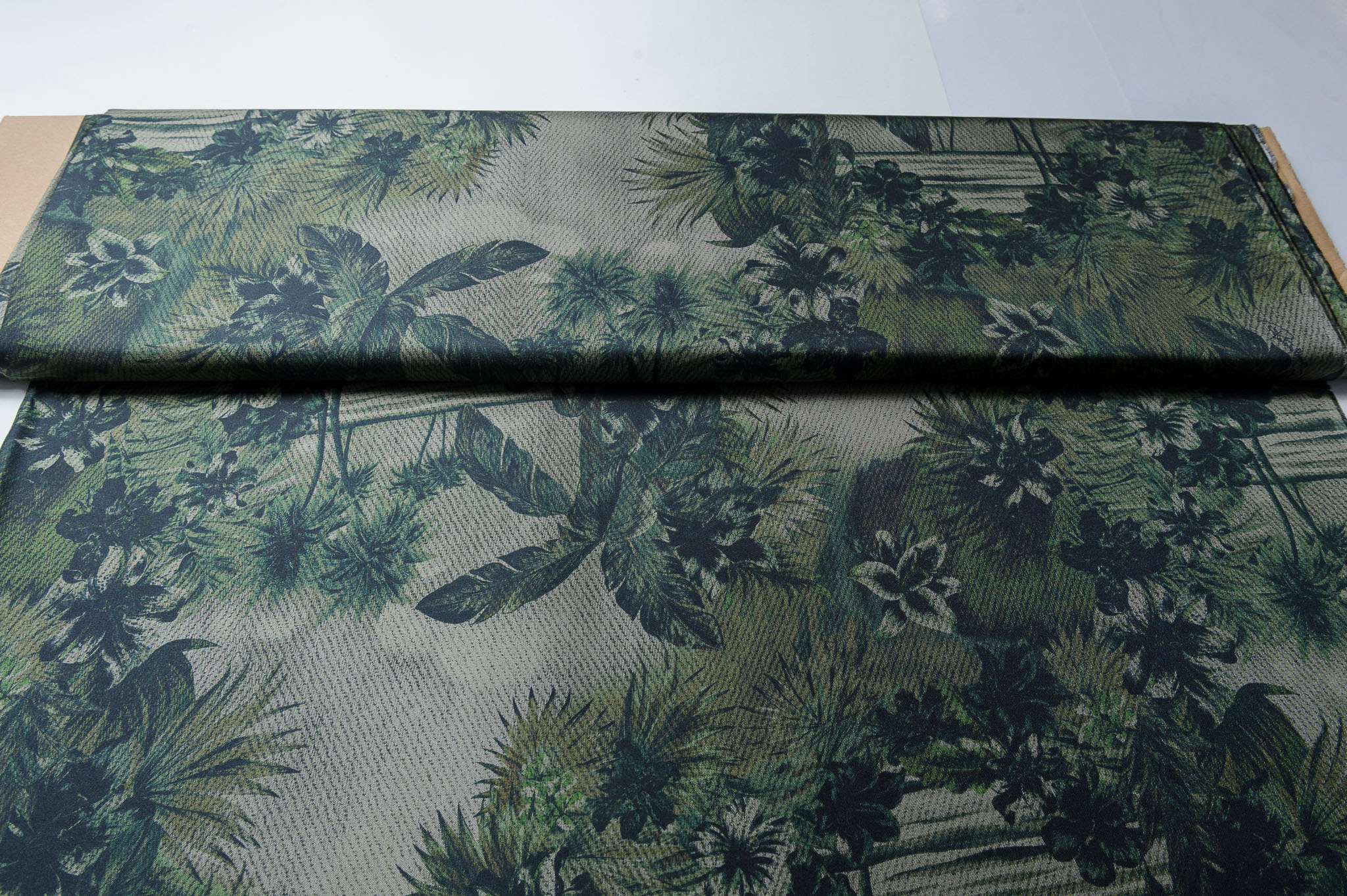 Materiał delikatnie sztywniejszy, nie prześwituje. Wzór w drzewa, rośliny w kolorze ciemnej zieleni. Odpowiedni na sukienki, koszule, spódniczki, bluzki.