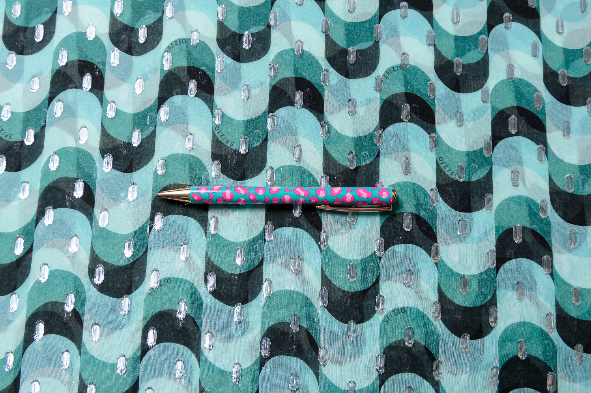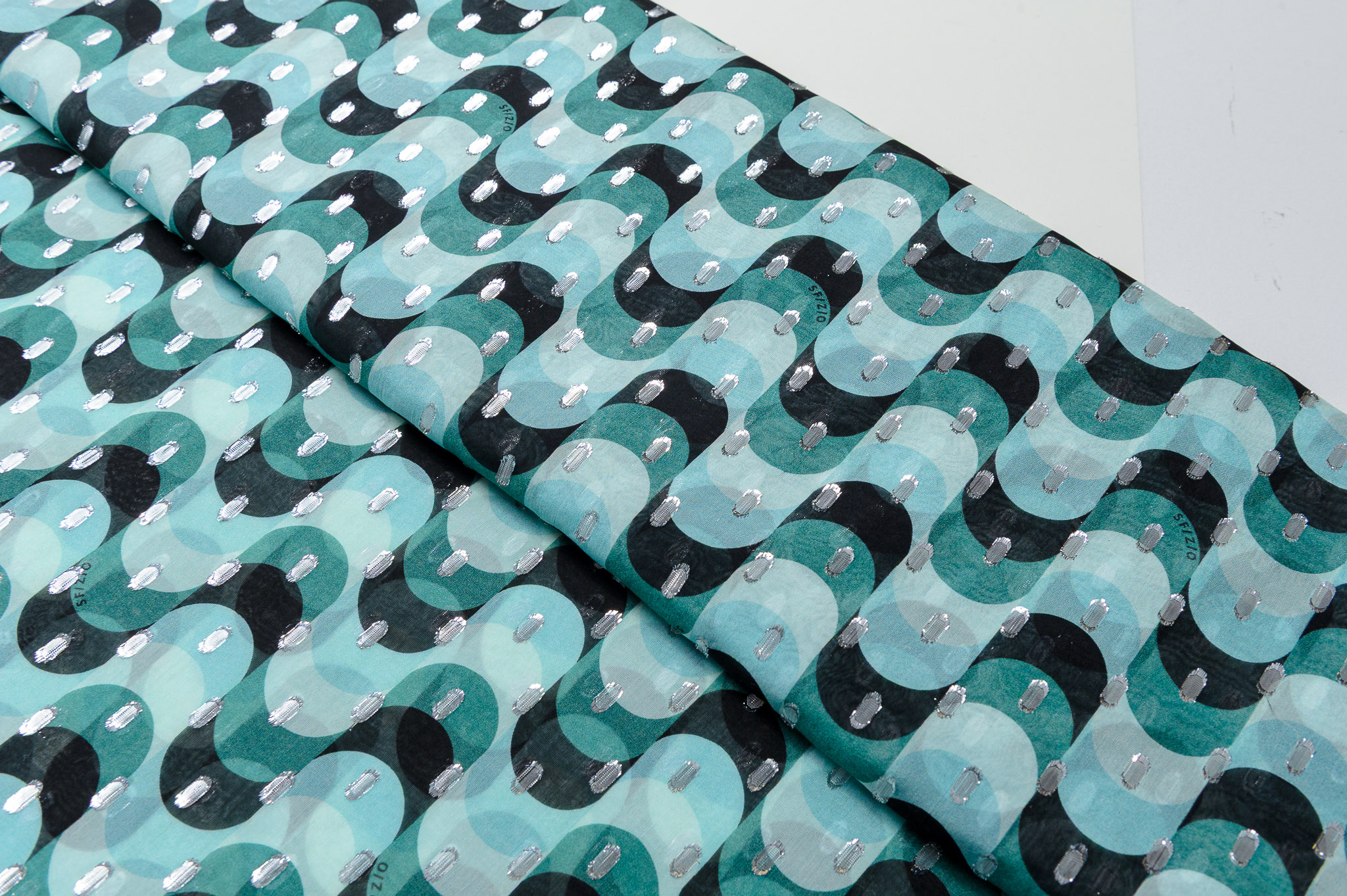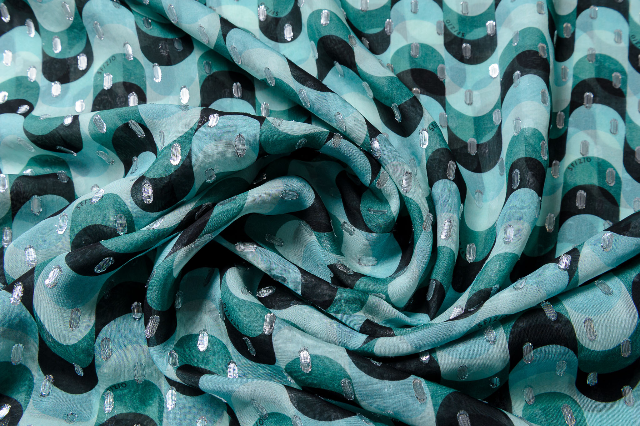 Materiał cienki, prześwitujący. Fale czarno-zielono-turkusowe, srebrne kropy. Odpowiednie na bluzkę, sukienkę, spódnicę, akcesoria.