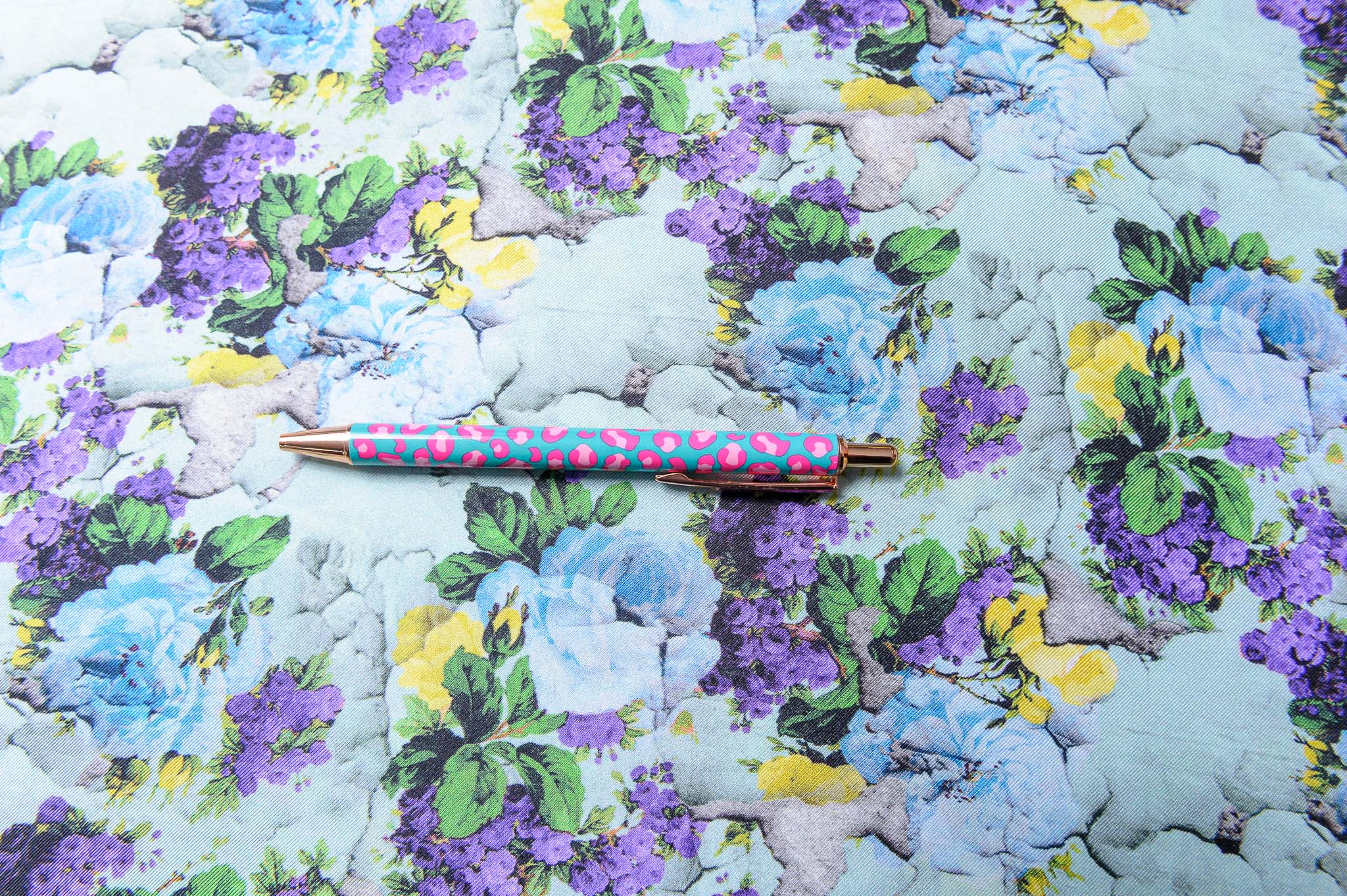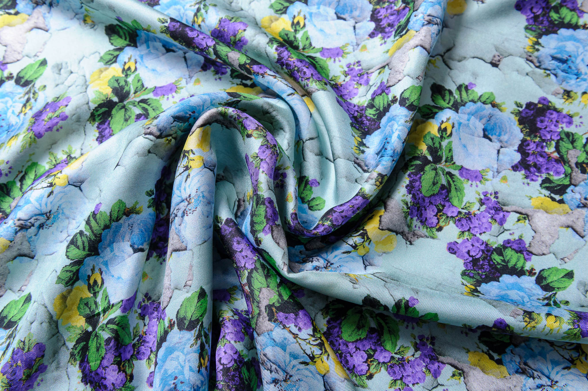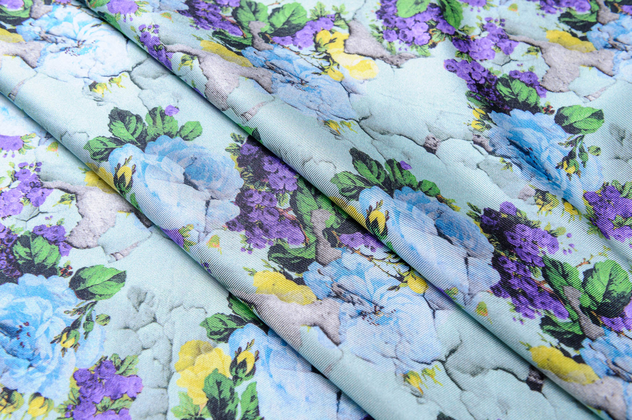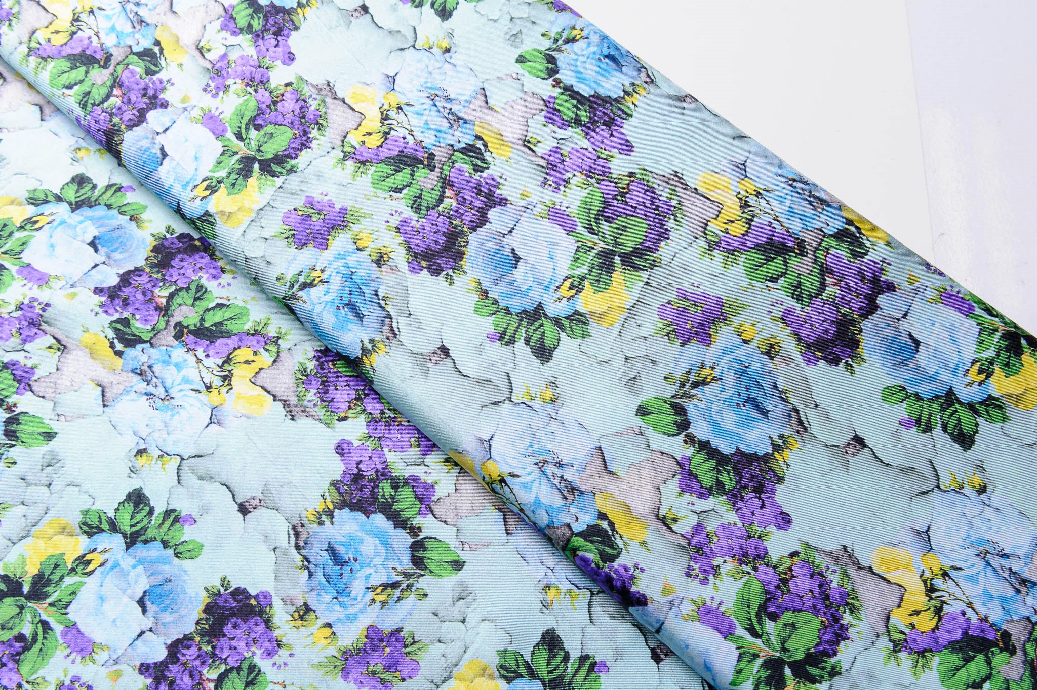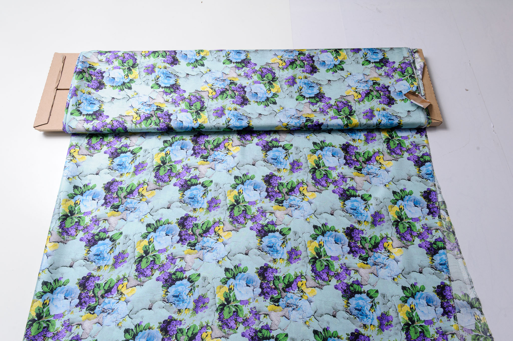 Materiał nie prześwituje, delikatnie sztywniejszy. Wzór w drobne kwiatuszki fioletowo-zielone na turkusowym tle. Odpowiedni na sukienki, koszule, spódnice, bluzki.