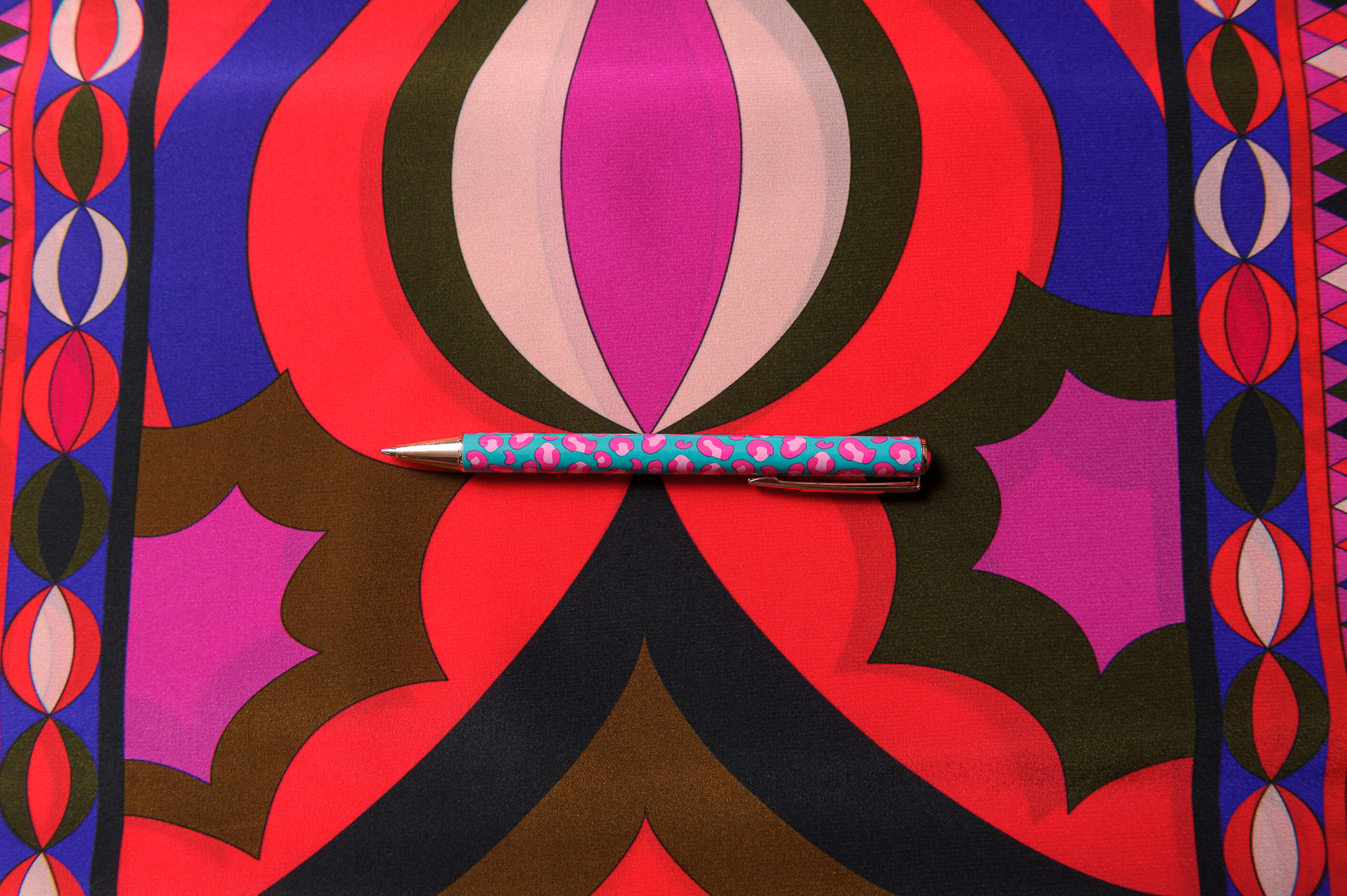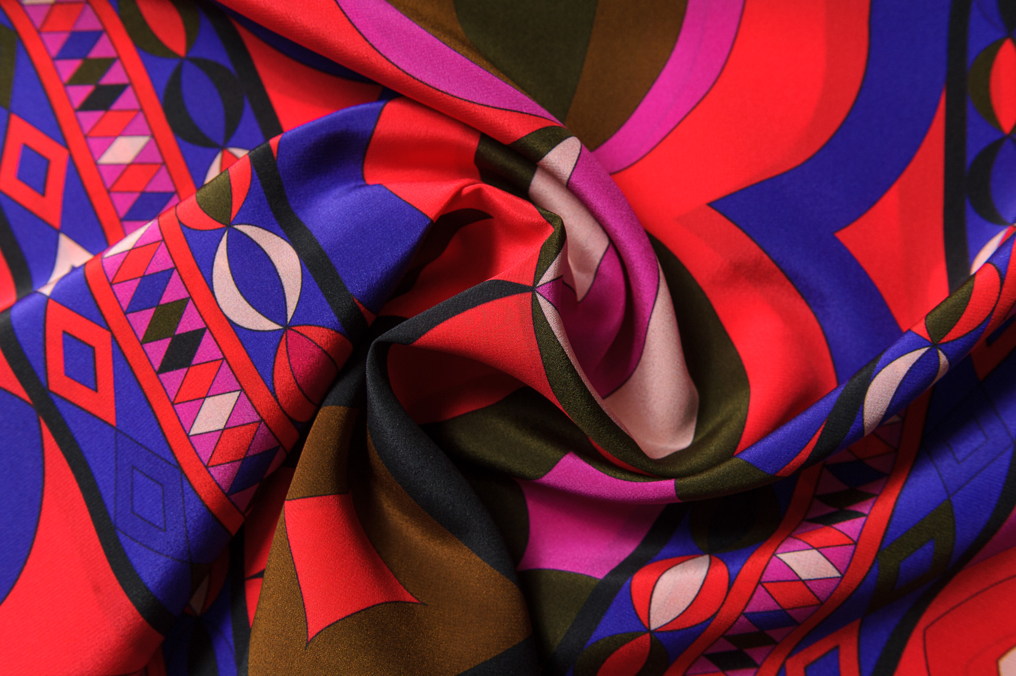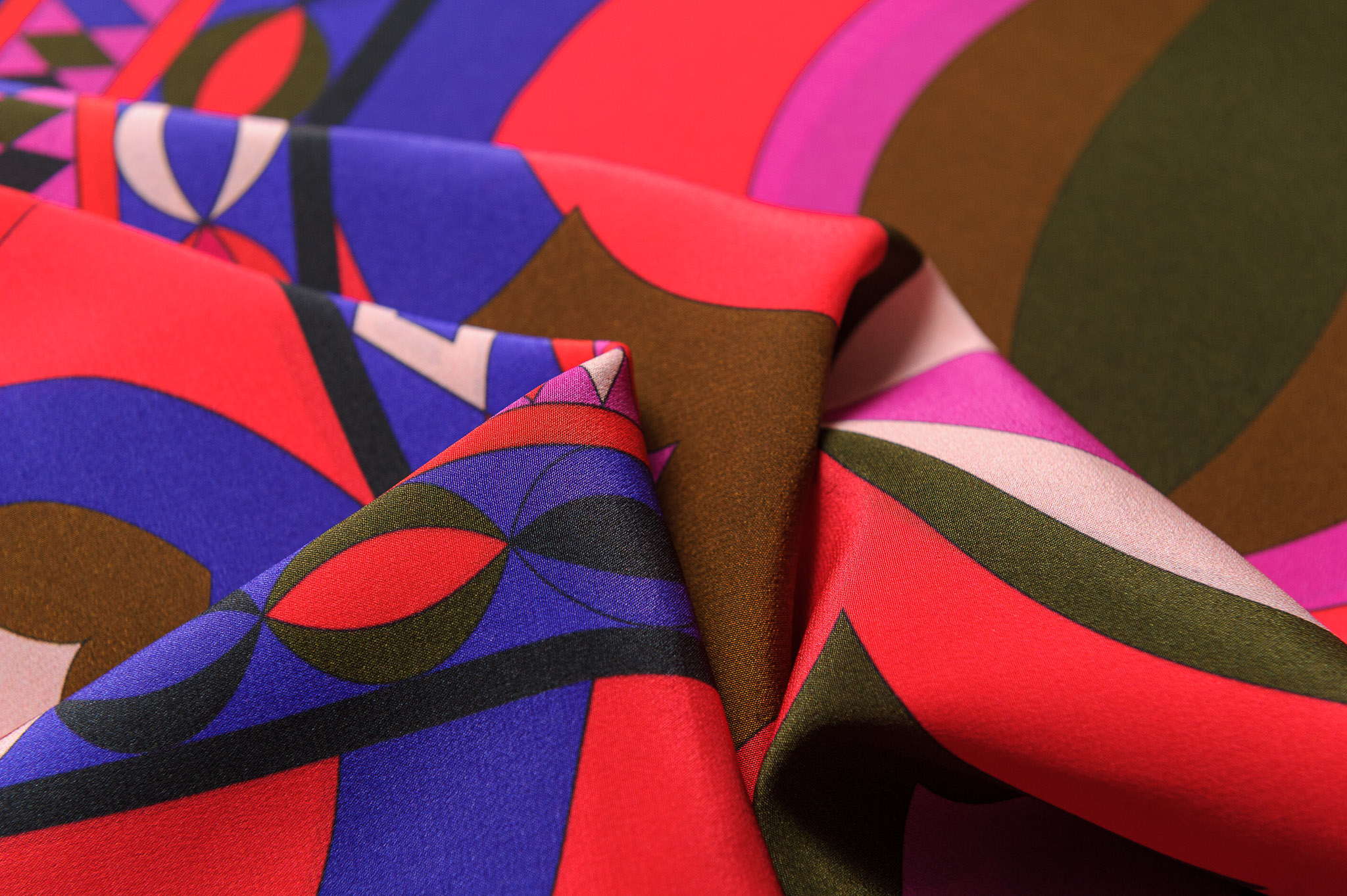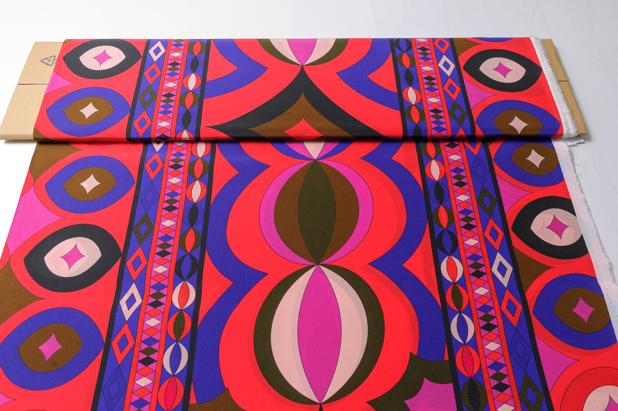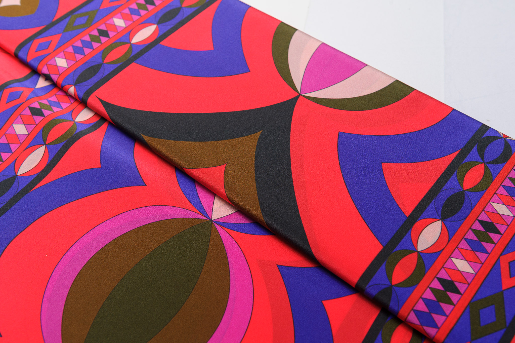 Materiał dość cienki, matowy. Geometryczne wzory w kolorze malinowym, niebieskim, różowym . Odpowiedni na koszule, sukienki, spodnie, spódnice.