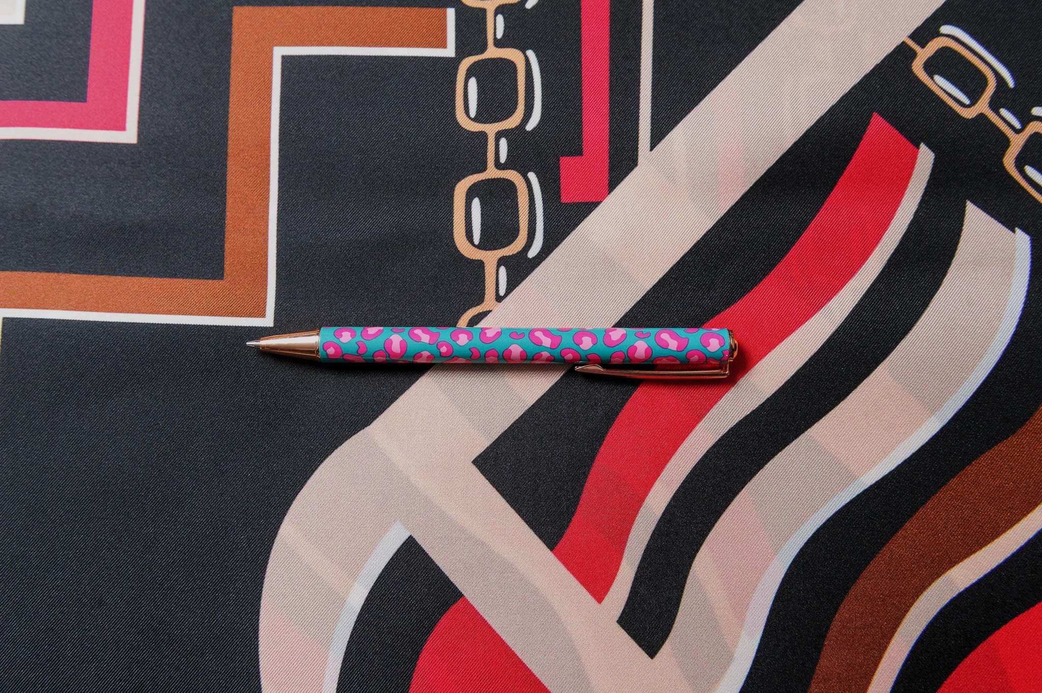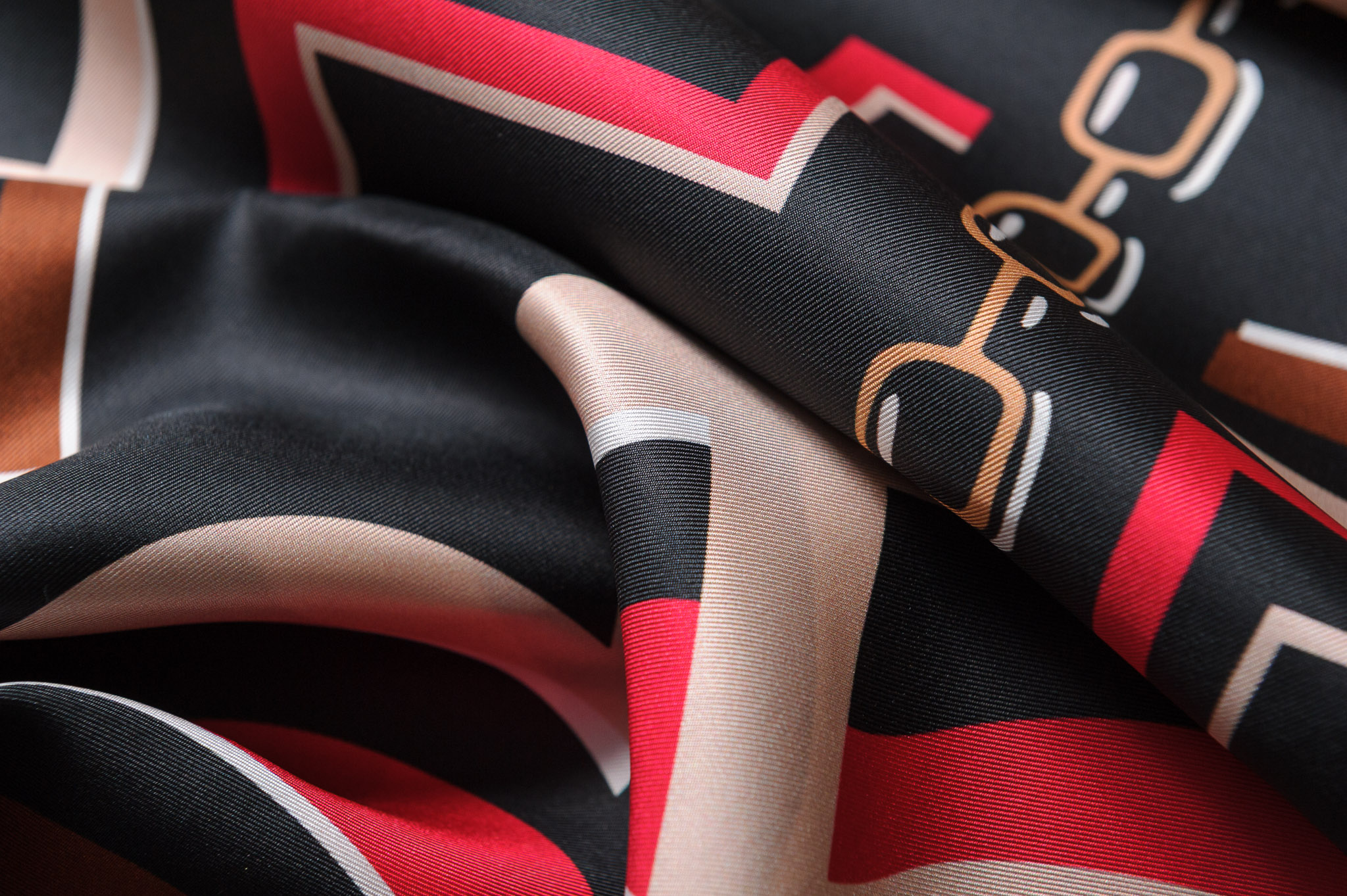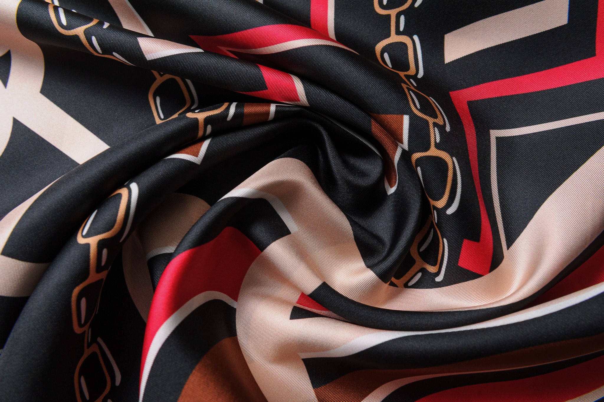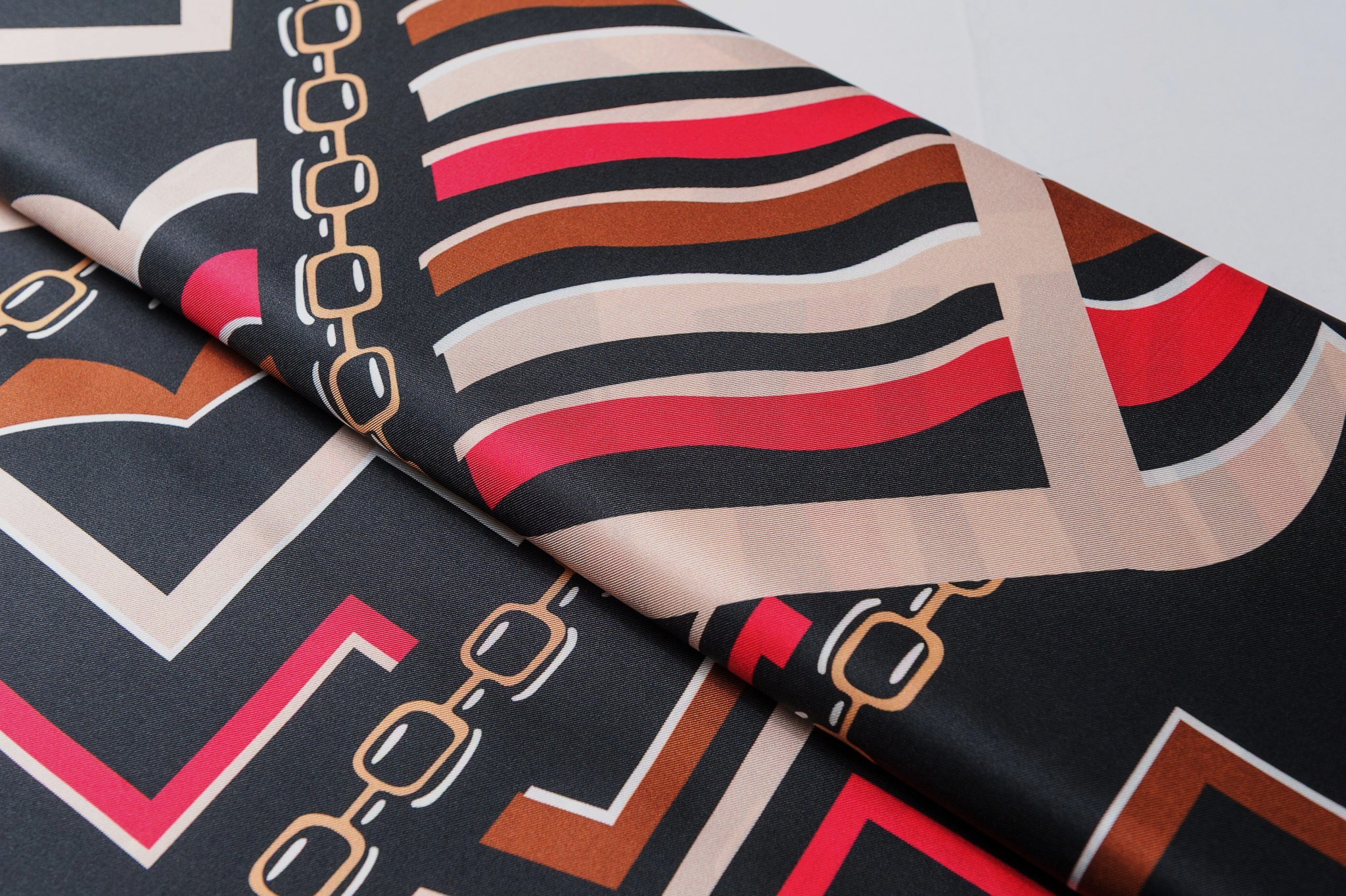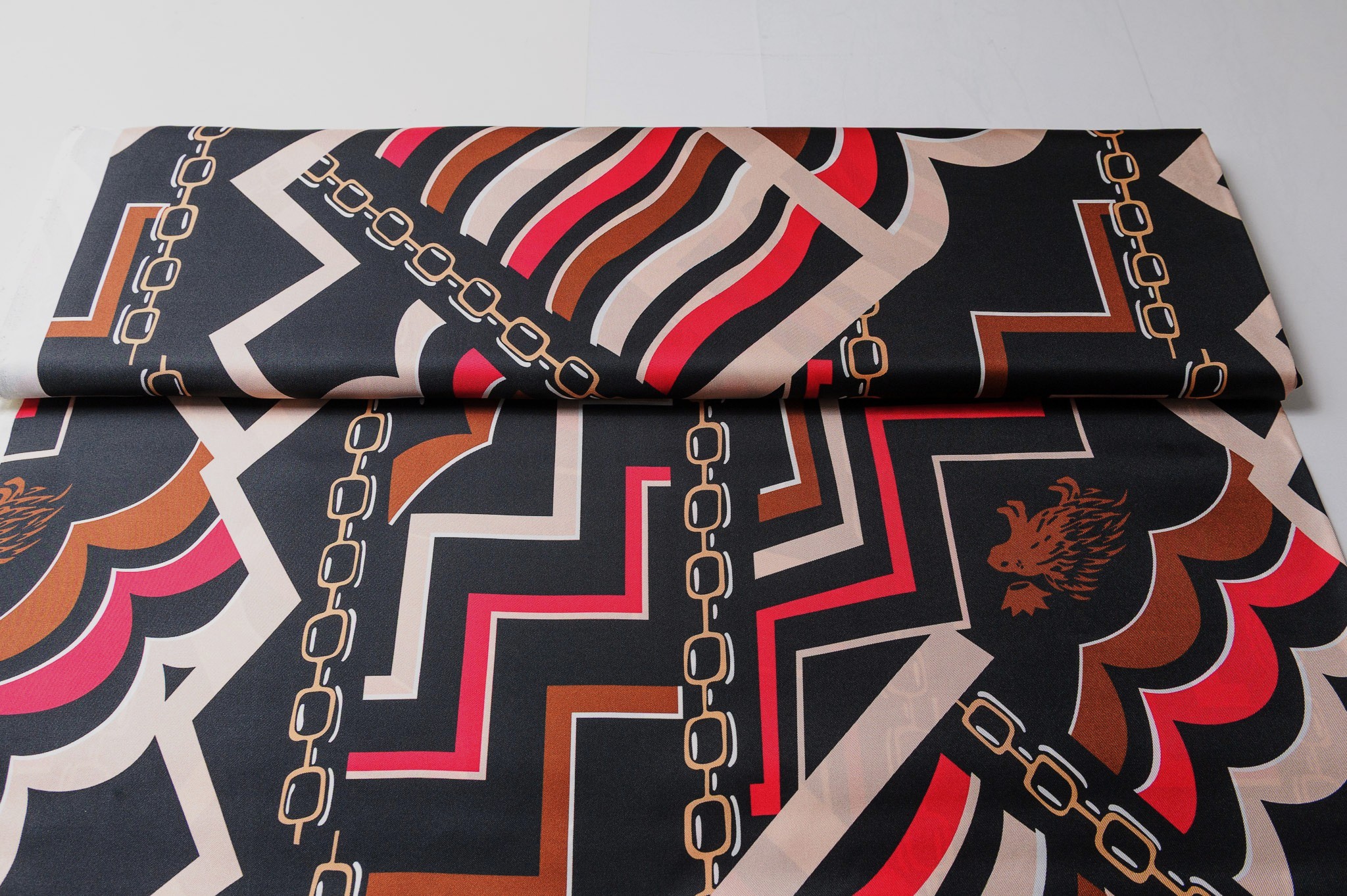 Materiał delikatnie sztywniejszy, matowy. Geometryczne wzory w kolorze czarno-czerwonym z elementami łancuchów. Odpowiedni na koszule, sukienki, spodnie, spódnice.