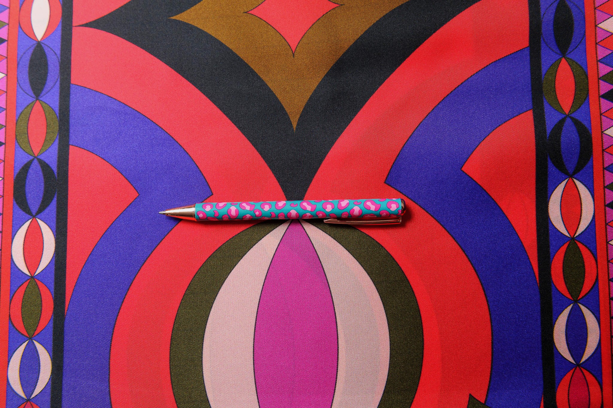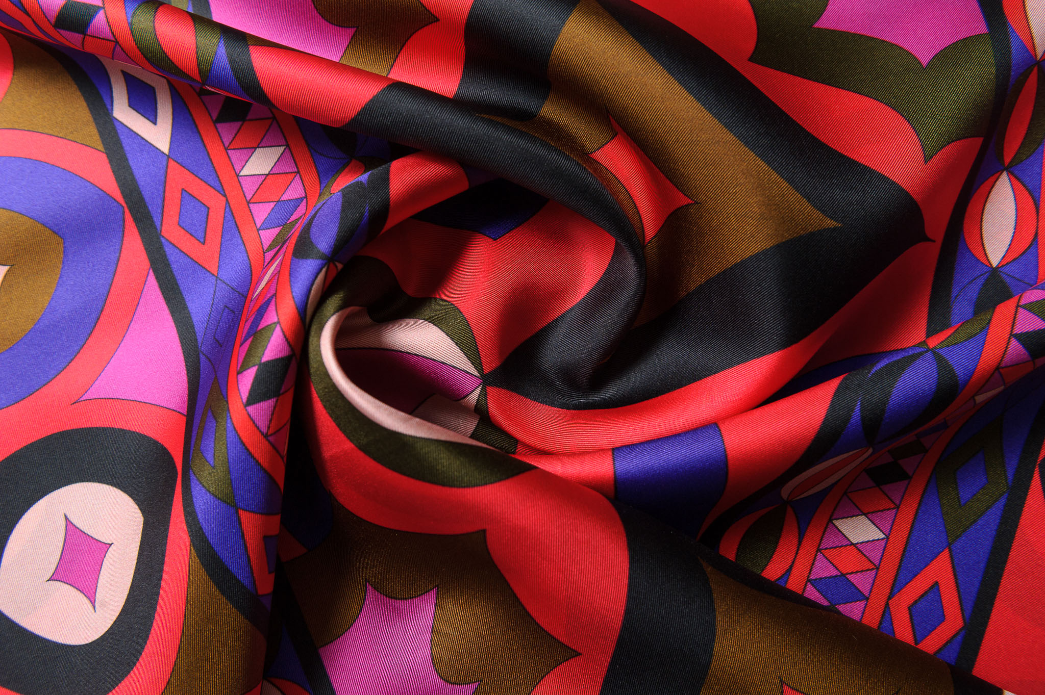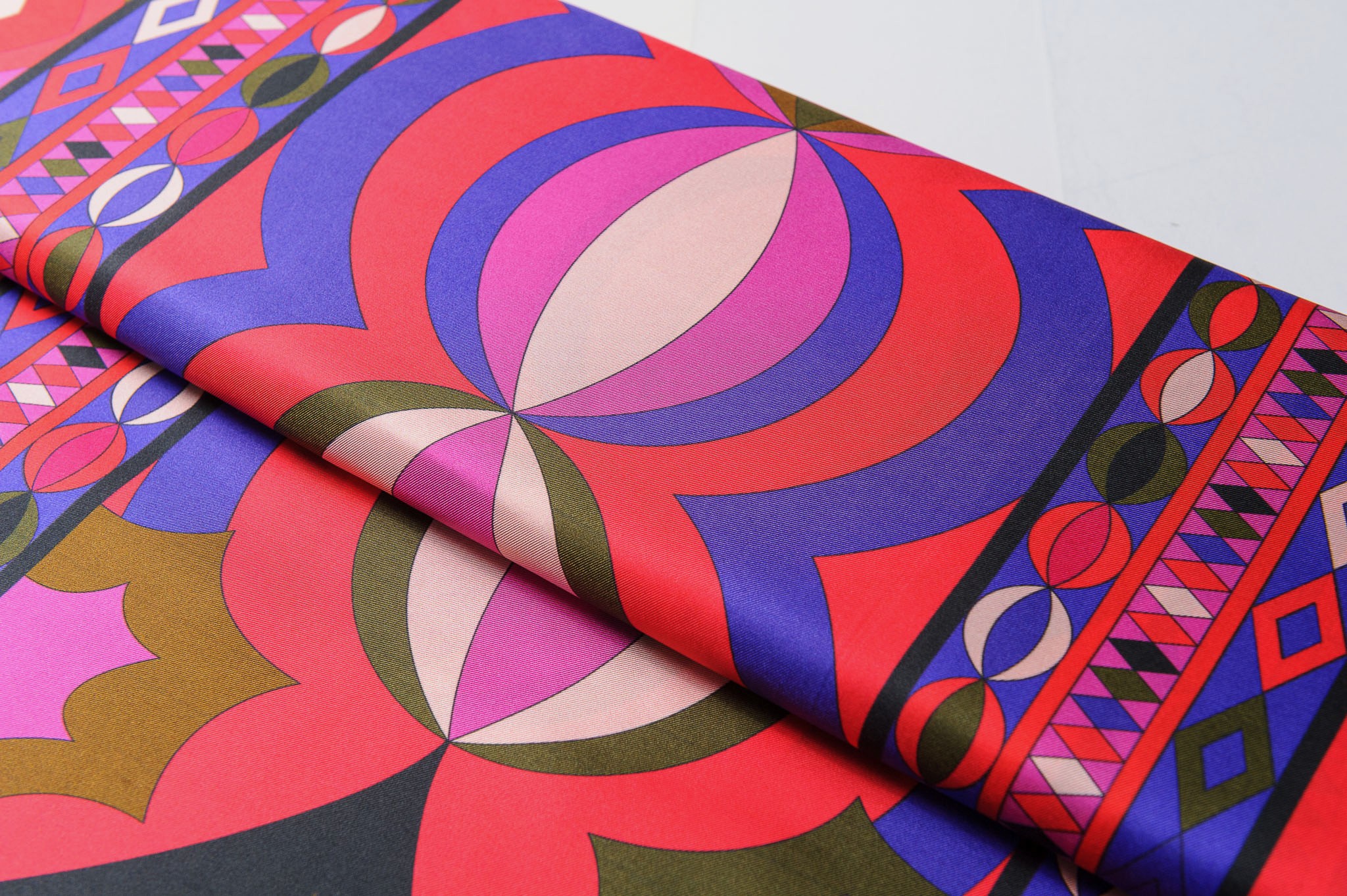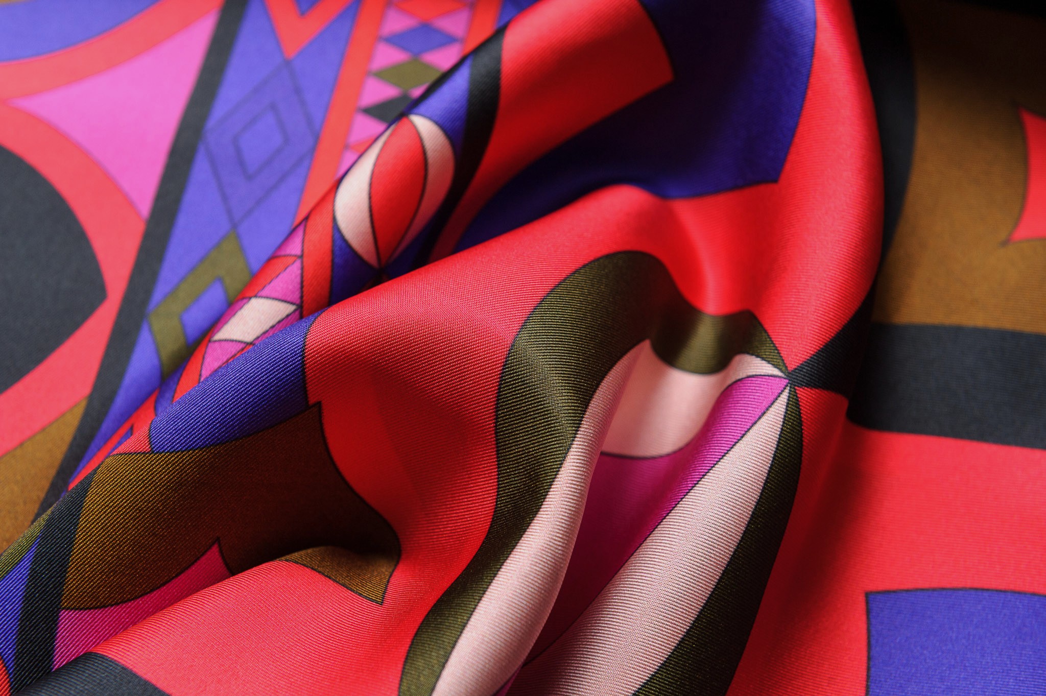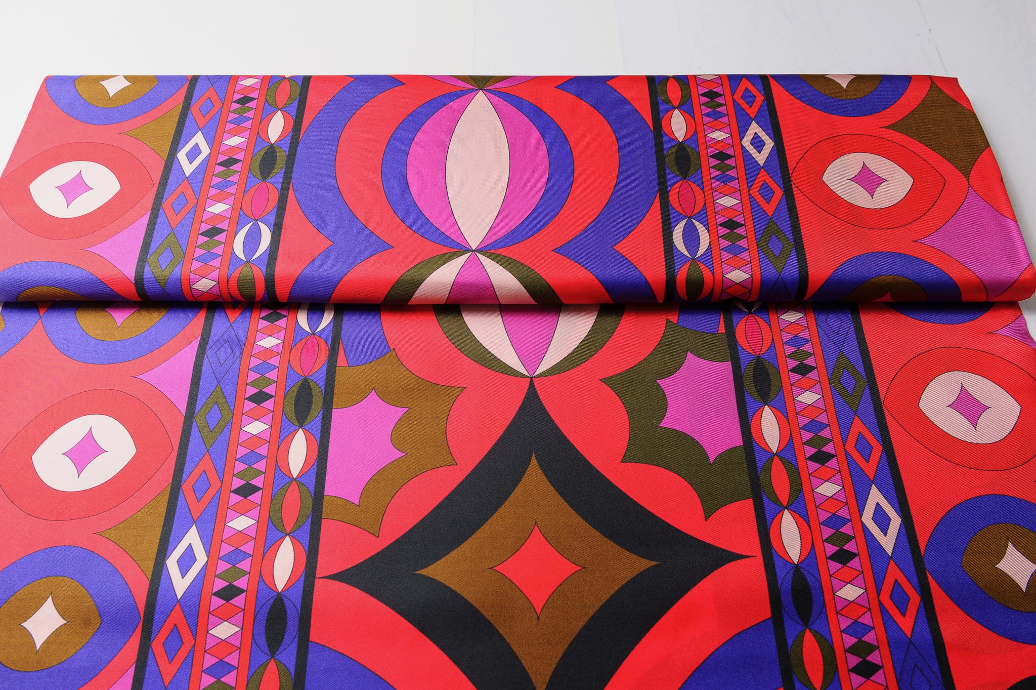 Materiał delikatnie sztywniejszy, matowy. Geometryczne wzory w kolorze czerwonym, fioletowym, brązowym . Odpowiedni na koszule, sukienki, spodnie, spódnice.