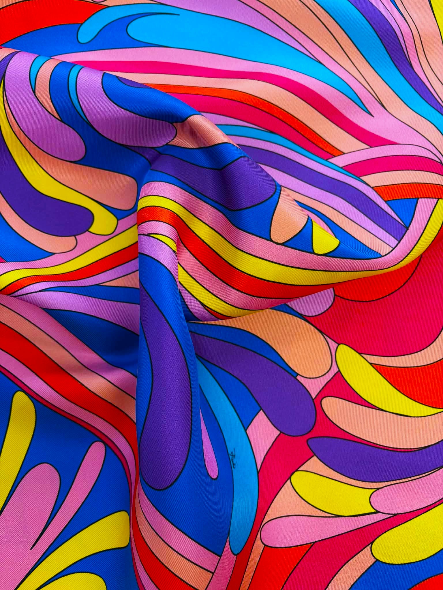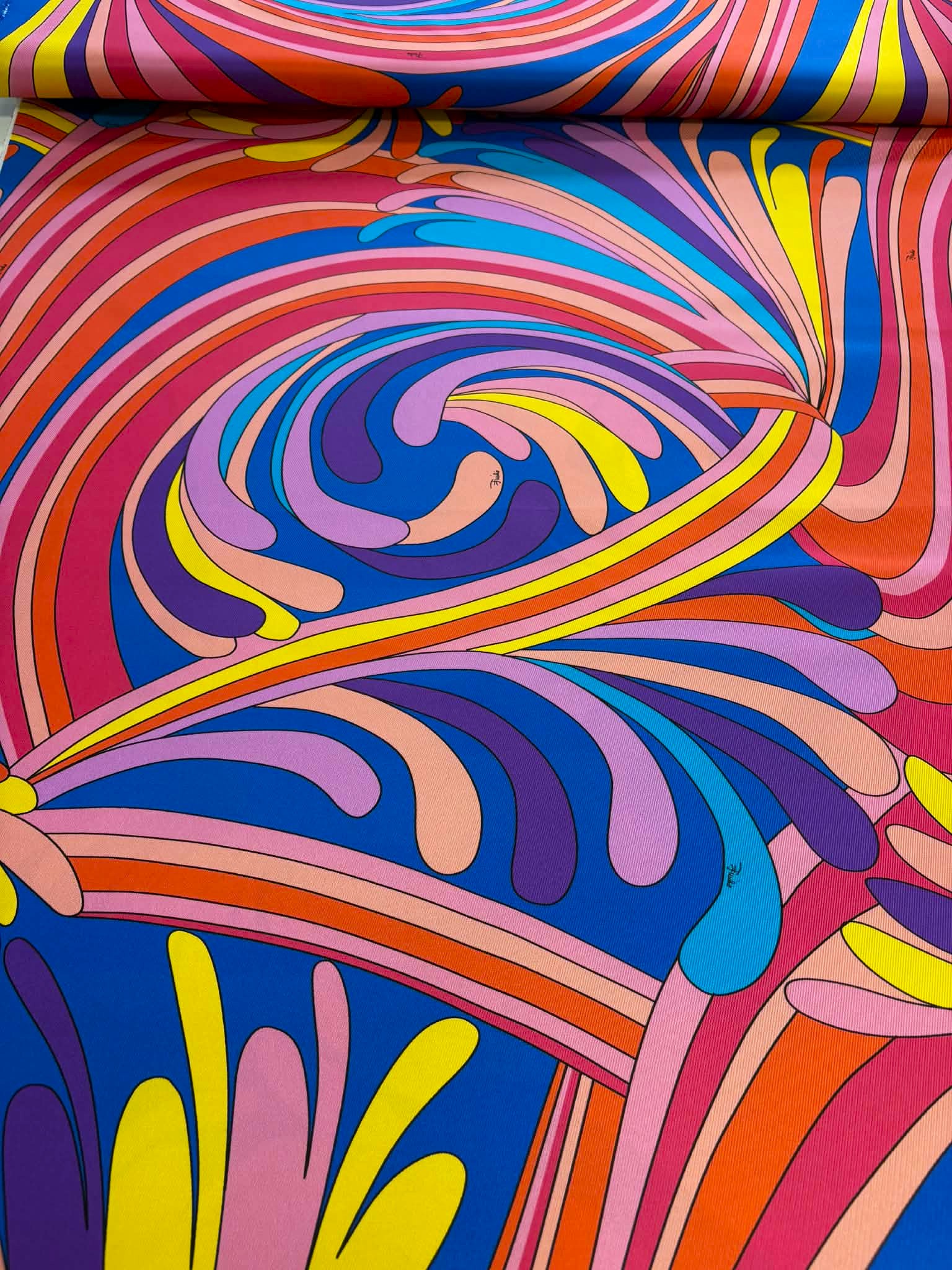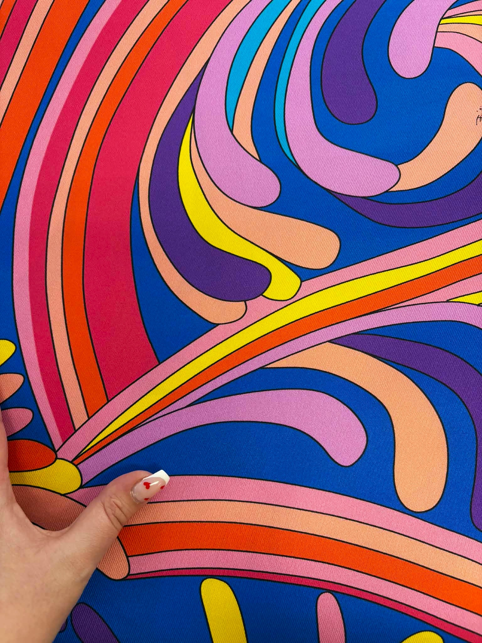Materiał grubszy, sztywniejszy, matowy. Duże, geometryczne wzory w kolorach brzoskwini, niebieskiego, pomarańczu. Odpowiedni na sukienki, spódnice, bluzki.