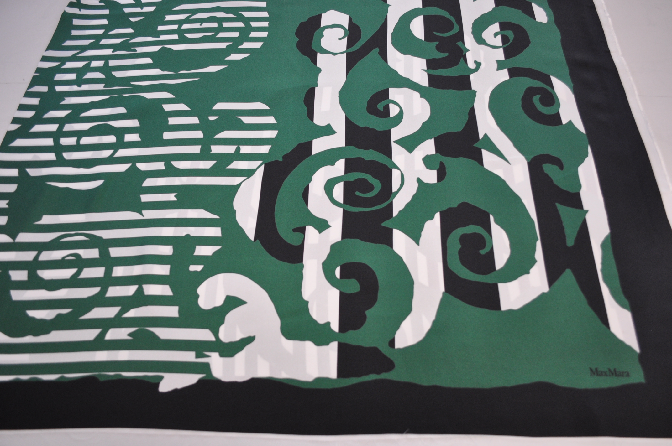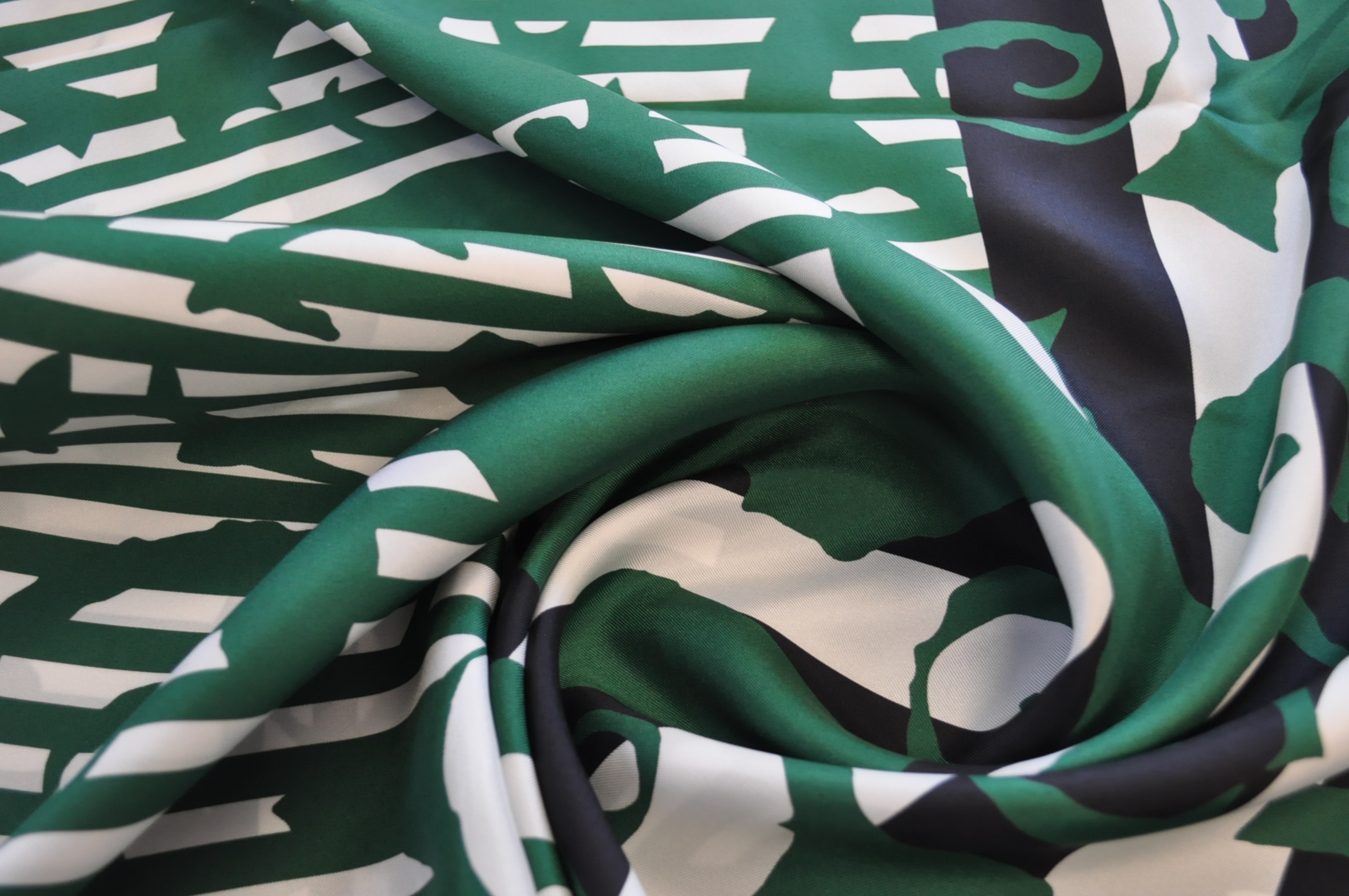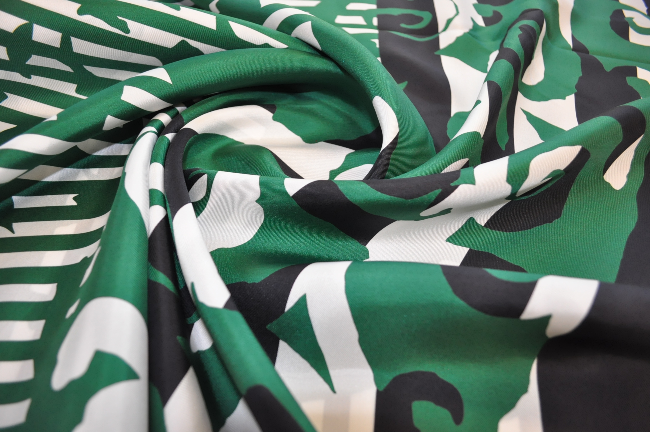 Materiał w geometryczny wzór czarno-zielony. Delikatnie prześwituje. Odpowiedni na spódniczki, koszule, sukienki.