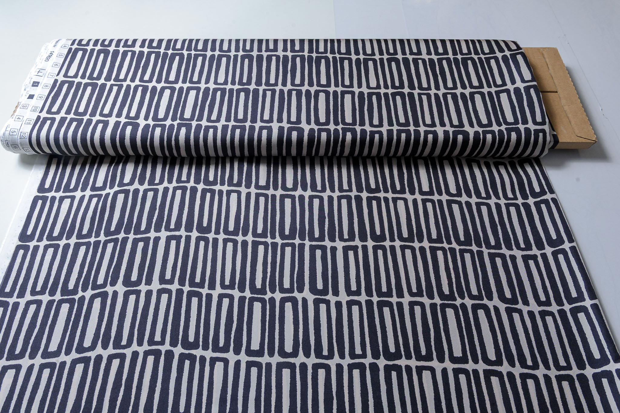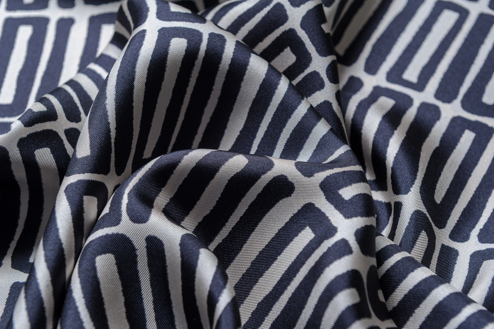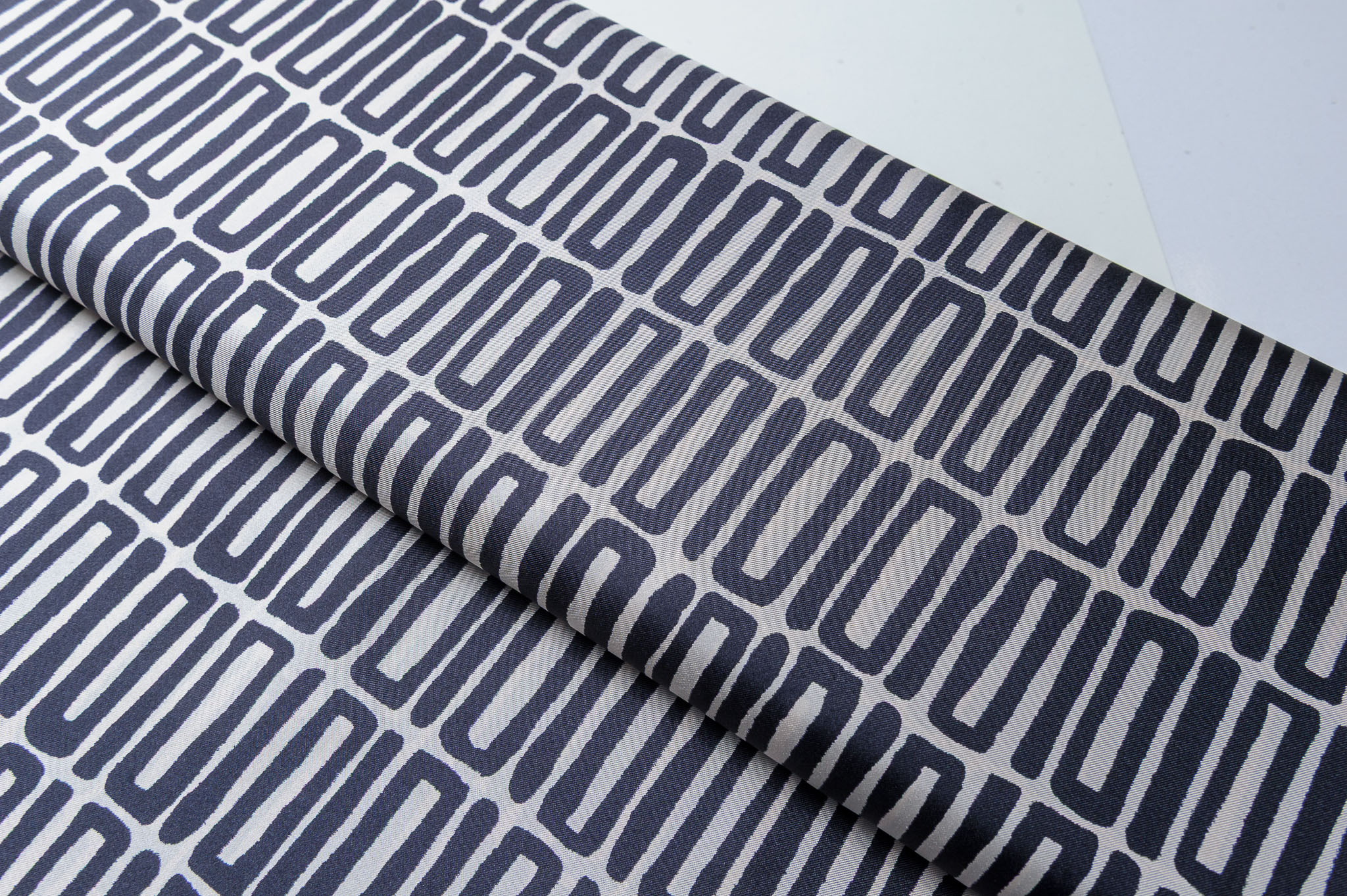 Materiał sztywniejszy, nie prześwitujący. Wzór geometryczny, w czarno-stalowe prostokąty. Odpowiedni na sukienki, koszule, spódnice, bluzki.