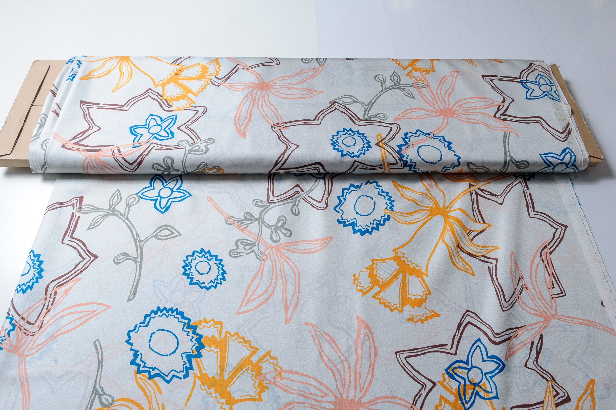 Materiał sztywniejszy, delikatnie prześwitujący. Wzór kolorowe gwiazdki, kwiaty na śmietanowym tle. Odpowiedni na koszule, sukienki, bluzki, spódnice, akcesoria.