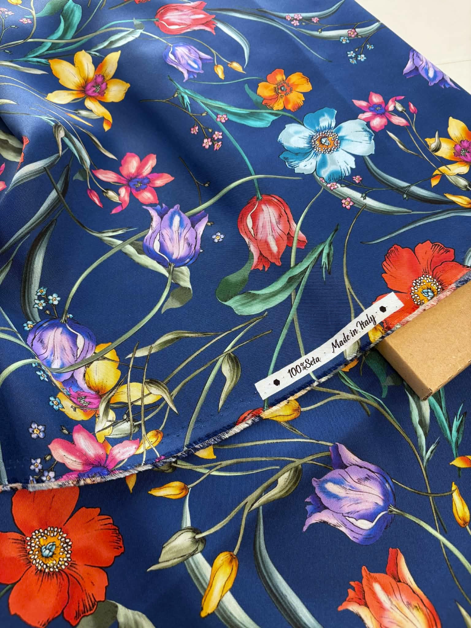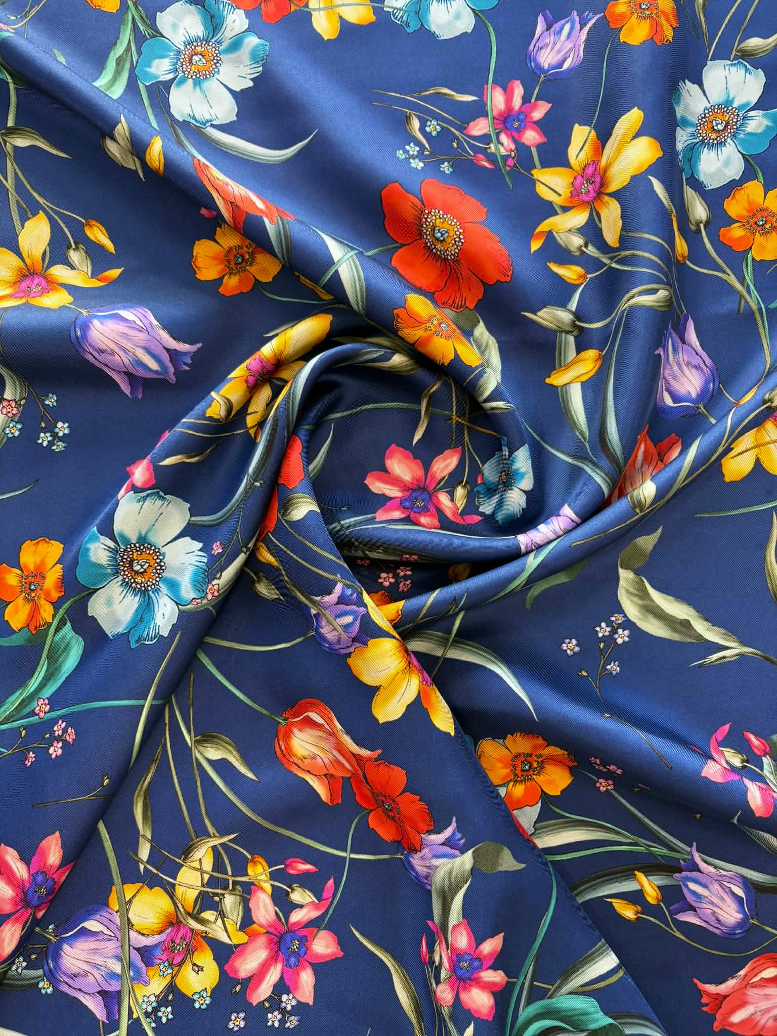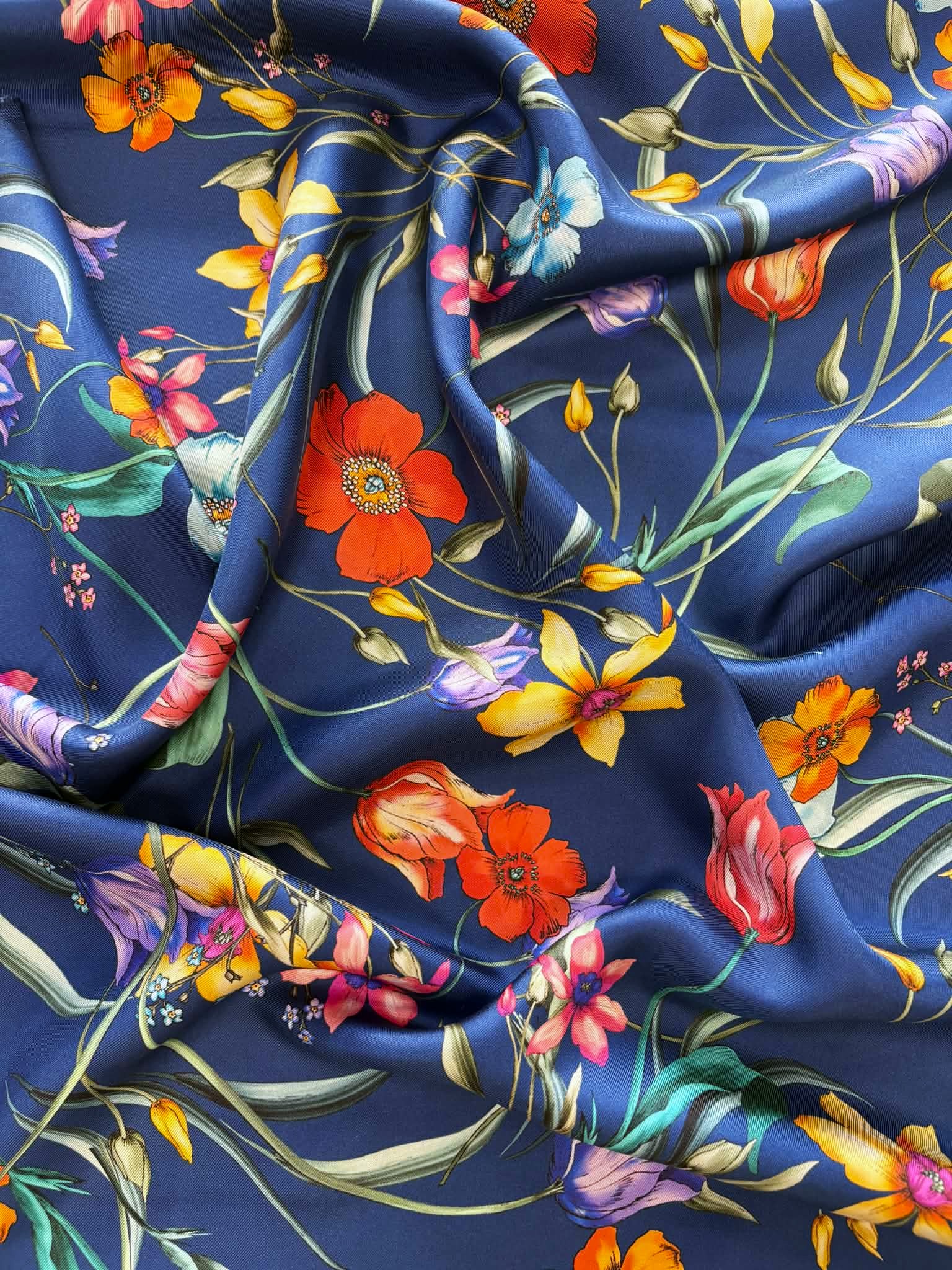 Materiał sztywniejszy, nie prześwituje. Kolorowe kwiaty na granatowym tle. Odpowiedni na sukienki, koszule, spódnice, spodnie.