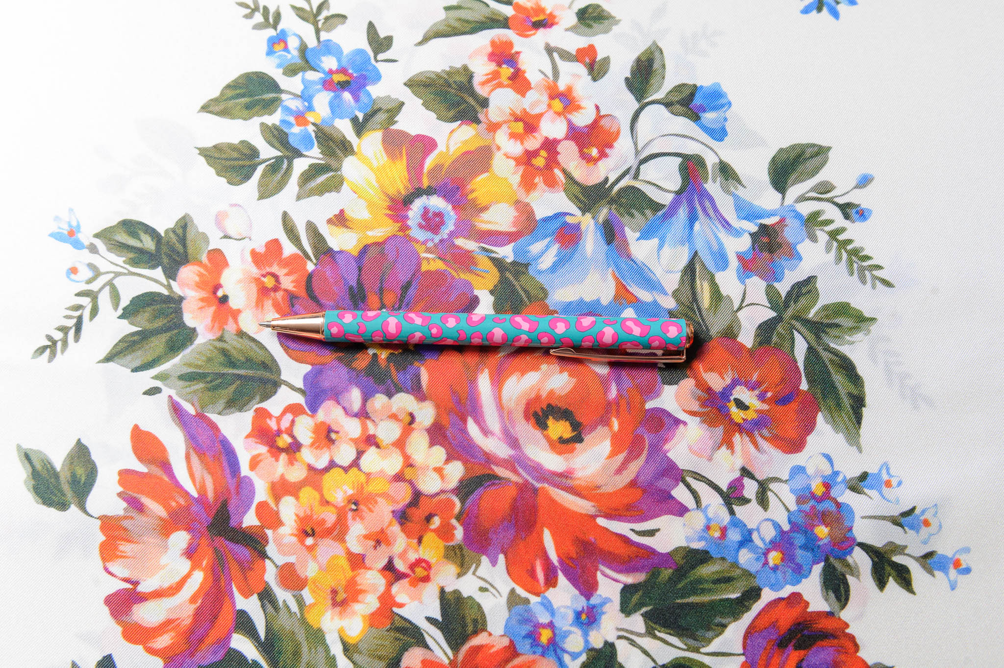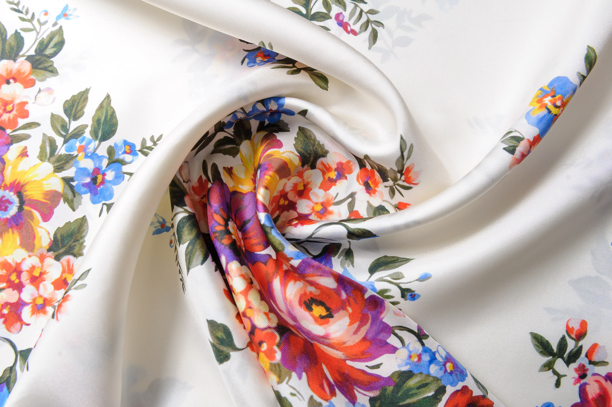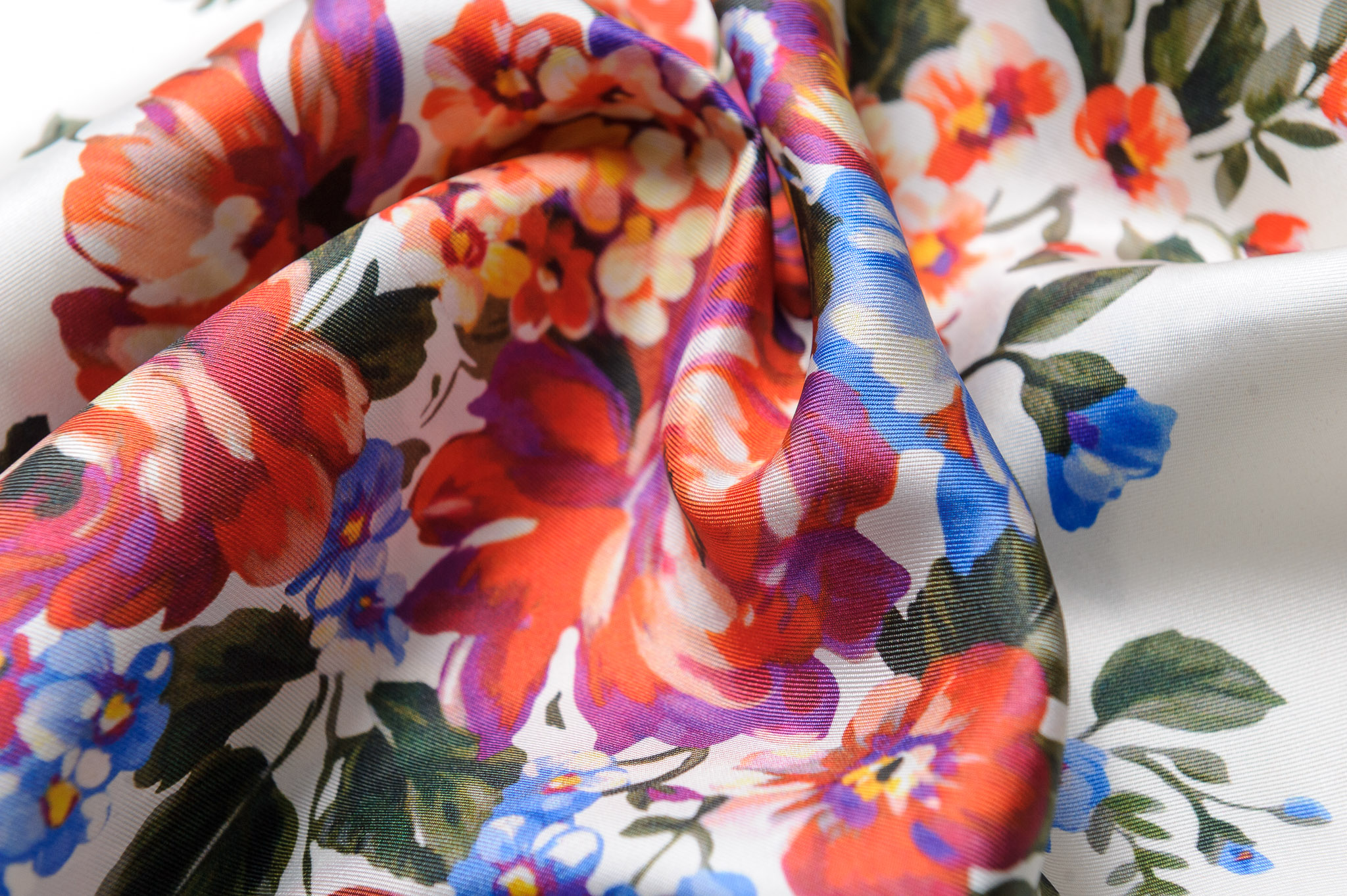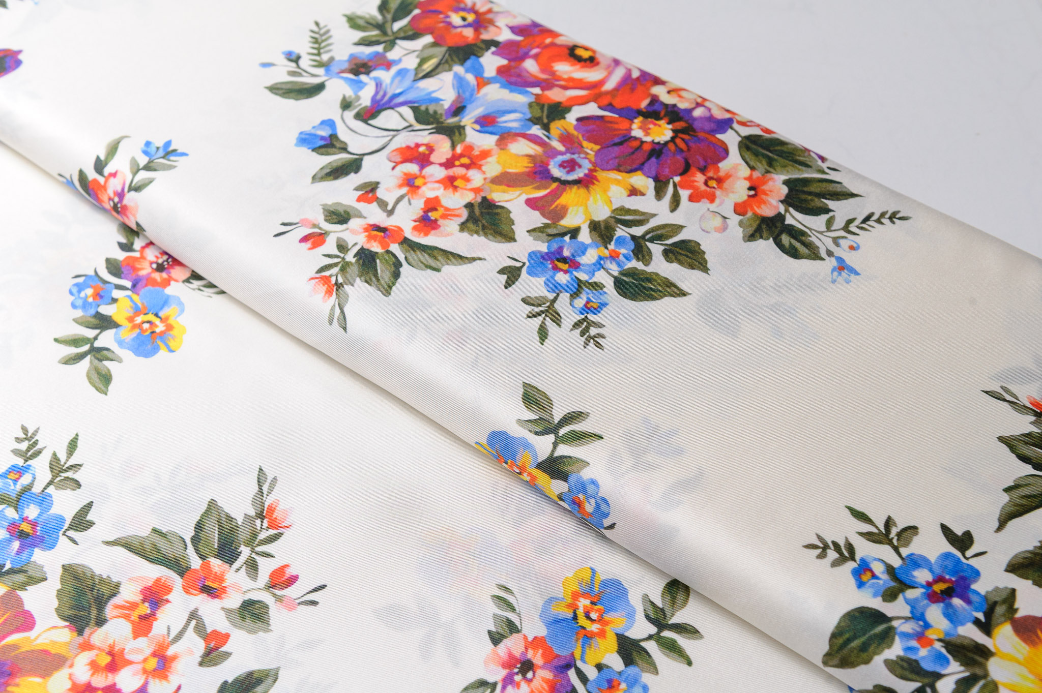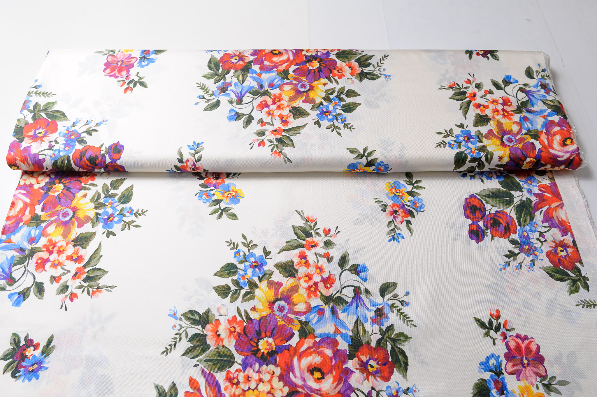 Materiał sztywniejszy, delikatnie prześwitujący. Wzór w kolorowe bukiety kwiatów na śmietanowym tle. Odpowiedni na sukienki, koszule, bluzki, spodnie, spódnice.