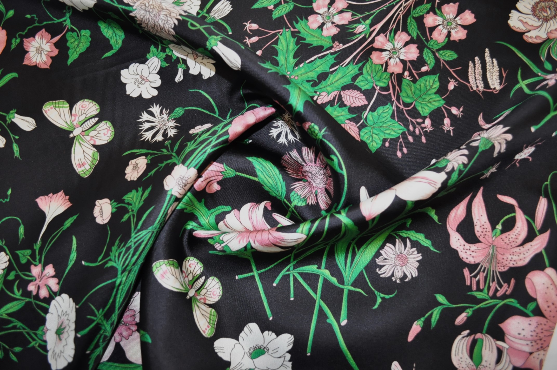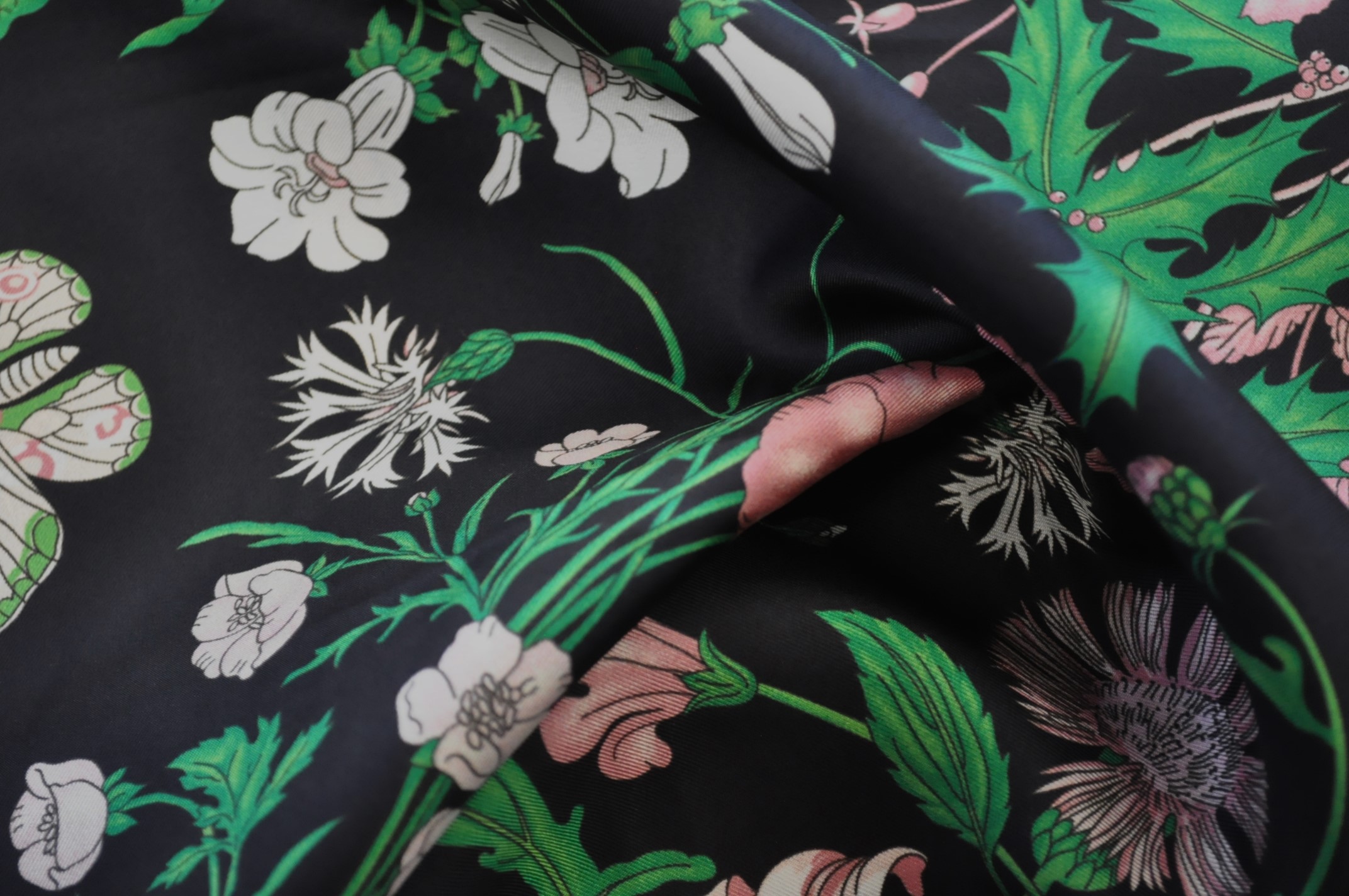 Jedwab kolorowe kwiaty, owady na czarnym tle