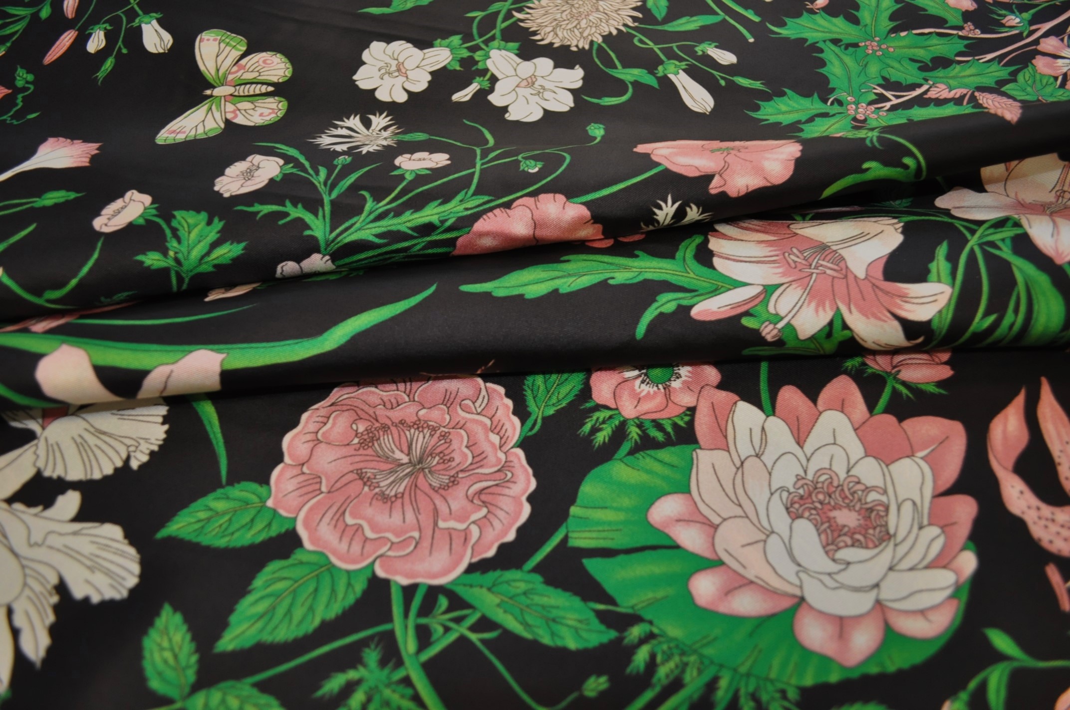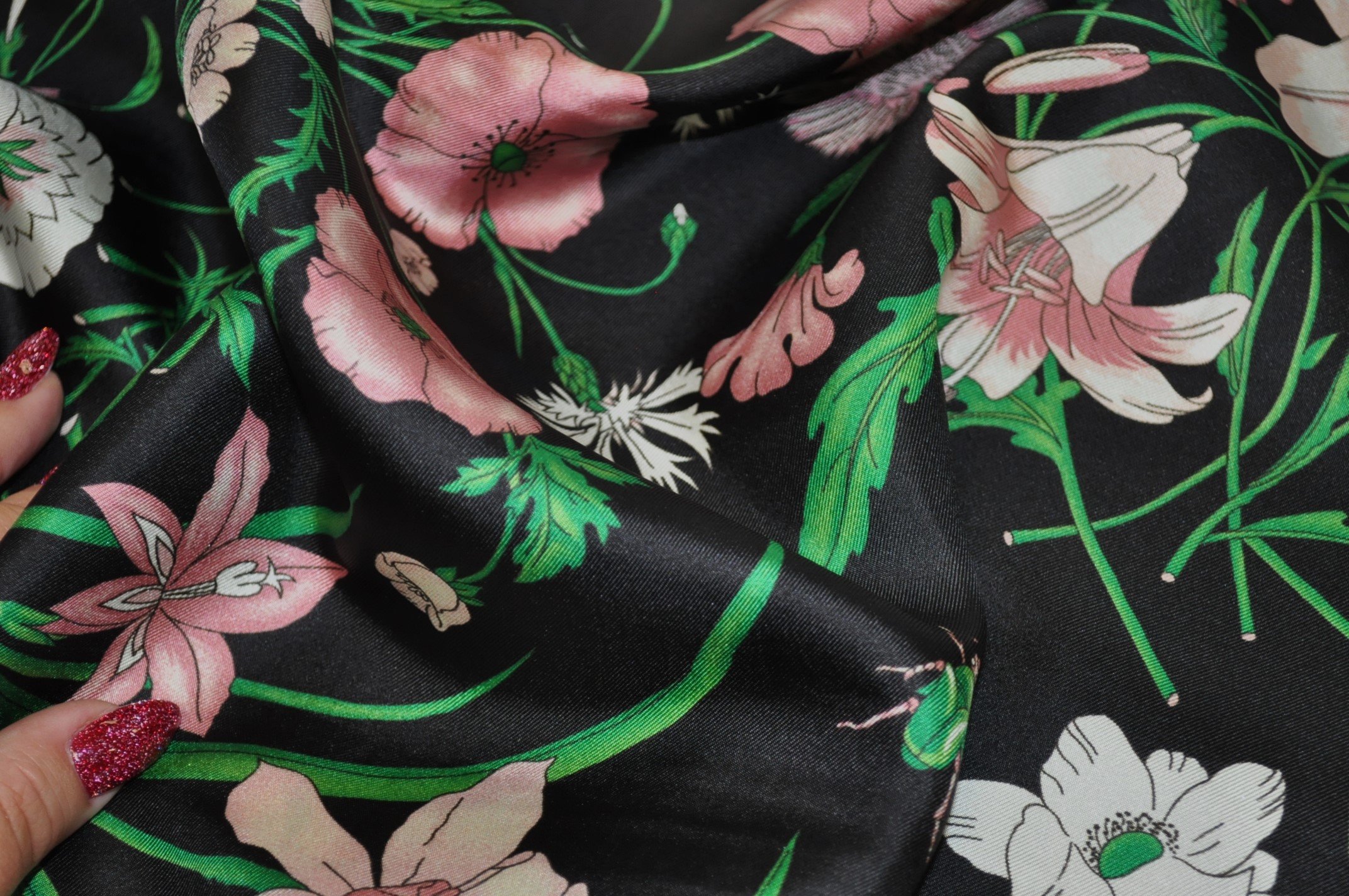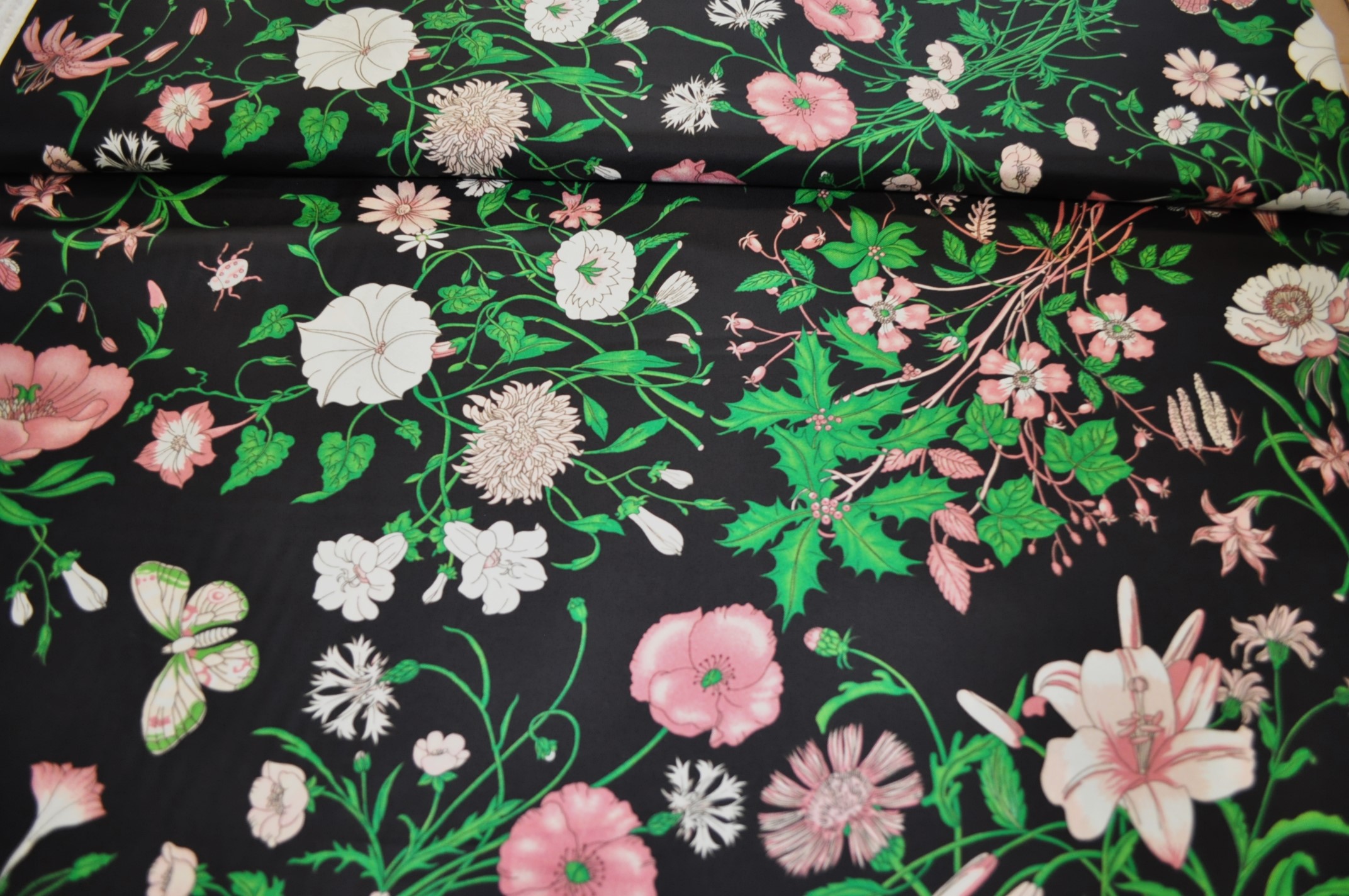 Materiał sztywniejszy, nie prześwituje. Zielono-różowe kwiaty na czarnym tle. Odpowiedni na sukienki, koszule, spódnice.