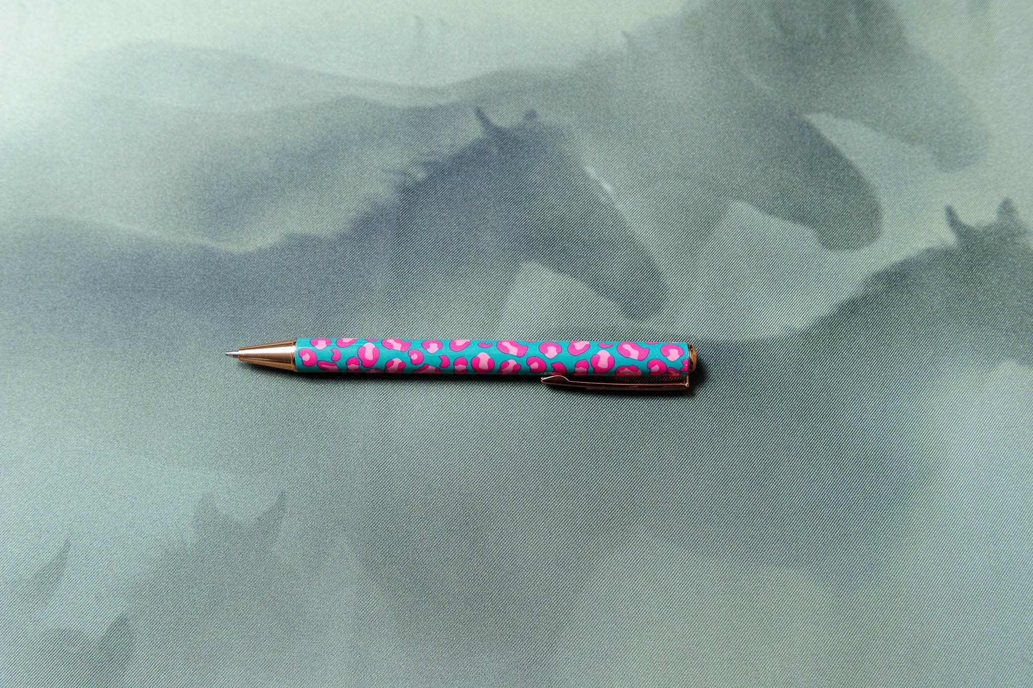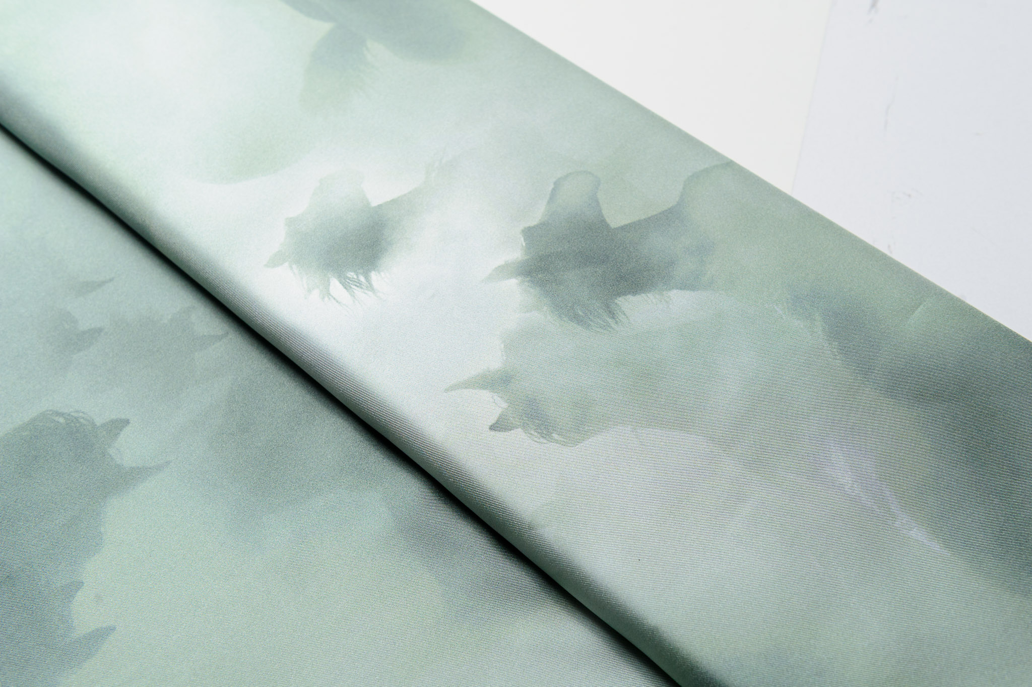 Materiał błyszczący, nie prześwitujący. Wzór w konie na pistacjowym tle. Odpowiedni na sukienki, koszule, spódnice.