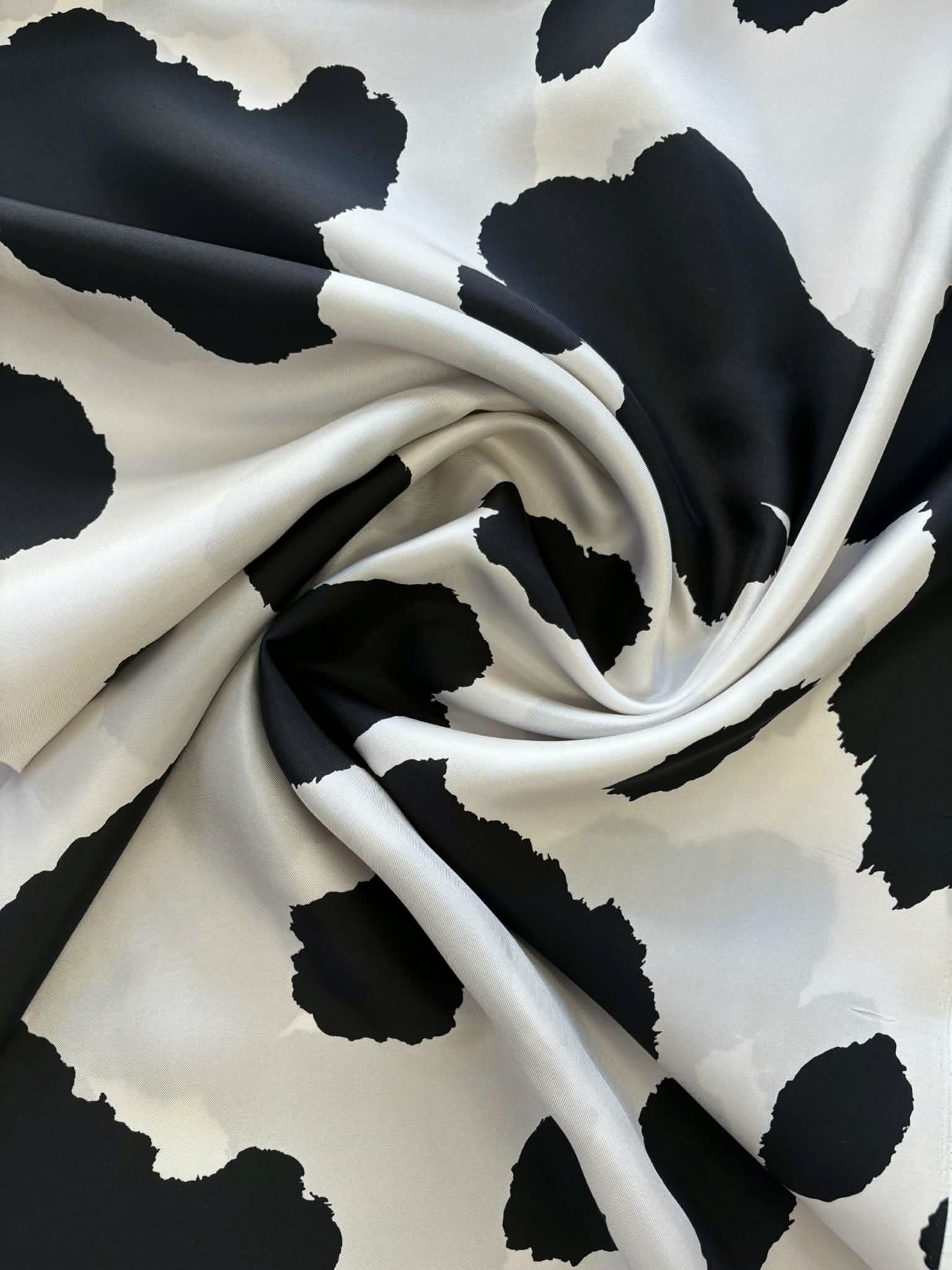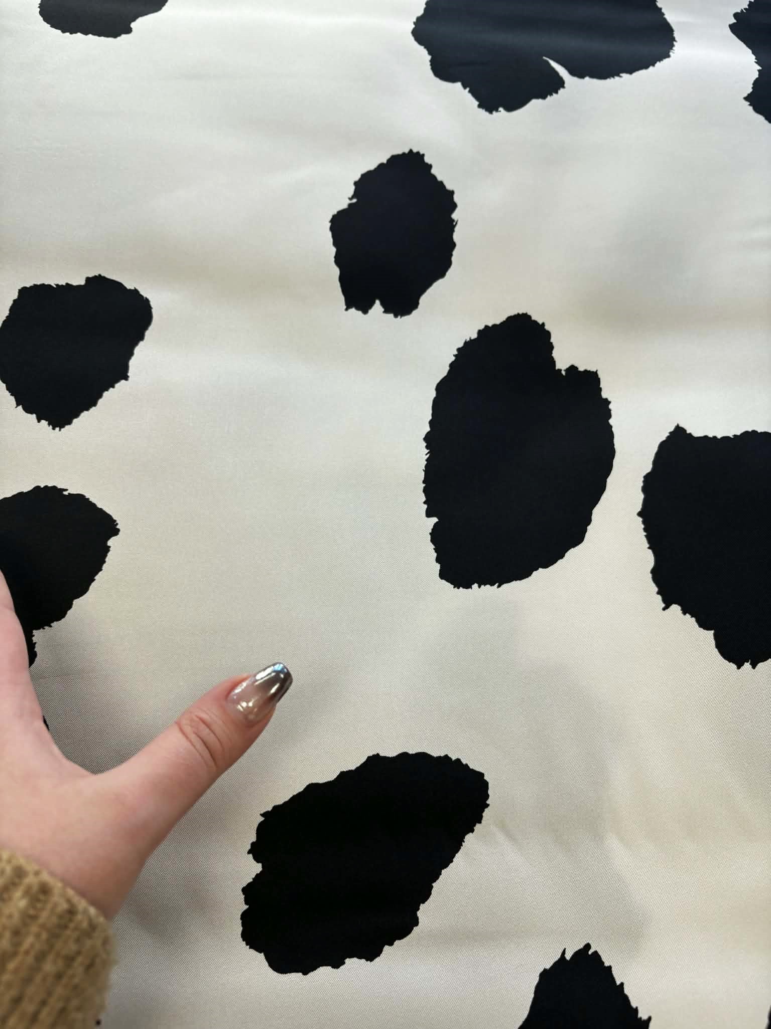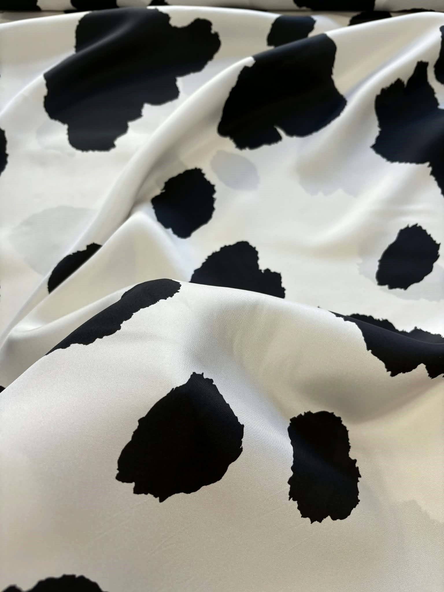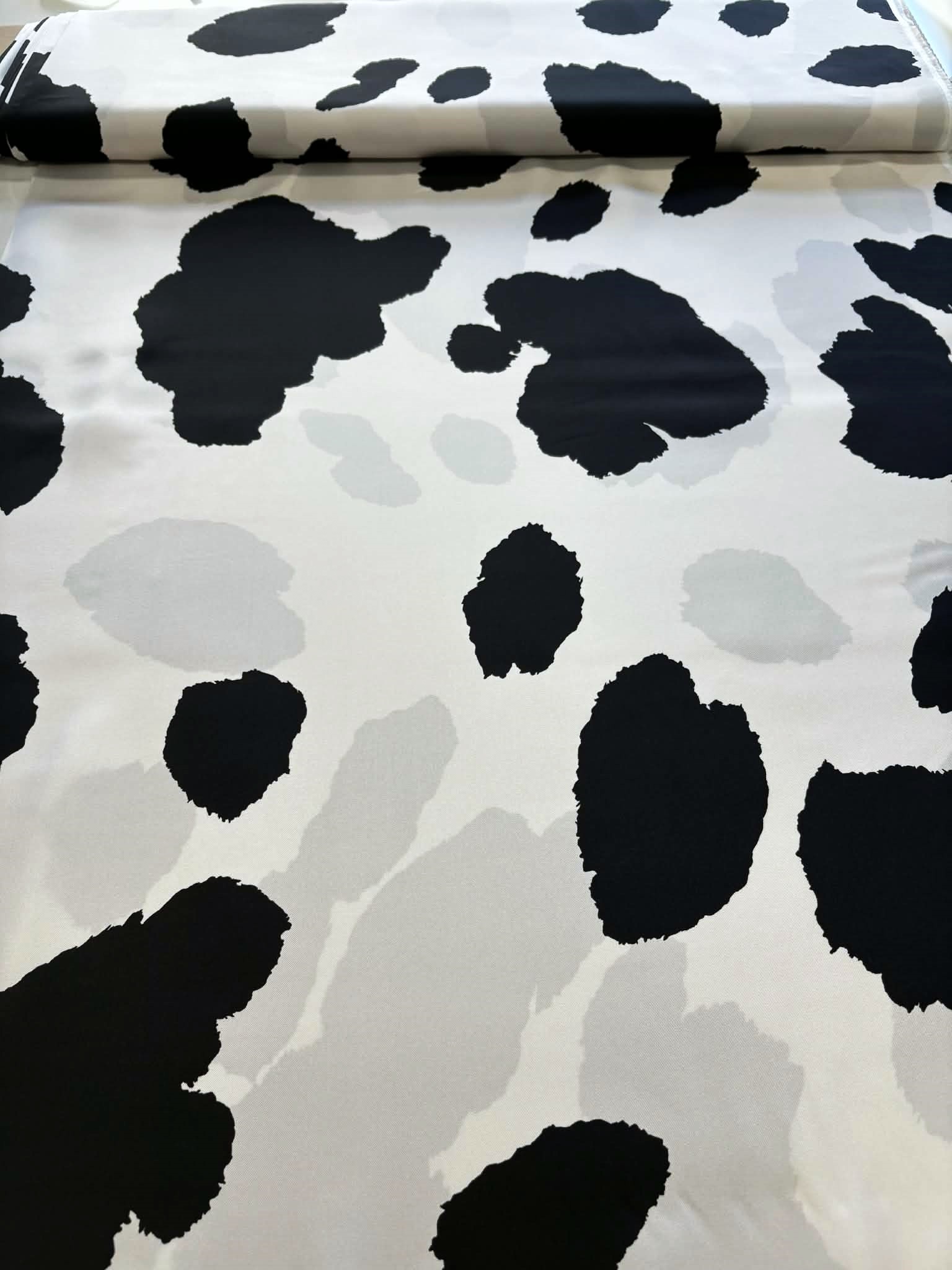 Materiał delikatnie prześwitujący, sztywniejszy. Wzór w krowie łaty czarno-śmietanowe. Odpowiedni na sukienki, koszule, spodnie spódniczki.