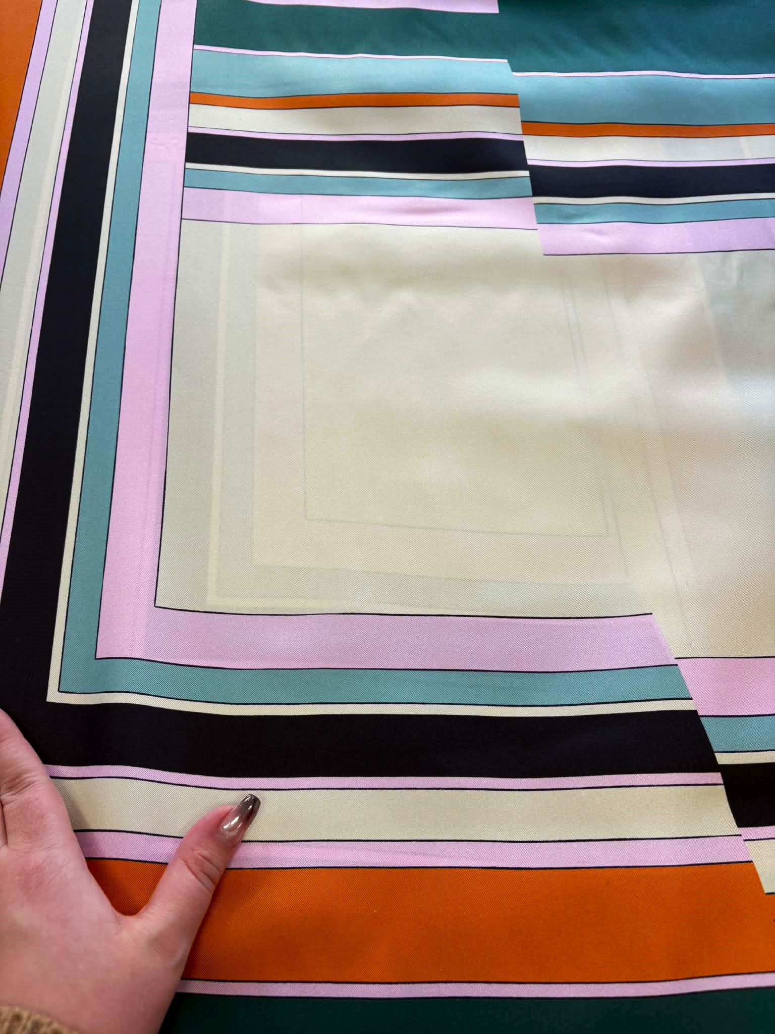 Materiał sztywniejszy, nie prześwituje. Wzór duży geometryczny, kwadraty w kolorach mięty, pomarańczy, zieleni. Odpowiedni na bluzki, spodnie, sukienki, spódnice,spodenki.