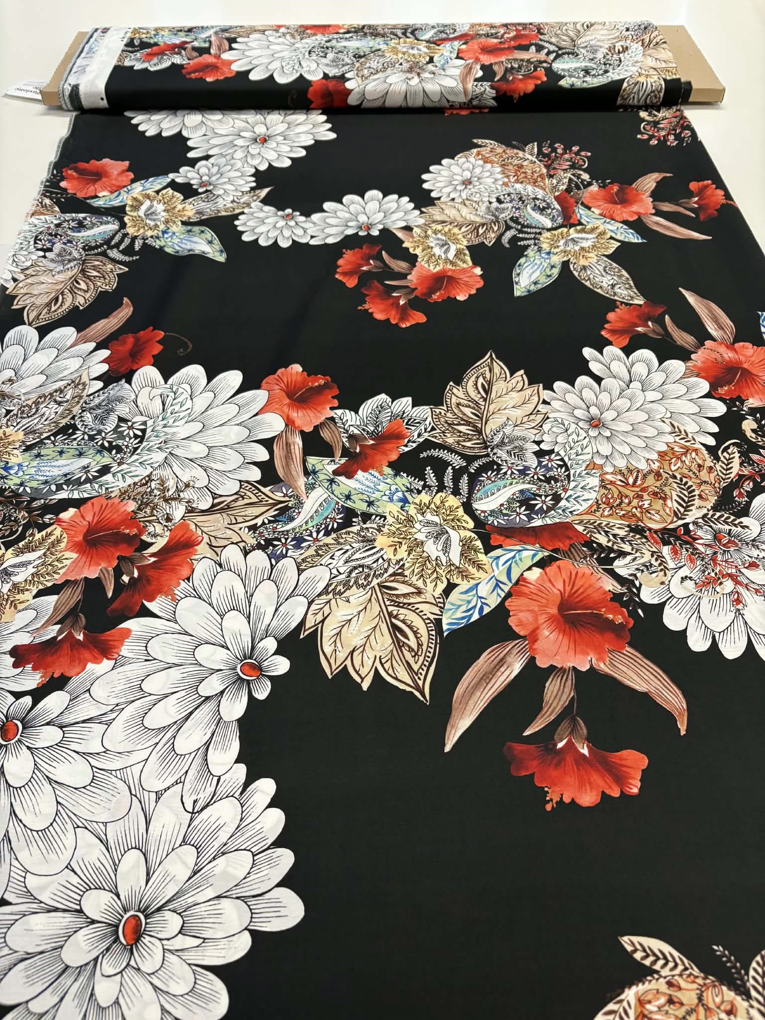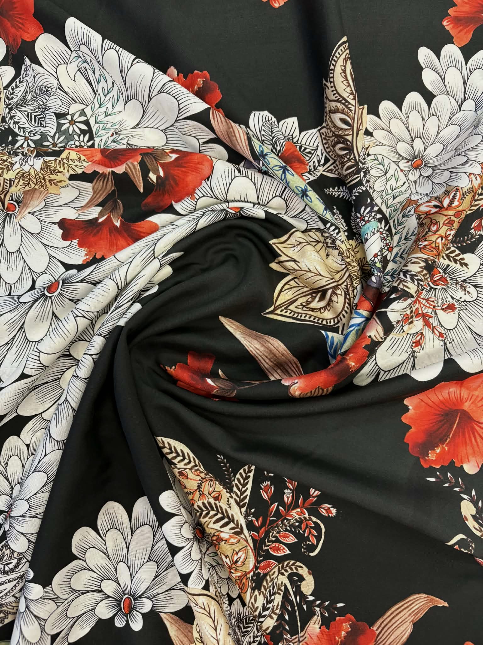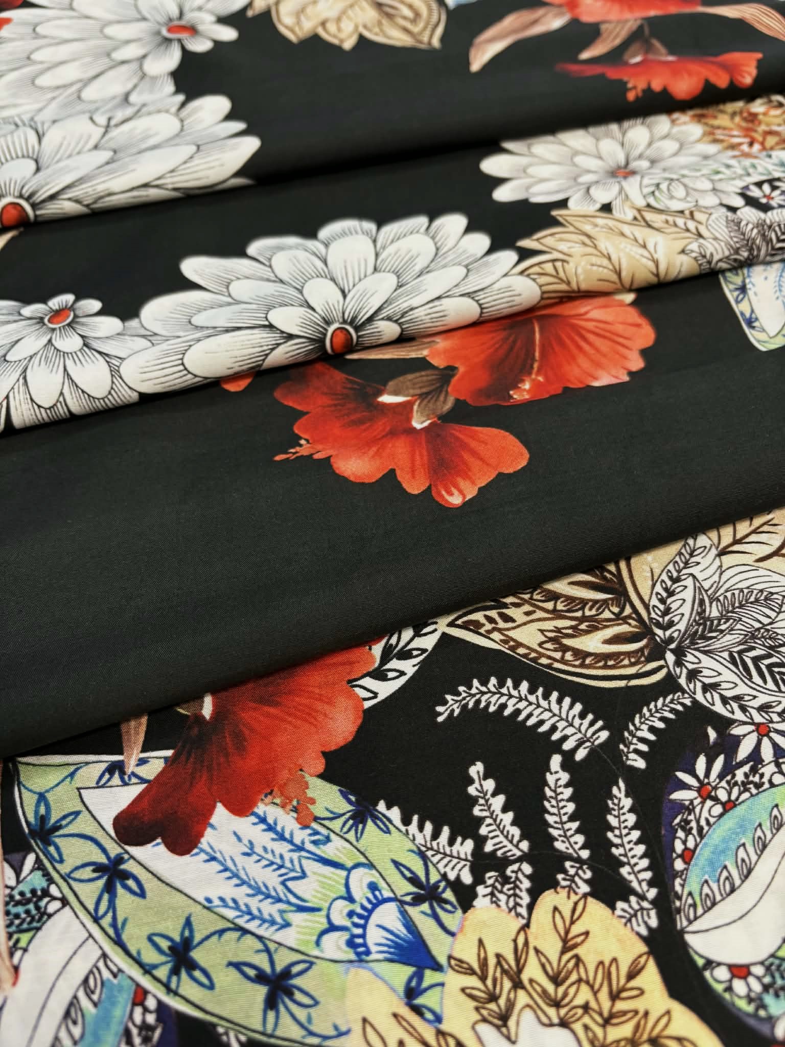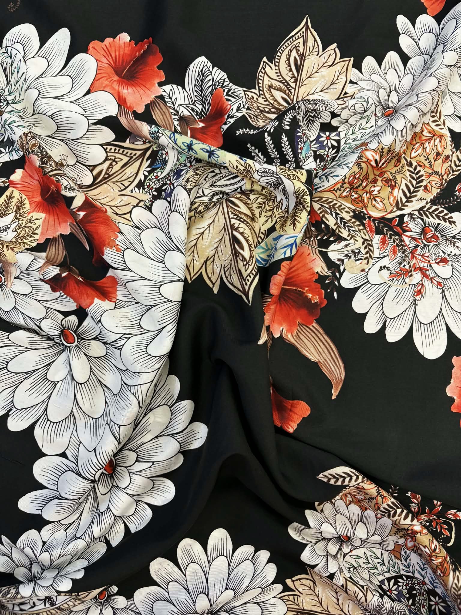 Materiał cienki, delikatnie prześwitujący. Wzór kwiatowy na cieniowanym, czarnym tle. Odpowiedni na sukienki, spódniczki, koszule.