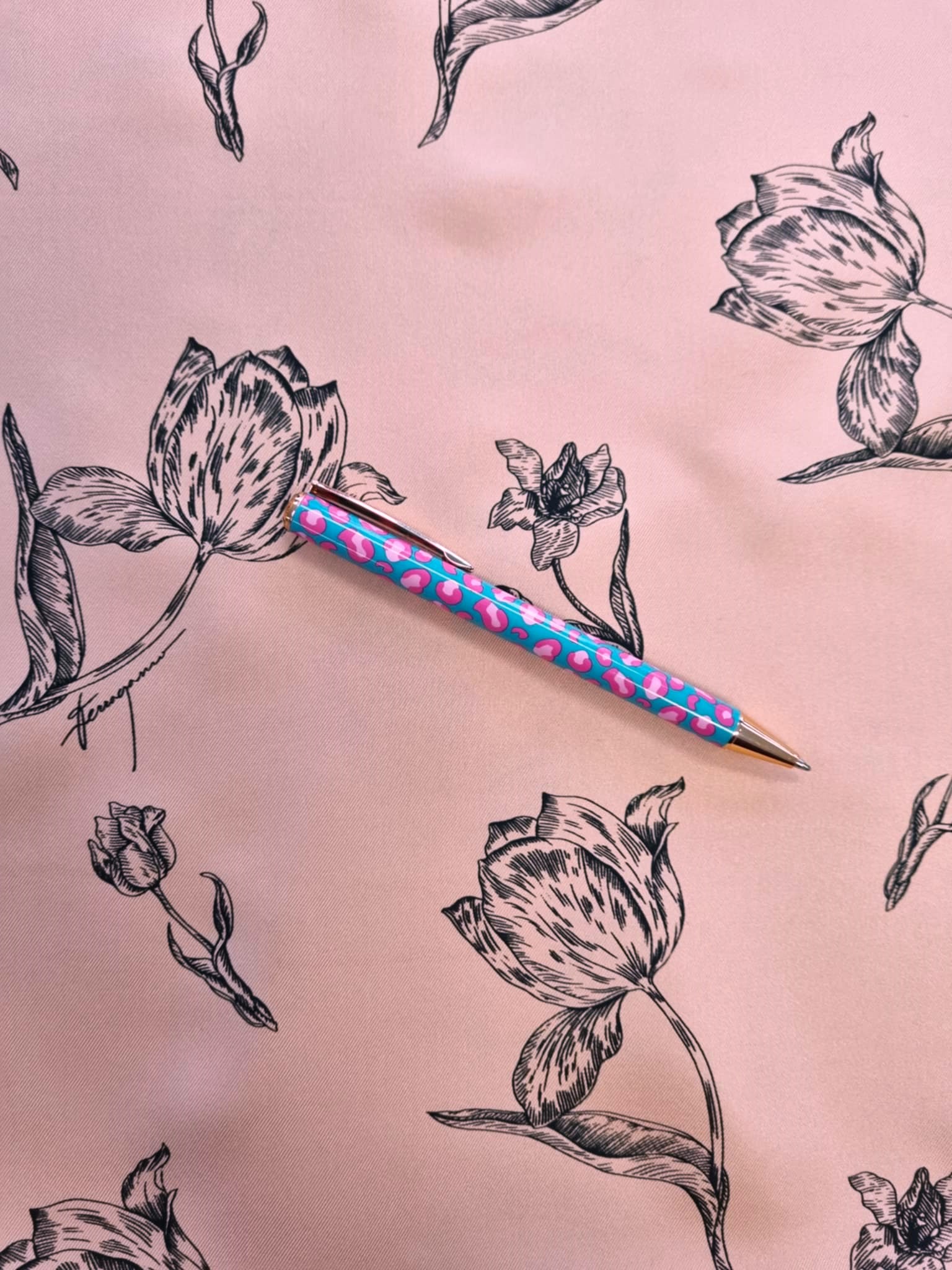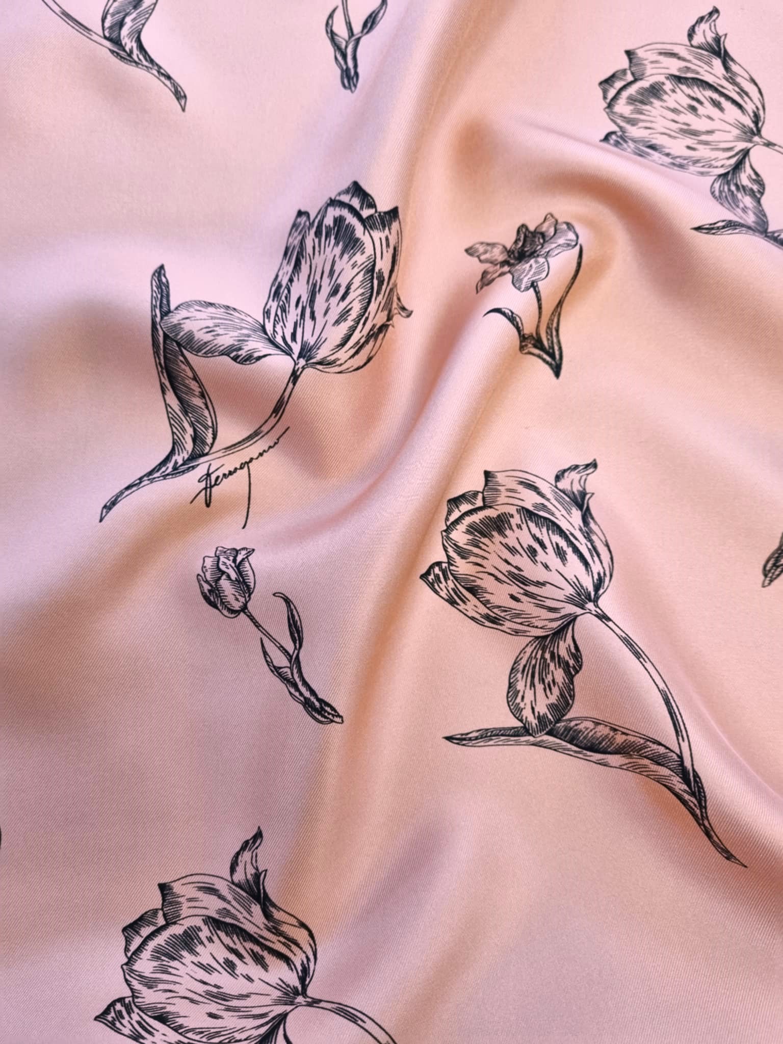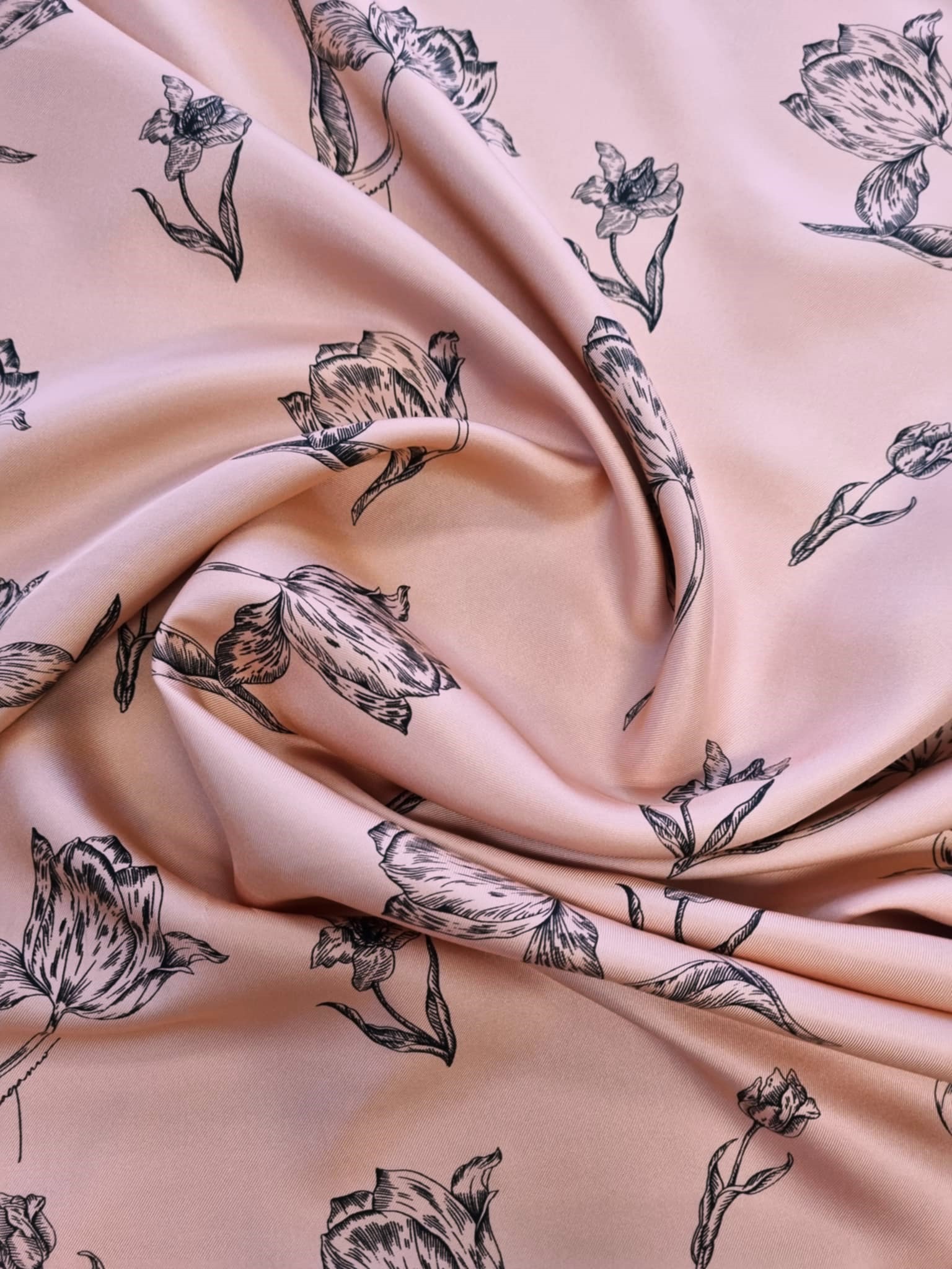 Materiał w czarne kwiaty na brzoskwiniowym tle. Nie prześwituje. Odpowiedni na sukienki, koszule, spódnice, bluzki.