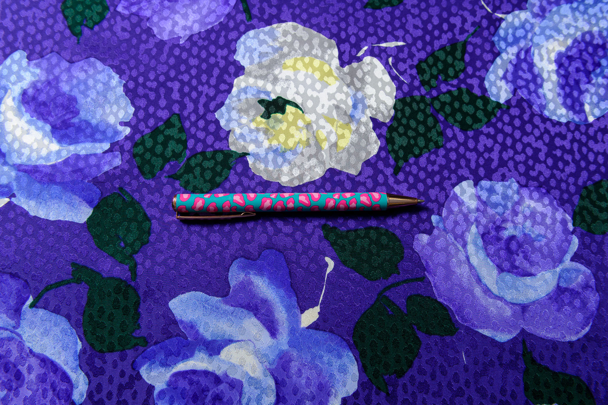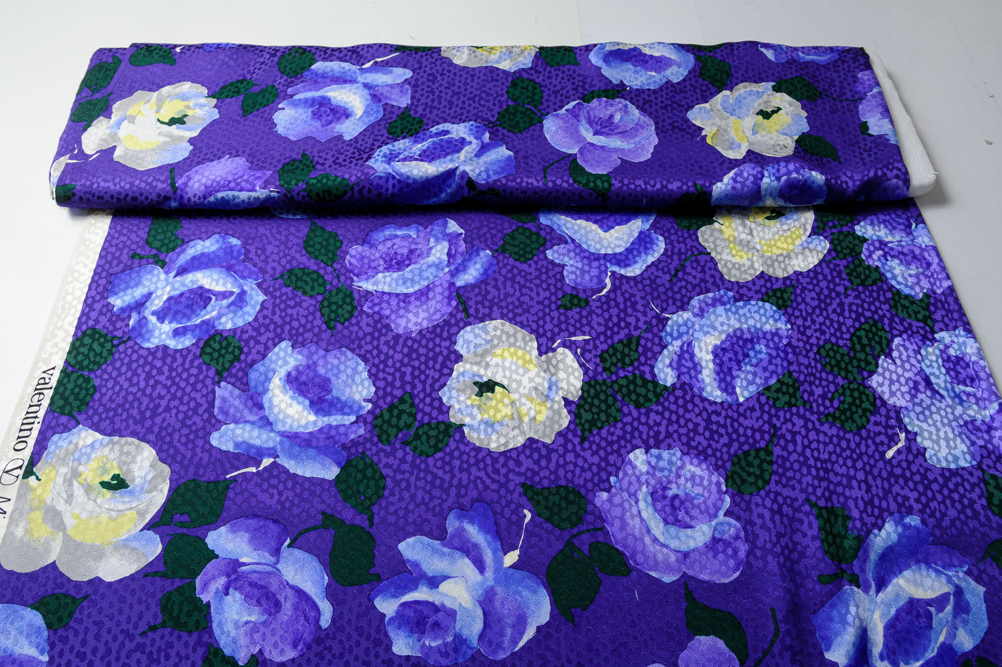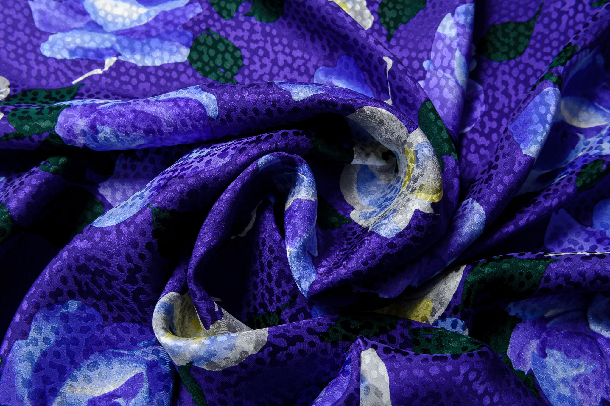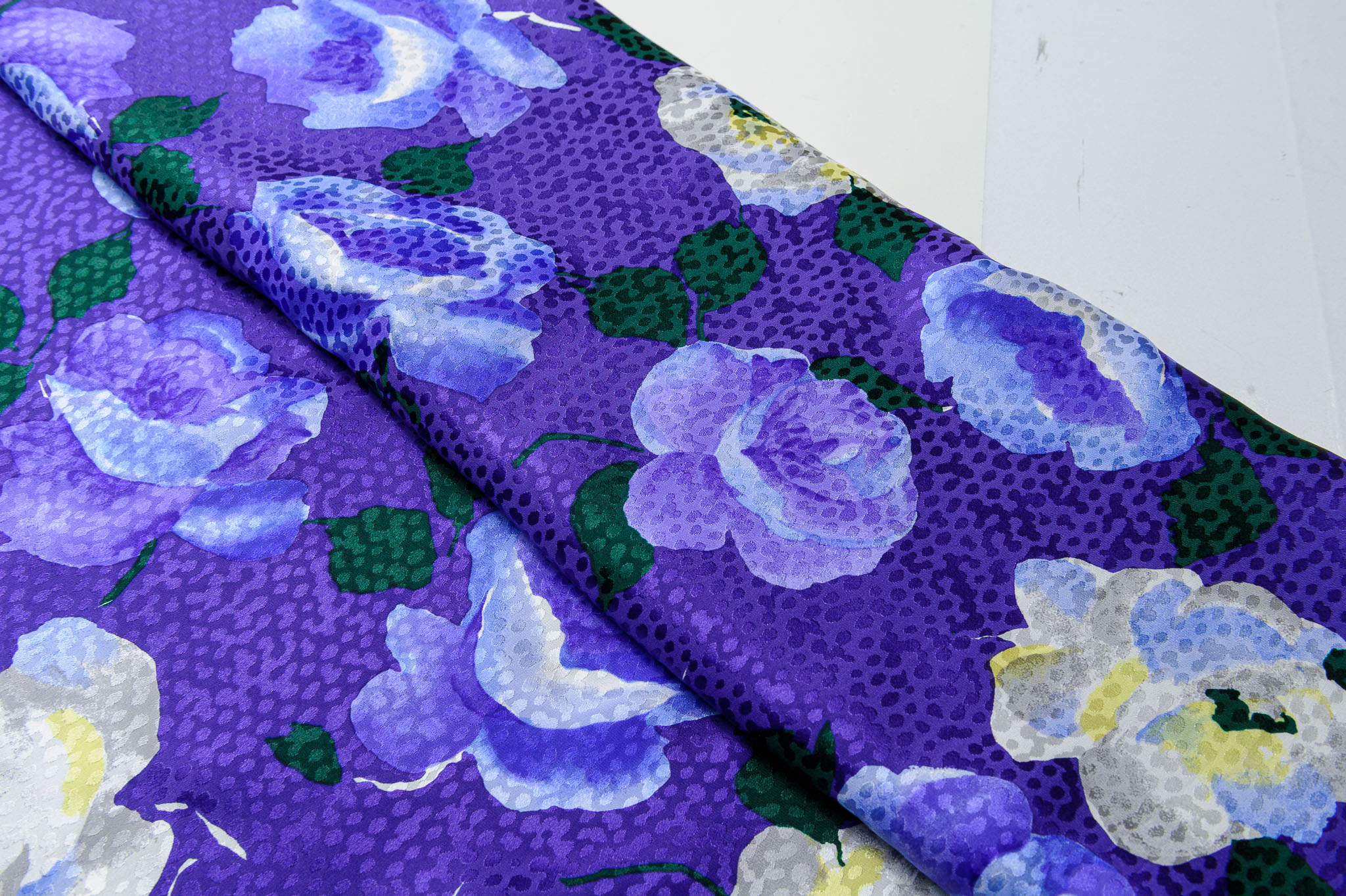 Materiał lejący, delikatnie prześwitujący. Żółto-białe kwiaty na fioletowym tle. Odpowiedni na sukienki, koszule, spódnice.