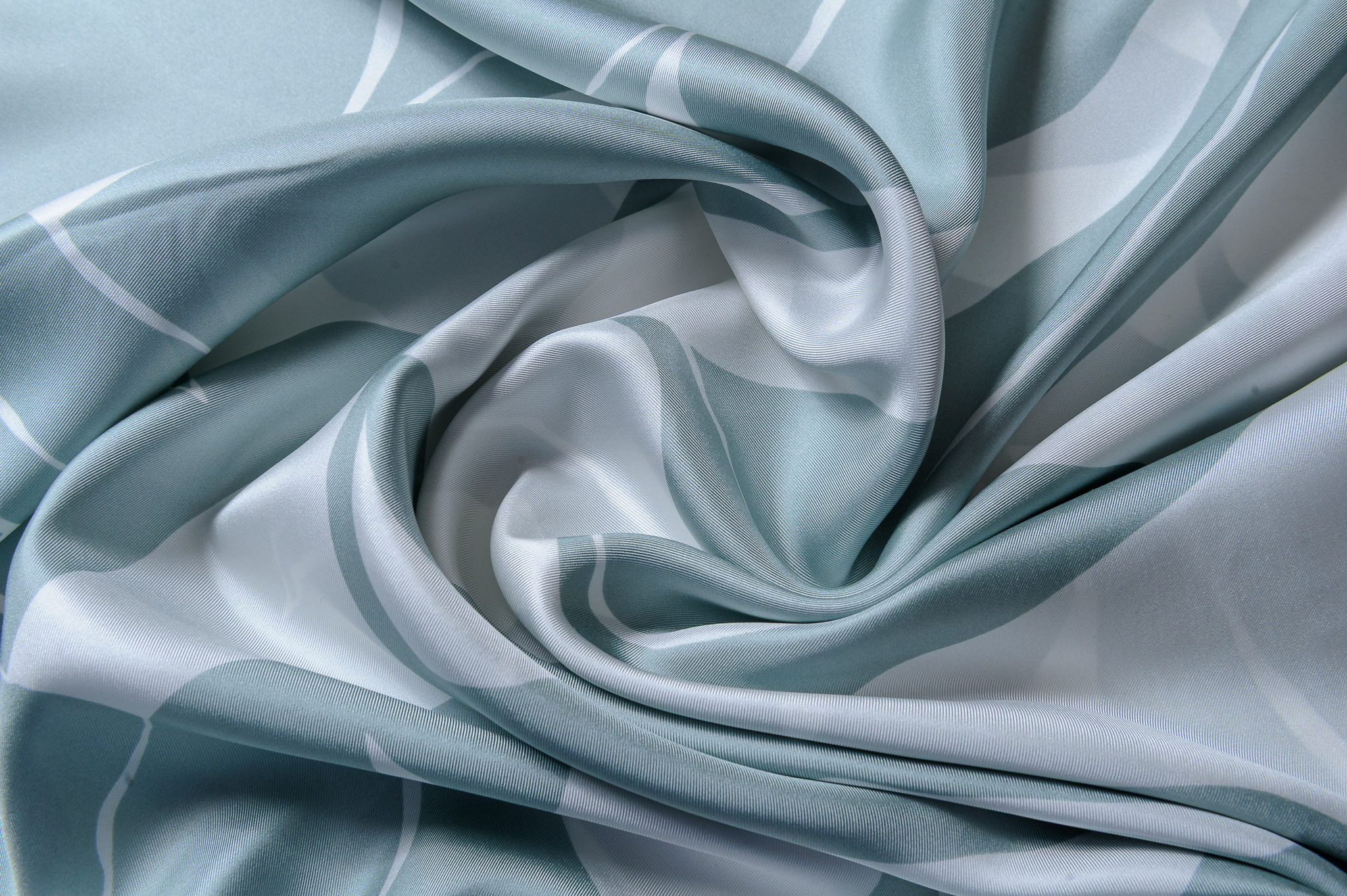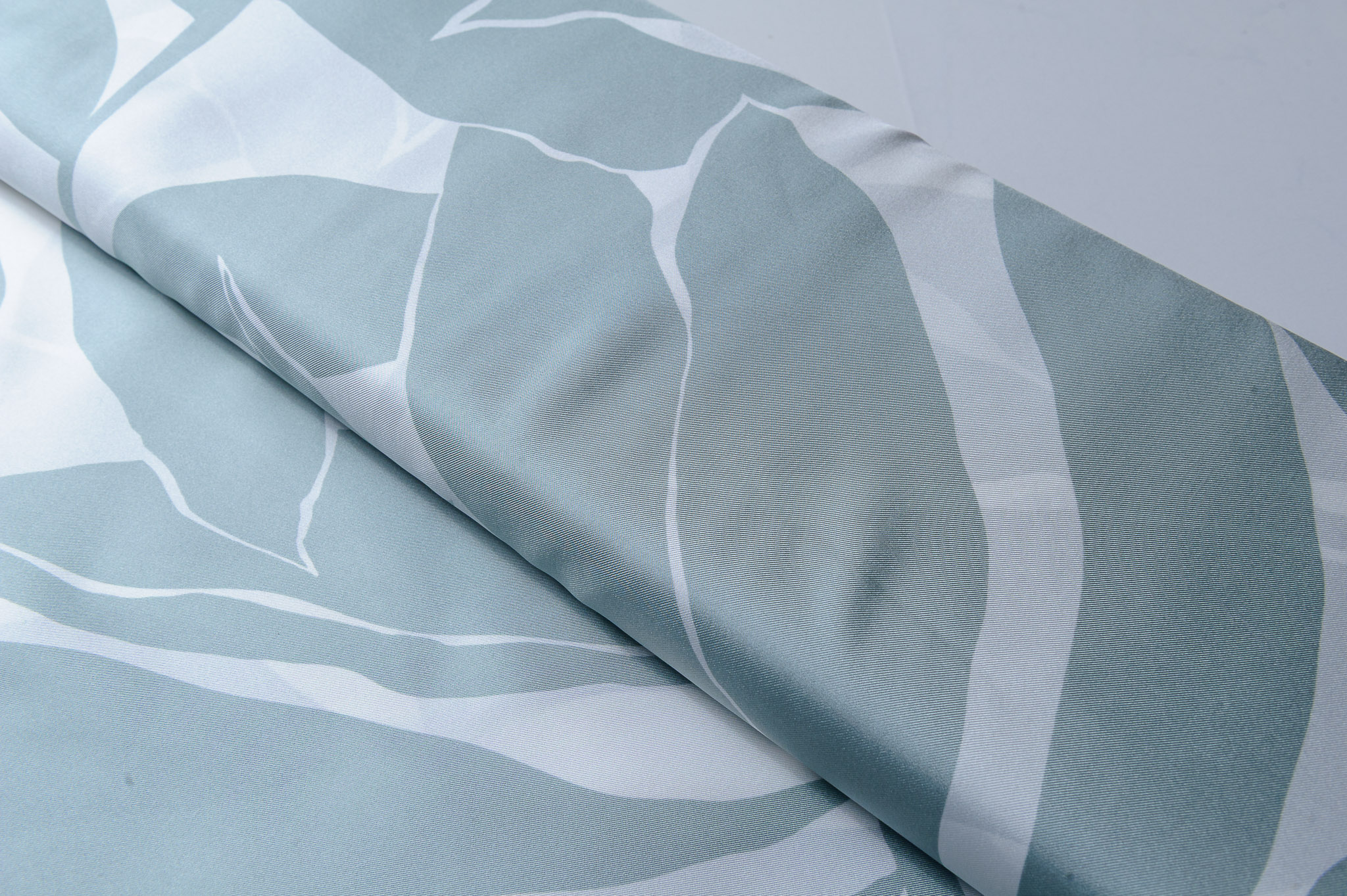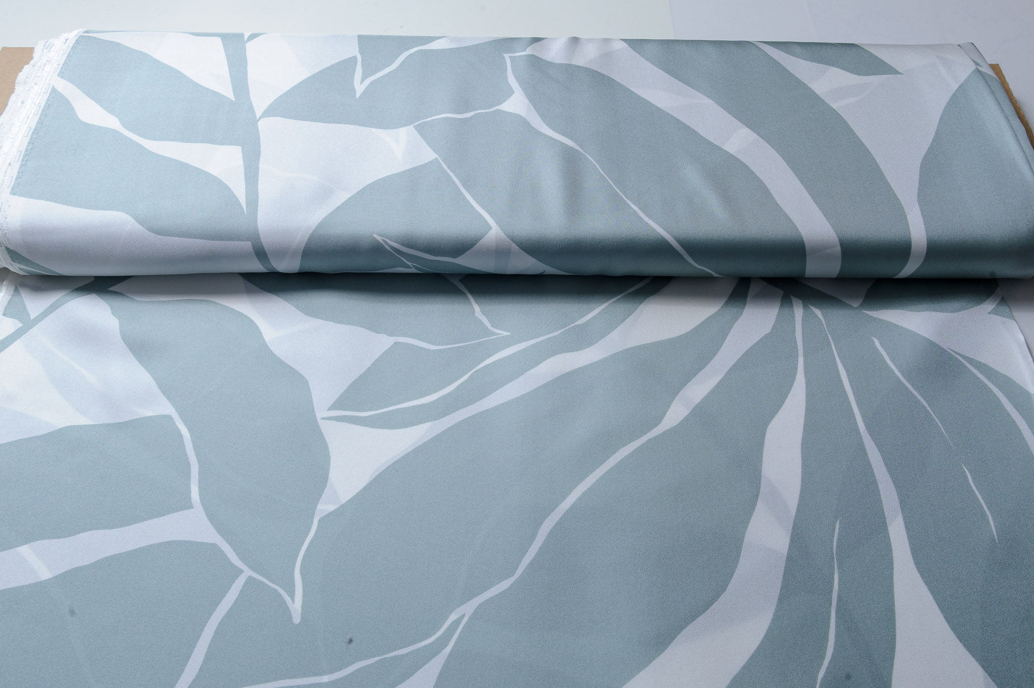 Materiał sztywniejszy, delikatnie prześwitujący. Wzór w duże liście w kolorze pastelowej zieleni na śmietanowym tle. Odpowiedni na sukienki, koszule, spódnice, spodnie.