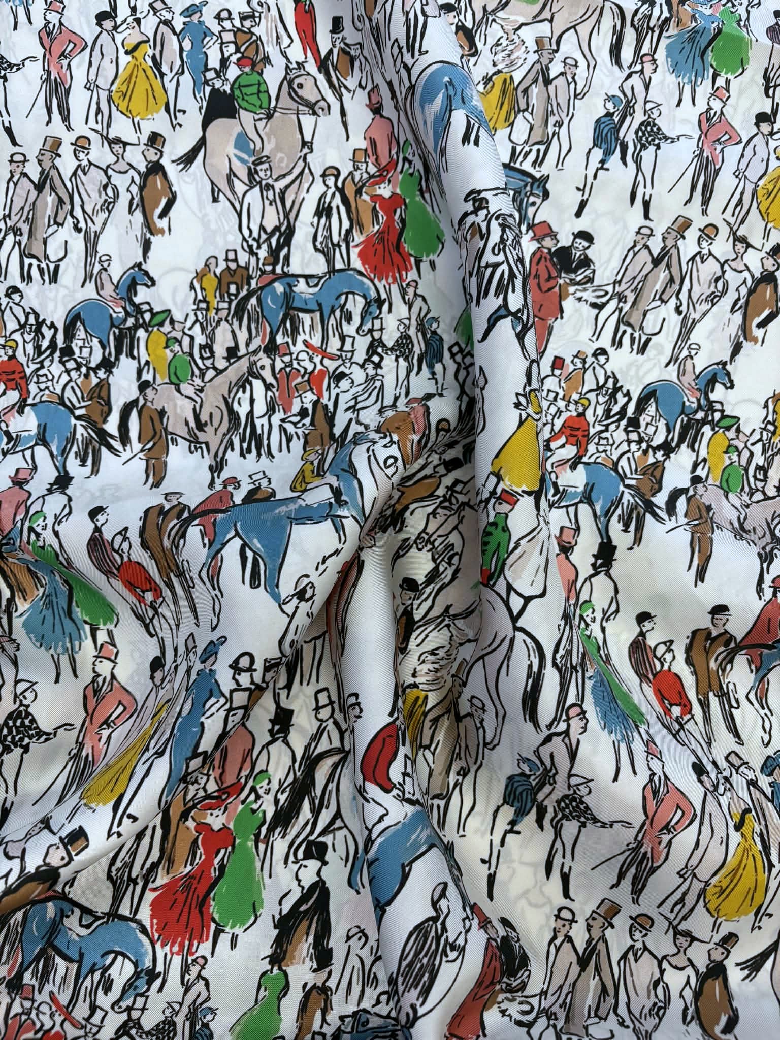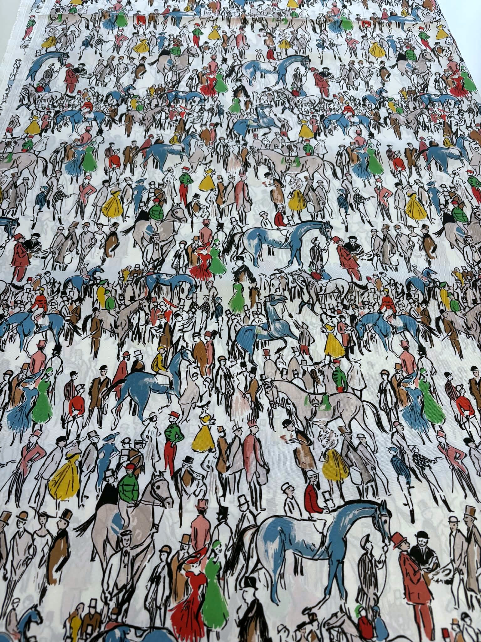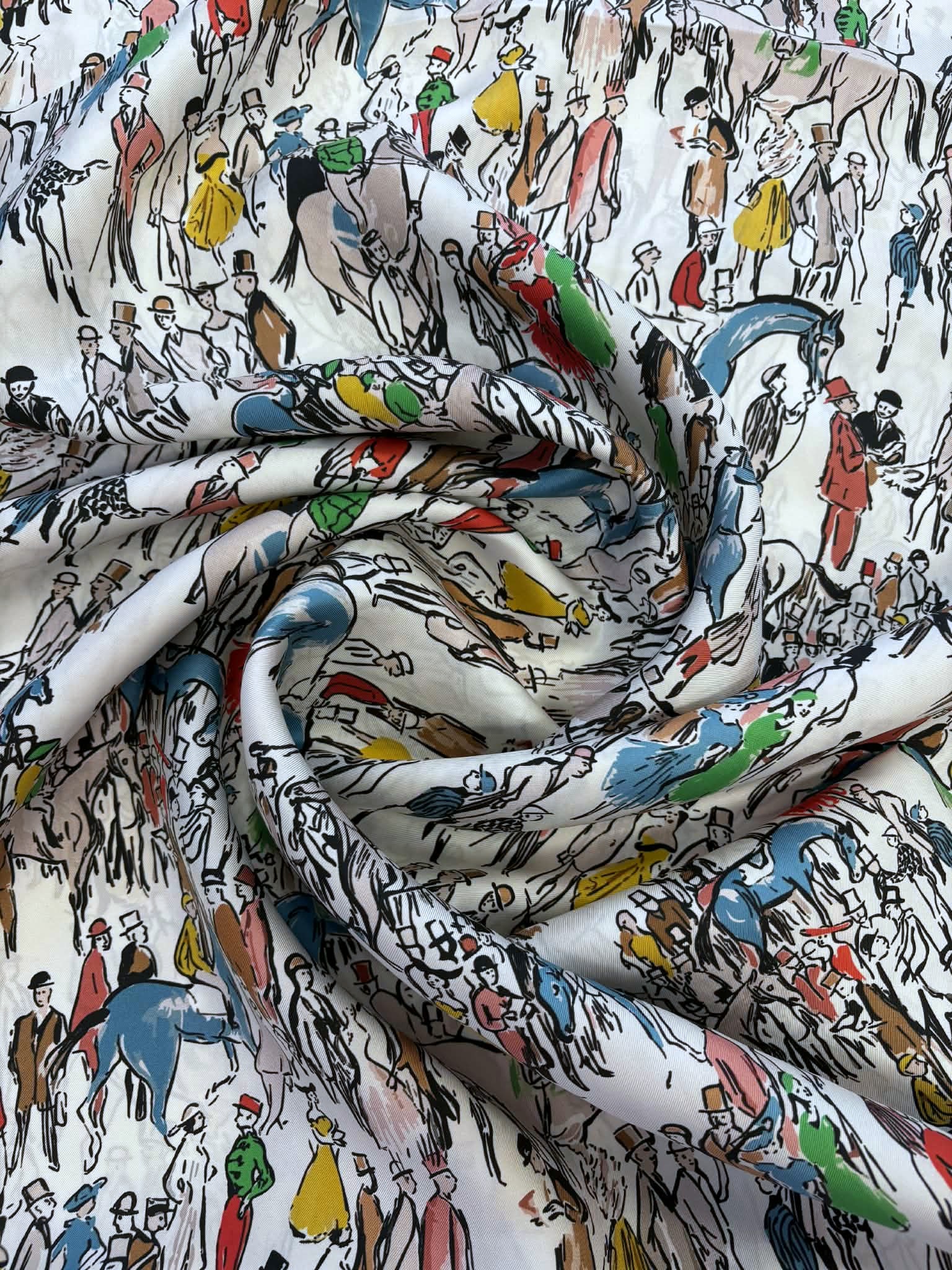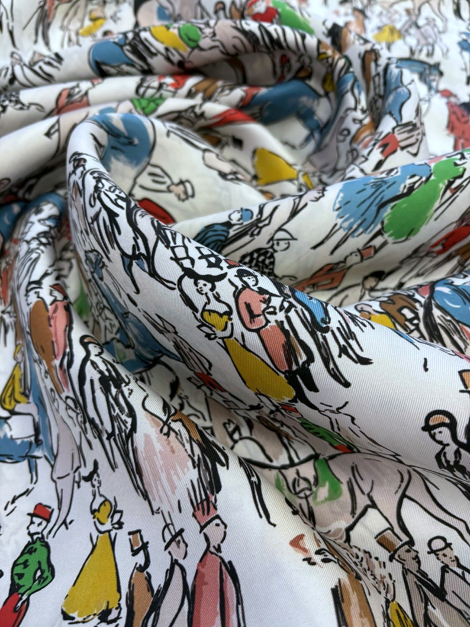 Materiał sztywniejszy, nieprześwitujący. Wzór przedstawia kolorowe postaci, ludzi na śmietanowym tle. Odpowiedni na koszule, sukienki, spódnice, spodnie, bluzki.