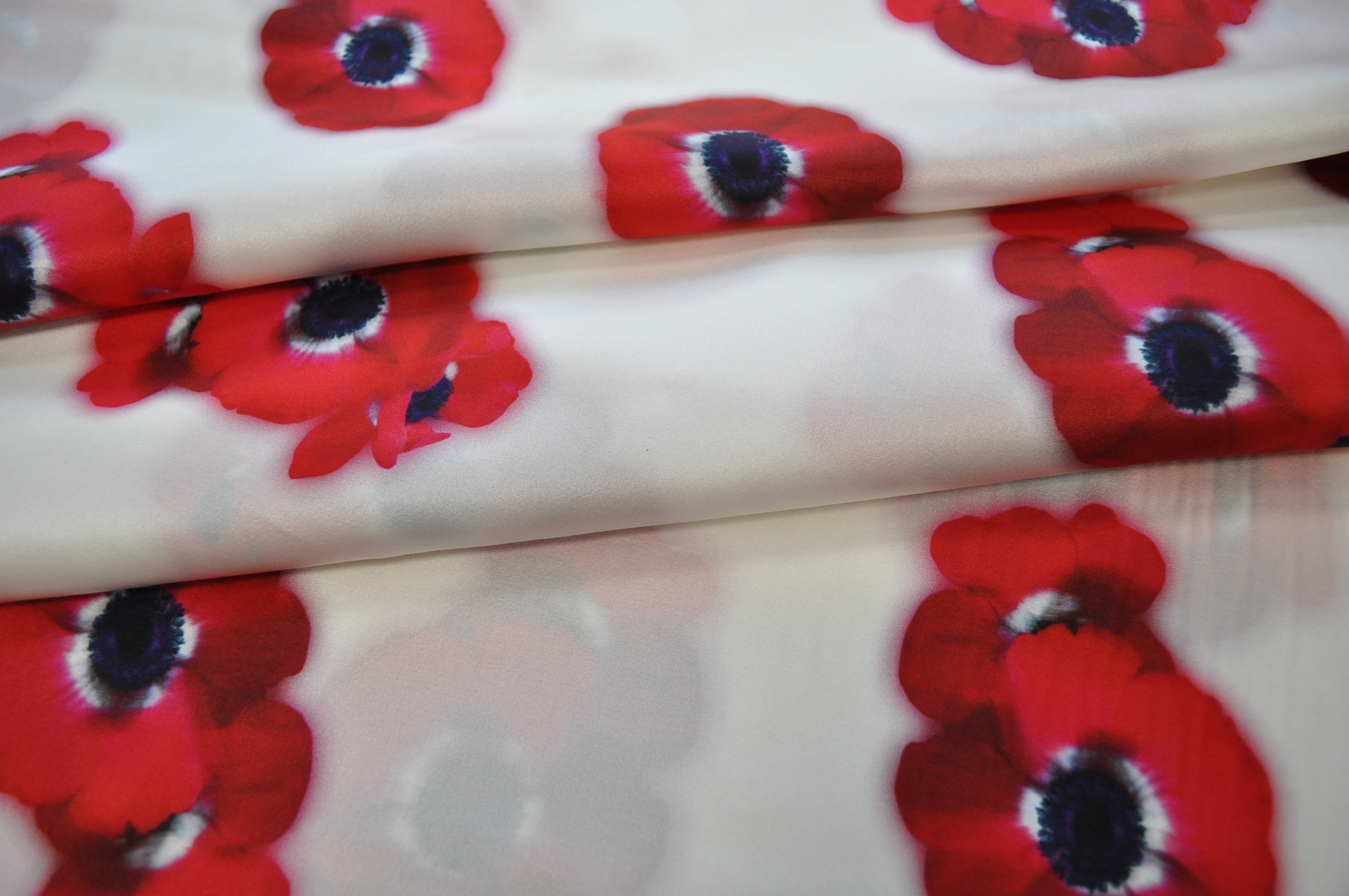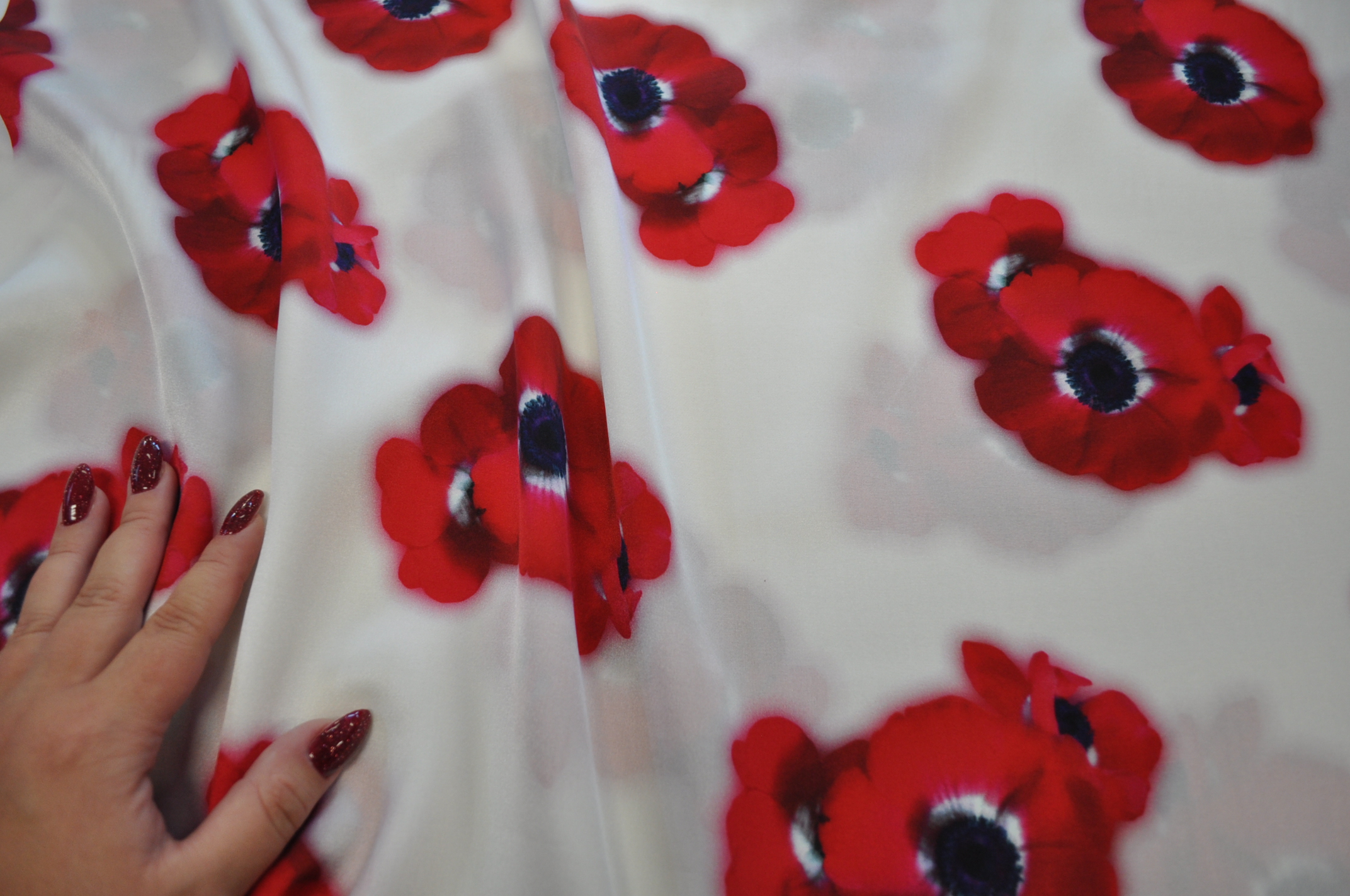 Materiał lejący, delikatnie prześwituje. Czerwone maki na śmietankowym tle. Odpowiedni na sukienki, koszule, spódnice.