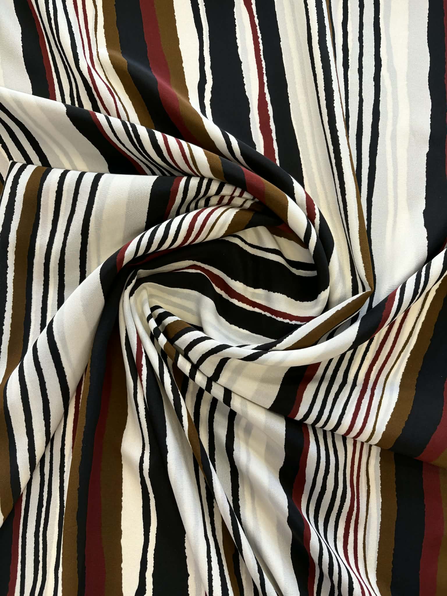 Materiał cienki, delikatnie prześwitujący. Pasy nieregularne w kolorze czarnym, brązie, śmietanie. Odpowiedni na bluzki, sukienki, spódnice.