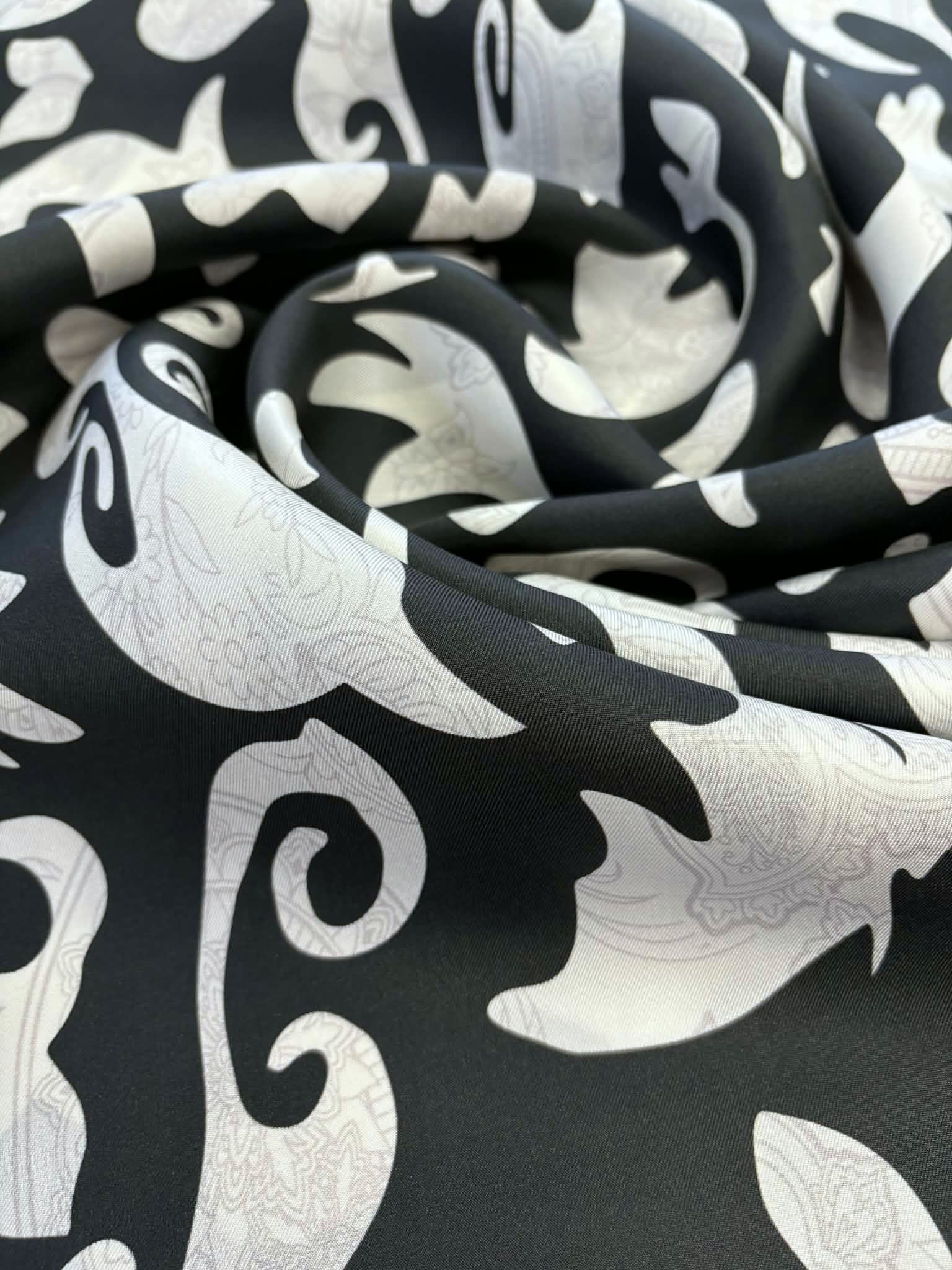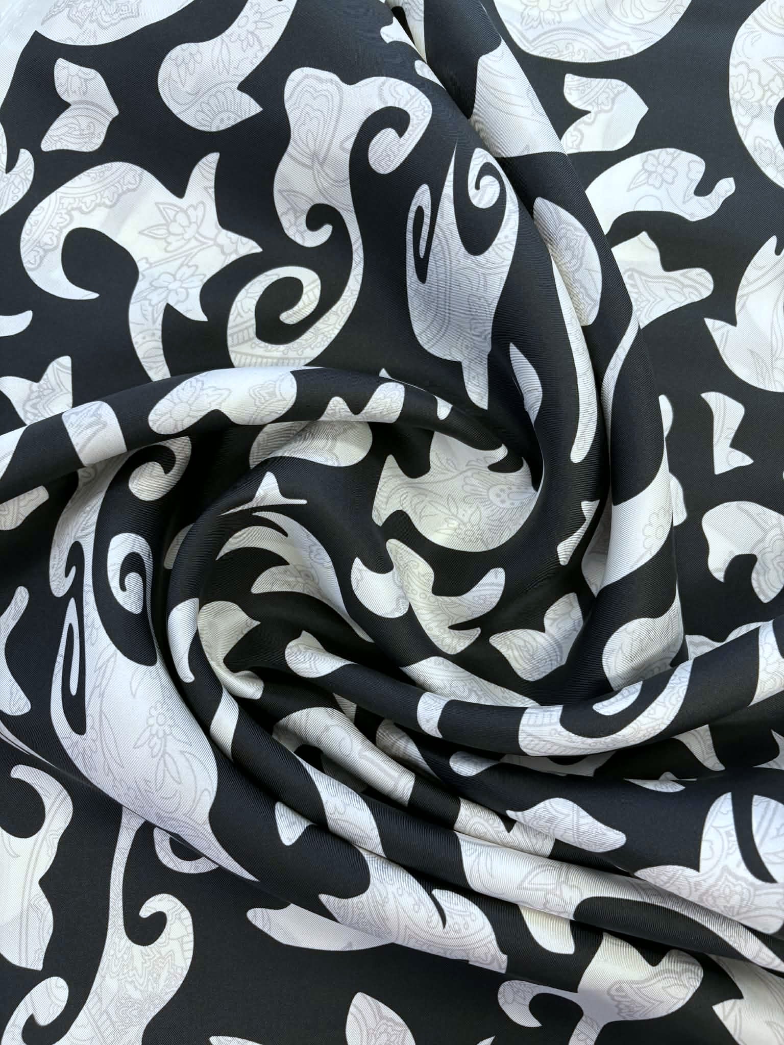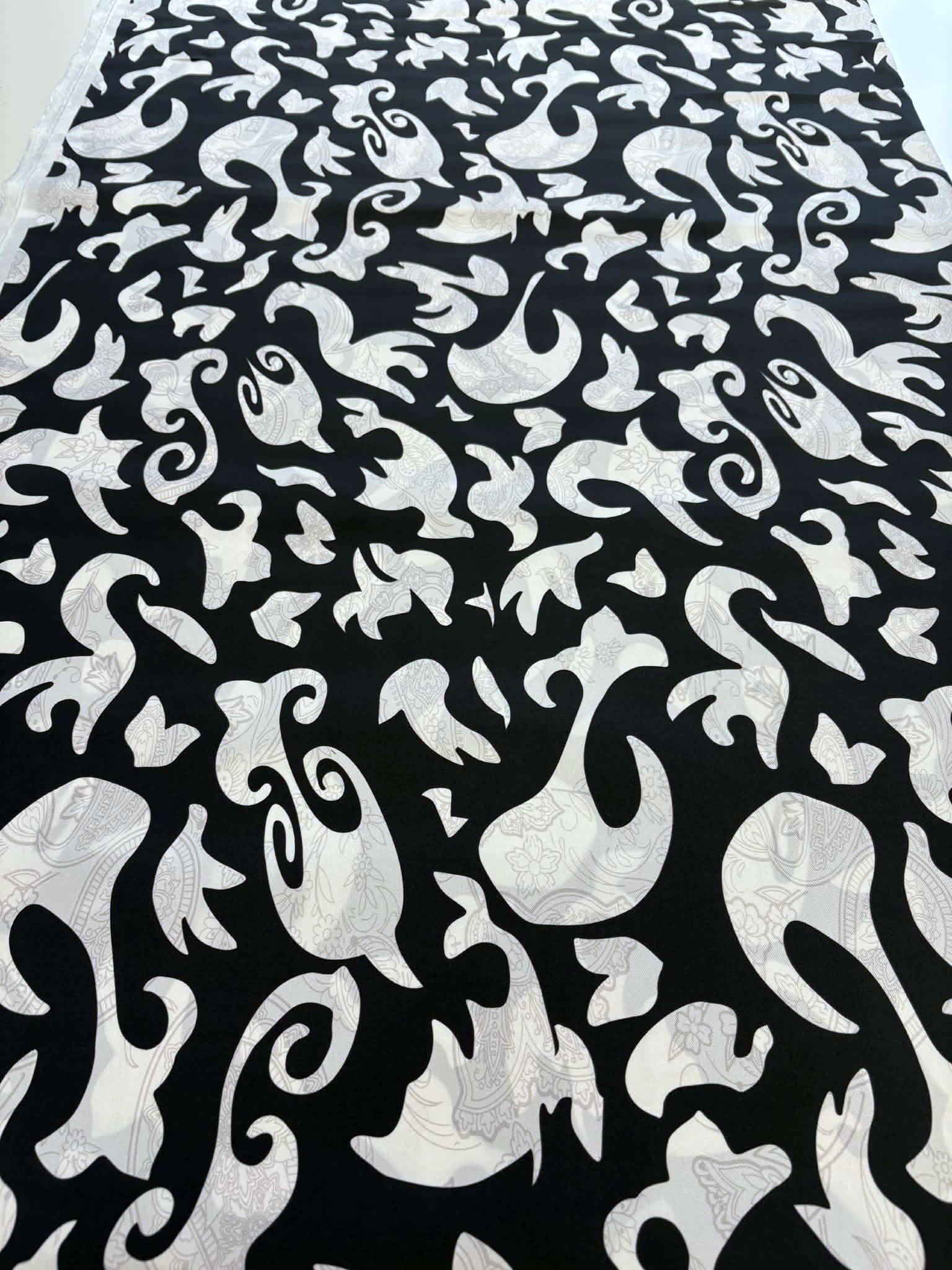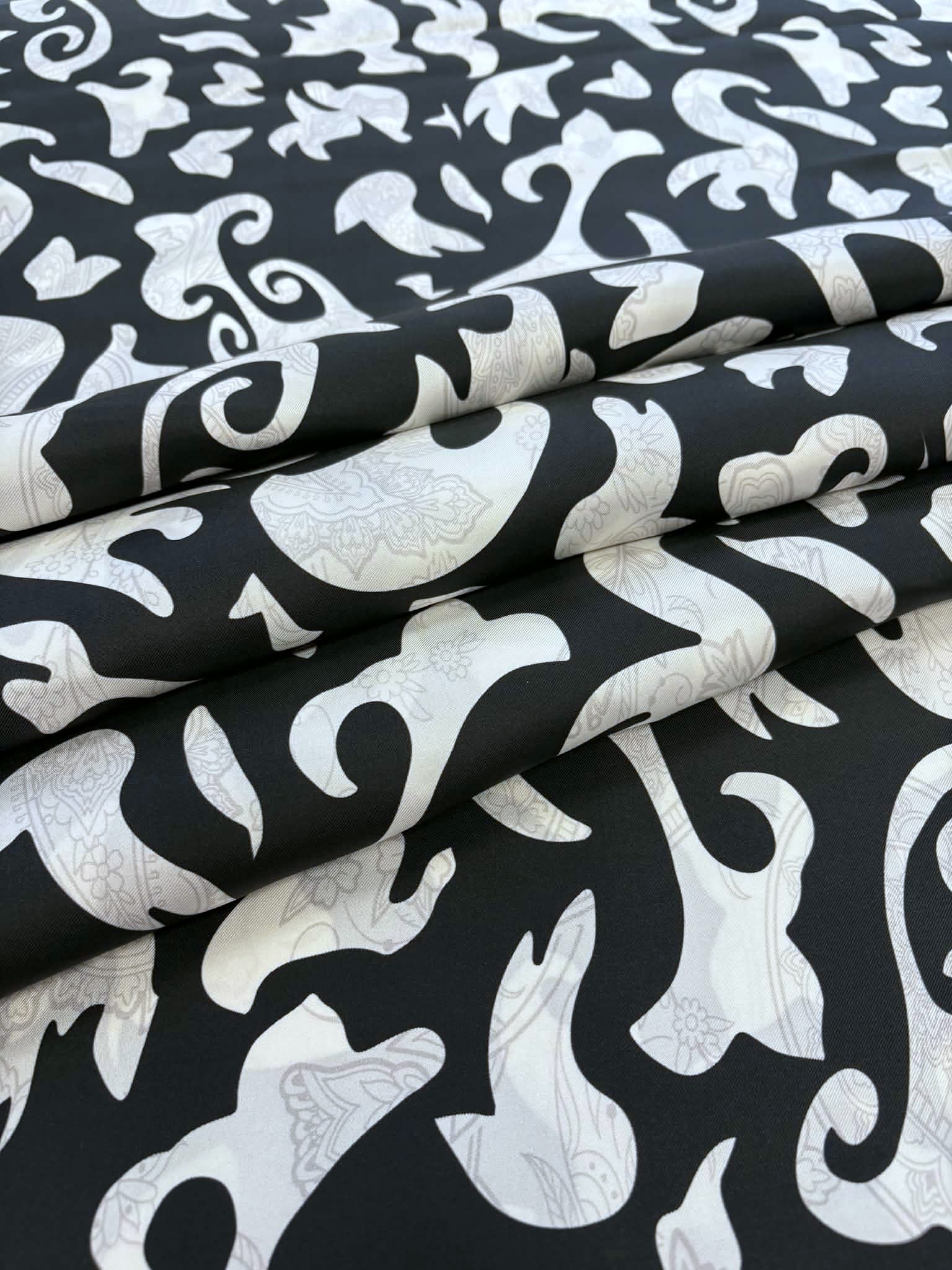 Materiał sztywniejszy, nieprześwitujący. Wzór przypominający paisley śmietanowo-czarny(przygaszony). Odpowiedni na sukienki, koszule, spódnice, spodnie,bluzki.