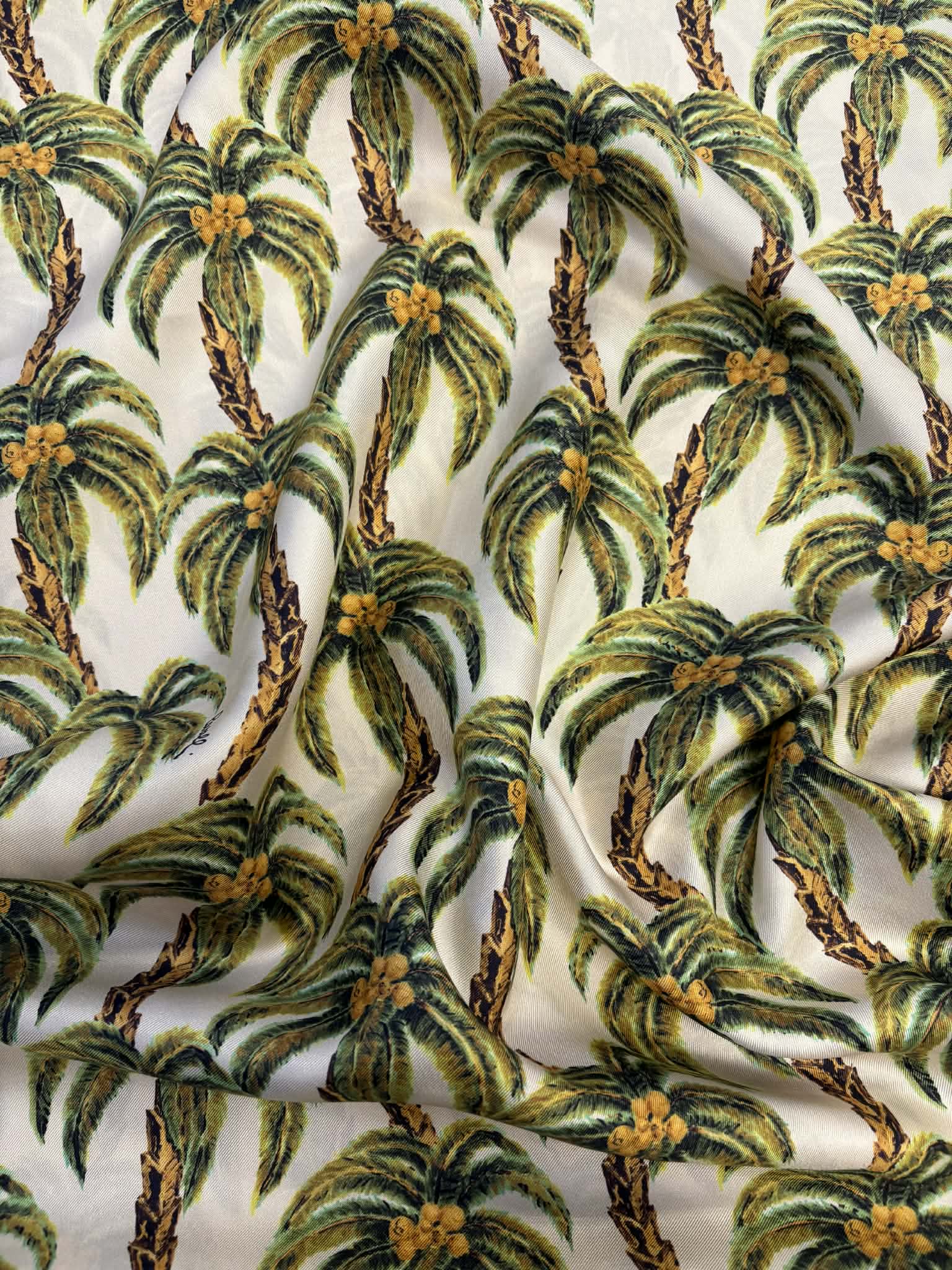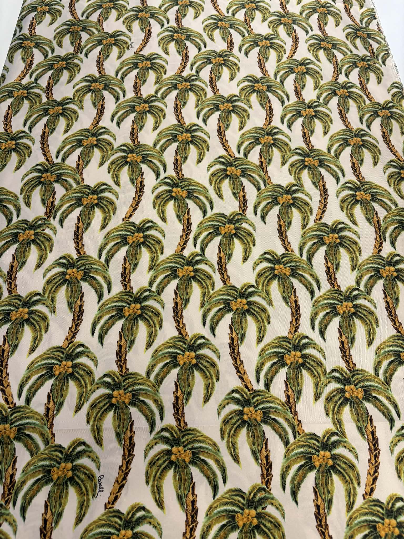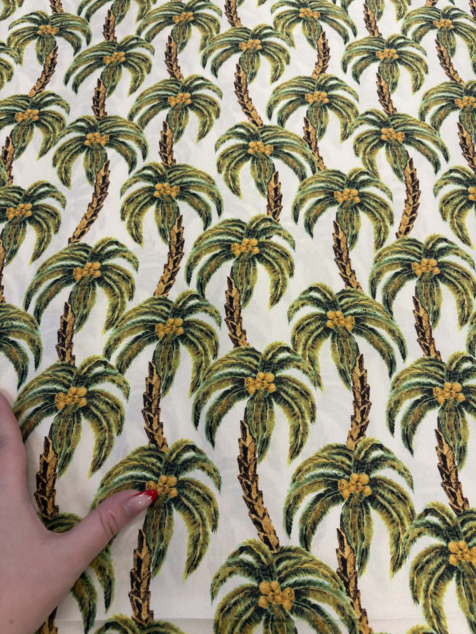 Materiał w palmy na beżowym tle. Nie prześwituje. Delikatnie sztywniejszy. Odpowiedni na koszule, sukienki, spódnice, spodnie.