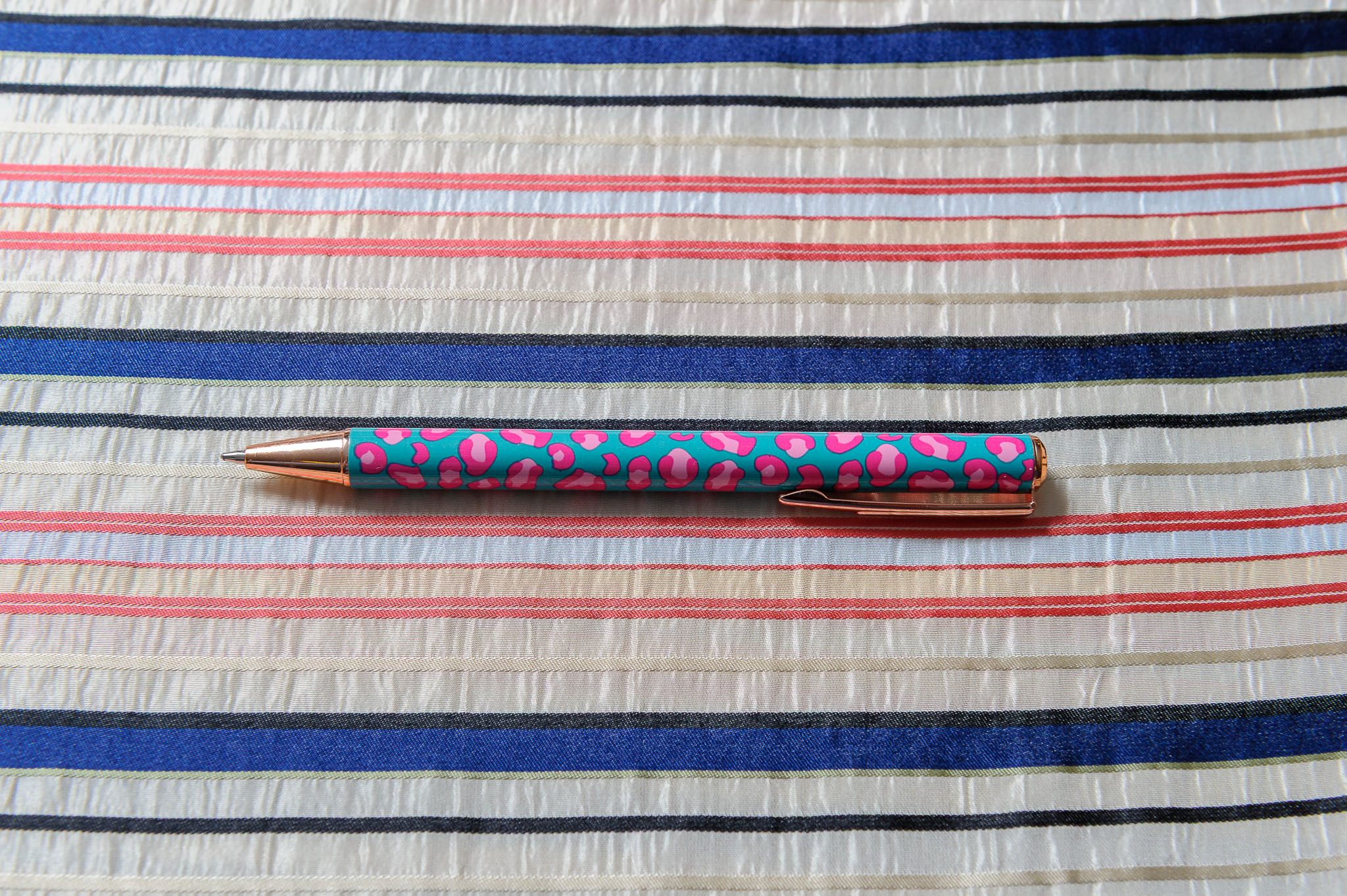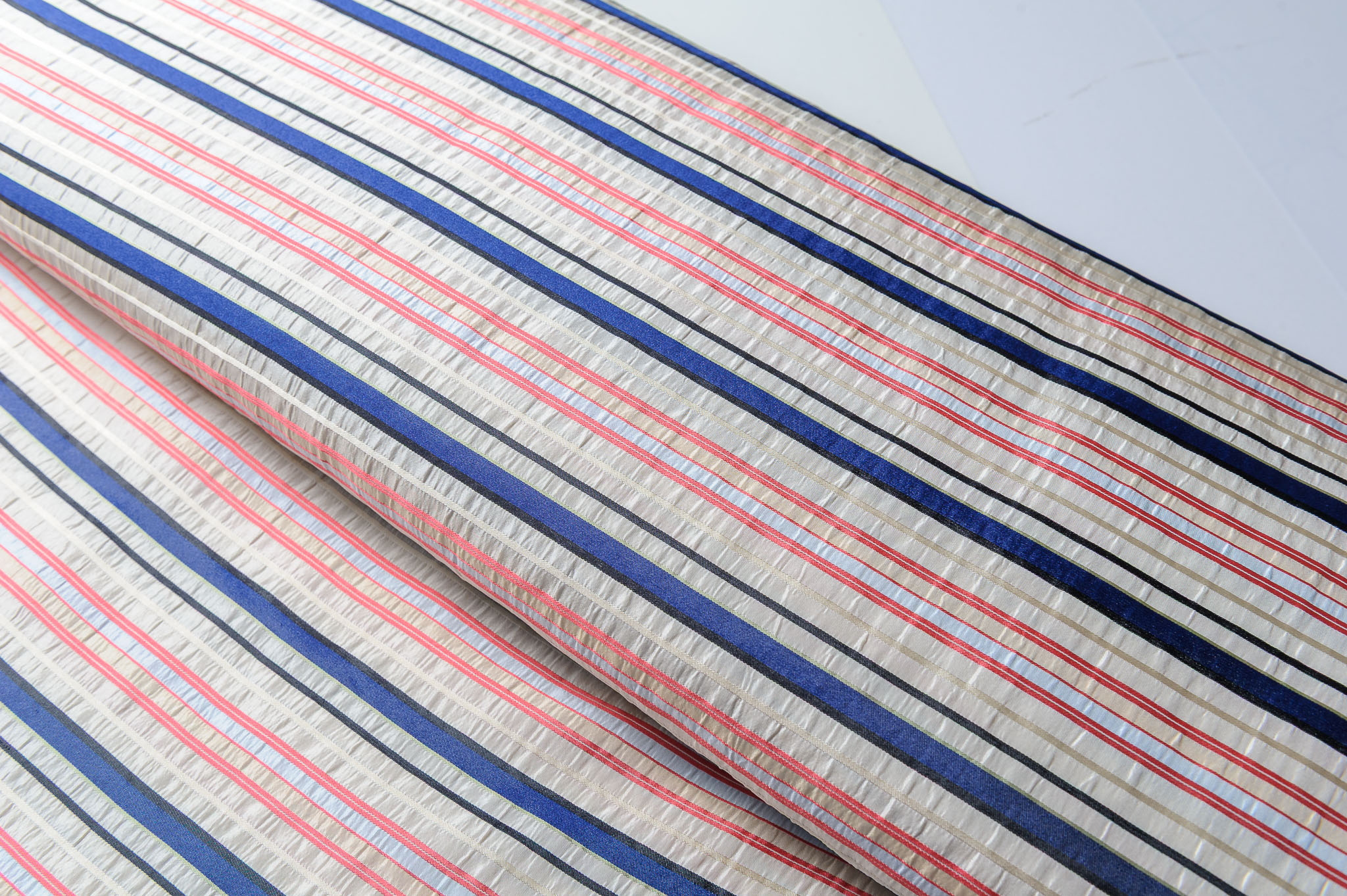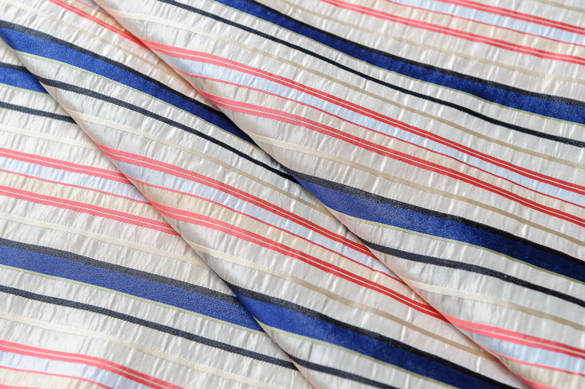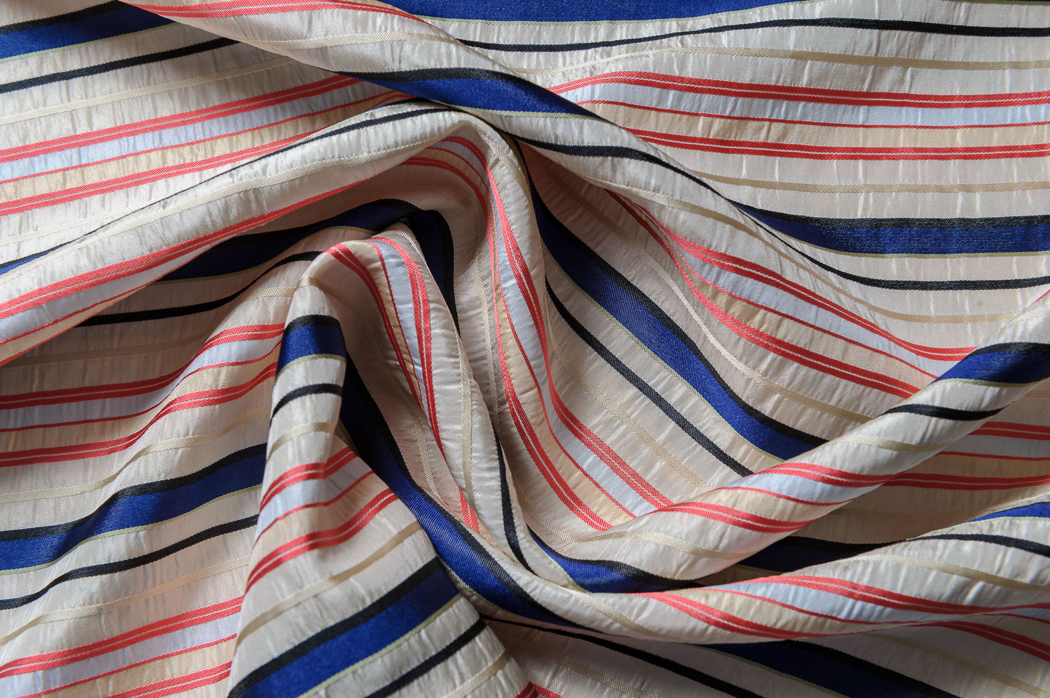 Materiał grubszy, sztywniejszy. Kolorowe paski w kolorze kremu, pomarańczy, granatu. Odpowiedni na spódnice, suknie, żakiety.