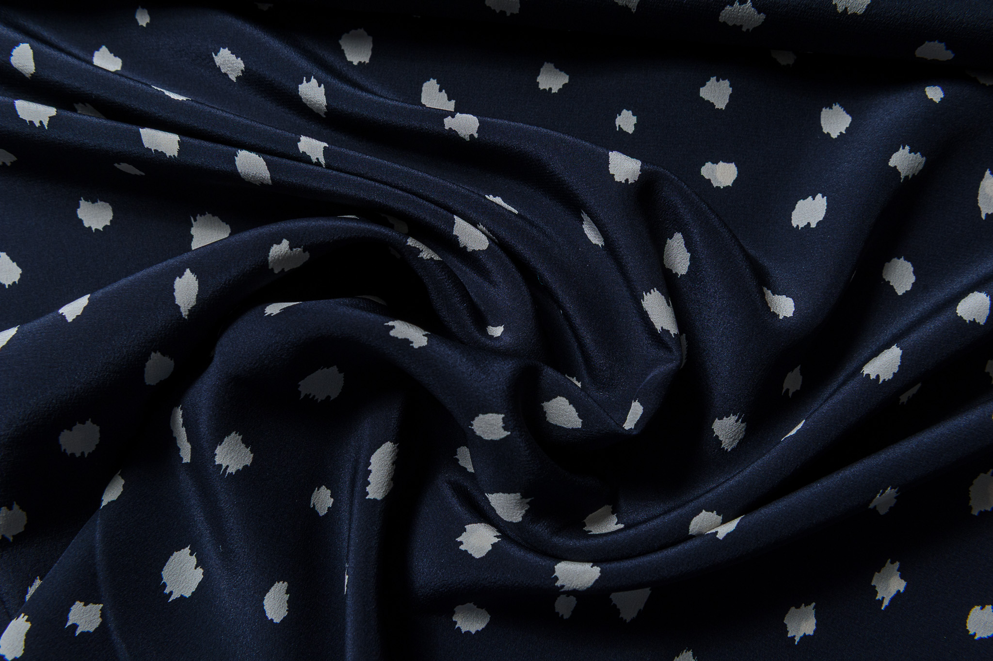 Materiał cienki, delikatnie prześwitujący. Wzór w plamki drobne na czarnym tle. Odpowiedni na sukienki, koszule, bluzki, spódnice.