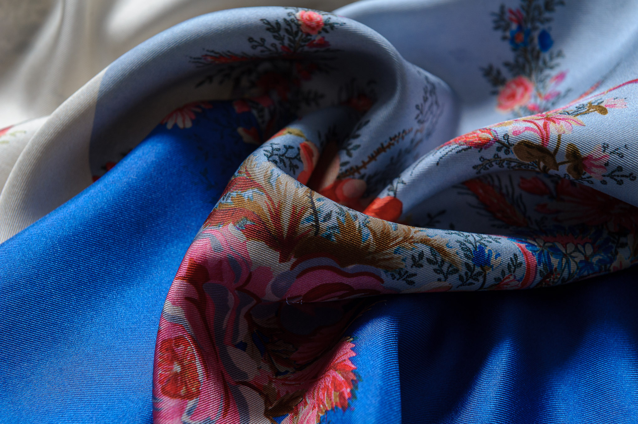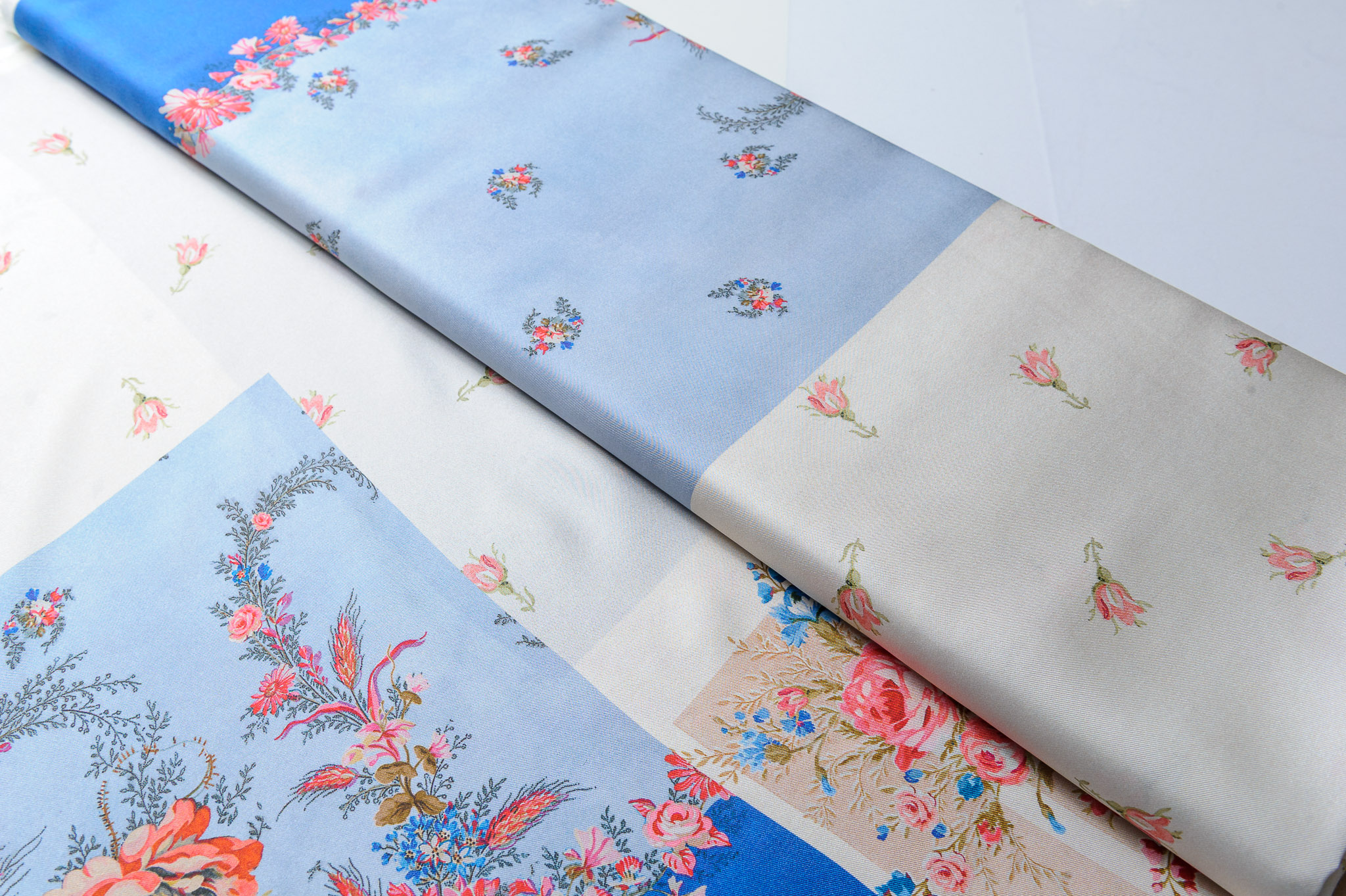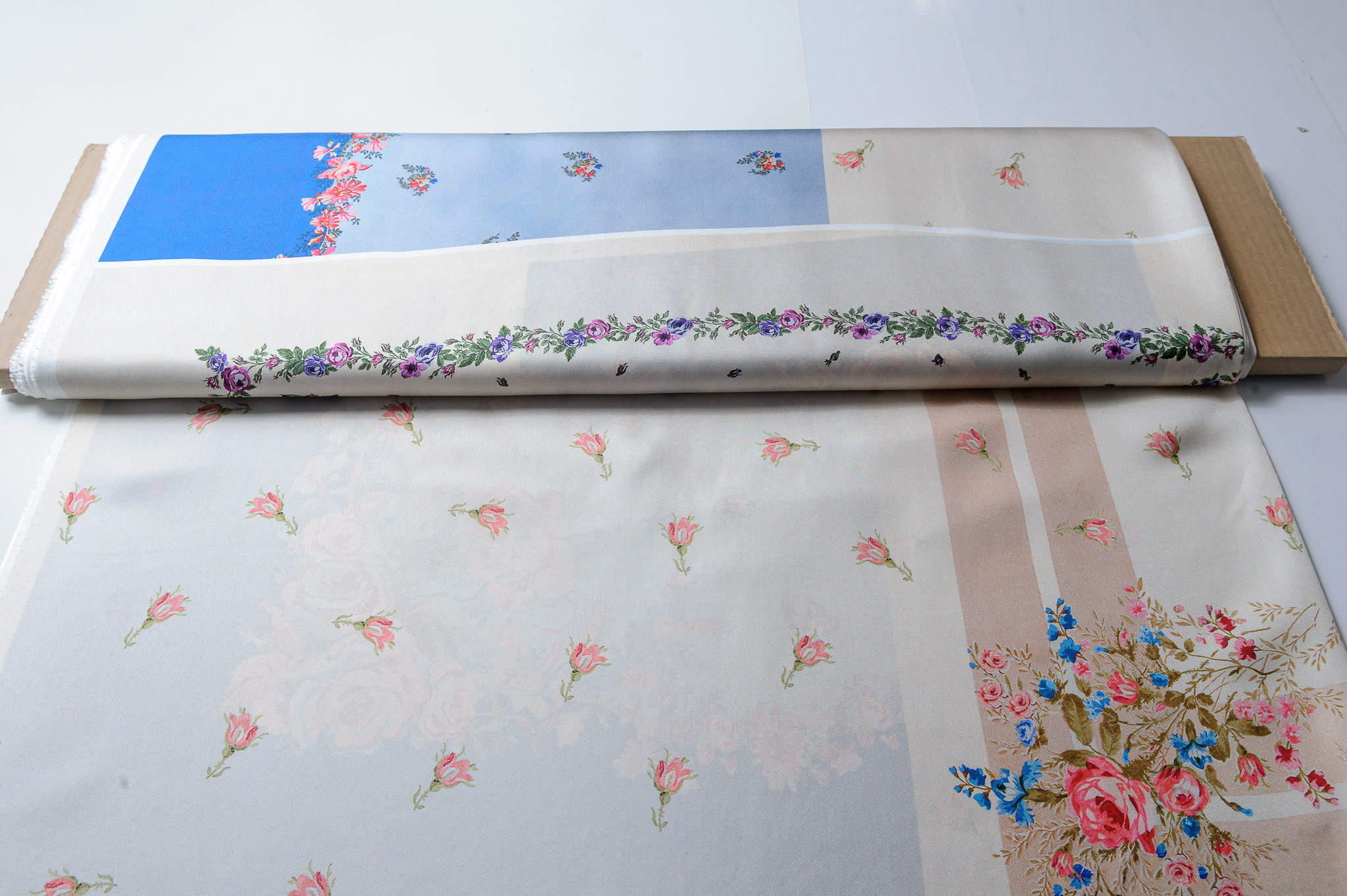 Materiał sztywniejszy, delikatnie prześwitujący. Wzór kwiatowy, delikatne odcienie beżu, różu, błękitu i niebieskiego. Odpowiedni na koszule, sukienki, bluzki, spódnice, akcesoria.