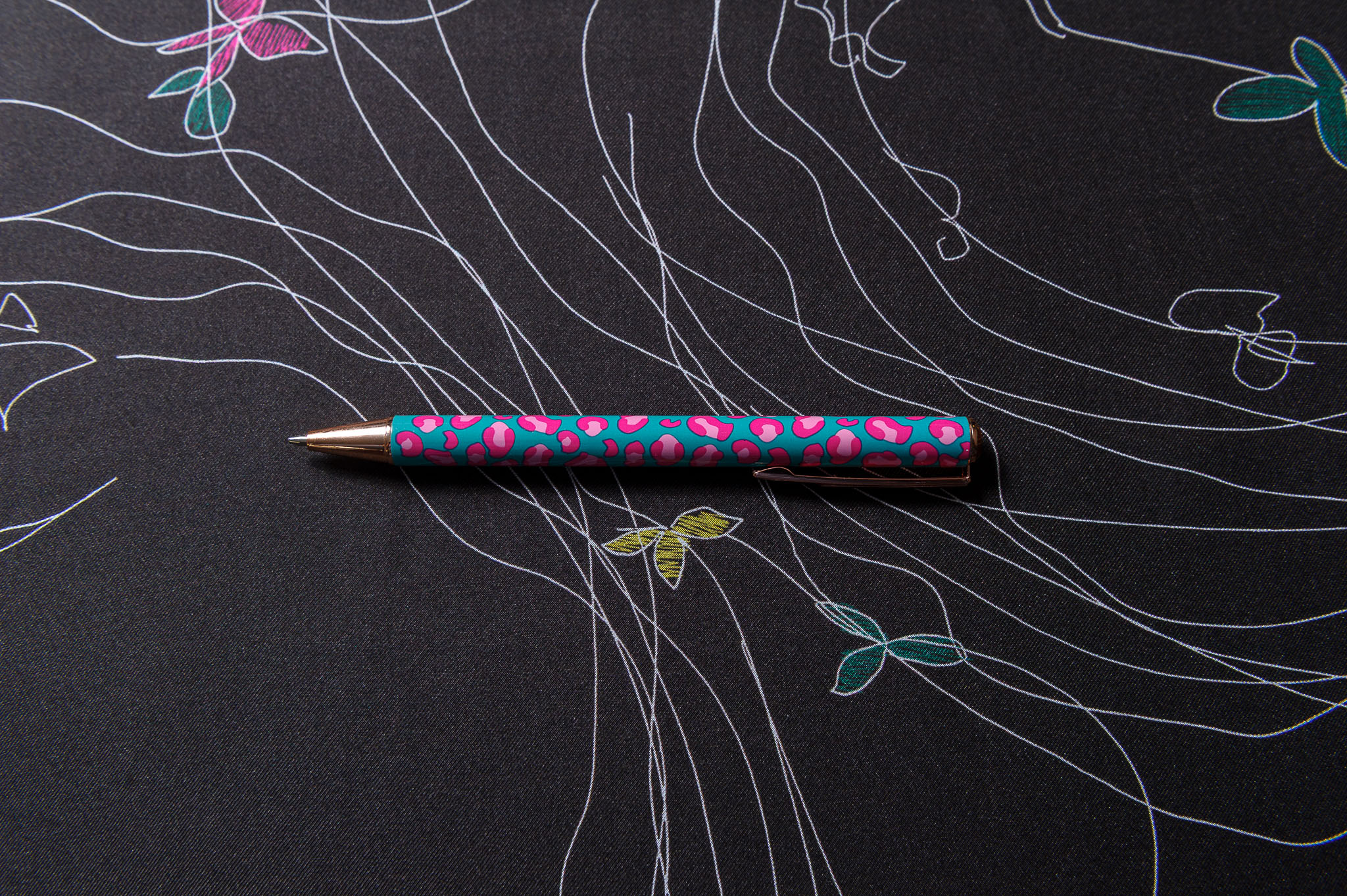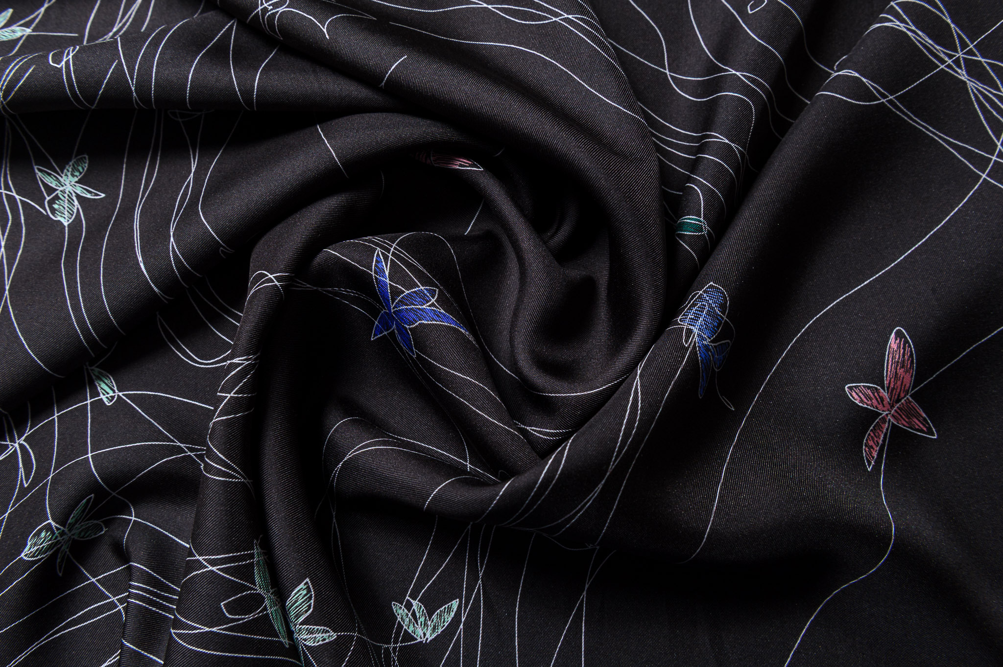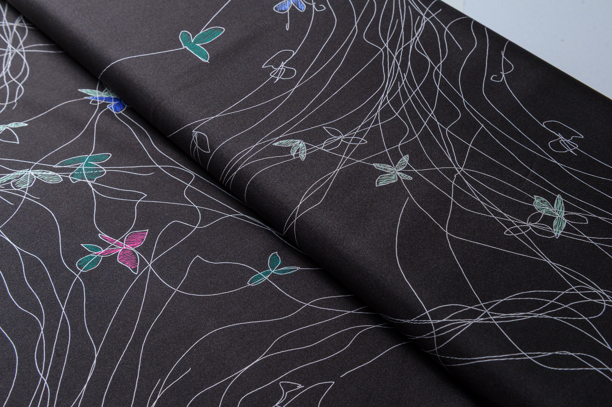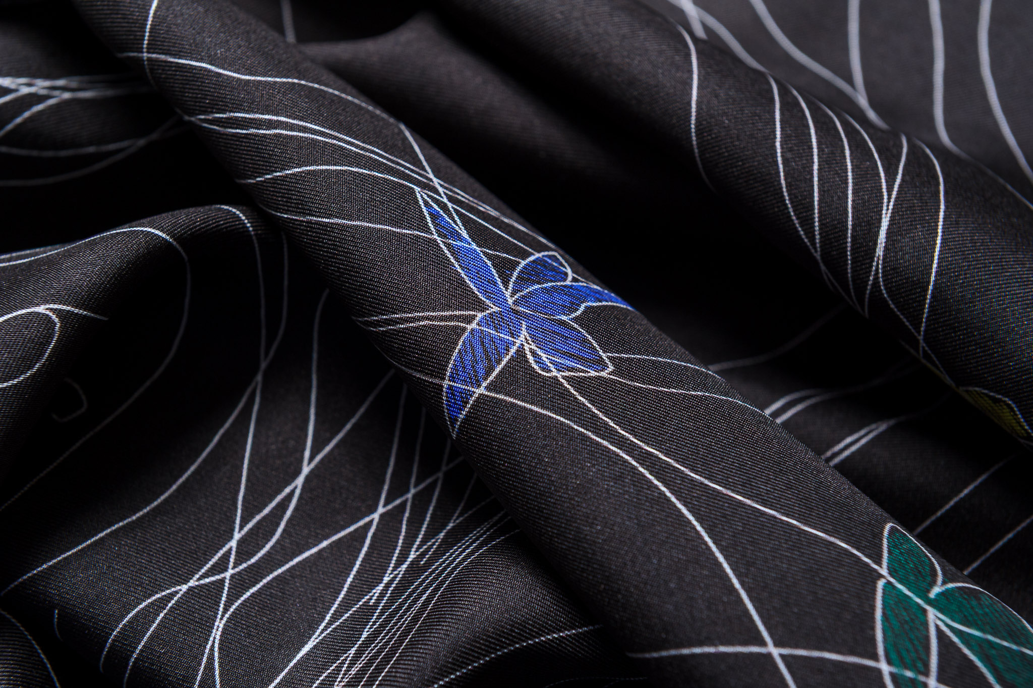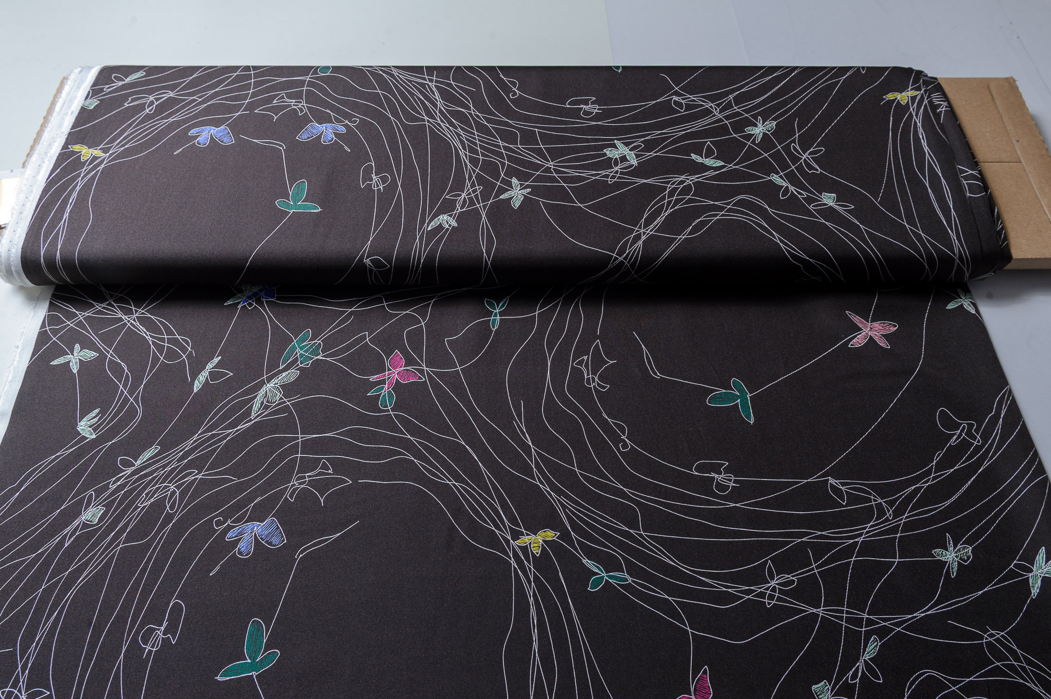 Materiał delikatnie sztywniejszy, nieprześwitujący. Wzór w rysunki, motylki kolorowe połączone liniami. Odpowiedni na koszule, sukienki, spodnie, spódnice, bluzki.